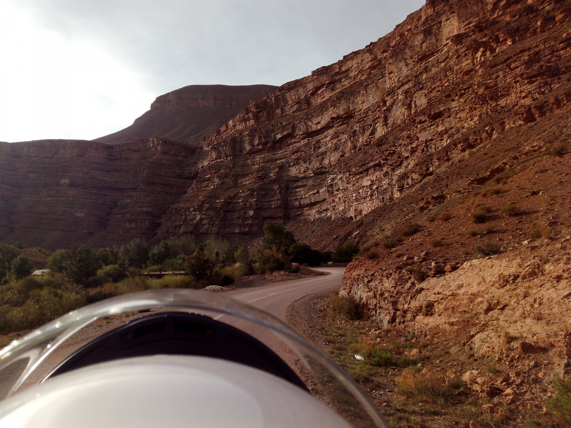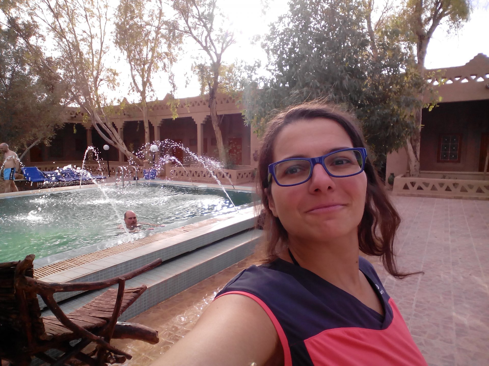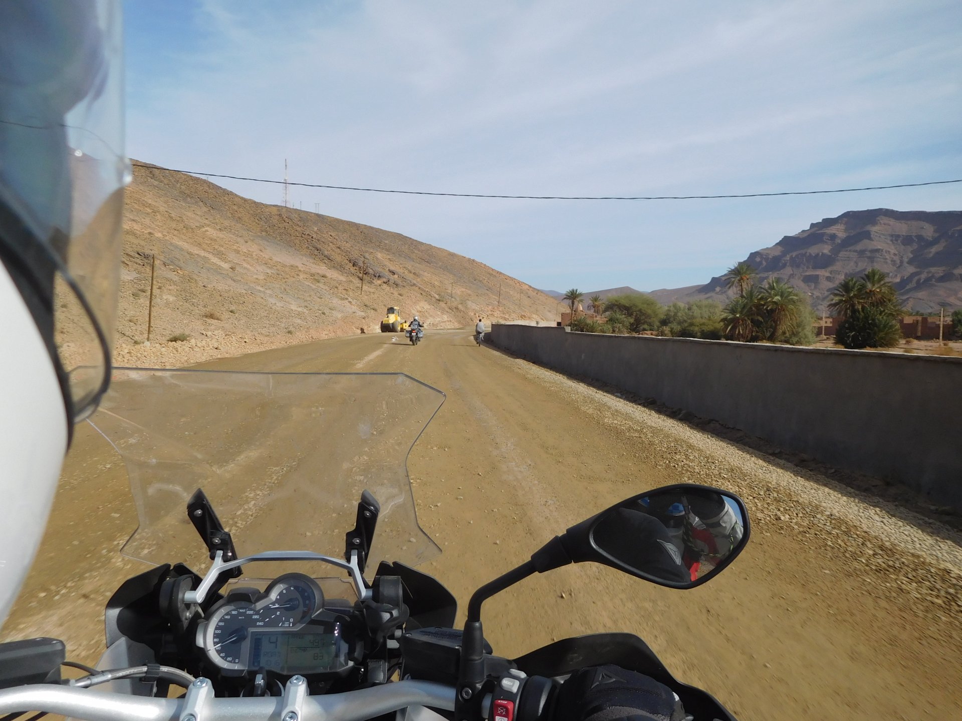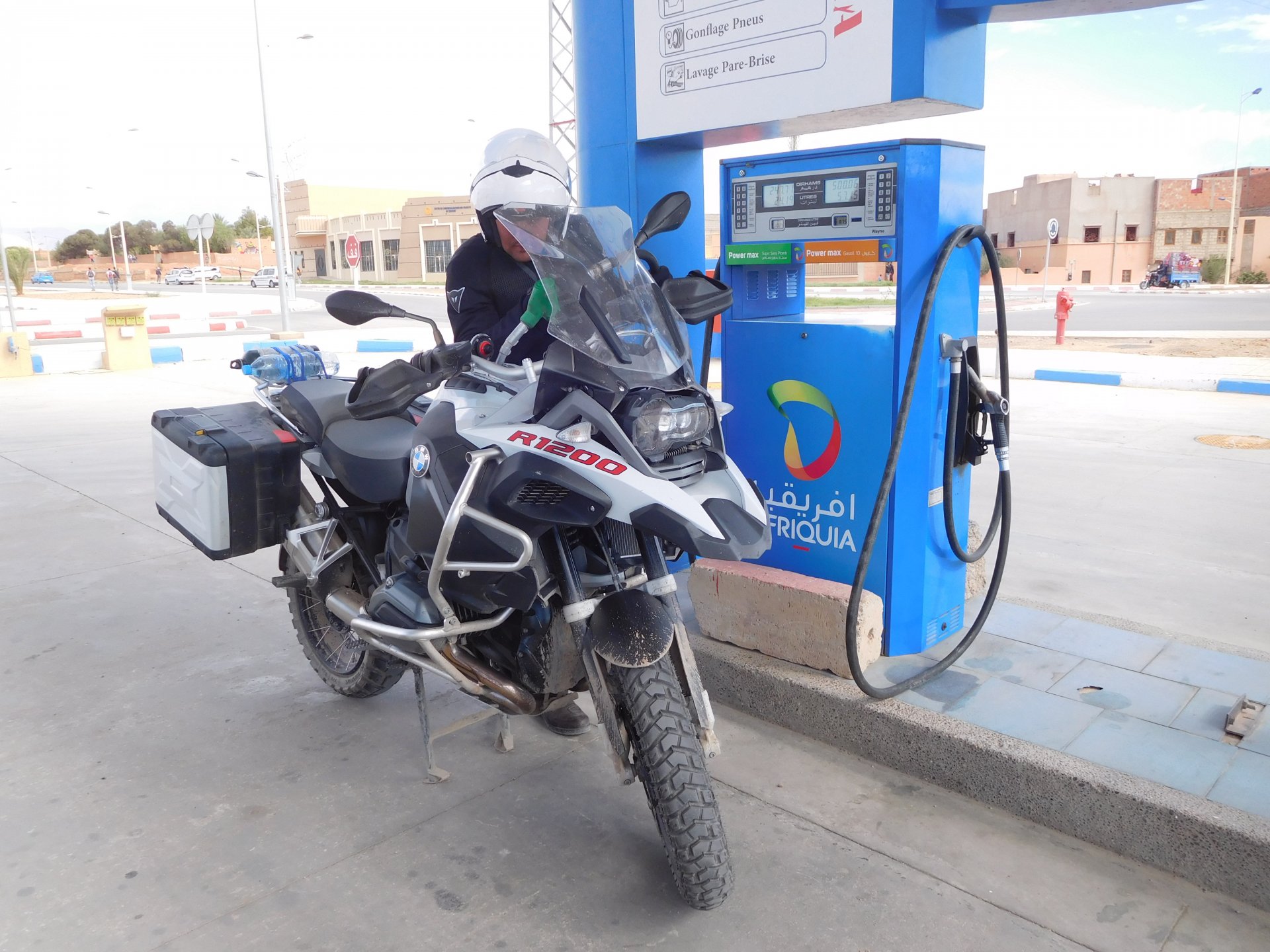 We slept like babies, on a room on the rooftop of the kasbah, a net for mosquitoes on the window, woke up to birds getting busy and singing at dawn We lingered around a little before breakfast Breakfast was to my liking I'll return, for sure: But the road is calling: There's a gas refinery in Errachidia and plenty of army around, for simple security I assume. We aren't that far away from Algeria. You get used to big views I think I put some poor quality fuel the day before on the bike, so as soon as I got an Afriquia station I fueled up, usually Afriquia stuff works well. We've come to Errachidia to buy Rui a sim card, for data and international calls. Administration done, time for some coffee And we're off to the Sahara! Scenery is really changing now We were headed to Merzouga and the golden dunes again, to stay at our favourite place. We were to spend two nights there, taking in the desert, a plan was forming in my head... stay tuned And finally arriving at out oasis, very hot and tired but with some time to kill before sunset. Inside one of Rui´s metal cases were a couple of aluminium flasks with some nice gin and vodka. We quickly ordered a few cold tonics and relaxed a little Tomorrow would be an extraordinary day...