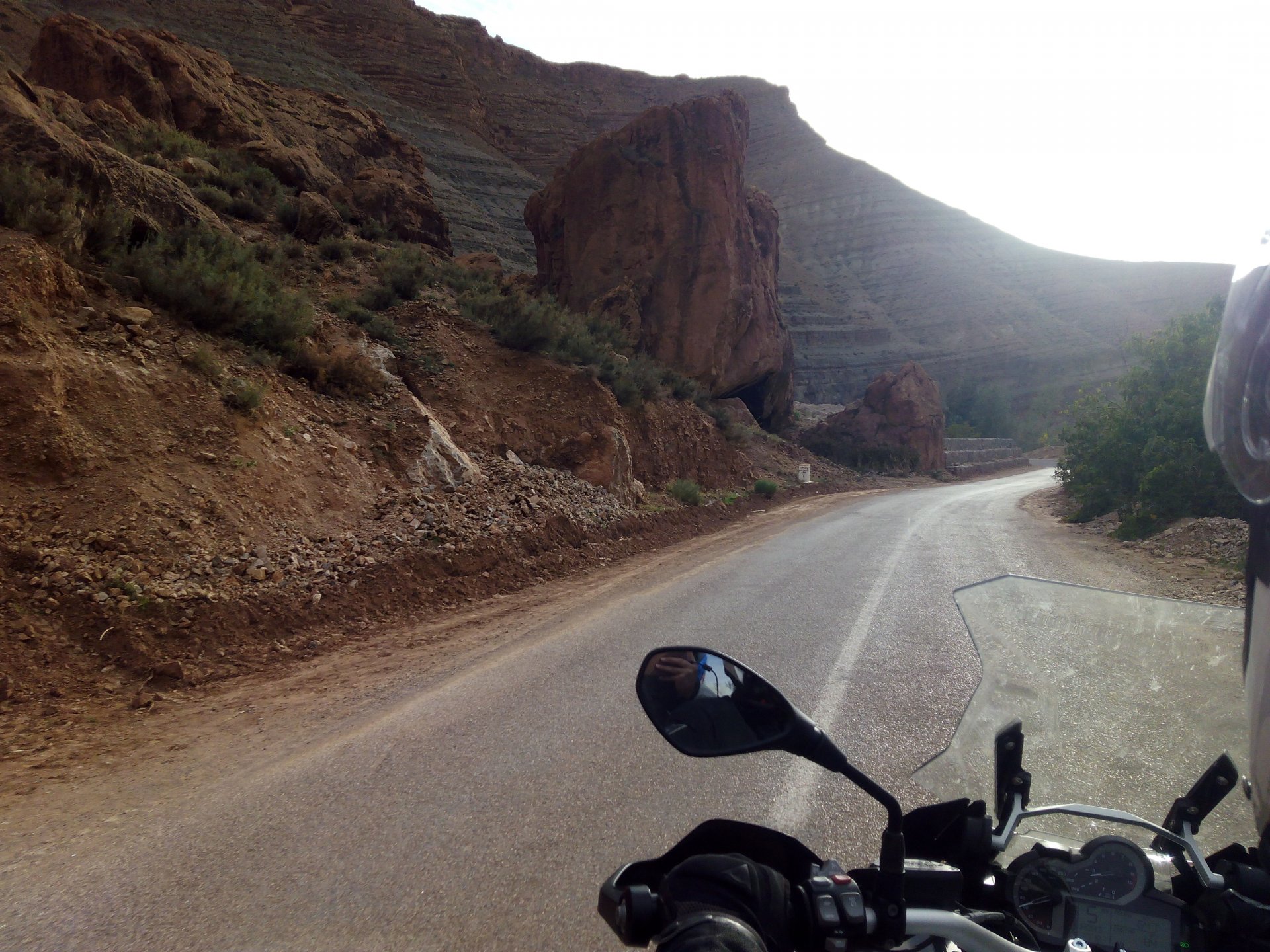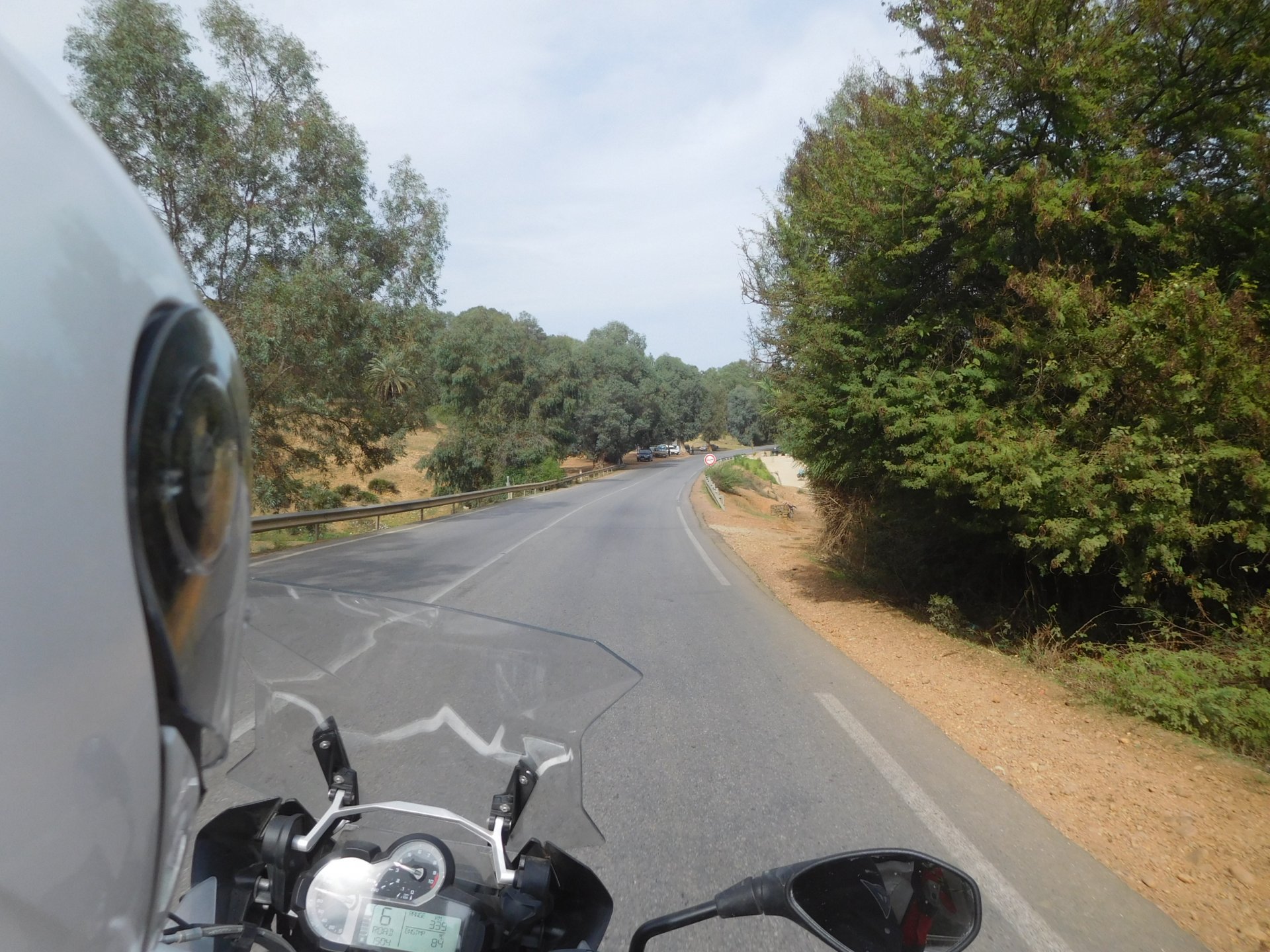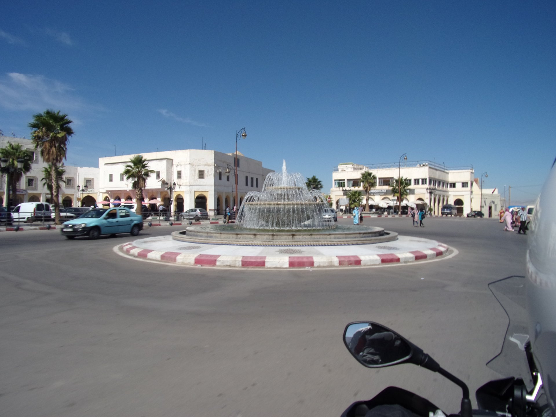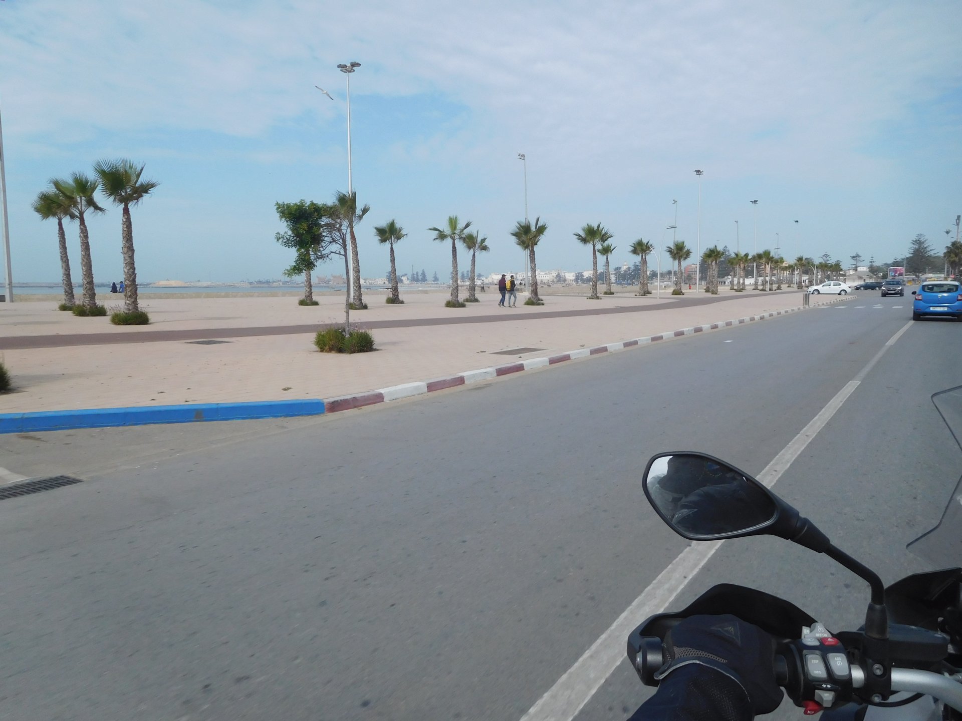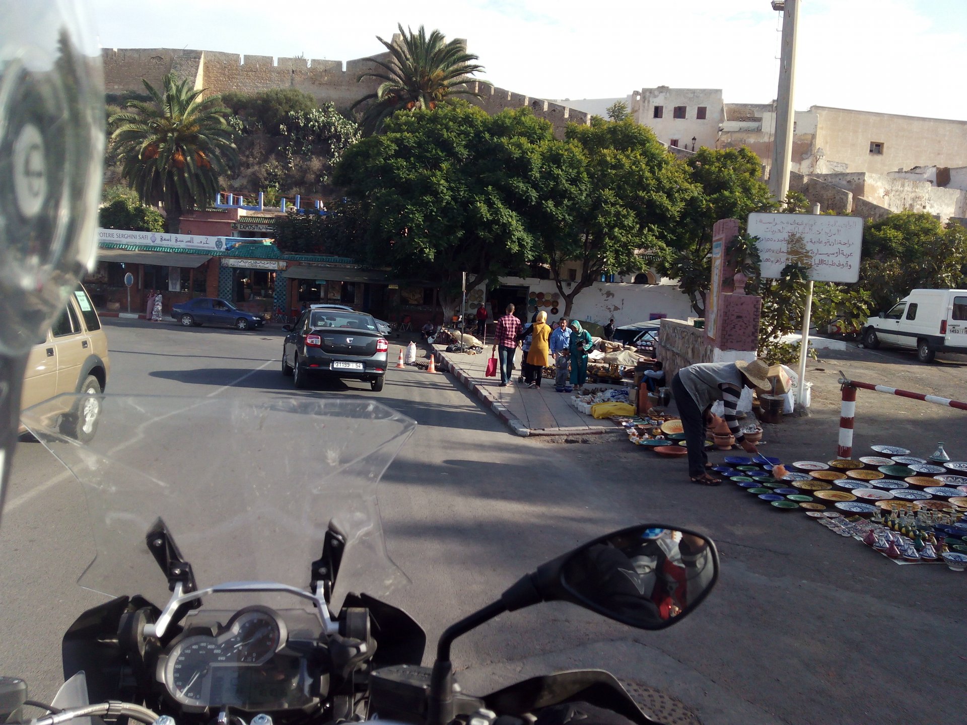 In the morning me and Maria were back on our own and moving at our own pace. This means that although not in a hurry we ended up doing things in less time, like a well oiled machine. One packs this while the other brushes his teeth, then one grabs this while the other does that, I go for the cases while she goes for the helmets, etc We have breakfast, pack the bike and leave and wave at Rui's bike. I can't lie and say there wasn't a lump in my throat as we left it there. Morning traffic in Marrakech isn't as bad just because the heat hadn't arrived yet, we just moved along with traffic heading out of the city onto the coast. As we move further away from touristy and "cosmopolitan" Marrakech: Lanes? Were were going we don't need lanes! The dial... Morocco is known for it's Argan trees, and with Argan trees come the famous goats that climb trees to eat the organ fruit, some moroccans being the clever dudes that they are, see this as a way to squeeze a couple of coins off tourists, and force goats up a tree and keep them there for tourists to snap pictures with them, while asking for a fee. This is the result, just a sad spectacle, the real thing doesn't compare to this, this is demeaning to the goats and to a proud people. A few kms further on we see the same thing but non orchestrated, but that still doesn't compare to what we saw the year after on the mountains. At the end of the morning we reached the coast at Essaouira The Portuguese had been here before, a long time ago We interrupt our walk for some lunch in a great little restaurant We had orange with cinnamon as starter and fish soup, it was tasty as it should in a fishing town. If you've never tried slicing an orange (a proper orange) and just sprinkling it with a healthy (more than this) amount of cinnamon, do it. It's exotic, very healthy, and will make you look like a chef. After our lunch we just sat inside sipping a little coffee and looking at life going about it's business outside, before carrying on with our walk back to the bike. And thus started our ride back north I don't think any of us enjoyed this part of the ride very much. We were coated with muckyness from the ocean, salty and moist, wasn't very pleasant at all. Eventually we found a place to stay, quite cheaply to be honest, with breakfast included and a swimming pool. Couldn't be any better so we stopped quite looking forward to have a swim and relax. This was is October 2016, yearlier that year Portugal had won the Euro football championship with a goal scored on the last minute, against FRANCE, and they had been pretty sore loosers. We had been getting compliments throughout this trip because football is very big in Morocco and there are few things a Moroccan likes more than to embarrass France. As soon as we presented our passports the reception guy came to hugg me and we were instantly treated like long lost relatives of his Our room's view: Our rooms view within seconds, before Maria could even find her bikini The downside to being treated as football allies against France was that in order to indulge us, the hotel staff simply went on youtube and put on portuguese folk music on a loop. We were tortured by that shit wherever we went, swimming pool, lobby, restaurant, and whenever we told them to turn it off all we got in return were big smiles, a thumbs up and an exclamation of "viva Portugal" They later confessed that Portugal beating France was celebrated on the streets with gunfire to the sky and fireworks, we should have been in Morocco that evening!