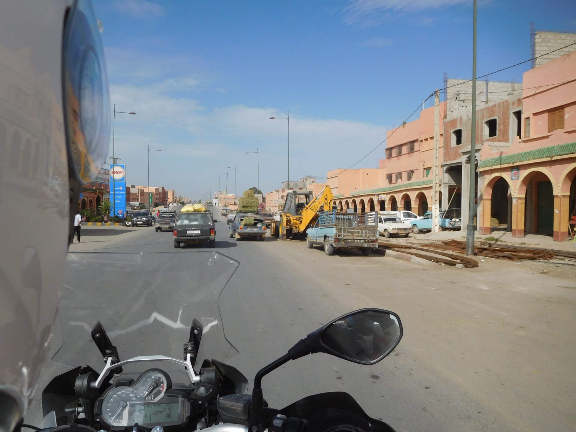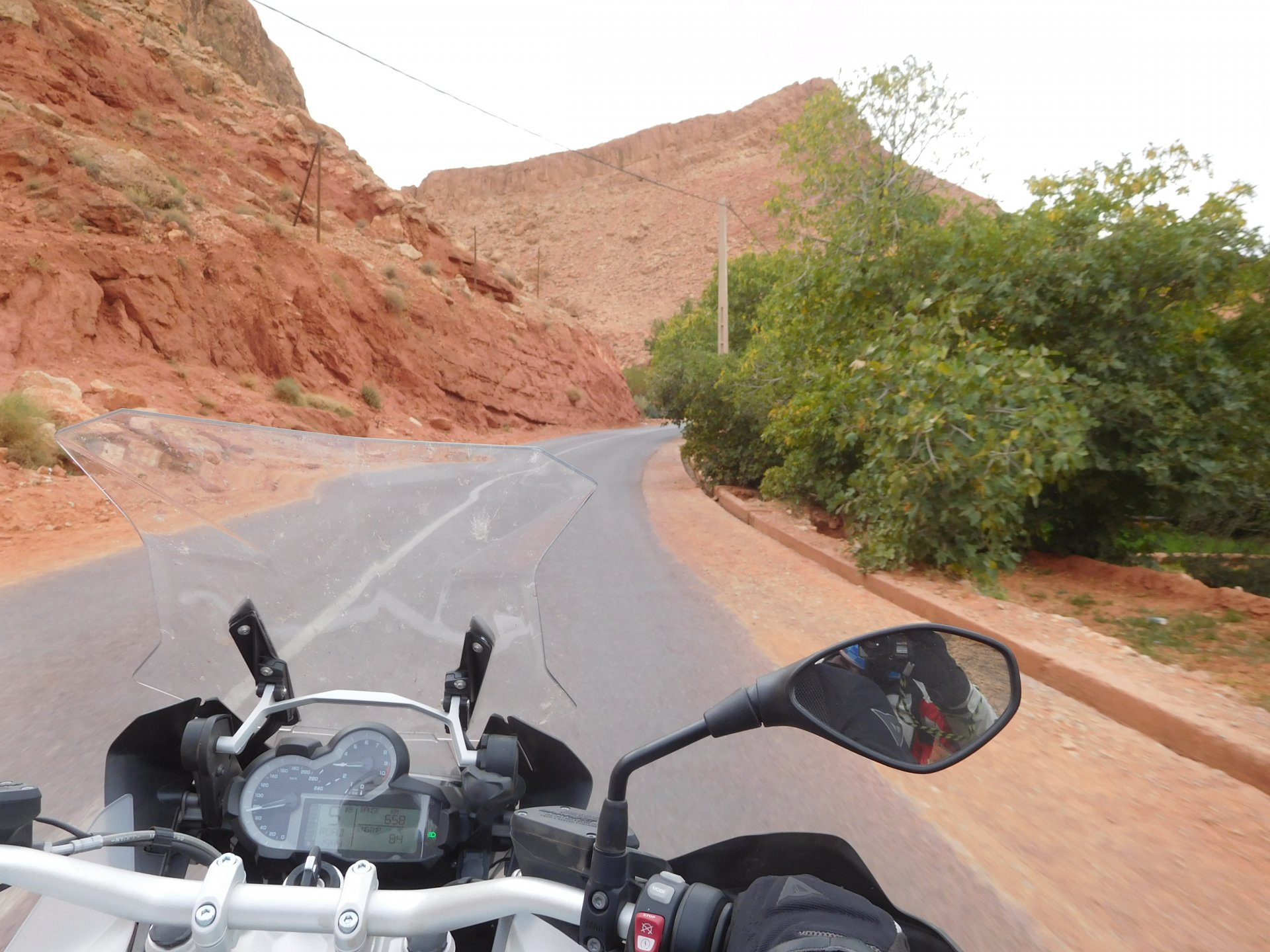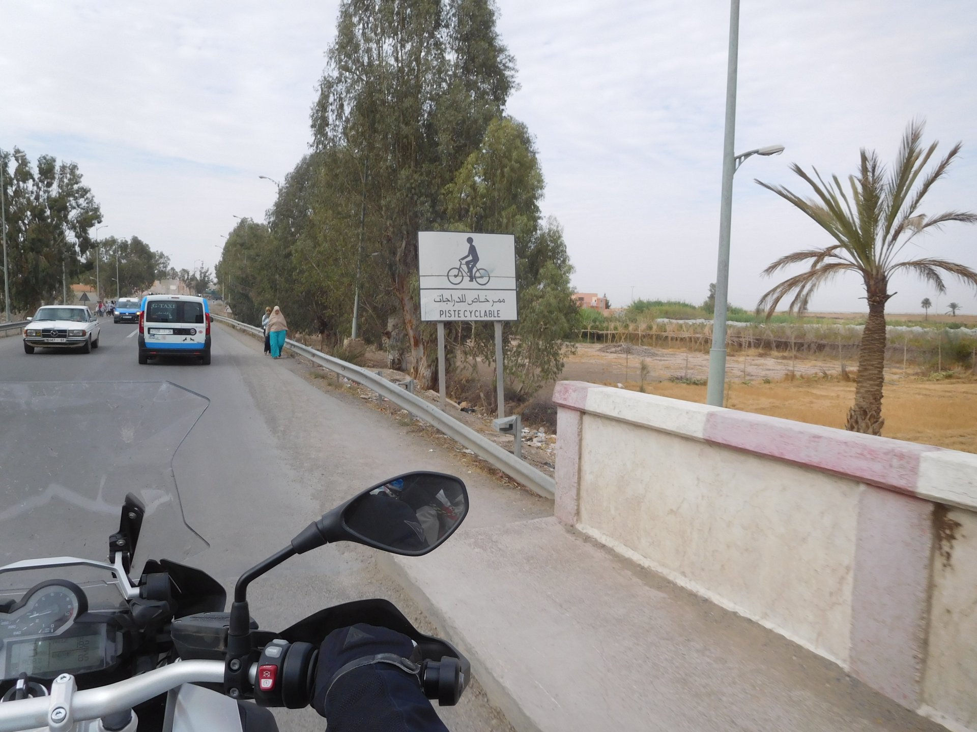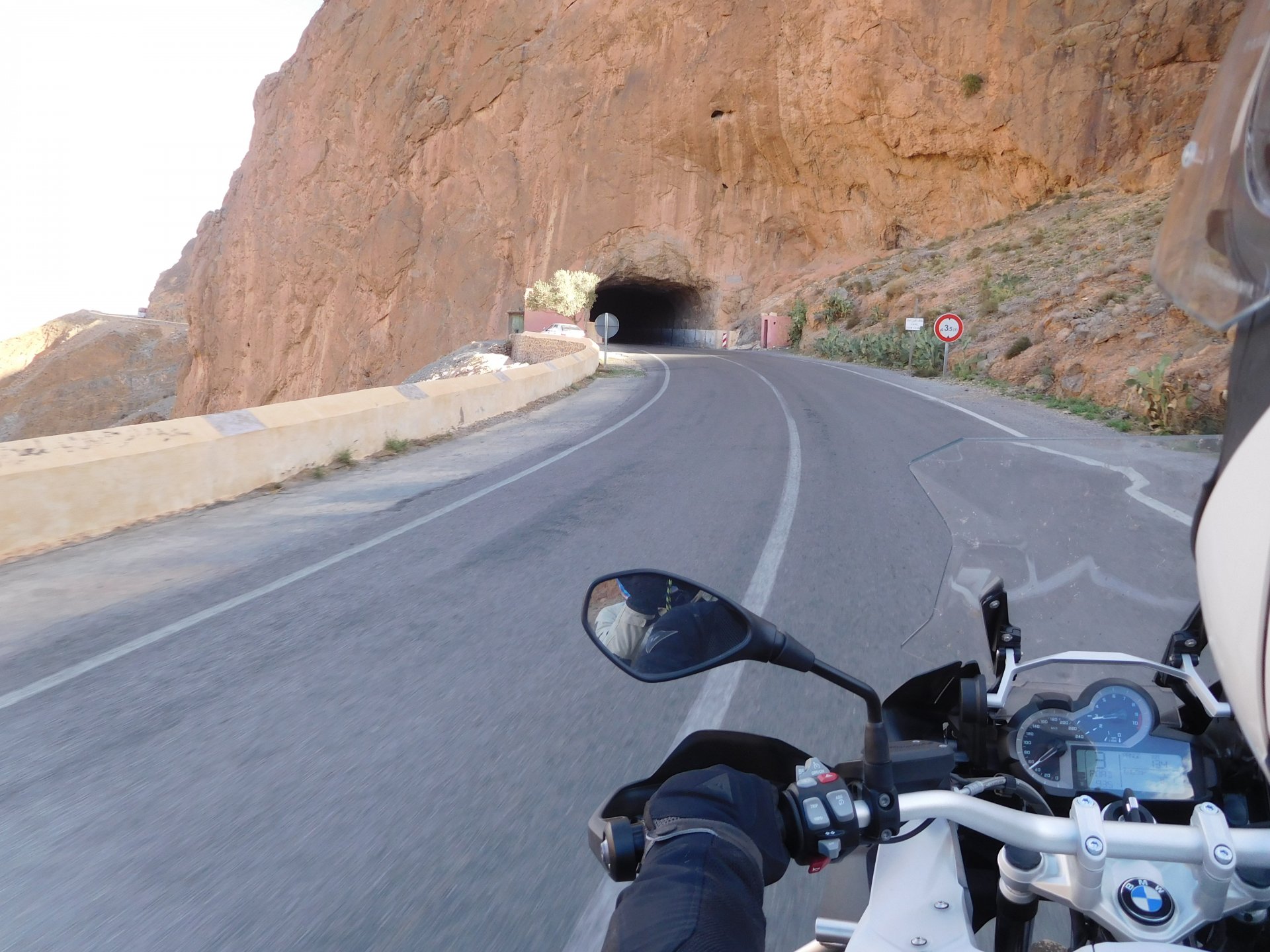 In the morning me and Maria were back on our own and moving at our own pace. This means that although not in a hurry we ended up doing things in less time, like a well oiled machine. One packs this while the other brushes his teeth, then one grabs this while the other does that, I go for the cases while she goes for the helmets, etc We have breakfast, pack the bike and leave and wave at Rui's bike. I can't lie and say there wasn't a lump in my throat as we left it there. Morning traffic in Marrakech isn't as bad just because the heat hadn't arrived yet, we just moved along with traffic heading out of the city onto the coast. As we move further away from touristy and "cosmopolitan" Marrakech: Lanes? Were were going we don't need lanes! The dial... Morocco is known for it's Argan trees, and with Argan trees come the famous goats that climb trees to eat the organ fruit, some moroccans being the clever dudes that they are, see this as a way to squeeze a couple of coins off tourists, and force goats up a tree and keep them there for tourists to snap pictures with them, while asking for a fee. This is the result, just a sad spectacle, the real thing doesn't compare to this, this is demeaning to the goats and to a proud people. A few kms further on we see the same thing but non orchestrated, but that still doesn't compare to what we saw the year after on the mountains. At the end of the morning we reached the coast at Essaouira The Portuguese had been here before, a long time ago We interrupt our walk for some lunch in a great little restaurant We had orange with cinnamon as starter and fish soup, it was tasty as it should in a fishing town. If you've never tried slicing an orange (a proper orange) and just sprinkling it with a healthy (more than this) amount of cinnamon, do it. It's exotic, very healthy, and will make you look like a chef. After our lunch we just sat inside sipping a little coffee and looking at life going about it's business outside, before carrying on with our walk back to the bike. And thus started our ride back north I don't think any of us enjoyed this part of the ride very much. We were coated with muckyness from the ocean, salty and moist, wasn't very pleasant at all. Eventually we found a place to stay, quite cheaply to be honest, with breakfast included and a swimming pool. Couldn't be any better so we stopped quite looking forward to have a swim and relax. This was is October 2016, yearlier that year Portugal had won the Euro football championship with a goal scored on the last minute, against FRANCE, and they had been pretty sore loosers. We had been getting compliments throughout this trip because football is very big in Morocco and there are few things a Moroccan likes more than to embarrass France. As soon as we presented our passports the reception guy came to hugg me and we were instantly treated like long lost relatives of his Our room's view: Our rooms view within seconds, before Maria could even find her bikini The downside to being treated as football allies against France was that in order to indulge us, the hotel staff simply went on youtube and put on portuguese folk music on a loop. We were tortured by that shit wherever we went, swimming pool, lobby, restaurant, and whenever we told them to turn it off all we got in return were big smiles, a thumbs up and an exclamation of "viva Portugal" They later confessed that Portugal beating France was celebrated on the streets with gunfire to the sky and fireworks, we should have been in Morocco that evening!