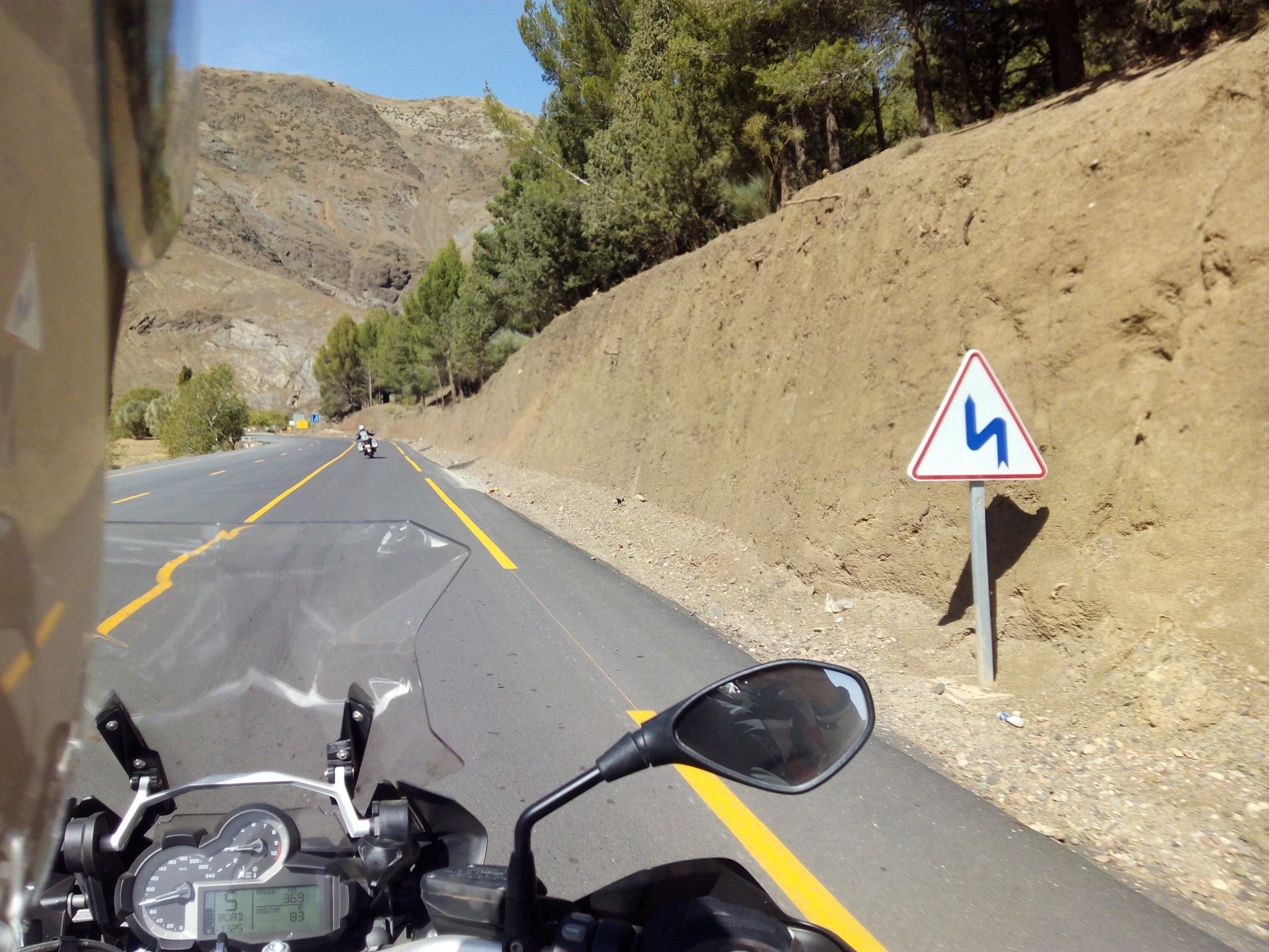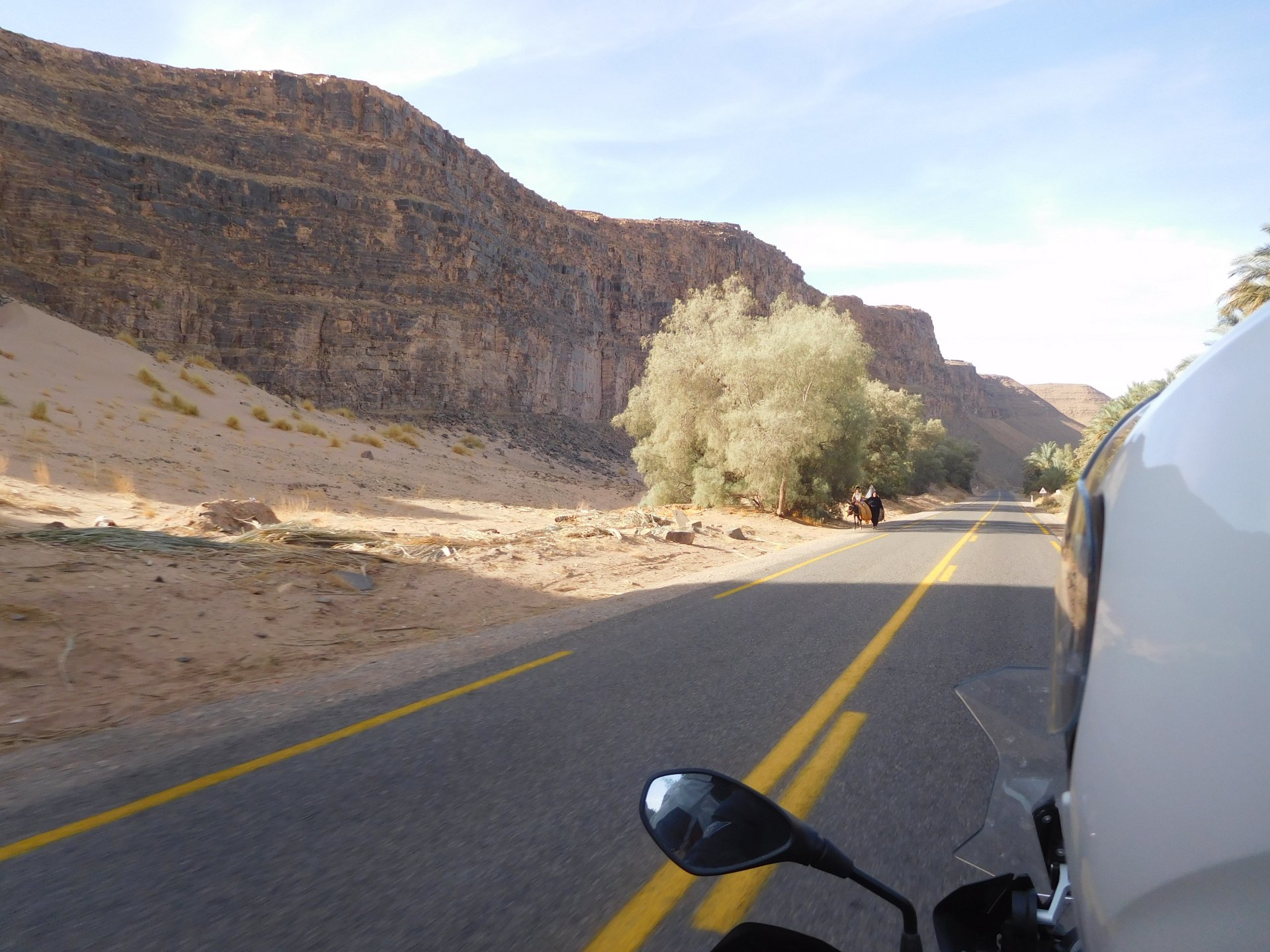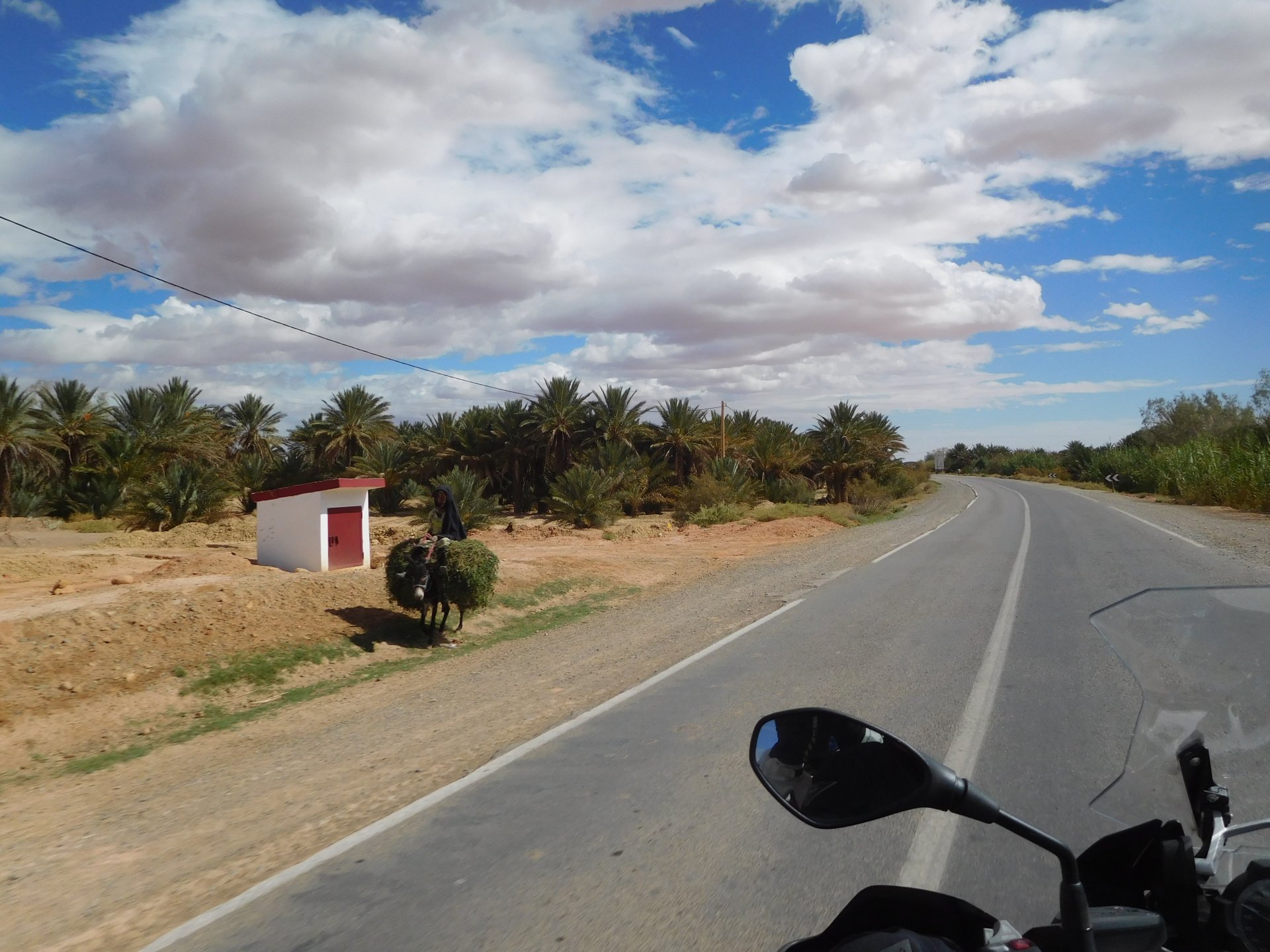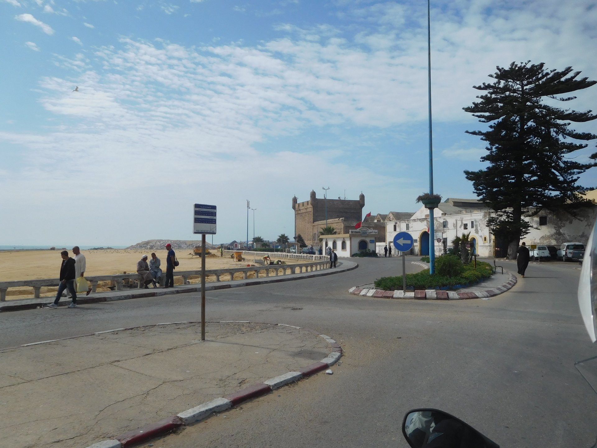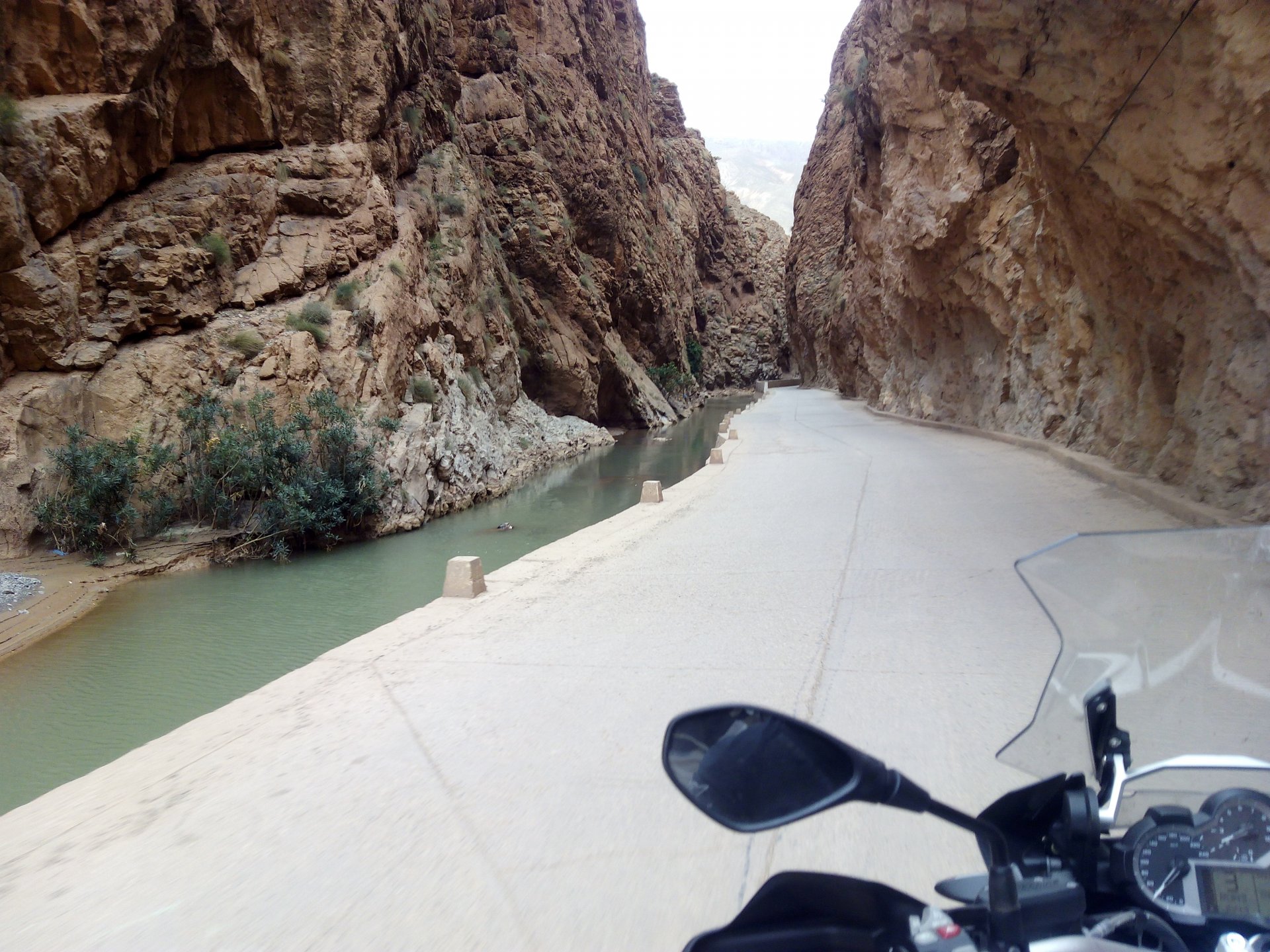 In the morning me and Maria were back on our own and moving at our own pace. This means that although not in a hurry we ended up doing things in less time, like a well oiled machine. One packs this while the other brushes his teeth, then one grabs this while the other does that, I go for the cases while she goes for the helmets, etc We have breakfast, pack the bike and leave and wave at Rui's bike. I can't lie and say there wasn't a lump in my throat as we left it there. Morning traffic in Marrakech isn't as bad just because the heat hadn't arrived yet, we just moved along with traffic heading out of the city onto the coast. As we move further away from touristy and "cosmopolitan" Marrakech: Lanes? Were were going we don't need lanes! The dial... Morocco is known for it's Argan trees, and with Argan trees come the famous goats that climb trees to eat the organ fruit, some moroccans being the clever dudes that they are, see this as a way to squeeze a couple of coins off tourists, and force goats up a tree and keep them there for tourists to snap pictures with them, while asking for a fee. This is the result, just a sad spectacle, the real thing doesn't compare to this, this is demeaning to the goats and to a proud people. A few kms further on we see the same thing but non orchestrated, but that still doesn't compare to what we saw the year after on the mountains. At the end of the morning we reached the coast at Essaouira The Portuguese had been here before, a long time ago We interrupt our walk for some lunch in a great little restaurant We had orange with cinnamon as starter and fish soup, it was tasty as it should in a fishing town. If you've never tried slicing an orange (a proper orange) and just sprinkling it with a healthy (more than this) amount of cinnamon, do it. It's exotic, very healthy, and will make you look like a chef. After our lunch we just sat inside sipping a little coffee and looking at life going about it's business outside, before carrying on with our walk back to the bike. And thus started our ride back north I don't think any of us enjoyed this part of the ride very much. We were coated with muckyness from the ocean, salty and moist, wasn't very pleasant at all. Eventually we found a place to stay, quite cheaply to be honest, with breakfast included and a swimming pool. Couldn't be any better so we stopped quite looking forward to have a swim and relax. This was is October 2016, yearlier that year Portugal had won the Euro football championship with a goal scored on the last minute, against FRANCE, and they had been pretty sore loosers. We had been getting compliments throughout this trip because football is very big in Morocco and there are few things a Moroccan likes more than to embarrass France. As soon as we presented our passports the reception guy came to hugg me and we were instantly treated like long lost relatives of his Our room's view: Our rooms view within seconds, before Maria could even find her bikini The downside to being treated as football allies against France was that in order to indulge us, the hotel staff simply went on youtube and put on portuguese folk music on a loop. We were tortured by that shit wherever we went, swimming pool, lobby, restaurant, and whenever we told them to turn it off all we got in return were big smiles, a thumbs up and an exclamation of "viva Portugal" They later confessed that Portugal beating France was celebrated on the streets with gunfire to the sky and fireworks, we should have been in Morocco that evening!