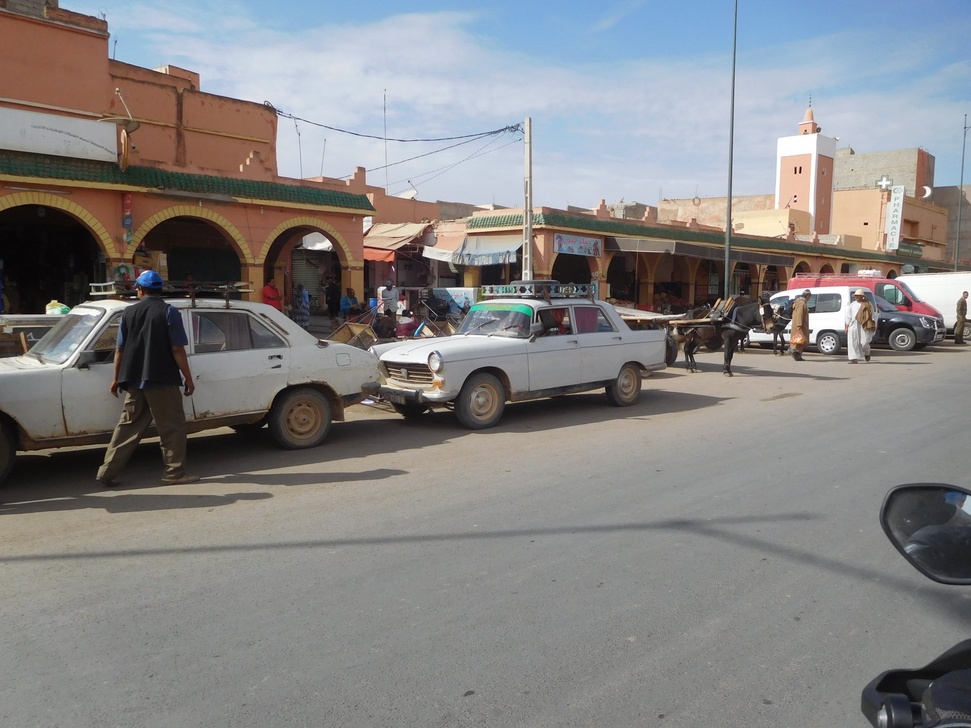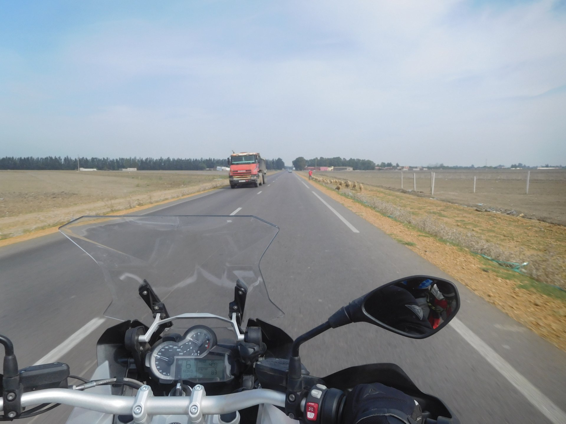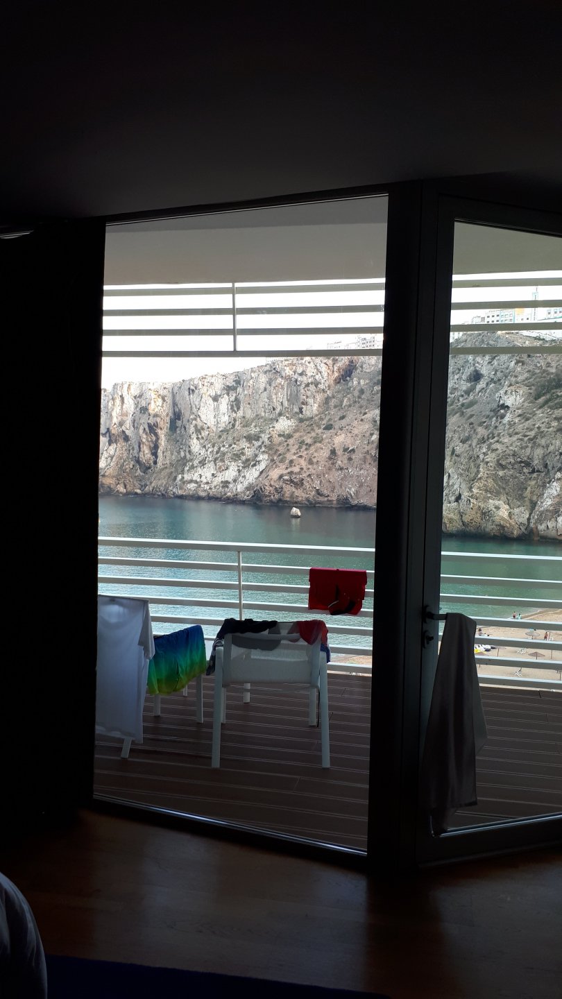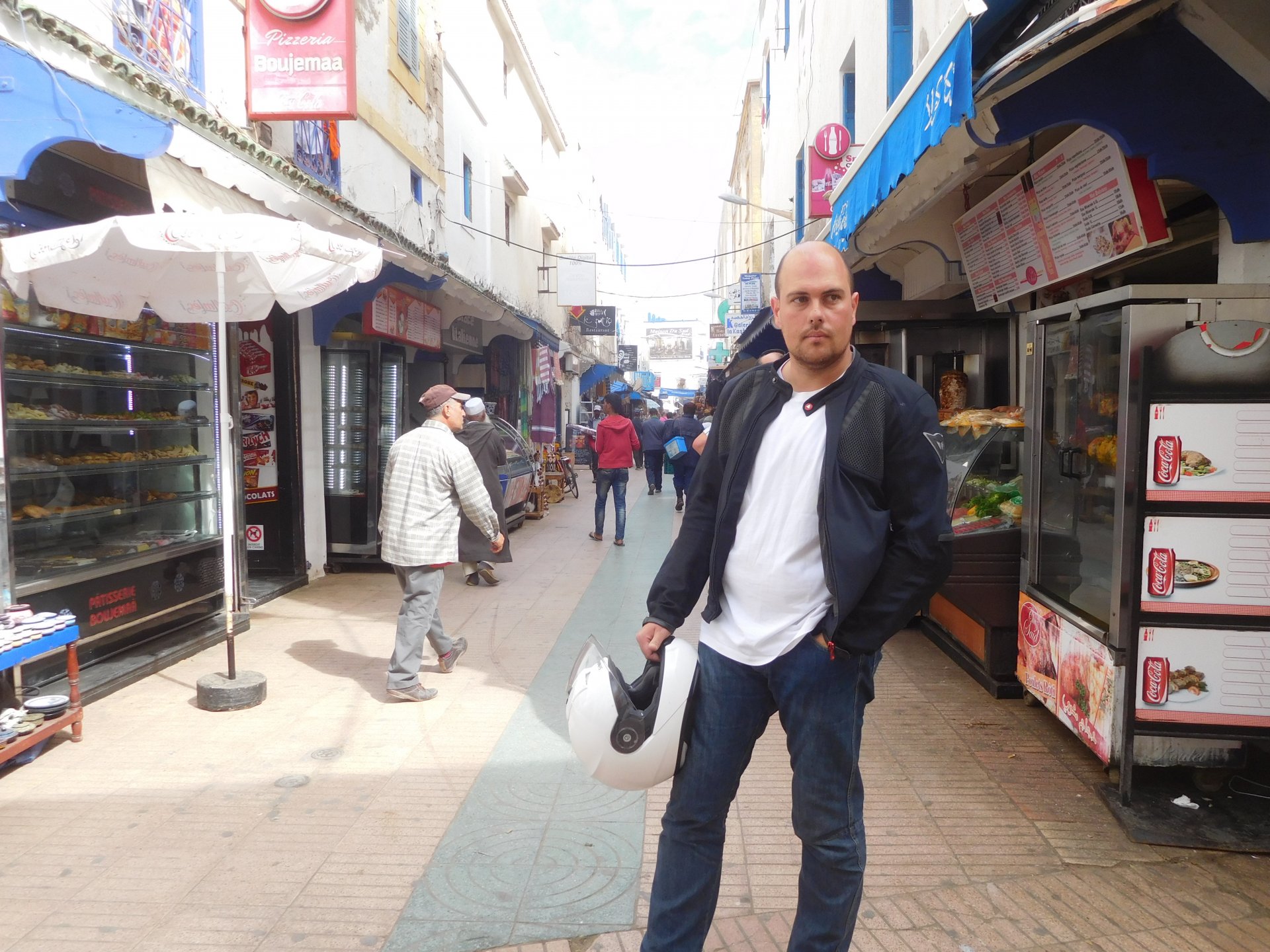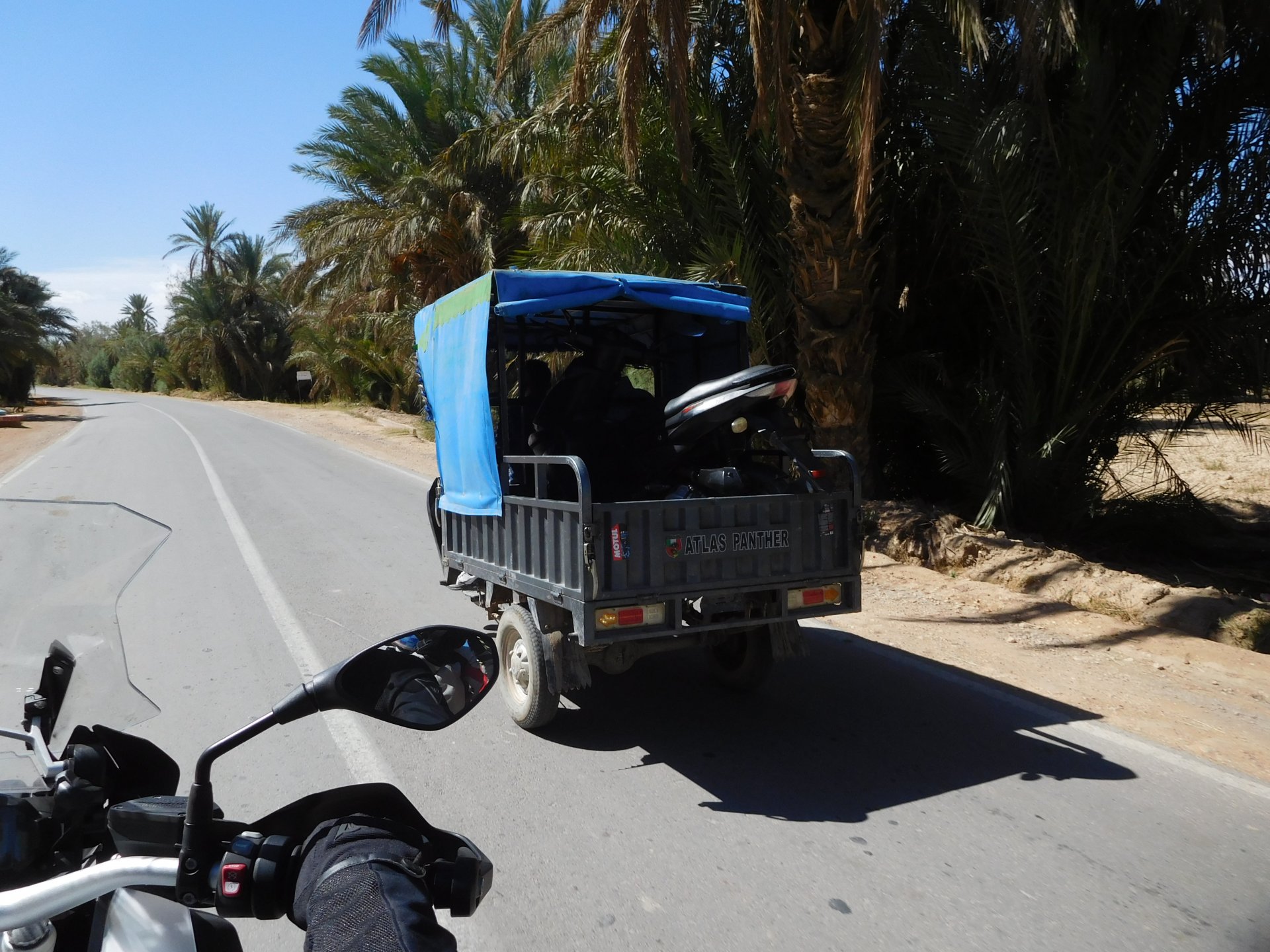 In the morning me and Maria were back on our own and moving at our own pace. This means that although not in a hurry we ended up doing things in less time, like a well oiled machine. One packs this while the other brushes his teeth, then one grabs this while the other does that, I go for the cases while she goes for the helmets, etc We have breakfast, pack the bike and leave and wave at Rui's bike. I can't lie and say there wasn't a lump in my throat as we left it there. Morning traffic in Marrakech isn't as bad just because the heat hadn't arrived yet, we just moved along with traffic heading out of the city onto the coast. As we move further away from touristy and "cosmopolitan" Marrakech: Lanes? Were were going we don't need lanes! The dial... Morocco is known for it's Argan trees, and with Argan trees come the famous goats that climb trees to eat the organ fruit, some moroccans being the clever dudes that they are, see this as a way to squeeze a couple of coins off tourists, and force goats up a tree and keep them there for tourists to snap pictures with them, while asking for a fee. This is the result, just a sad spectacle, the real thing doesn't compare to this, this is demeaning to the goats and to a proud people. A few kms further on we see the same thing but non orchestrated, but that still doesn't compare to what we saw the year after on the mountains. At the end of the morning we reached the coast at Essaouira The Portuguese had been here before, a long time ago We interrupt our walk for some lunch in a great little restaurant We had orange with cinnamon as starter and fish soup, it was tasty as it should in a fishing town. If you've never tried slicing an orange (a proper orange) and just sprinkling it with a healthy (more than this) amount of cinnamon, do it. It's exotic, very healthy, and will make you look like a chef. After our lunch we just sat inside sipping a little coffee and looking at life going about it's business outside, before carrying on with our walk back to the bike. And thus started our ride back north I don't think any of us enjoyed this part of the ride very much. We were coated with muckyness from the ocean, salty and moist, wasn't very pleasant at all. Eventually we found a place to stay, quite cheaply to be honest, with breakfast included and a swimming pool. Couldn't be any better so we stopped quite looking forward to have a swim and relax. This was is October 2016, yearlier that year Portugal had won the Euro football championship with a goal scored on the last minute, against FRANCE, and they had been pretty sore loosers. We had been getting compliments throughout this trip because football is very big in Morocco and there are few things a Moroccan likes more than to embarrass France. As soon as we presented our passports the reception guy came to hugg me and we were instantly treated like long lost relatives of his Our room's view: Our rooms view within seconds, before Maria could even find her bikini The downside to being treated as football allies against France was that in order to indulge us, the hotel staff simply went on youtube and put on portuguese folk music on a loop. We were tortured by that shit wherever we went, swimming pool, lobby, restaurant, and whenever we told them to turn it off all we got in return were big smiles, a thumbs up and an exclamation of "viva Portugal" They later confessed that Portugal beating France was celebrated on the streets with gunfire to the sky and fireworks, we should have been in Morocco that evening!