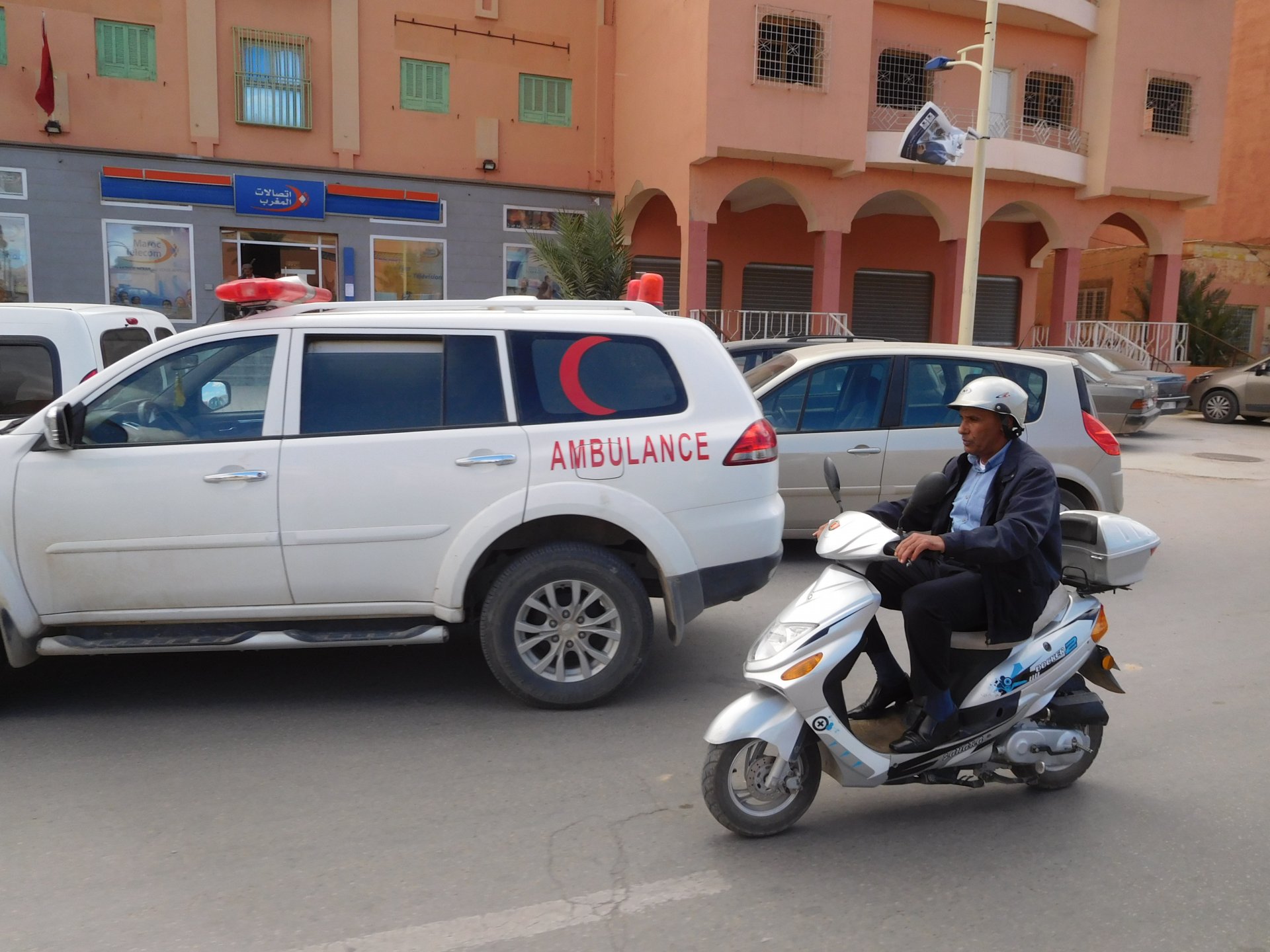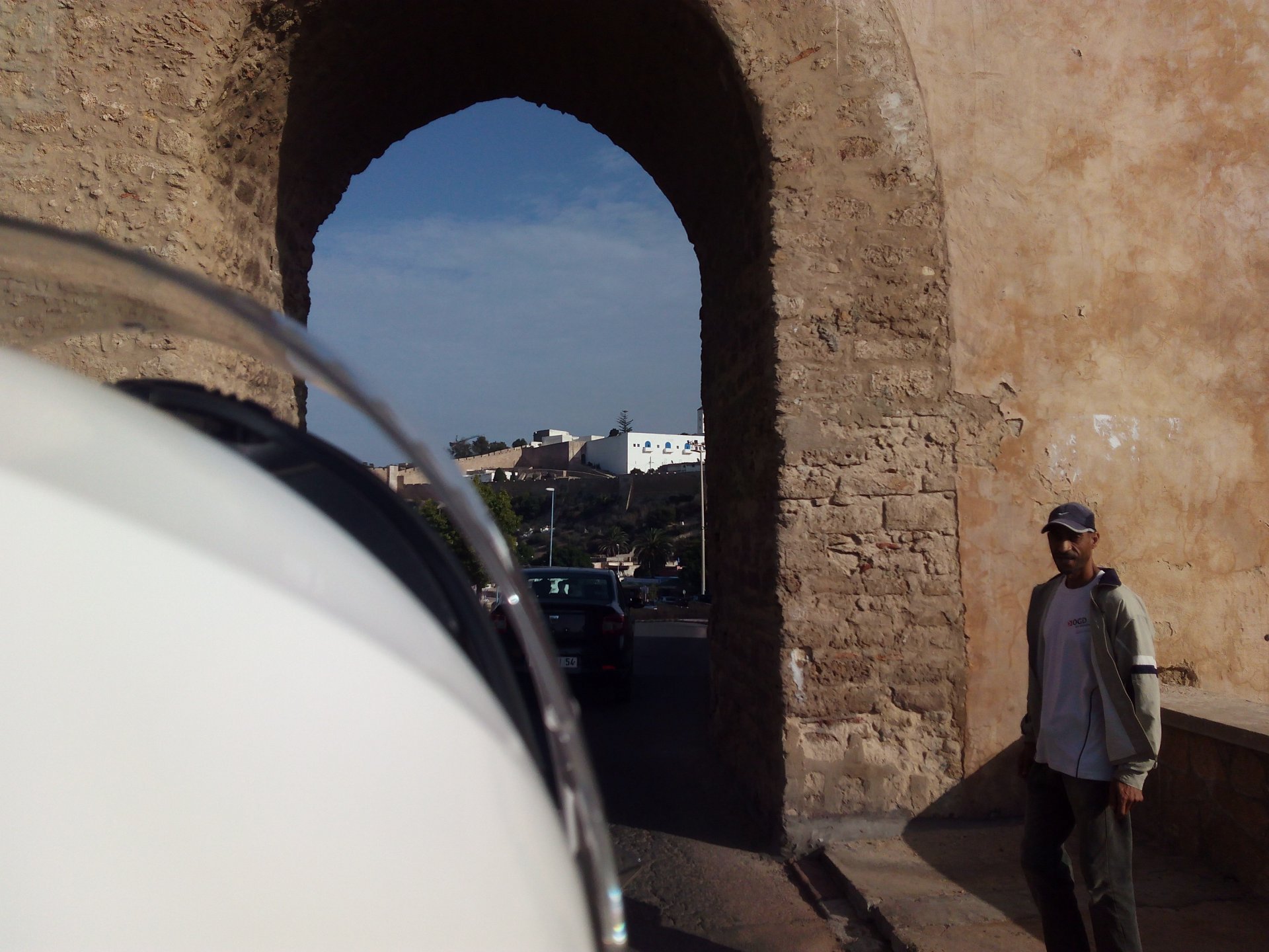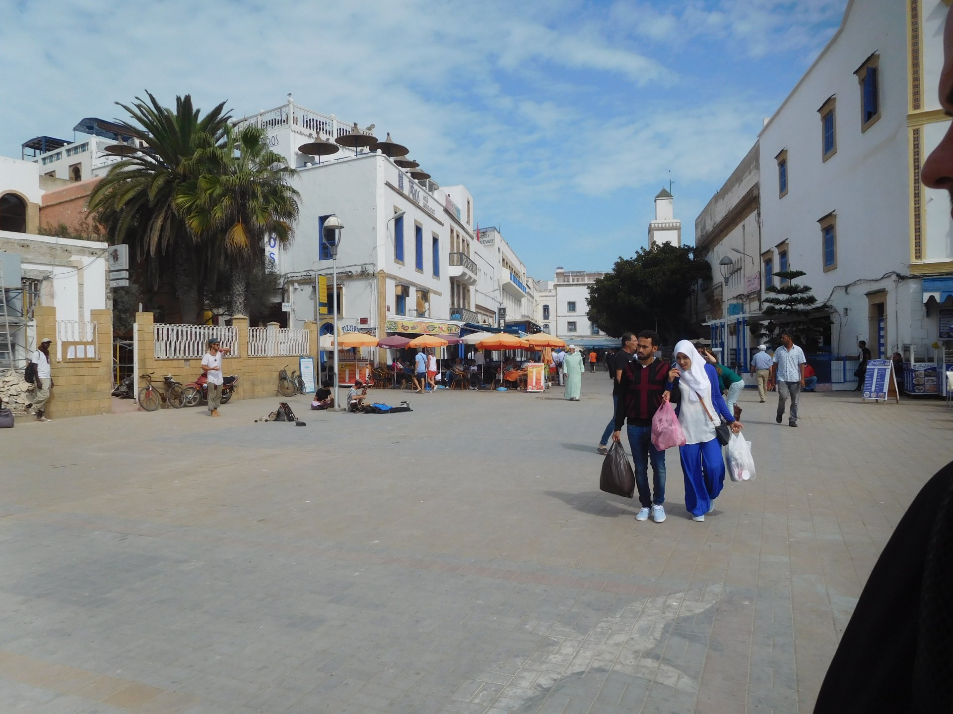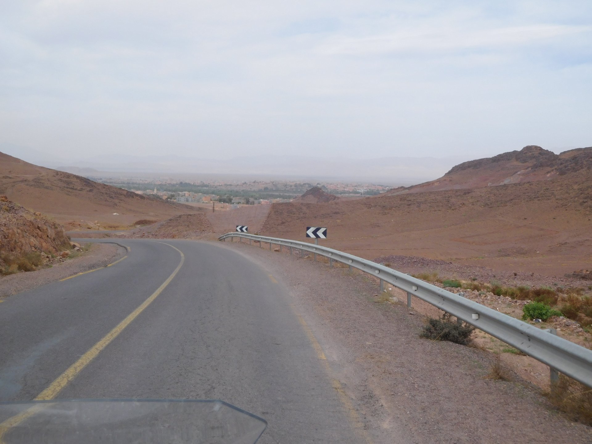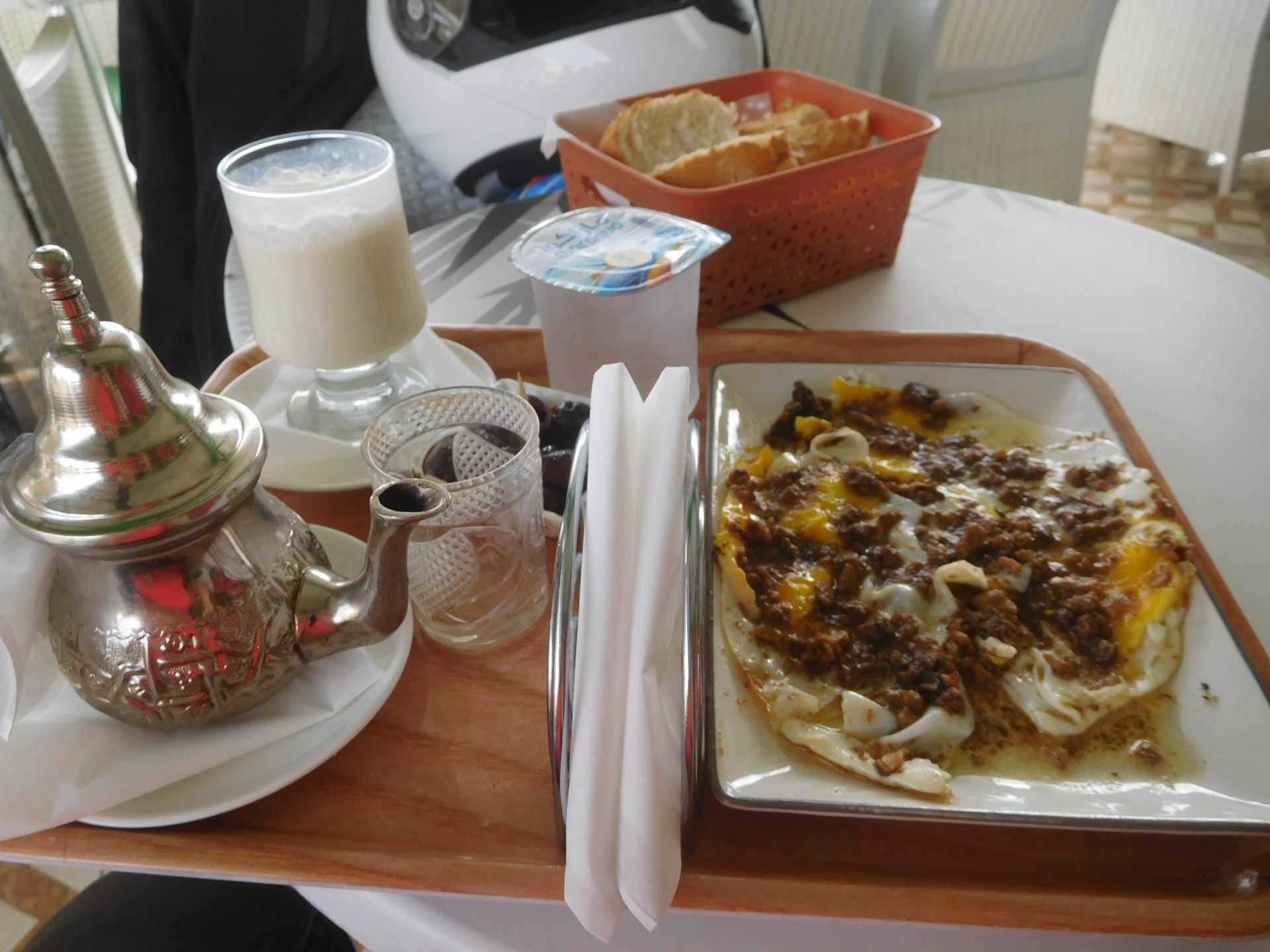 In the morning me and Maria were back on our own and moving at our own pace. This means that although not in a hurry we ended up doing things in less time, like a well oiled machine. One packs this while the other brushes his teeth, then one grabs this while the other does that, I go for the cases while she goes for the helmets, etc We have breakfast, pack the bike and leave and wave at Rui's bike. I can't lie and say there wasn't a lump in my throat as we left it there. Morning traffic in Marrakech isn't as bad just because the heat hadn't arrived yet, we just moved along with traffic heading out of the city onto the coast. As we move further away from touristy and "cosmopolitan" Marrakech: Lanes? Were were going we don't need lanes! The dial... Morocco is known for it's Argan trees, and with Argan trees come the famous goats that climb trees to eat the organ fruit, some moroccans being the clever dudes that they are, see this as a way to squeeze a couple of coins off tourists, and force goats up a tree and keep them there for tourists to snap pictures with them, while asking for a fee. This is the result, just a sad spectacle, the real thing doesn't compare to this, this is demeaning to the goats and to a proud people. A few kms further on we see the same thing but non orchestrated, but that still doesn't compare to what we saw the year after on the mountains. At the end of the morning we reached the coast at Essaouira The Portuguese had been here before, a long time ago We interrupt our walk for some lunch in a great little restaurant We had orange with cinnamon as starter and fish soup, it was tasty as it should in a fishing town. If you've never tried slicing an orange (a proper orange) and just sprinkling it with a healthy (more than this) amount of cinnamon, do it. It's exotic, very healthy, and will make you look like a chef. After our lunch we just sat inside sipping a little coffee and looking at life going about it's business outside, before carrying on with our walk back to the bike. And thus started our ride back north I don't think any of us enjoyed this part of the ride very much. We were coated with muckyness from the ocean, salty and moist, wasn't very pleasant at all. Eventually we found a place to stay, quite cheaply to be honest, with breakfast included and a swimming pool. Couldn't be any better so we stopped quite looking forward to have a swim and relax. This was is October 2016, yearlier that year Portugal had won the Euro football championship with a goal scored on the last minute, against FRANCE, and they had been pretty sore loosers. We had been getting compliments throughout this trip because football is very big in Morocco and there are few things a Moroccan likes more than to embarrass France. As soon as we presented our passports the reception guy came to hugg me and we were instantly treated like long lost relatives of his Our room's view: Our rooms view within seconds, before Maria could even find her bikini The downside to being treated as football allies against France was that in order to indulge us, the hotel staff simply went on youtube and put on portuguese folk music on a loop. We were tortured by that shit wherever we went, swimming pool, lobby, restaurant, and whenever we told them to turn it off all we got in return were big smiles, a thumbs up and an exclamation of "viva Portugal" They later confessed that Portugal beating France was celebrated on the streets with gunfire to the sky and fireworks, we should have been in Morocco that evening!