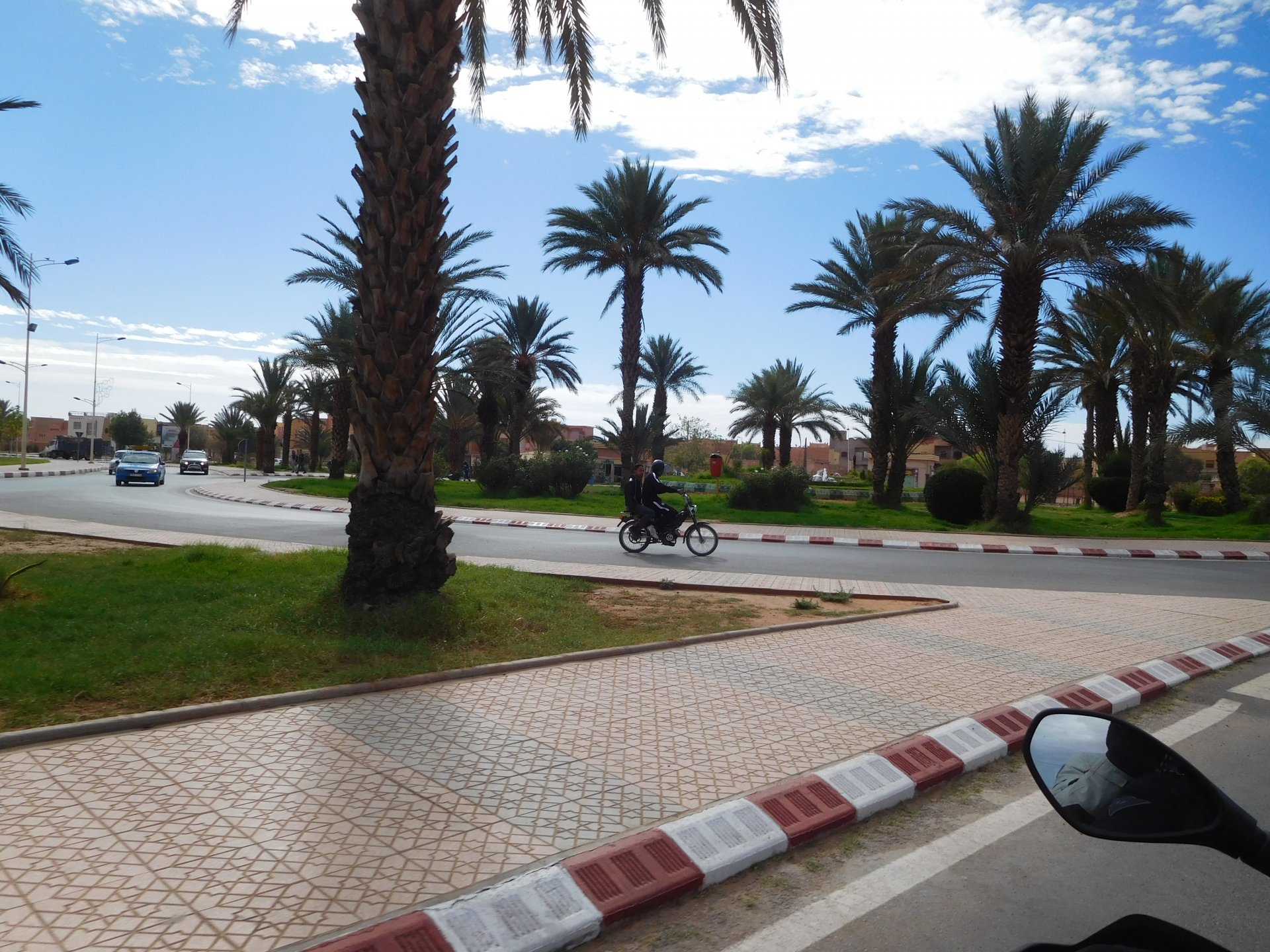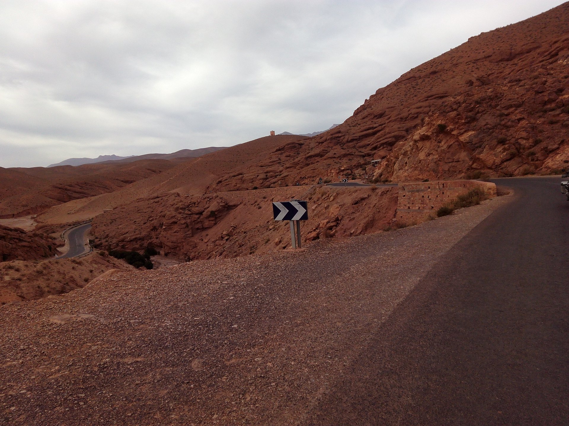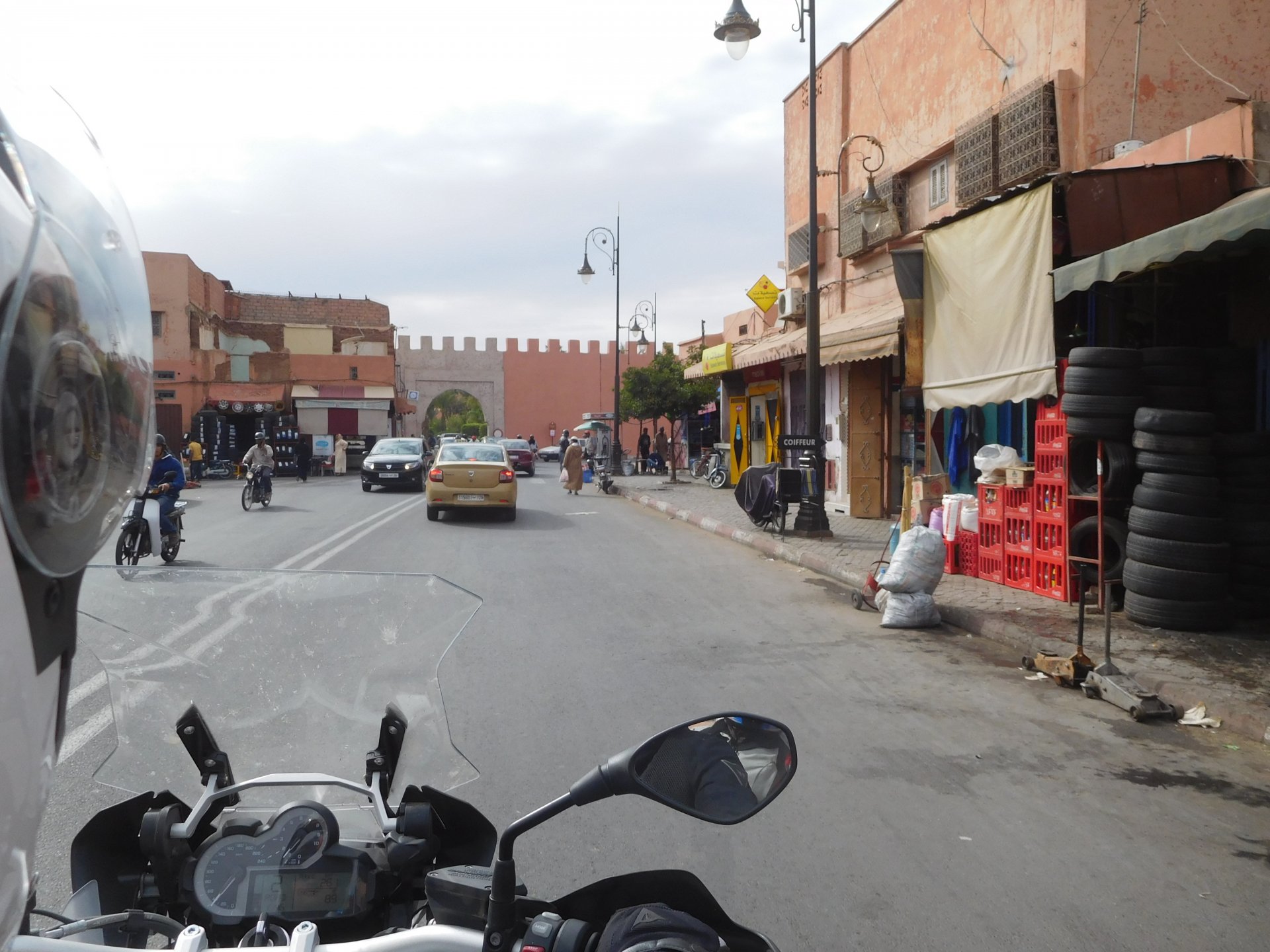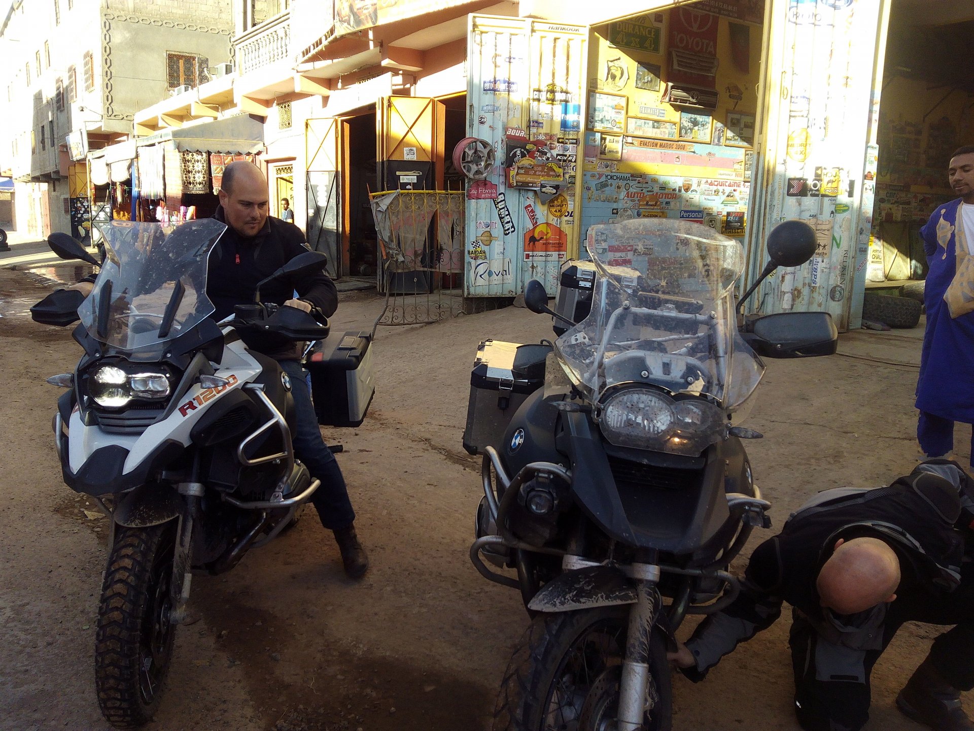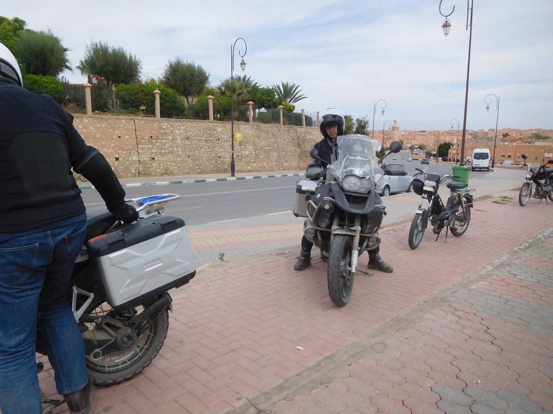 I might have ingested some of those pool water during the day, and felt a little nauseous as well from some lip balm Maria made me wear on account of my dry and cracked lips, the result of said events was that I slept like crap and felt like throwing up throughout the night. We were supposed to sleep in Zagora that day, but I really didn't feel able to get on the bike. Rui was an EMT and had come prepared with some magic stuff, a quick injection, some light breakfast, and an hour later I'm on the bike feeling great. To this day I don't know what it was he gave me. Off we go And just like that, 400km later we're having cold water in Mhamid, no sandstorm drama this time Back in Zagora, for some reason we have no foots of that hotel and evening, it was quite nice sitting outside under some thick trees. Only picture I have is of the concierge's assistant Before heading off to Ouarzazate, in the morning we visited the friendly mechanics and put a sticker on my new bike. Off we go back north, our destination was Marrakesh but first we would sleep somewhere as we were going through the Gorges du Dades and that means a lot of mountain roads, not fast going like here. Stopping to take in the views, we were approached by this guy whose name I was unfortunate enough to forget trying to sell dates (the fruit). We bought some but then he invited us for some tea. His dad did maintenance on cell or tv signal towers there, and he spent a lot of time up there selling dates to tourists. He was pationate about football, and new more about the portuguese league than I did We said our farewells, and got going. Judging by our current location, I wanted us to sleep at the rock hotel built on top of the Gorge du Dades, so we covered ground to get there still with daytime enough to enjoy the place. A brief stop in Oarzazate for something to eat and Rui dropped his bike taking it off the center stand, to receive a few laughs by people sitting in the restaurant. Had we not lightened his gin and vodka load it would have been even harder to pick up Roads were pretty great getting there, although not as dark as on these pictures. Up there would be our accommodations for the night These switchbacks are nothing special as a road, but the place itself is worthy of a good 10 minute stare. We explored the area a little bit, just trying to be good hosts to Rui as he hadn't been here before. And back to our rooms for the night Our meal didn't get on camera, however it was simple and delicious. As the evening was getting cold, a hot meal does wonders for you. There was not much in the way of entertainment, no internet, and 15 minutes after we made it to our rooms the generator was off and we were in complete darkness. The drone of a couple of trucks negotiating the hairpins made us feel sorry for those poor guys driving old-fashioned trucks with no assisted steering and little in the way of lights on that road, but after two or three trucks traffic stopped completely and we slept soundly. Bed was hard but comfy, with heavy whoolen covers. We woke up rejuvenated.