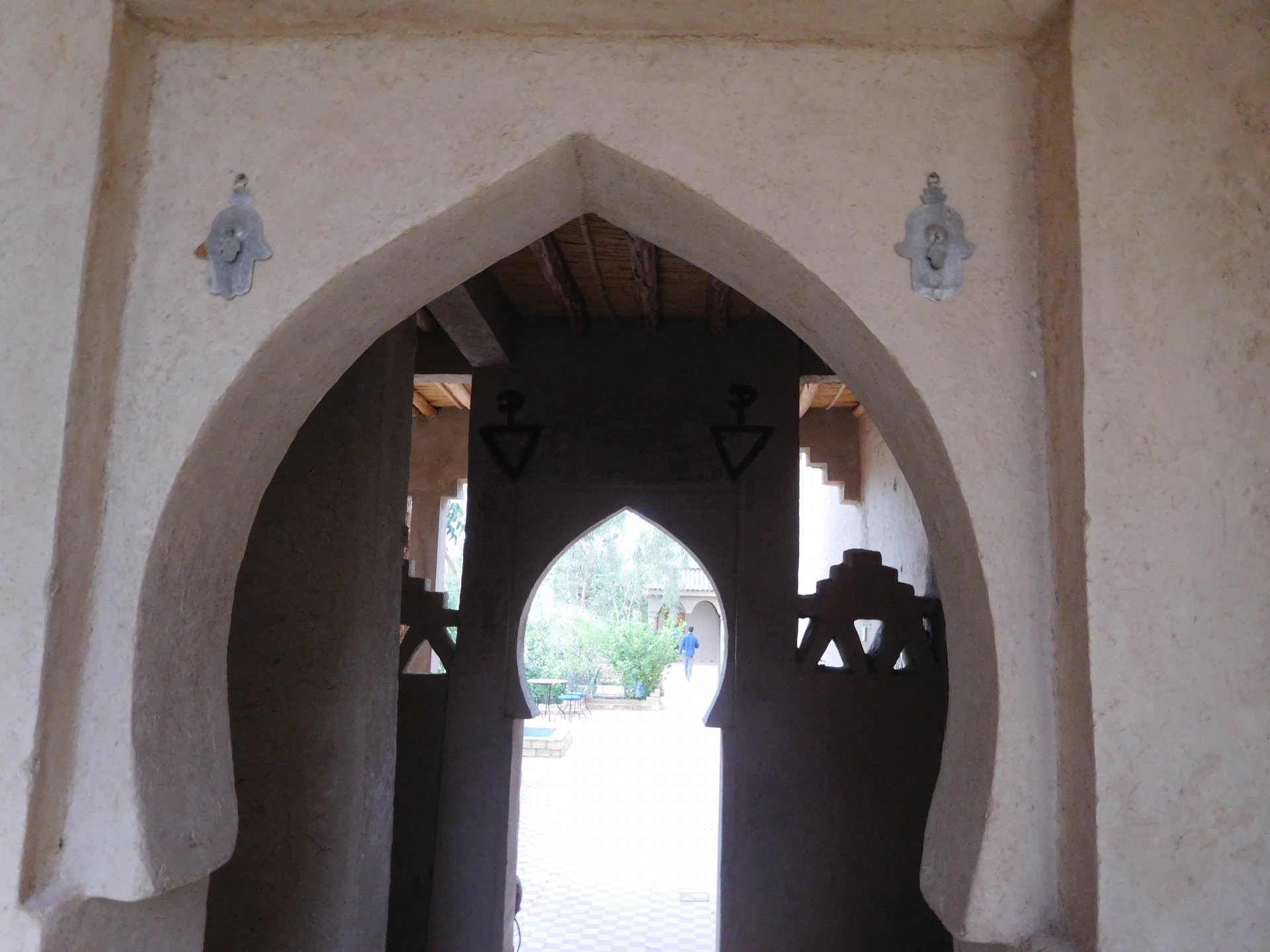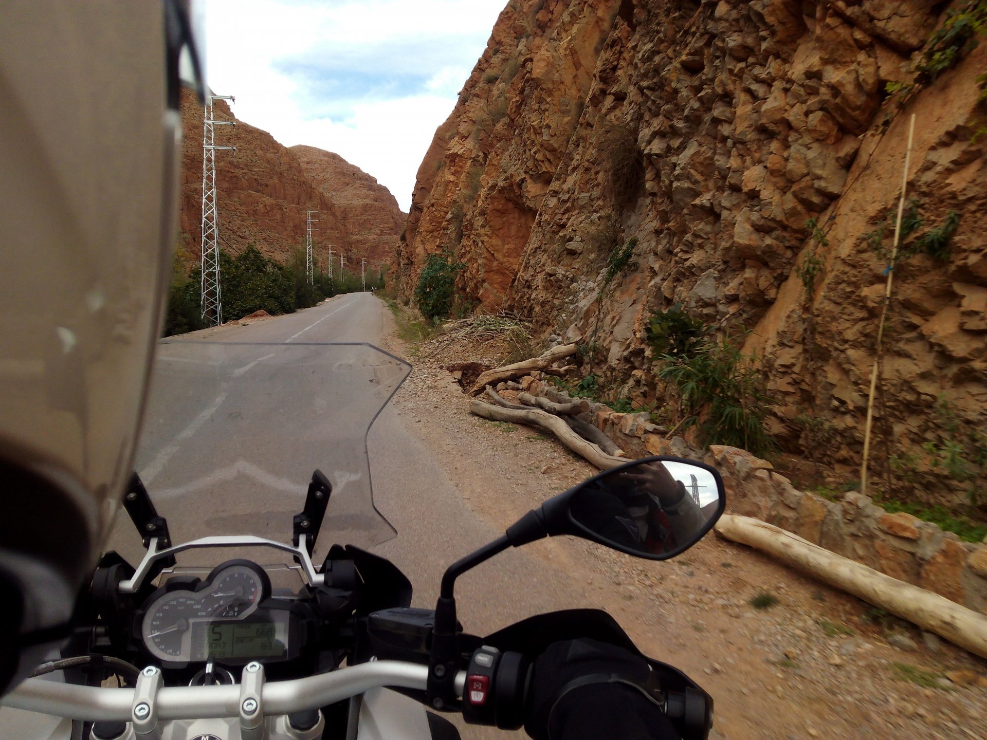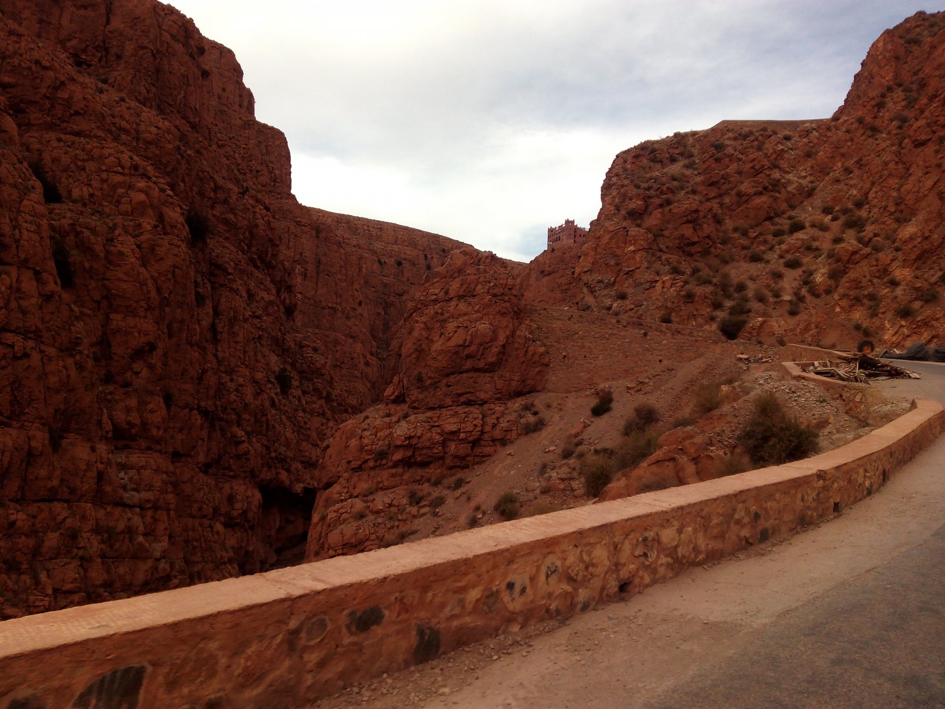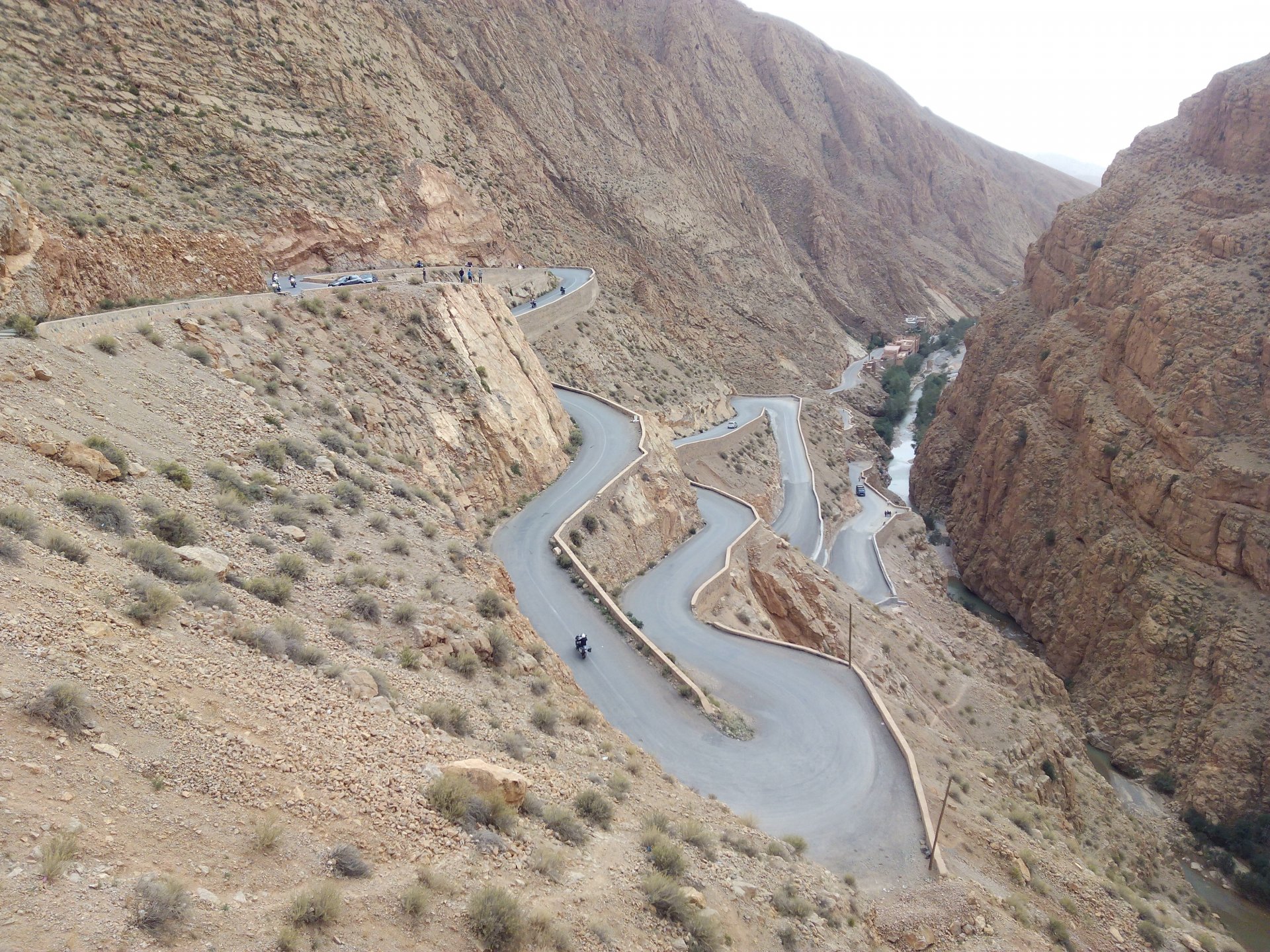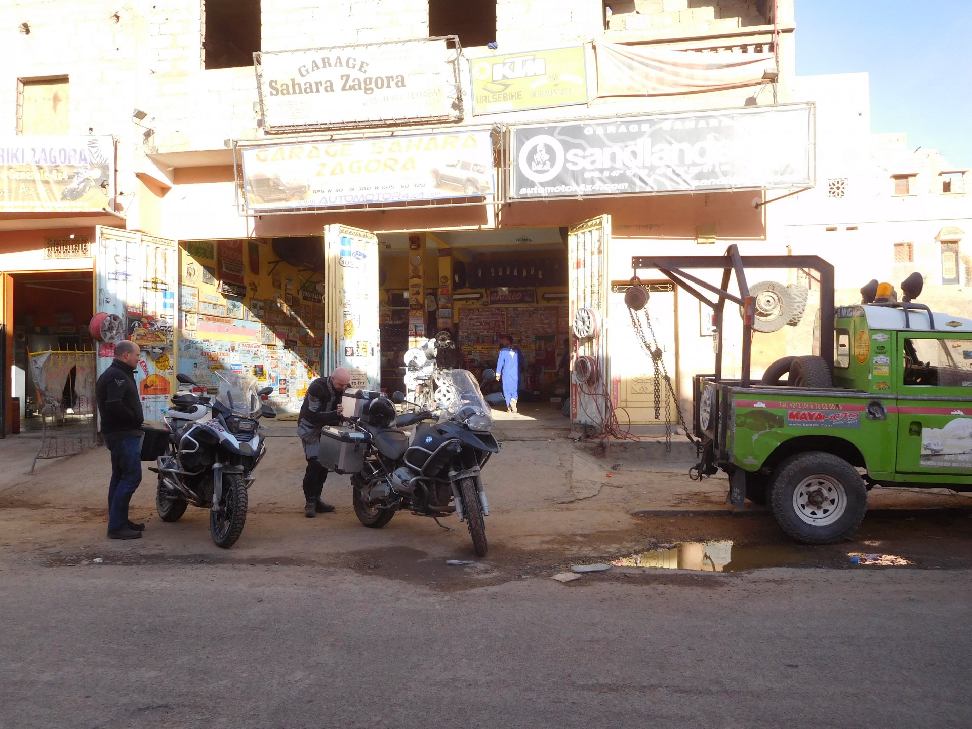 I might have ingested some of those pool water during the day, and felt a little nauseous as well from some lip balm Maria made me wear on account of my dry and cracked lips, the result of said events was that I slept like crap and felt like throwing up throughout the night. We were supposed to sleep in Zagora that day, but I really didn't feel able to get on the bike. Rui was an EMT and had come prepared with some magic stuff, a quick injection, some light breakfast, and an hour later I'm on the bike feeling great. To this day I don't know what it was he gave me. Off we go And just like that, 400km later we're having cold water in Mhamid, no sandstorm drama this time Back in Zagora, for some reason we have no foots of that hotel and evening, it was quite nice sitting outside under some thick trees. Only picture I have is of the concierge's assistant Before heading off to Ouarzazate, in the morning we visited the friendly mechanics and put a sticker on my new bike. Off we go back north, our destination was Marrakesh but first we would sleep somewhere as we were going through the Gorges du Dades and that means a lot of mountain roads, not fast going like here. Stopping to take in the views, we were approached by this guy whose name I was unfortunate enough to forget trying to sell dates (the fruit). We bought some but then he invited us for some tea. His dad did maintenance on cell or tv signal towers there, and he spent a lot of time up there selling dates to tourists. He was pationate about football, and new more about the portuguese league than I did We said our farewells, and got going. Judging by our current location, I wanted us to sleep at the rock hotel built on top of the Gorge du Dades, so we covered ground to get there still with daytime enough to enjoy the place. A brief stop in Oarzazate for something to eat and Rui dropped his bike taking it off the center stand, to receive a few laughs by people sitting in the restaurant. Had we not lightened his gin and vodka load it would have been even harder to pick up Roads were pretty great getting there, although not as dark as on these pictures. Up there would be our accommodations for the night These switchbacks are nothing special as a road, but the place itself is worthy of a good 10 minute stare. We explored the area a little bit, just trying to be good hosts to Rui as he hadn't been here before. And back to our rooms for the night Our meal didn't get on camera, however it was simple and delicious. As the evening was getting cold, a hot meal does wonders for you. There was not much in the way of entertainment, no internet, and 15 minutes after we made it to our rooms the generator was off and we were in complete darkness. The drone of a couple of trucks negotiating the hairpins made us feel sorry for those poor guys driving old-fashioned trucks with no assisted steering and little in the way of lights on that road, but after two or three trucks traffic stopped completely and we slept soundly. Bed was hard but comfy, with heavy whoolen covers. We woke up rejuvenated.