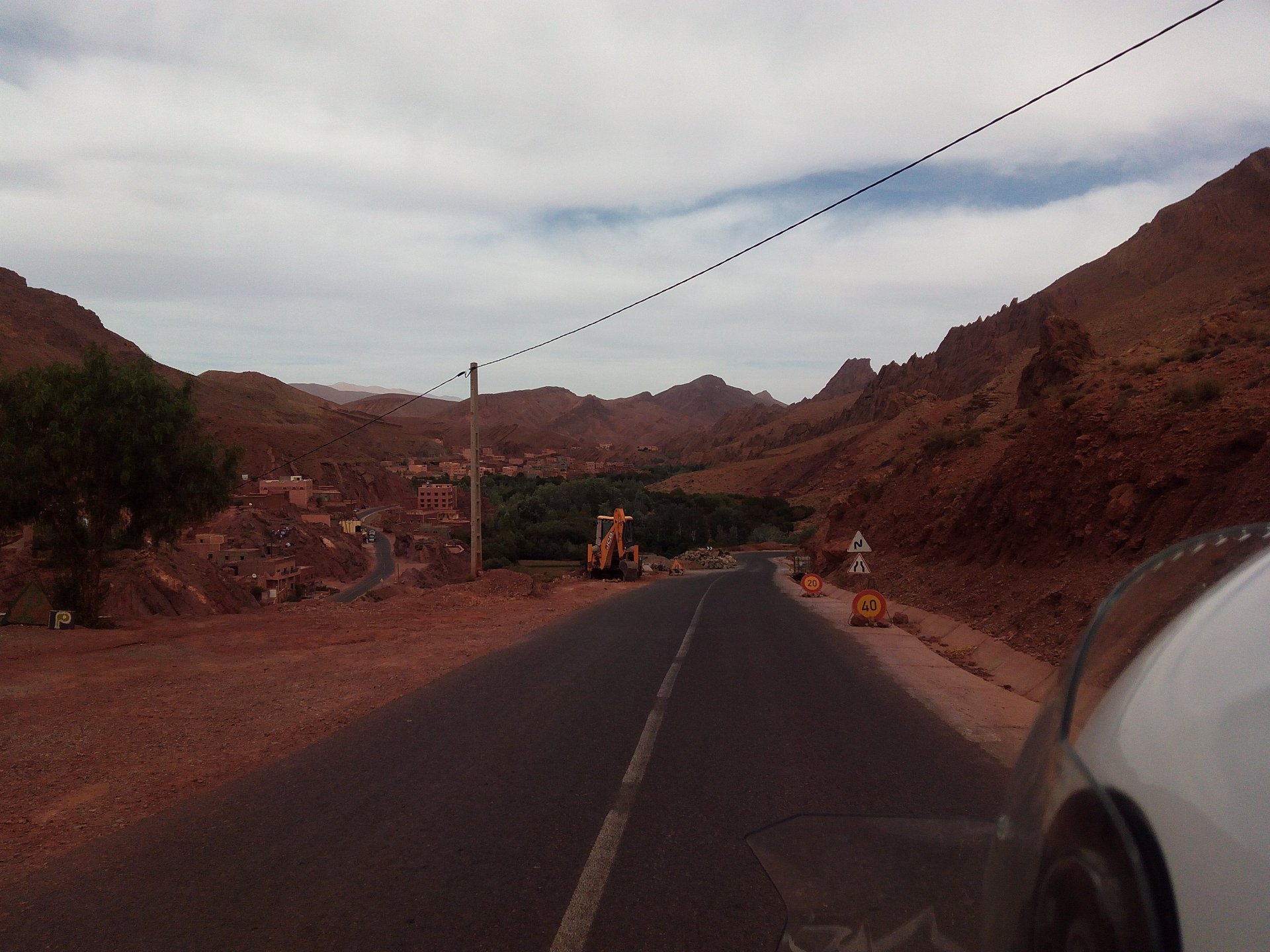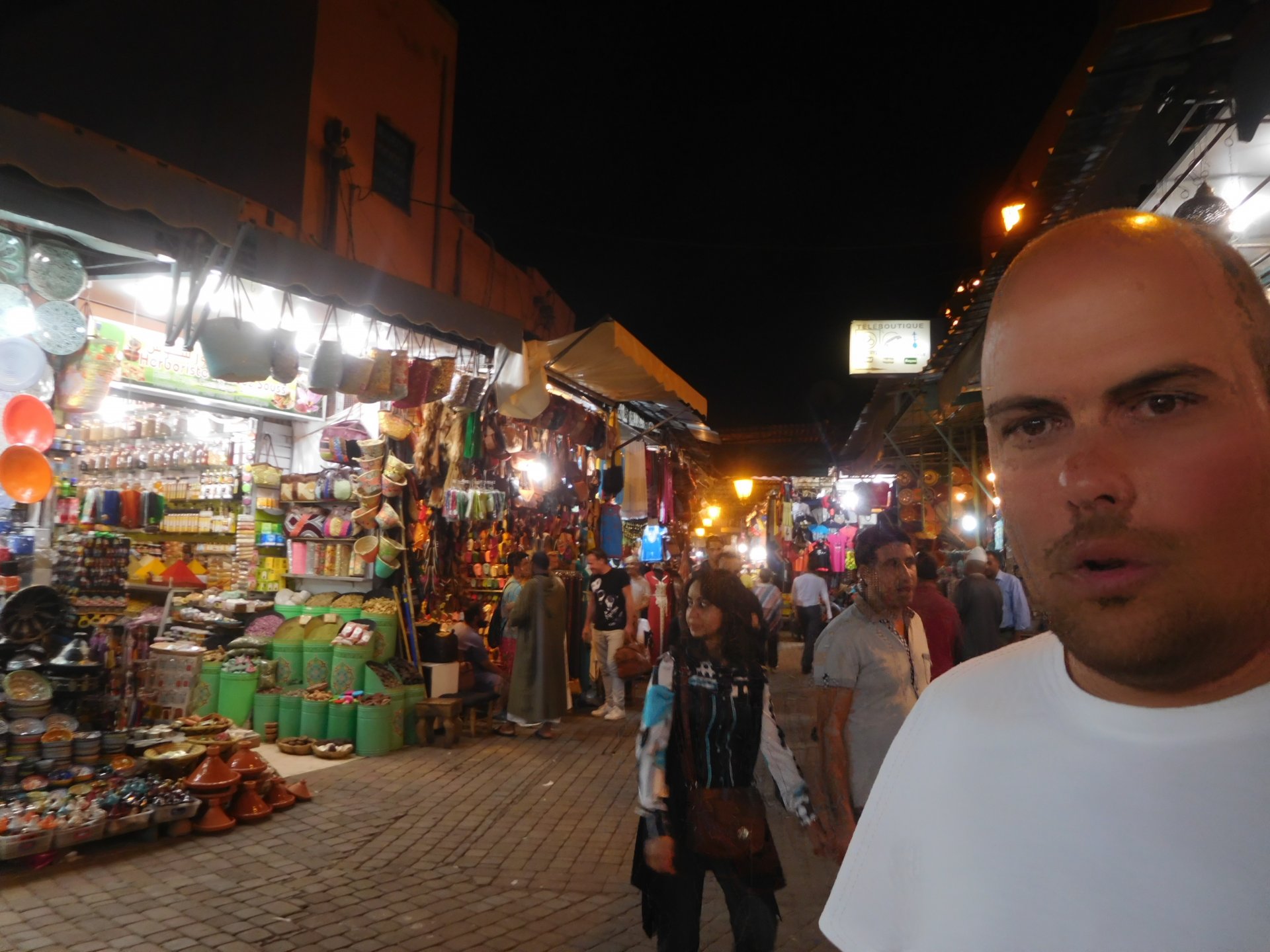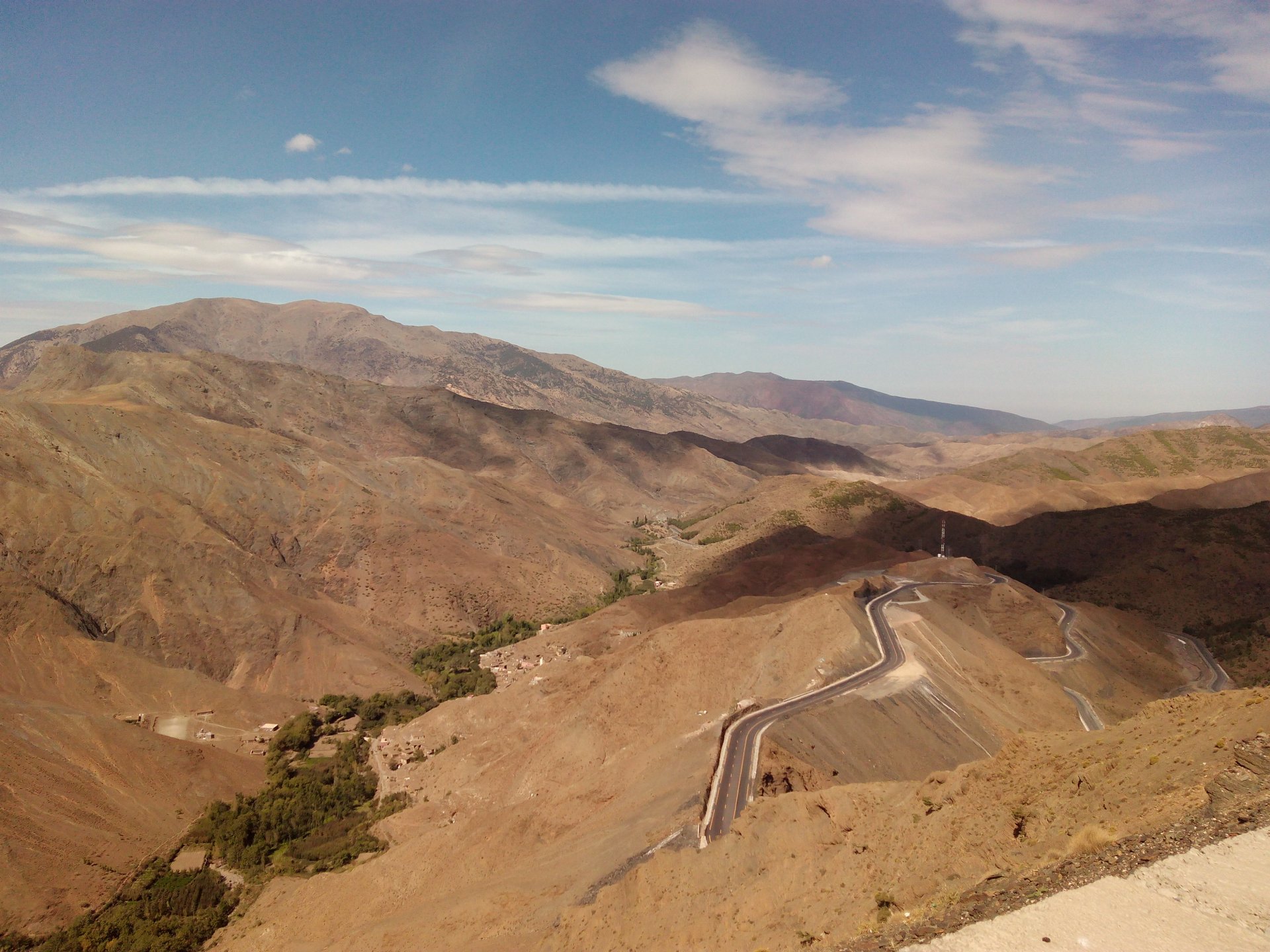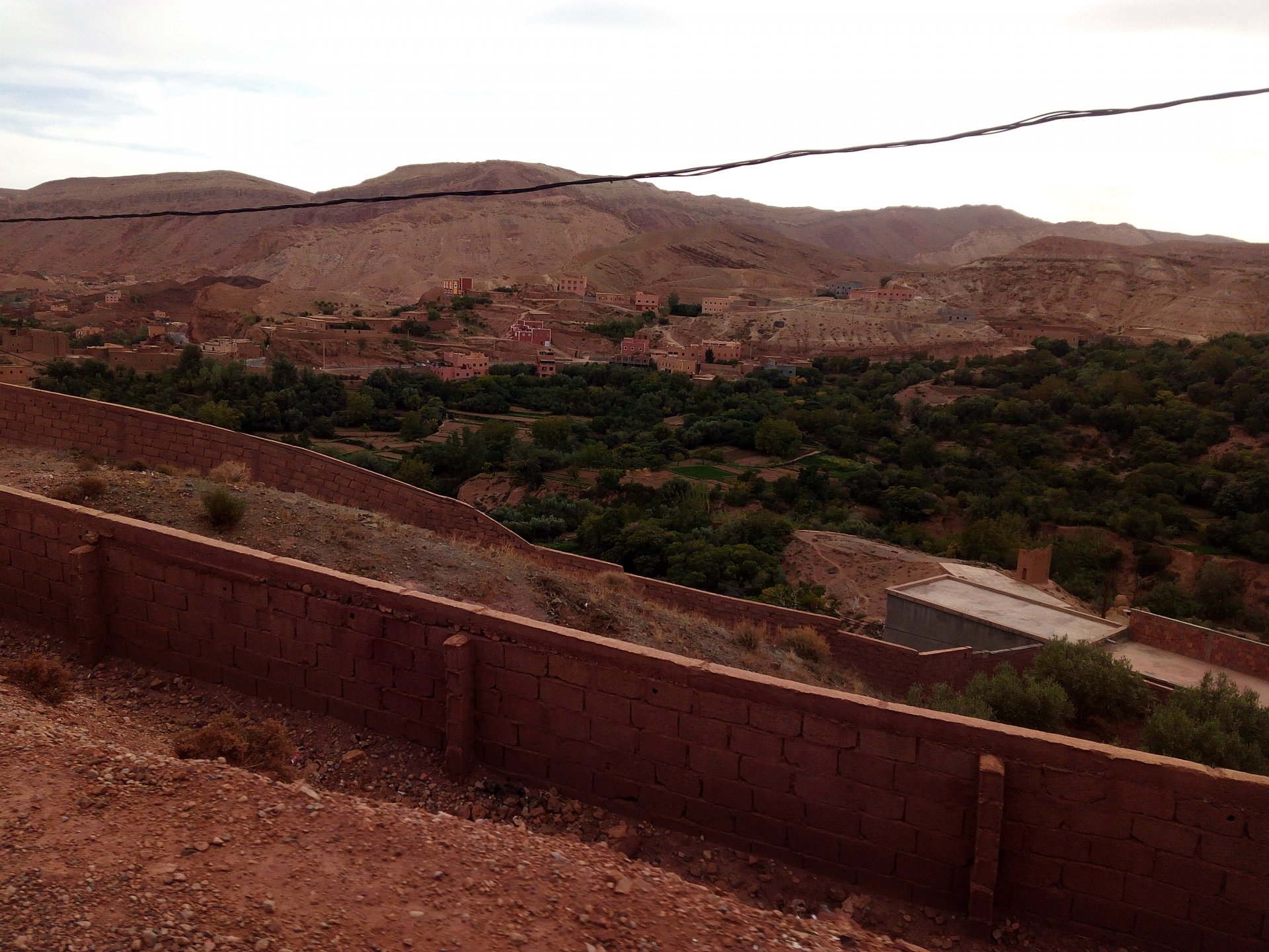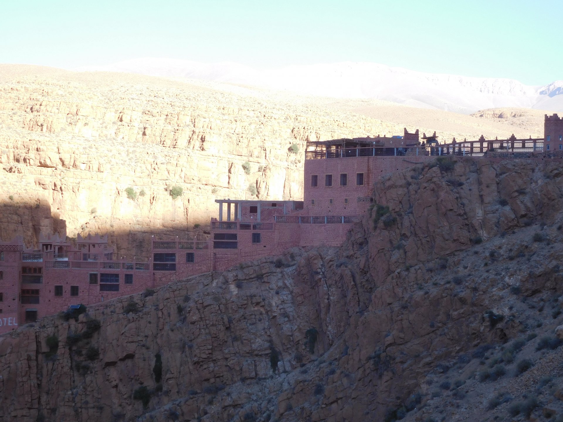 I might have ingested some of those pool water during the day, and felt a little nauseous as well from some lip balm Maria made me wear on account of my dry and cracked lips, the result of said events was that I slept like crap and felt like throwing up throughout the night. We were supposed to sleep in Zagora that day, but I really didn't feel able to get on the bike. Rui was an EMT and had come prepared with some magic stuff, a quick injection, some light breakfast, and an hour later I'm on the bike feeling great. To this day I don't know what it was he gave me. Off we go And just like that, 400km later we're having cold water in Mhamid, no sandstorm drama this time Back in Zagora, for some reason we have no foots of that hotel and evening, it was quite nice sitting outside under some thick trees. Only picture I have is of the concierge's assistant Before heading off to Ouarzazate, in the morning we visited the friendly mechanics and put a sticker on my new bike. Off we go back north, our destination was Marrakesh but first we would sleep somewhere as we were going through the Gorges du Dades and that means a lot of mountain roads, not fast going like here. Stopping to take in the views, we were approached by this guy whose name I was unfortunate enough to forget trying to sell dates (the fruit). We bought some but then he invited us for some tea. His dad did maintenance on cell or tv signal towers there, and he spent a lot of time up there selling dates to tourists. He was pationate about football, and new more about the portuguese league than I did We said our farewells, and got going. Judging by our current location, I wanted us to sleep at the rock hotel built on top of the Gorge du Dades, so we covered ground to get there still with daytime enough to enjoy the place. A brief stop in Oarzazate for something to eat and Rui dropped his bike taking it off the center stand, to receive a few laughs by people sitting in the restaurant. Had we not lightened his gin and vodka load it would have been even harder to pick up Roads were pretty great getting there, although not as dark as on these pictures. Up there would be our accommodations for the night These switchbacks are nothing special as a road, but the place itself is worthy of a good 10 minute stare. We explored the area a little bit, just trying to be good hosts to Rui as he hadn't been here before. And back to our rooms for the night Our meal didn't get on camera, however it was simple and delicious. As the evening was getting cold, a hot meal does wonders for you. There was not much in the way of entertainment, no internet, and 15 minutes after we made it to our rooms the generator was off and we were in complete darkness. The drone of a couple of trucks negotiating the hairpins made us feel sorry for those poor guys driving old-fashioned trucks with no assisted steering and little in the way of lights on that road, but after two or three trucks traffic stopped completely and we slept soundly. Bed was hard but comfy, with heavy whoolen covers. We woke up rejuvenated.