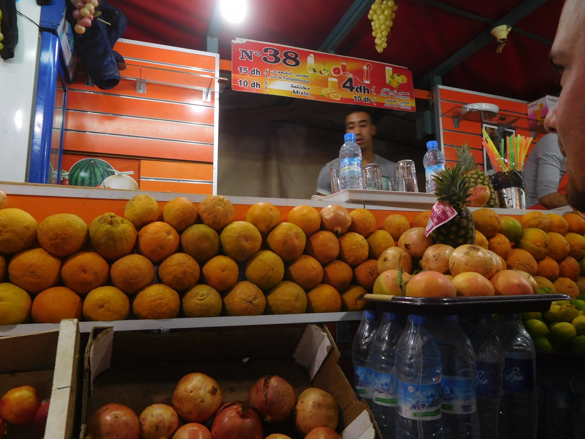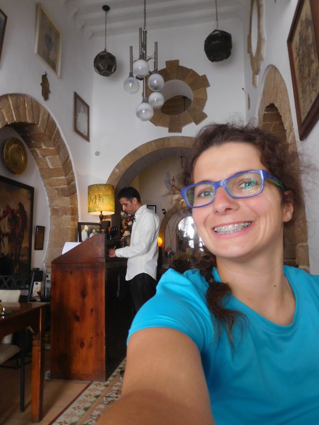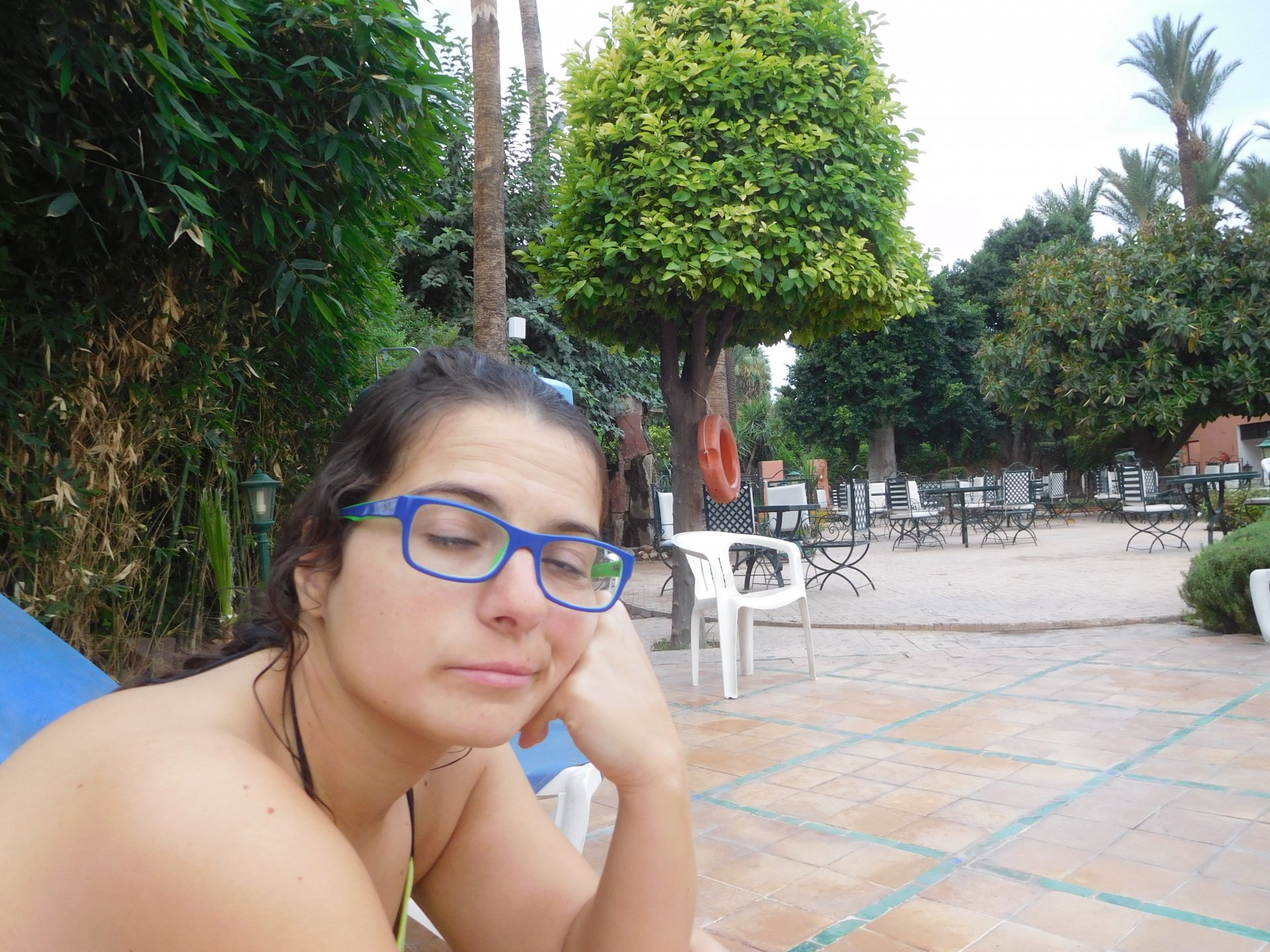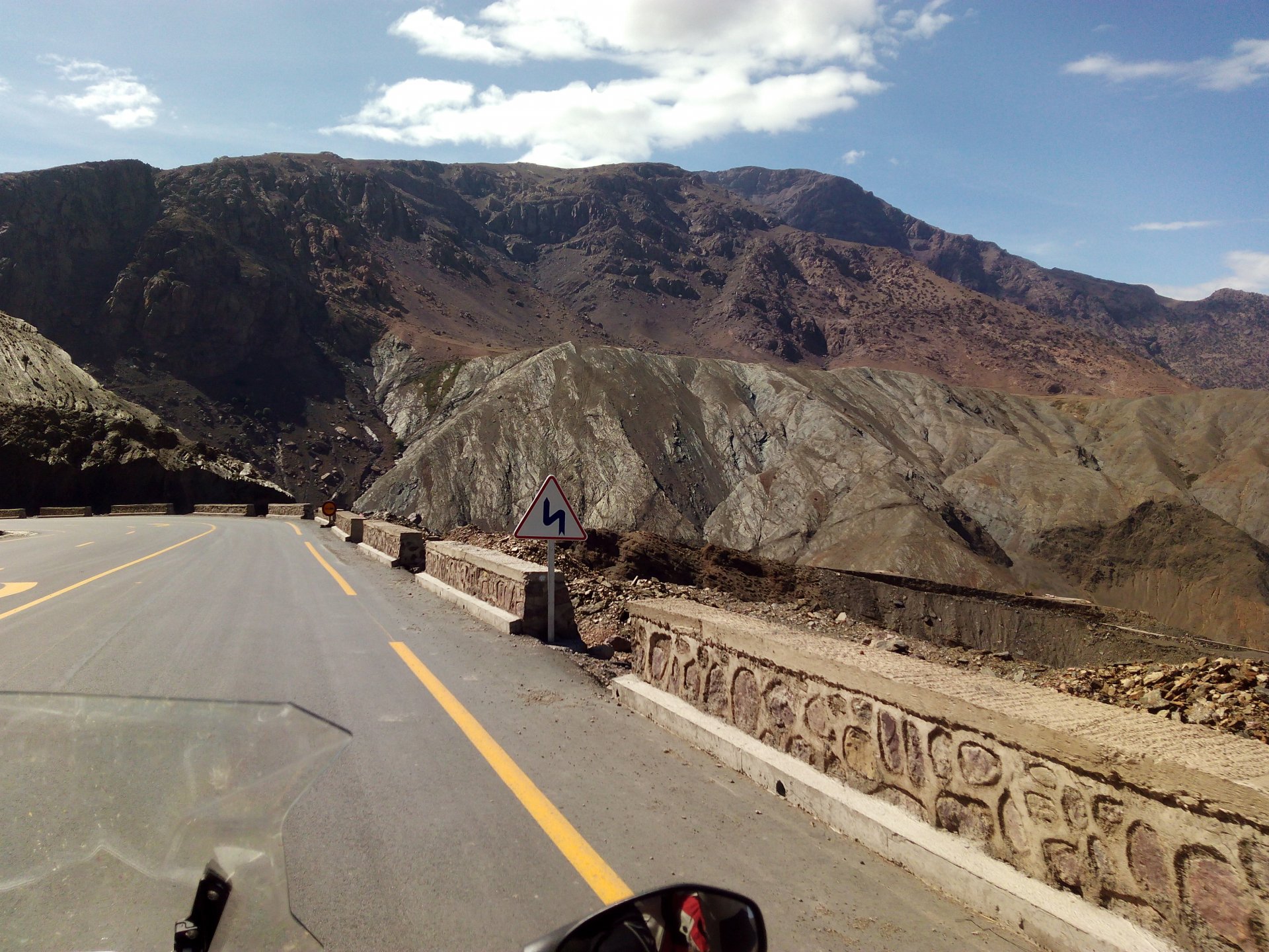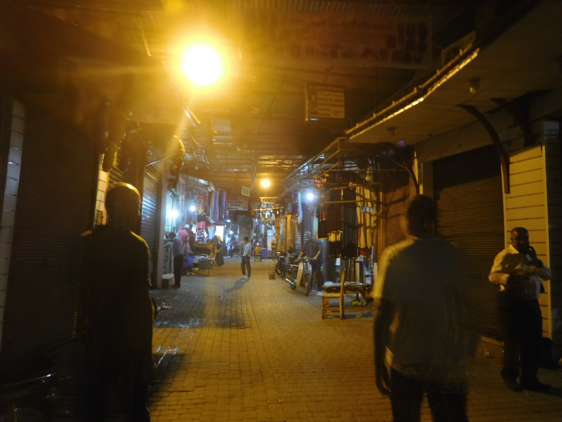 I might have ingested some of those pool water during the day, and felt a little nauseous as well from some lip balm Maria made me wear on account of my dry and cracked lips, the result of said events was that I slept like crap and felt like throwing up throughout the night. We were supposed to sleep in Zagora that day, but I really didn't feel able to get on the bike. Rui was an EMT and had come prepared with some magic stuff, a quick injection, some light breakfast, and an hour later I'm on the bike feeling great. To this day I don't know what it was he gave me. Off we go And just like that, 400km later we're having cold water in Mhamid, no sandstorm drama this time Back in Zagora, for some reason we have no foots of that hotel and evening, it was quite nice sitting outside under some thick trees. Only picture I have is of the concierge's assistant Before heading off to Ouarzazate, in the morning we visited the friendly mechanics and put a sticker on my new bike. Off we go back north, our destination was Marrakesh but first we would sleep somewhere as we were going through the Gorges du Dades and that means a lot of mountain roads, not fast going like here. Stopping to take in the views, we were approached by this guy whose name I was unfortunate enough to forget trying to sell dates (the fruit). We bought some but then he invited us for some tea. His dad did maintenance on cell or tv signal towers there, and he spent a lot of time up there selling dates to tourists. He was pationate about football, and new more about the portuguese league than I did We said our farewells, and got going. Judging by our current location, I wanted us to sleep at the rock hotel built on top of the Gorge du Dades, so we covered ground to get there still with daytime enough to enjoy the place. A brief stop in Oarzazate for something to eat and Rui dropped his bike taking it off the center stand, to receive a few laughs by people sitting in the restaurant. Had we not lightened his gin and vodka load it would have been even harder to pick up Roads were pretty great getting there, although not as dark as on these pictures. Up there would be our accommodations for the night These switchbacks are nothing special as a road, but the place itself is worthy of a good 10 minute stare. We explored the area a little bit, just trying to be good hosts to Rui as he hadn't been here before. And back to our rooms for the night Our meal didn't get on camera, however it was simple and delicious. As the evening was getting cold, a hot meal does wonders for you. There was not much in the way of entertainment, no internet, and 15 minutes after we made it to our rooms the generator was off and we were in complete darkness. The drone of a couple of trucks negotiating the hairpins made us feel sorry for those poor guys driving old-fashioned trucks with no assisted steering and little in the way of lights on that road, but after two or three trucks traffic stopped completely and we slept soundly. Bed was hard but comfy, with heavy whoolen covers. We woke up rejuvenated.
