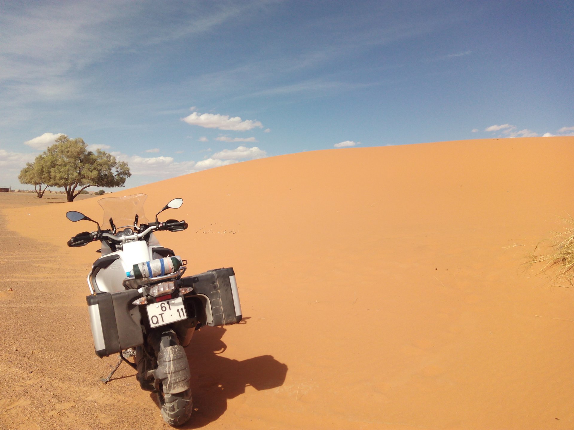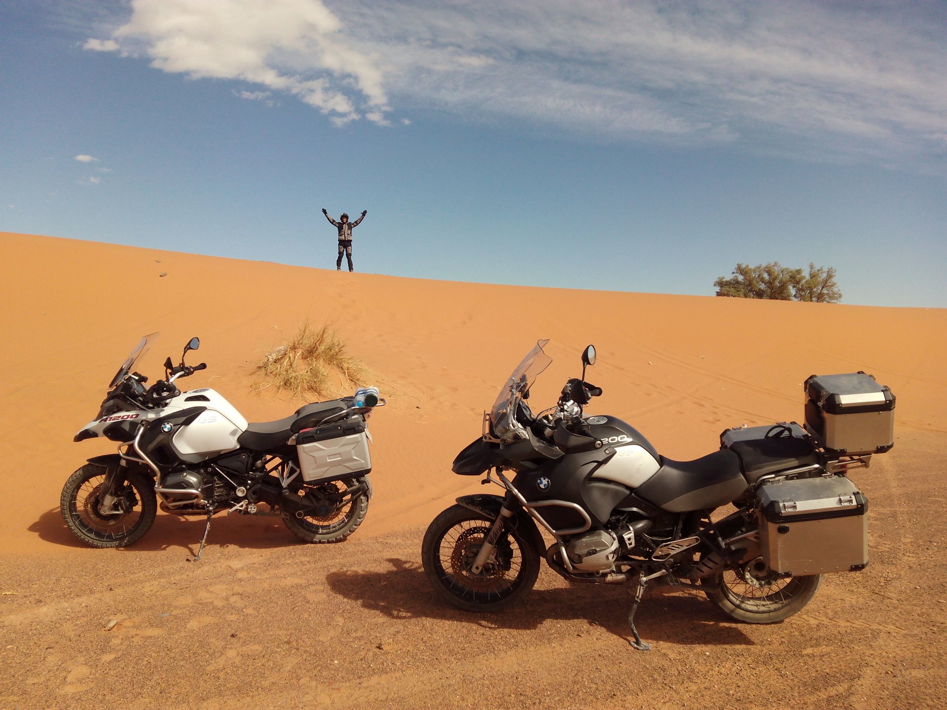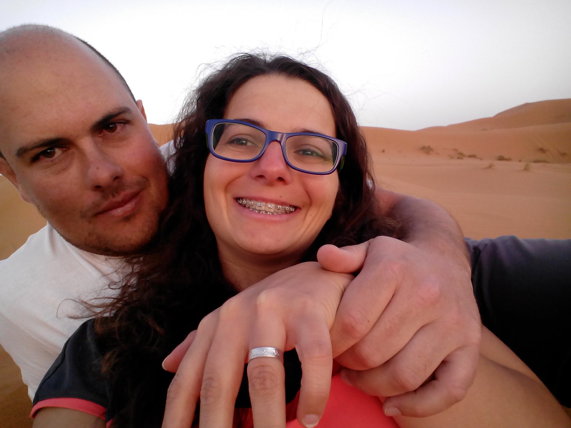 The group's goals for the day were to do a little motorcycling in the morning, a little lunch, some relaxation by the swimming pool, and watch the sunset on top of a dune. Good goals! Sunrise was pretty great Some light exploring to be done There's an offroad route from Merzouga to Mhamid, and I'd really like to make that route on my bike. Rui was adamant we couldn't do it, and to be honest I didn't really feel very happy about some of the soft sand sections that were bound to appear. Regardless, I went to scout for a few kms. In Portuguese, you see Rui jokingly complaining that they are suffering from the heat while I'm ok cause I've been riding for hours (I had been gone for 5 minutes) Eventually I'll try and do that route, the Vario cases might not be the smartest idea, though, and the GS is not the smartest tool for the soft parts either. As per plan, lunch was had, something about waking up early and riding bikes makes me hungry Then, onto the hotel via a souvenir shop for Rui to get something for his kids and wife. I took the chance and discreetly got something symbolic for Maria as well. I then proceeded to refresh myself and indulge in an afternoon of cold drinks and cold swimming pool. When we were up on the dunes waiting for the sunset, I did something I regret not doing sooner, which was to surprise Maria with a proposal, she said yes. This was most likely the happiest day of my life. Right before sunset the wind picked up and it seemed like a sand storm was forming, but eventually it didn't, just kicked enough dust into the air to make it not very nice to be on top of a dune. We retired to the hotel's shelter and had a delicious vegetable tajine for dinner. The greatest day!