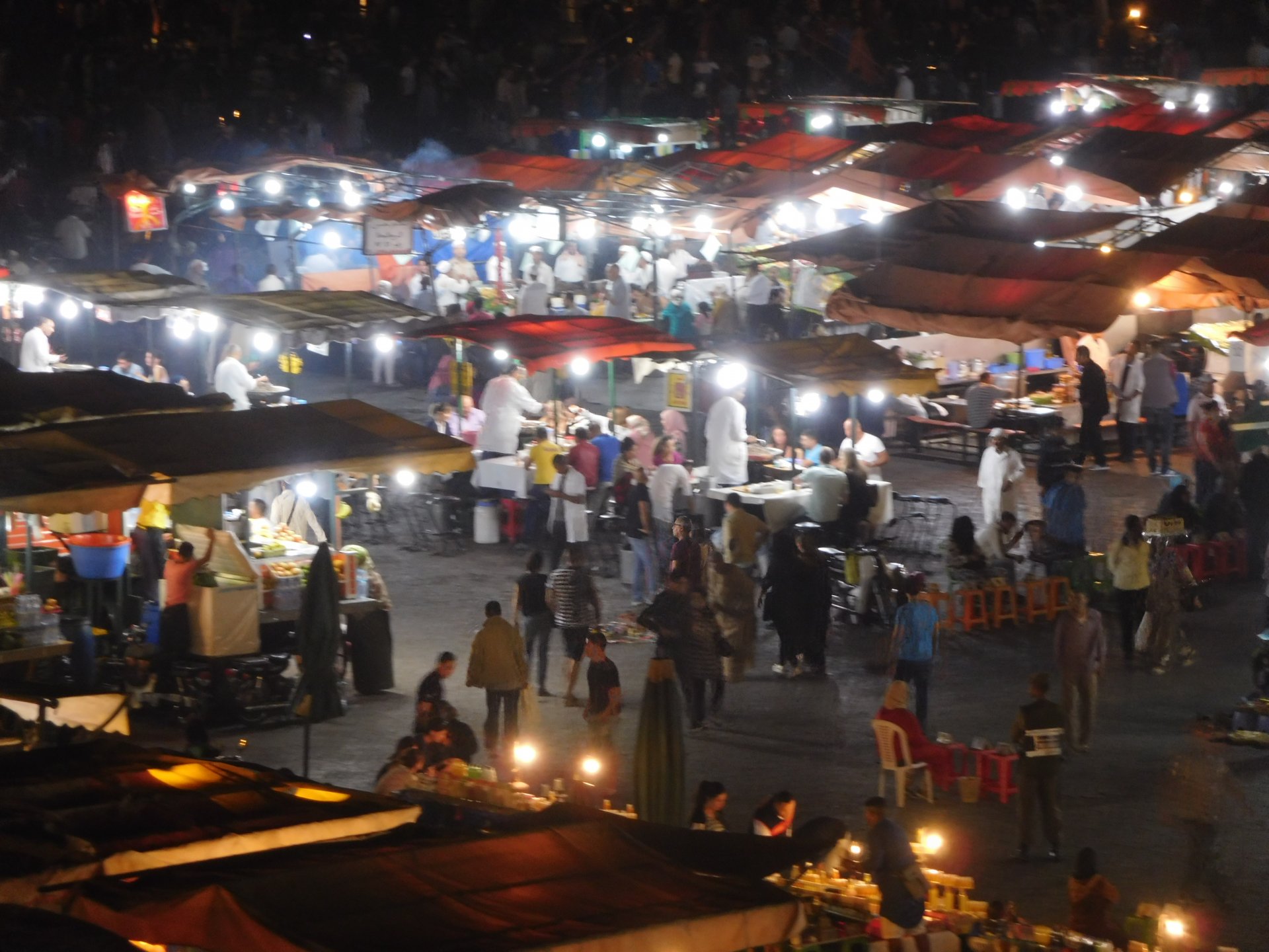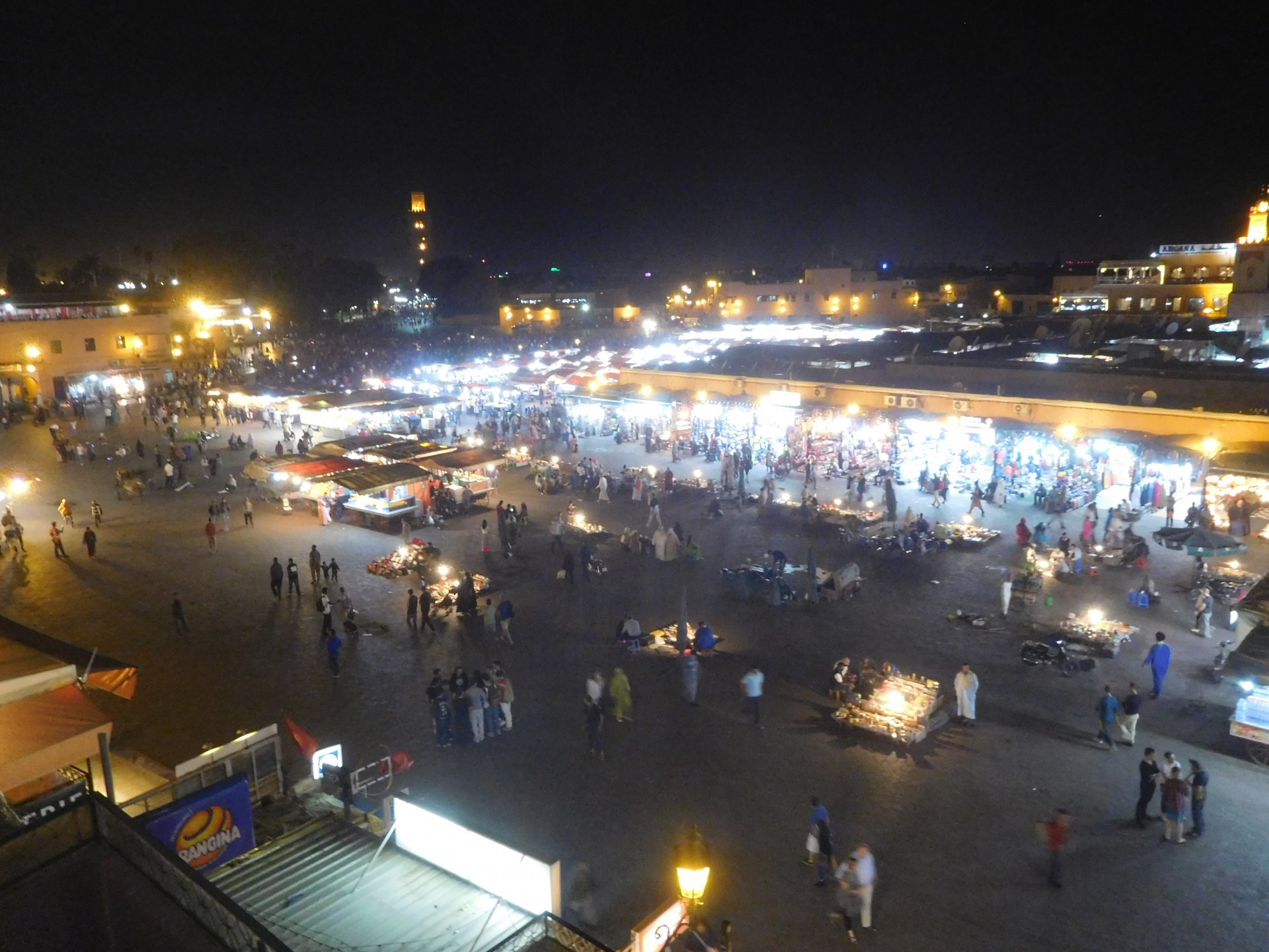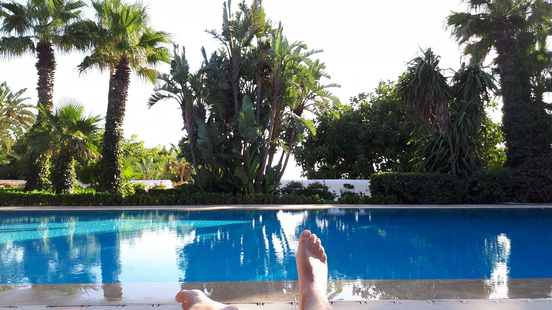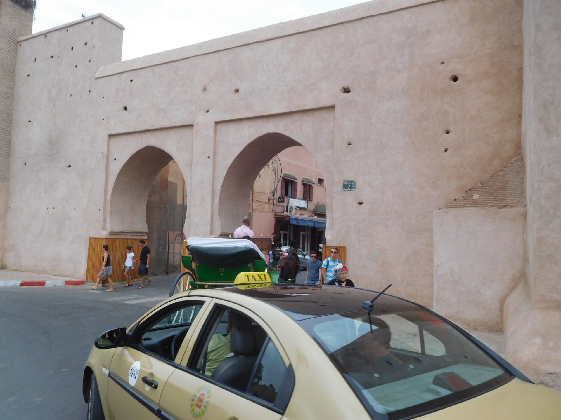 After a great night's sleep, we woke up rejuvenated and happy. After a nice breakfast with some proper dark coffee, I took the bike out to the street with a smile. We were off to Marrakesh via part of the High Atlas. It looked promising of great roads and views, we weren't disappointed, but first a stop by the local post office so that Rui could send his daughter's school class a postcard from a small forgotten village in Morocco written in berber. Took him long enough, weather actually changed from morning crispness to hot while he was inside , and we're finally going again! After a while we reach the mountains. Road porn? We were passed by two road bikes going way faster than I wanted to, Rui couldn't hold back any more and went in pursuit About an hour or so of pretty boring riding later, and we're entering the outskirts of Marrakesh A door into Marrakesh We rode around Marrakesh's wall, and visited the reservoir. This reservoir was built in the 12th century to water the Menara gardens and olive trees, it's impressive that it brings it's water from the high Atlas, way in the distance. We were all pretty hot and sweaty now, and negotiated past Marrakech's traffic to get to our hotel and freshen up. And refresh we did Reaction to whatever joke I just finished as always, Rui turned up just in time, just in time for us to go out After a nice shower and some clean clothes, we were eager to go out for dinner in a city where we had spent a few days the year previous, and show it off to our new friend. Rui was going to part ways with us on the next morning, he was supposed to be at work in three or four days, and still someone to visit before being home, so time was ticking for him. Me and Maria were to ride from Marrakech to the coast, and then follow the coast up to see Casablanca and then a stop at our favourite luxury hotel in Tangier before heading home. On our way to Jemaa el-Fna square (look it up) we came accross @Tym's paradise You want to taste something truly great? try one of these orange juices: They're squeezed from cold oranges and a full glass costs pennies, the orange flavor in these is nothing like you can taste in the UK. Jemaa el-Fna is busy, lots of people, lots of food stall, lots of coal grilling, lots of smells and then there's Marrakech's Medina, which branches out from the square. Good thing they don't serve alcohol there because it's easy enough to get lost sober. We found a 1st floor balcony to have some dinner while looking at the bustling square below: Walking back to the hotel after dinner and a few drinks (of coca cola ) we were happy but also sad to be ending ou trip together. In the morning Rui would be getting on the motorway and go at Mach5 on his way to Portugal, at least that was his plan but you know how things went with him We made plans to see each other often.