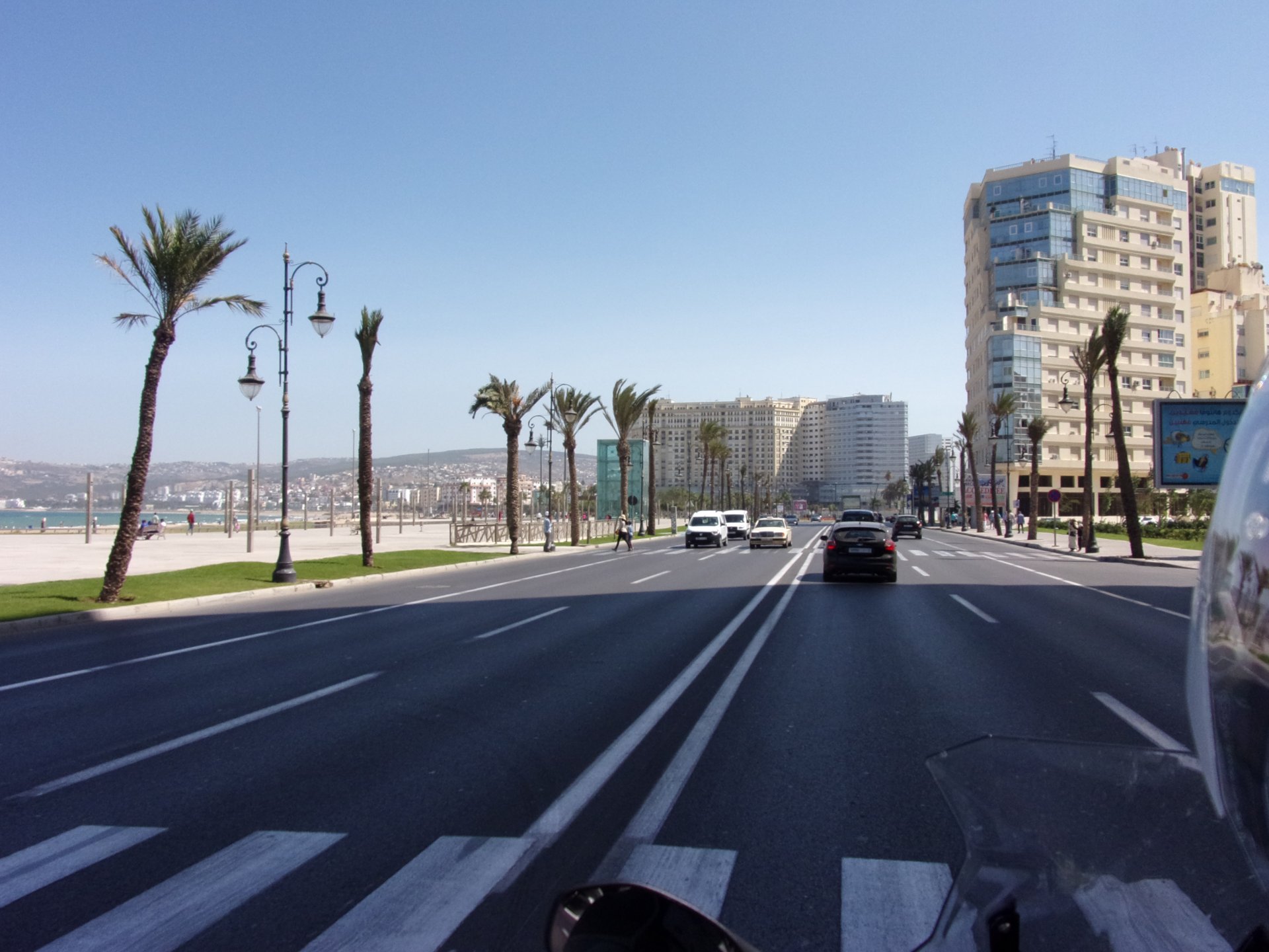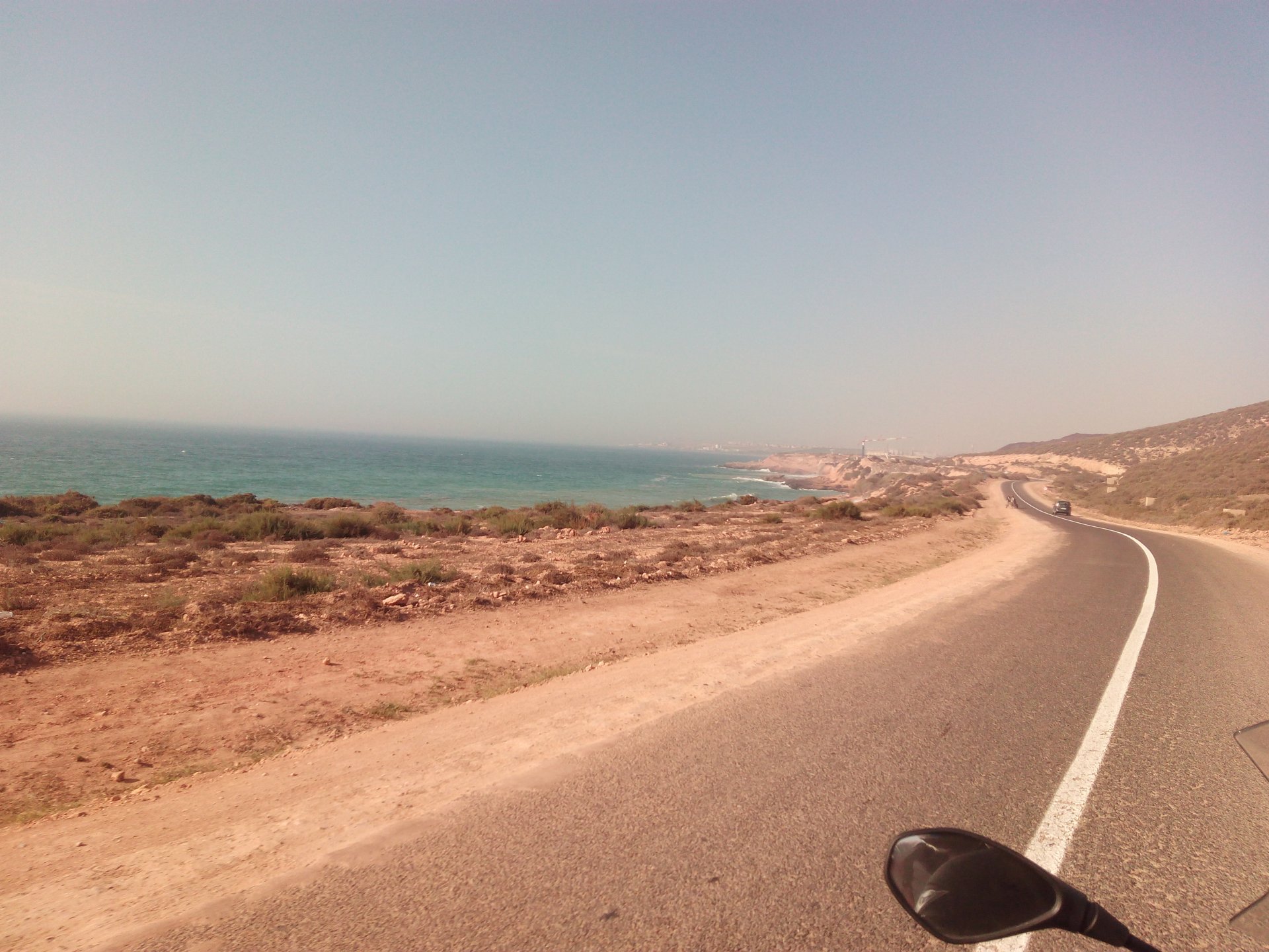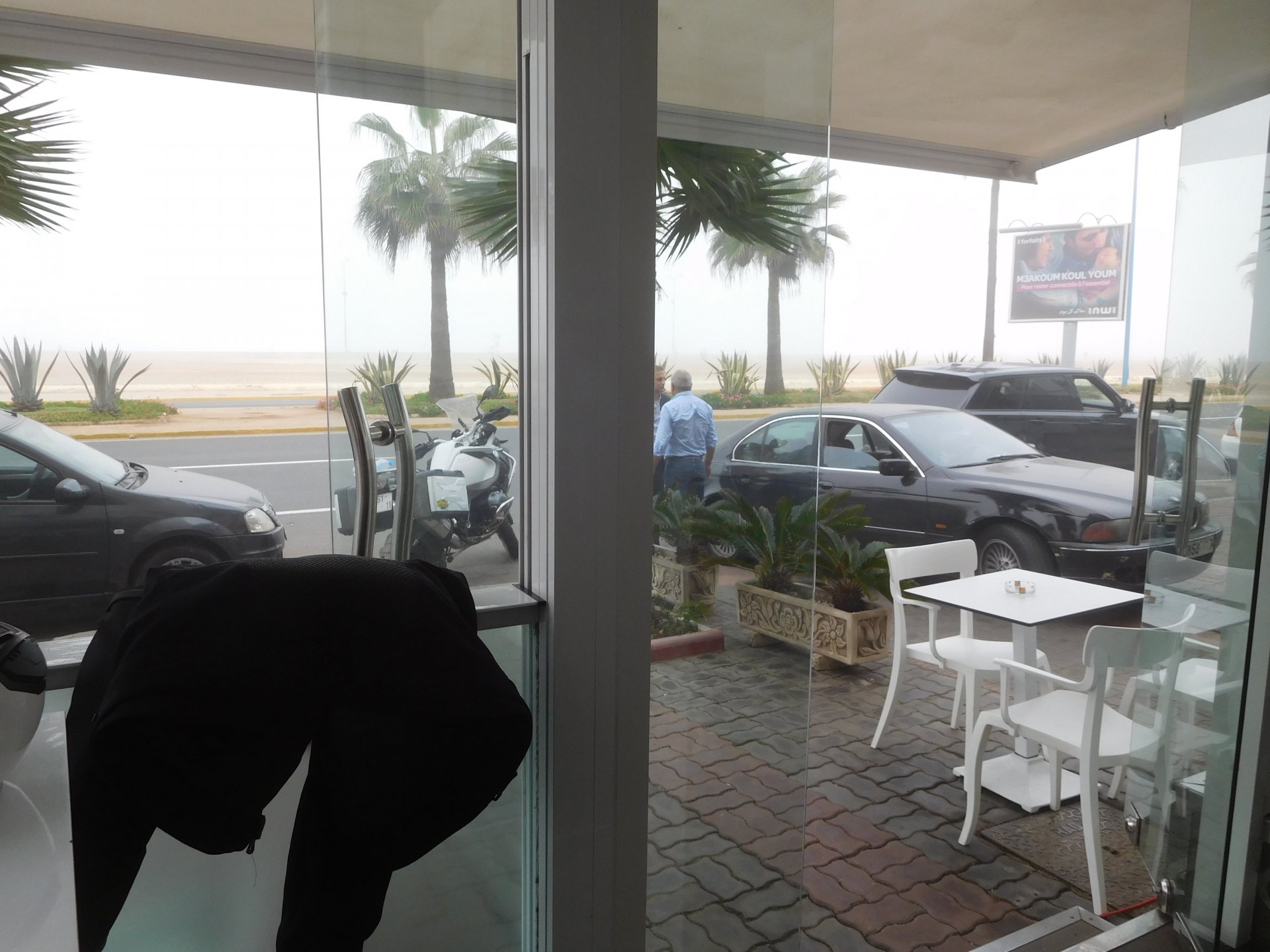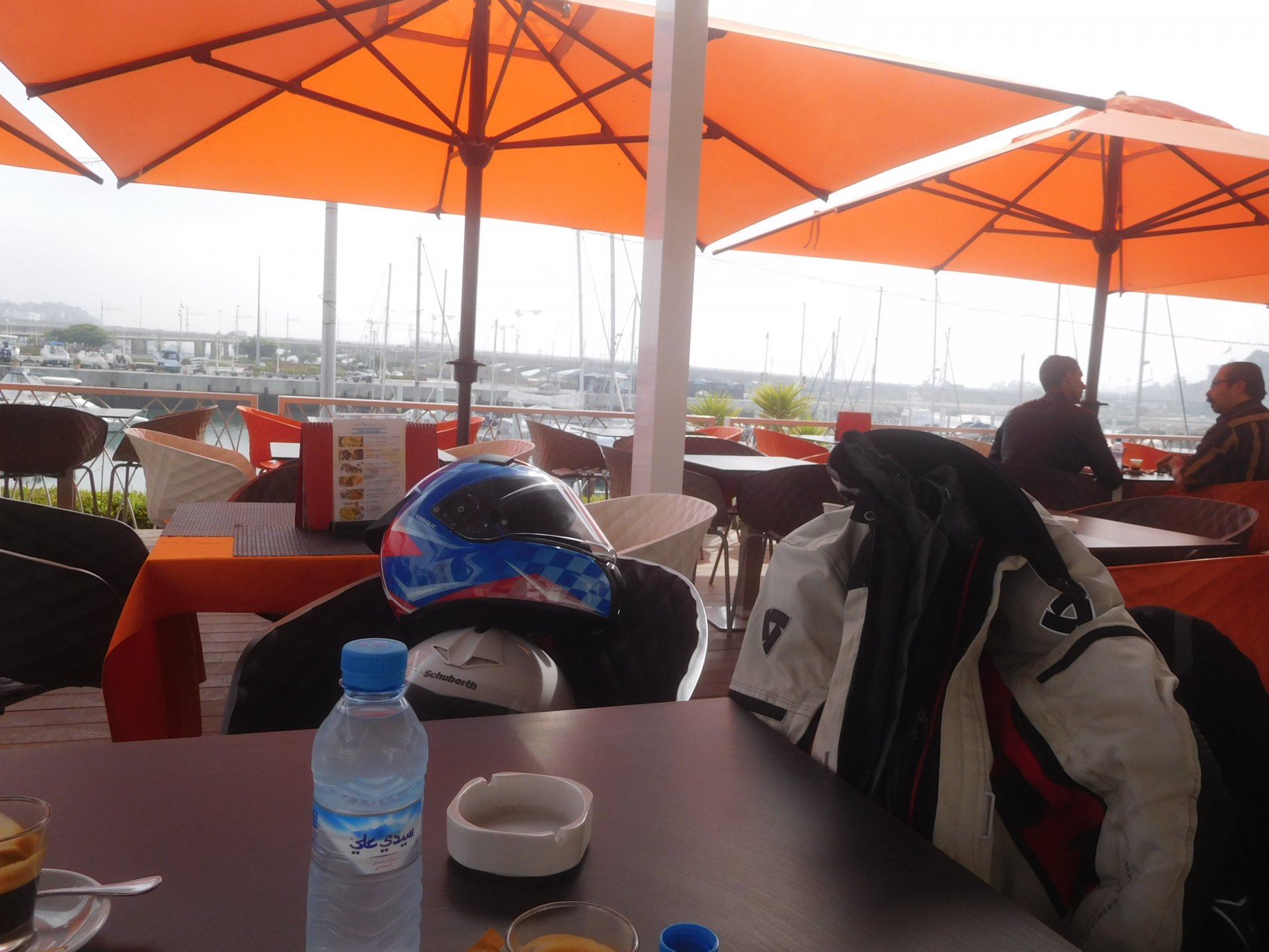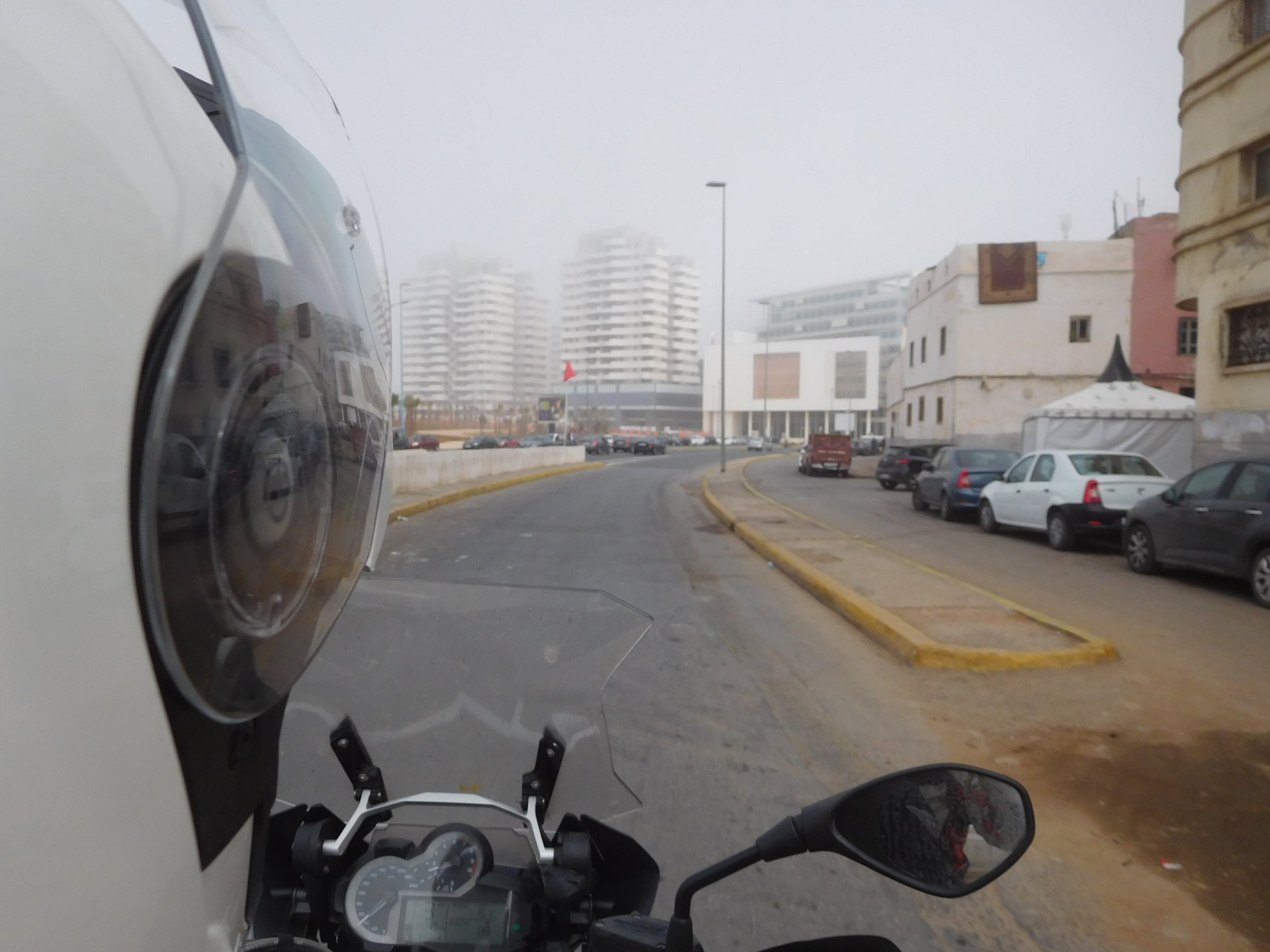 After a pretty sad meal the day before, only made better by the staff's enthusiasm over having Portuguese guests, we slept quite well listening to the sounds of the ocean. We left our hotel at our usual, not too early not too late, time, and made our way up the coast to Casablanca. Safi, a nice town with a huge refinery, not my kind of tea but people have to earn a living somehow. Never stop: we share a stoplight with this cool dude and his BMW (sound system properly on!) We get to Casablanca for an early afternoon snack instead of lunch, with Portuguese espresso We tried to visit Casablanca's mosque, apparently one of the world's most impressive religious buildings, it was closed for visitations and too foggy to even see the top It's so tall that it's got a laser that manages to be pointed and "making contact" with the minaret in Meca, and the inside is known to be amazing. I'm not one to visit buildings, so I wasn't too bothered by the fact it was closed, but the outside is impressive and beautiful. Instead we focused on finding a good deal on a hotel in the center. Casablanca is the city I've ever been in with the highest concentration of brand new Range Rovers per 100 cars, including London, but I sort of hagled a room price down. We had a nice bed and a guarded parking, that's all I need. We went out after dar for a walk and a meal, and saw a Morocco that was nothing like what we new, with neons and franchise food places, and cabarets We sat outside at a nice restaurant and had pizza and pasta, I don't remember who had what but I remember it was pretty nice. I get excited when I see a cocktail menu so ask for the wine menu, and the waiter tells me all cocktails are non alcoholic, and just that easily he breaks my heart ... Next morning we bug off early in the morning, just in time to catch rush our. It was raining drizzling, so instead of riding on and get wet I stop to look at cars for 20 minutes, it was pretty obvious why we had stopped so we got a good smile from the salespeople And off we go to Tangier But since I'm a sucker for a marina, we stop for a coffee instead ... took us AGES to leave Casablanca Somewhere, we stop for lunch in the sort of place we usually stop for lunch at. A cafe or cafe/restaurant at the side of the road, we figure that since this would be our last lunch in Morocco we might as well go native: Maria goes for the omelette with minced meat, a bold choice! She proceeds to eat it like a local, with her fingers and bread to help along, which I loved watching I have the skewers with a side of hot sauce to dip them in while eating. Onwards, because a 5 star hotel awaits us, we shall splurge! The roads aren't special at all in this area, the traffic sometimes reminds you you're still in Morocco though, but in a good way. I was feeling nostalgic during this last couple of hours of riding before Tangier. Maria asked if everything was ok with the bike, but no, it was just me trying to make it last a little longer. I love the way this people drive and treat the road and other users with respect. They don't really care for rules but at the same time will move over for a faster vehicle, will expect you to move over if they need to avoid a big pothole, if the road can fit three cars then there is no problem in fitting three cars even though there might be some random theoretical line in between, I get along with road traffic in Morocco a lot better than in Europe. This attitude to driving with survival and cooperation makes it simple. I don't get along with big city traffic, though, that is just random As we arrived to the most posh part of Tangier the sole focus is to enjoy the afternoon and evening, before going back home. Early morning and go to Tangier for breakfast, and quickly catch the ferry. This time we rode straight home, stopping right at the border between Spain and Portugal to put our rain suits on. Riding those last few hours in the rain, with the last 2 or 3 hours being already dark, and arriving home to a cold October night was a shock compared to the previous two weeks. We had little to eat at home, so did the smart thing, had a hot shower, and went out to eat while leaving the heating on to come back to a cozy house. We had grilled meat and drank wine in the only place still open in Azambuja!
