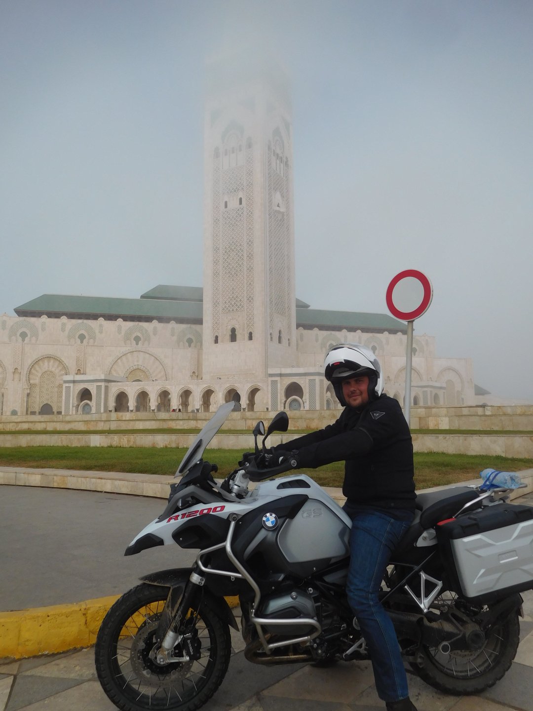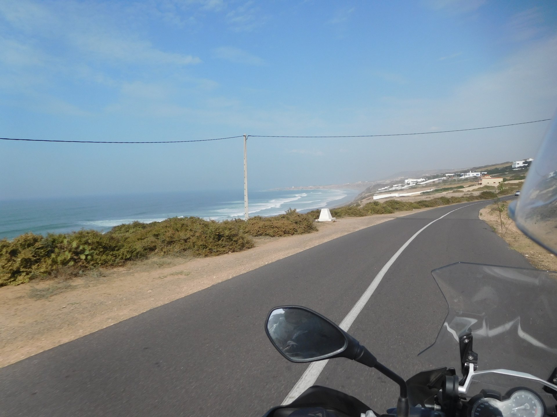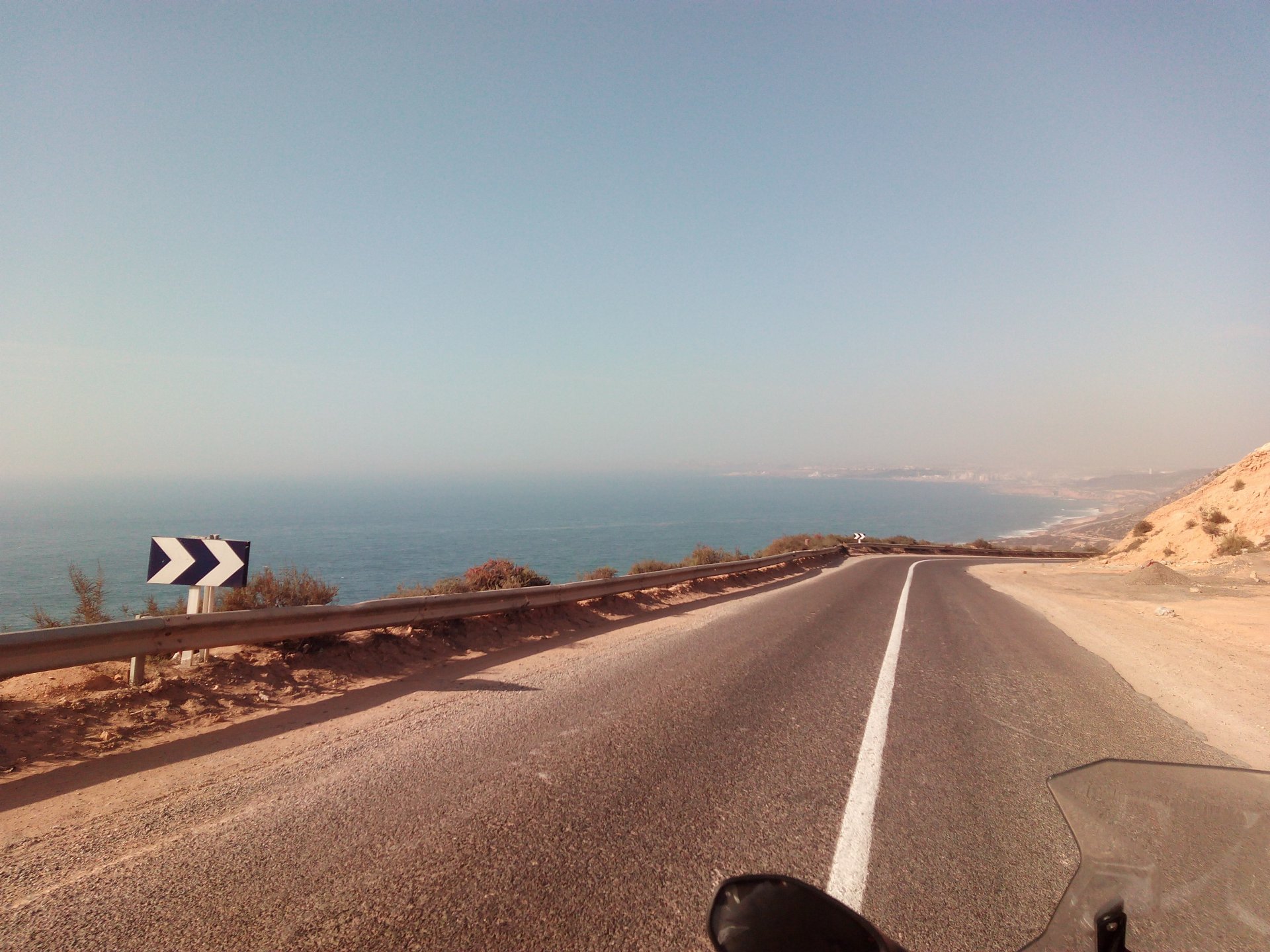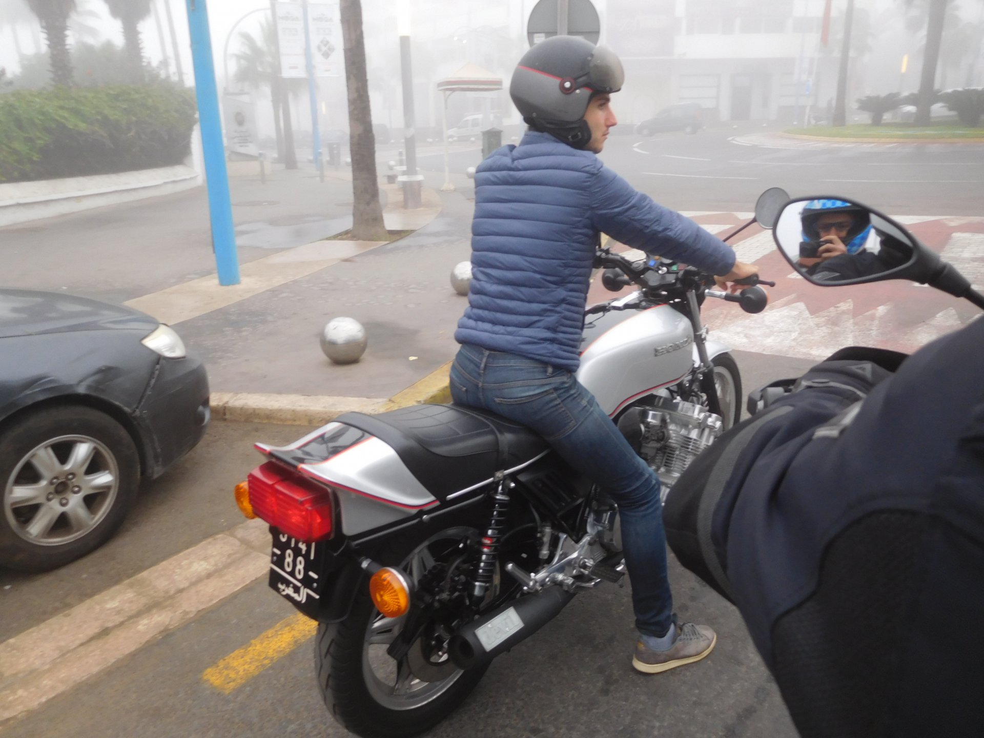 After a pretty sad meal the day before, only made better by the staff's enthusiasm over having Portuguese guests, we slept quite well listening to the sounds of the ocean. We left our hotel at our usual, not too early not too late, time, and made our way up the coast to Casablanca. Safi, a nice town with a huge refinery, not my kind of tea but people have to earn a living somehow. Never stop: we share a stoplight with this cool dude and his BMW (sound system properly on!) We get to Casablanca for an early afternoon snack instead of lunch, with Portuguese espresso We tried to visit Casablanca's mosque, apparently one of the world's most impressive religious buildings, it was closed for visitations and too foggy to even see the top It's so tall that it's got a laser that manages to be pointed and "making contact" with the minaret in Meca, and the inside is known to be amazing. I'm not one to visit buildings, so I wasn't too bothered by the fact it was closed, but the outside is impressive and beautiful. Instead we focused on finding a good deal on a hotel in the center. Casablanca is the city I've ever been in with the highest concentration of brand new Range Rovers per 100 cars, including London, but I sort of hagled a room price down. We had a nice bed and a guarded parking, that's all I need. We went out after dar for a walk and a meal, and saw a Morocco that was nothing like what we new, with neons and franchise food places, and cabarets We sat outside at a nice restaurant and had pizza and pasta, I don't remember who had what but I remember it was pretty nice. I get excited when I see a cocktail menu so ask for the wine menu, and the waiter tells me all cocktails are non alcoholic, and just that easily he breaks my heart ... Next morning we bug off early in the morning, just in time to catch rush our. It was raining drizzling, so instead of riding on and get wet I stop to look at cars for 20 minutes, it was pretty obvious why we had stopped so we got a good smile from the salespeople And off we go to Tangier But since I'm a sucker for a marina, we stop for a coffee instead ... took us AGES to leave Casablanca Somewhere, we stop for lunch in the sort of place we usually stop for lunch at. A cafe or cafe/restaurant at the side of the road, we figure that since this would be our last lunch in Morocco we might as well go native: Maria goes for the omelette with minced meat, a bold choice! She proceeds to eat it like a local, with her fingers and bread to help along, which I loved watching I have the skewers with a side of hot sauce to dip them in while eating. Onwards, because a 5 star hotel awaits us, we shall splurge! The roads aren't special at all in this area, the traffic sometimes reminds you you're still in Morocco though, but in a good way. I was feeling nostalgic during this last couple of hours of riding before Tangier. Maria asked if everything was ok with the bike, but no, it was just me trying to make it last a little longer. I love the way this people drive and treat the road and other users with respect. They don't really care for rules but at the same time will move over for a faster vehicle, will expect you to move over if they need to avoid a big pothole, if the road can fit three cars then there is no problem in fitting three cars even though there might be some random theoretical line in between, I get along with road traffic in Morocco a lot better than in Europe. This attitude to driving with survival and cooperation makes it simple. I don't get along with big city traffic, though, that is just random As we arrived to the most posh part of Tangier the sole focus is to enjoy the afternoon and evening, before going back home. Early morning and go to Tangier for breakfast, and quickly catch the ferry. This time we rode straight home, stopping right at the border between Spain and Portugal to put our rain suits on. Riding those last few hours in the rain, with the last 2 or 3 hours being already dark, and arriving home to a cold October night was a shock compared to the previous two weeks. We had little to eat at home, so did the smart thing, had a hot shower, and went out to eat while leaving the heating on to come back to a cozy house. We had grilled meat and drank wine in the only place still open in Azambuja!