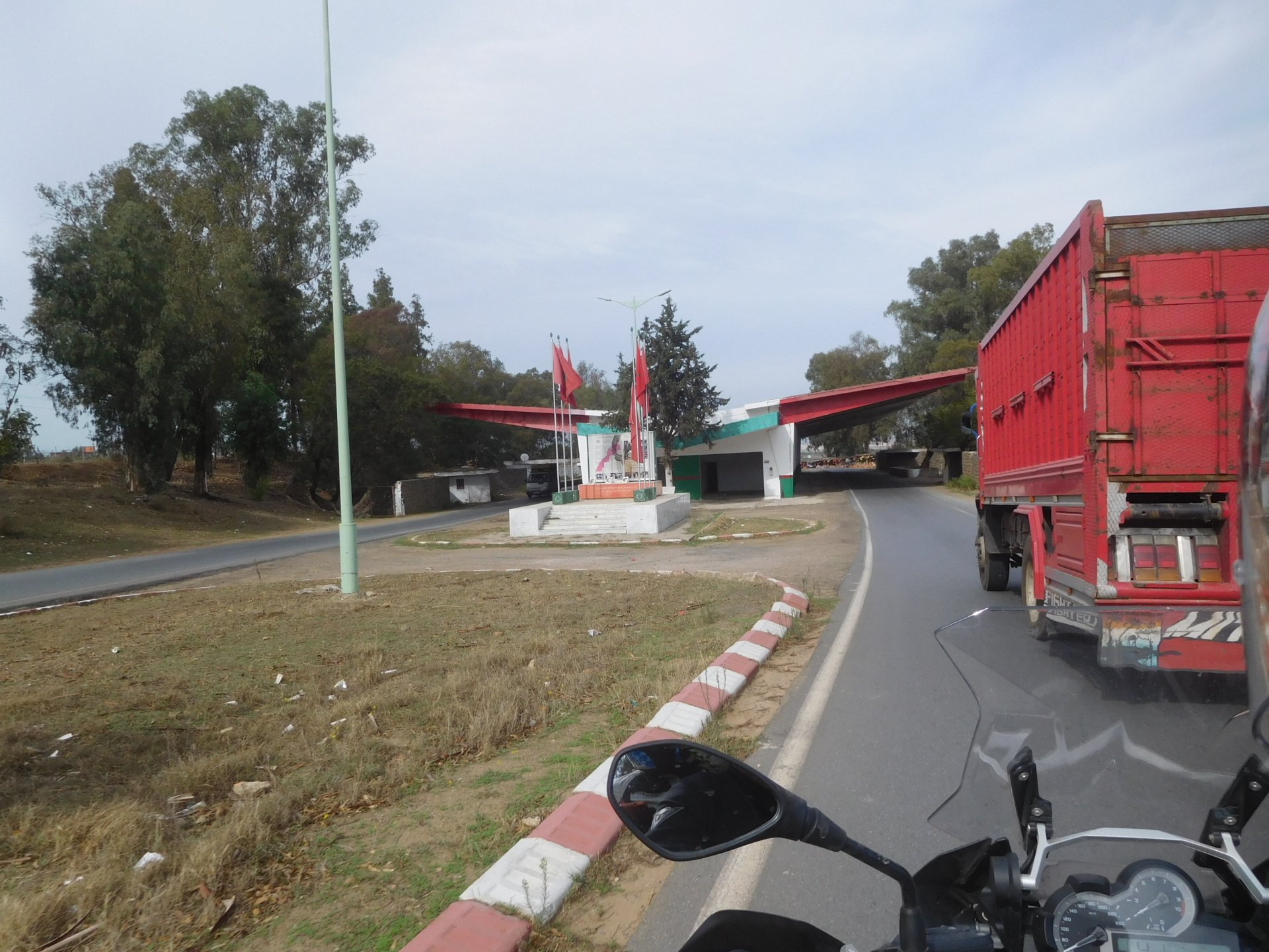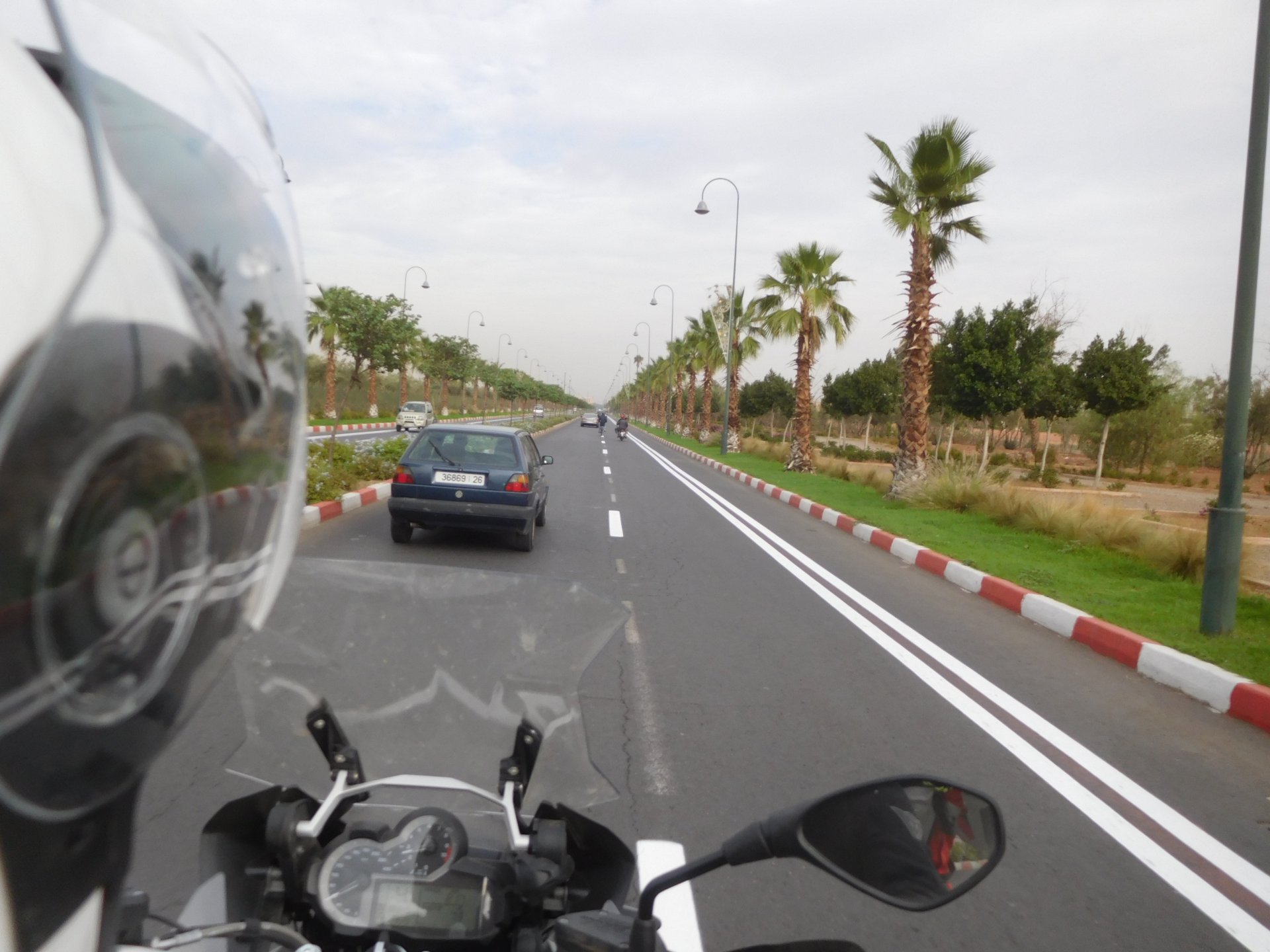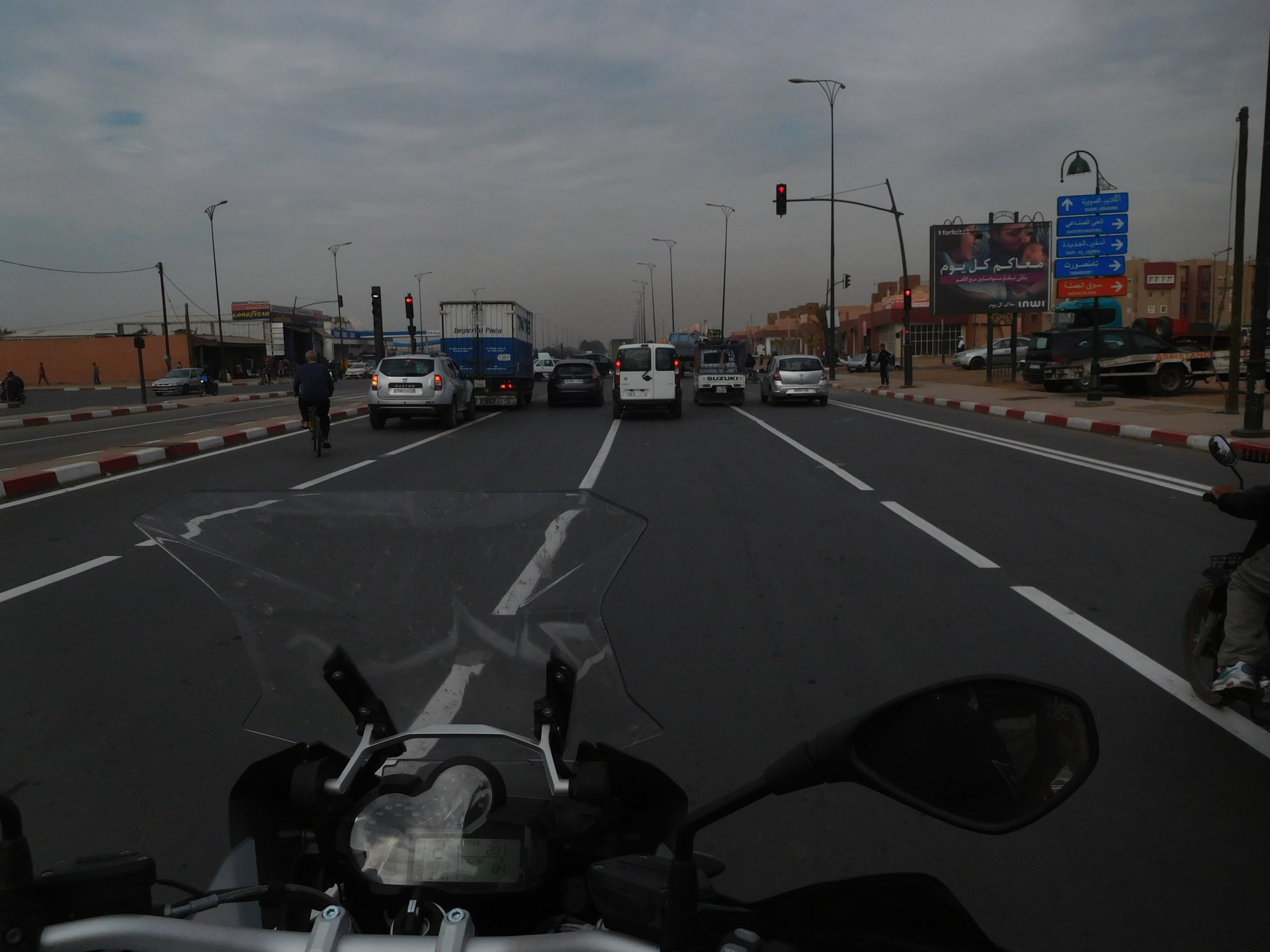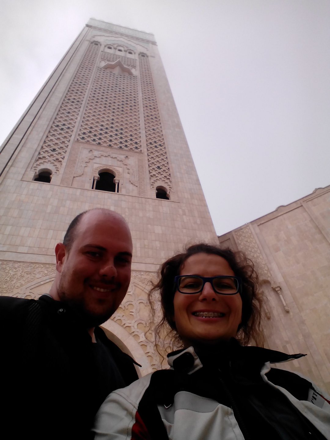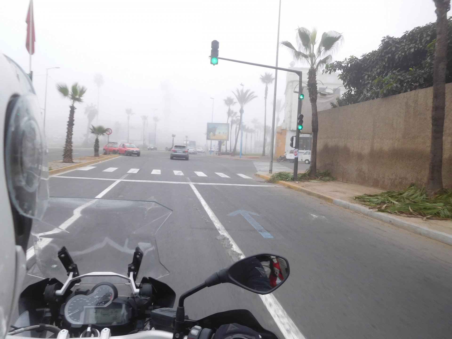 After a pretty sad meal the day before, only made better by the staff's enthusiasm over having Portuguese guests, we slept quite well listening to the sounds of the ocean. We left our hotel at our usual, not too early not too late, time, and made our way up the coast to Casablanca. Safi, a nice town with a huge refinery, not my kind of tea but people have to earn a living somehow. Never stop: we share a stoplight with this cool dude and his BMW (sound system properly on!) We get to Casablanca for an early afternoon snack instead of lunch, with Portuguese espresso We tried to visit Casablanca's mosque, apparently one of the world's most impressive religious buildings, it was closed for visitations and too foggy to even see the top It's so tall that it's got a laser that manages to be pointed and "making contact" with the minaret in Meca, and the inside is known to be amazing. I'm not one to visit buildings, so I wasn't too bothered by the fact it was closed, but the outside is impressive and beautiful. Instead we focused on finding a good deal on a hotel in the center. Casablanca is the city I've ever been in with the highest concentration of brand new Range Rovers per 100 cars, including London, but I sort of hagled a room price down. We had a nice bed and a guarded parking, that's all I need. We went out after dar for a walk and a meal, and saw a Morocco that was nothing like what we new, with neons and franchise food places, and cabarets We sat outside at a nice restaurant and had pizza and pasta, I don't remember who had what but I remember it was pretty nice. I get excited when I see a cocktail menu so ask for the wine menu, and the waiter tells me all cocktails are non alcoholic, and just that easily he breaks my heart ... Next morning we bug off early in the morning, just in time to catch rush our. It was raining drizzling, so instead of riding on and get wet I stop to look at cars for 20 minutes, it was pretty obvious why we had stopped so we got a good smile from the salespeople And off we go to Tangier But since I'm a sucker for a marina, we stop for a coffee instead ... took us AGES to leave Casablanca Somewhere, we stop for lunch in the sort of place we usually stop for lunch at. A cafe or cafe/restaurant at the side of the road, we figure that since this would be our last lunch in Morocco we might as well go native: Maria goes for the omelette with minced meat, a bold choice! She proceeds to eat it like a local, with her fingers and bread to help along, which I loved watching I have the skewers with a side of hot sauce to dip them in while eating. Onwards, because a 5 star hotel awaits us, we shall splurge! The roads aren't special at all in this area, the traffic sometimes reminds you you're still in Morocco though, but in a good way. I was feeling nostalgic during this last couple of hours of riding before Tangier. Maria asked if everything was ok with the bike, but no, it was just me trying to make it last a little longer. I love the way this people drive and treat the road and other users with respect. They don't really care for rules but at the same time will move over for a faster vehicle, will expect you to move over if they need to avoid a big pothole, if the road can fit three cars then there is no problem in fitting three cars even though there might be some random theoretical line in between, I get along with road traffic in Morocco a lot better than in Europe. This attitude to driving with survival and cooperation makes it simple. I don't get along with big city traffic, though, that is just random As we arrived to the most posh part of Tangier the sole focus is to enjoy the afternoon and evening, before going back home. Early morning and go to Tangier for breakfast, and quickly catch the ferry. This time we rode straight home, stopping right at the border between Spain and Portugal to put our rain suits on. Riding those last few hours in the rain, with the last 2 or 3 hours being already dark, and arriving home to a cold October night was a shock compared to the previous two weeks. We had little to eat at home, so did the smart thing, had a hot shower, and went out to eat while leaving the heating on to come back to a cozy house. We had grilled meat and drank wine in the only place still open in Azambuja!