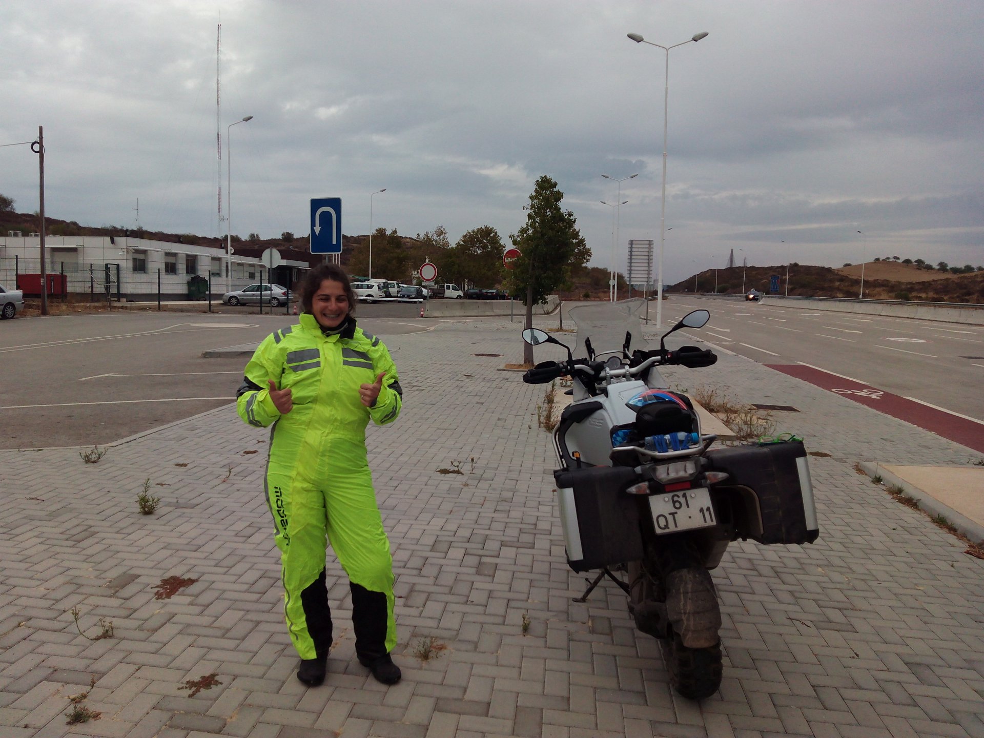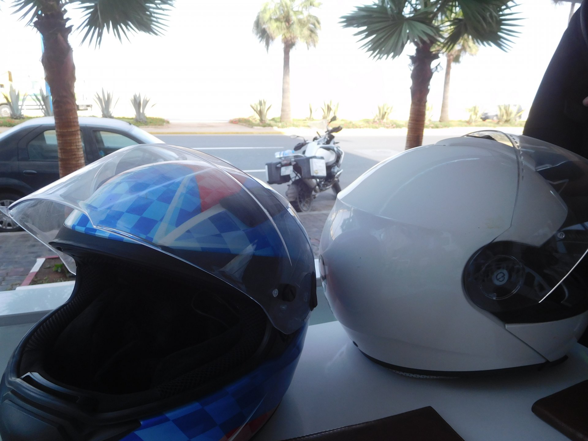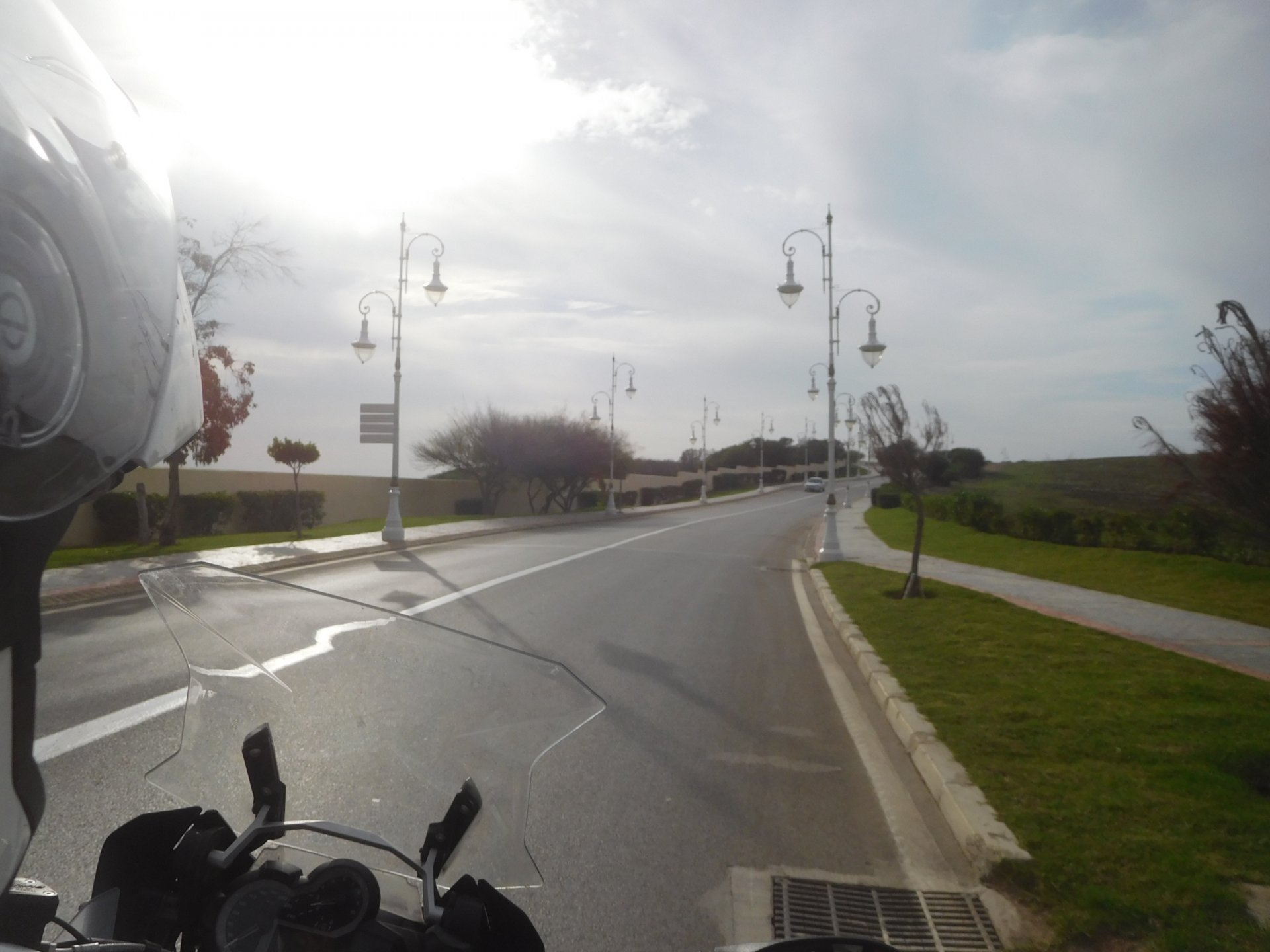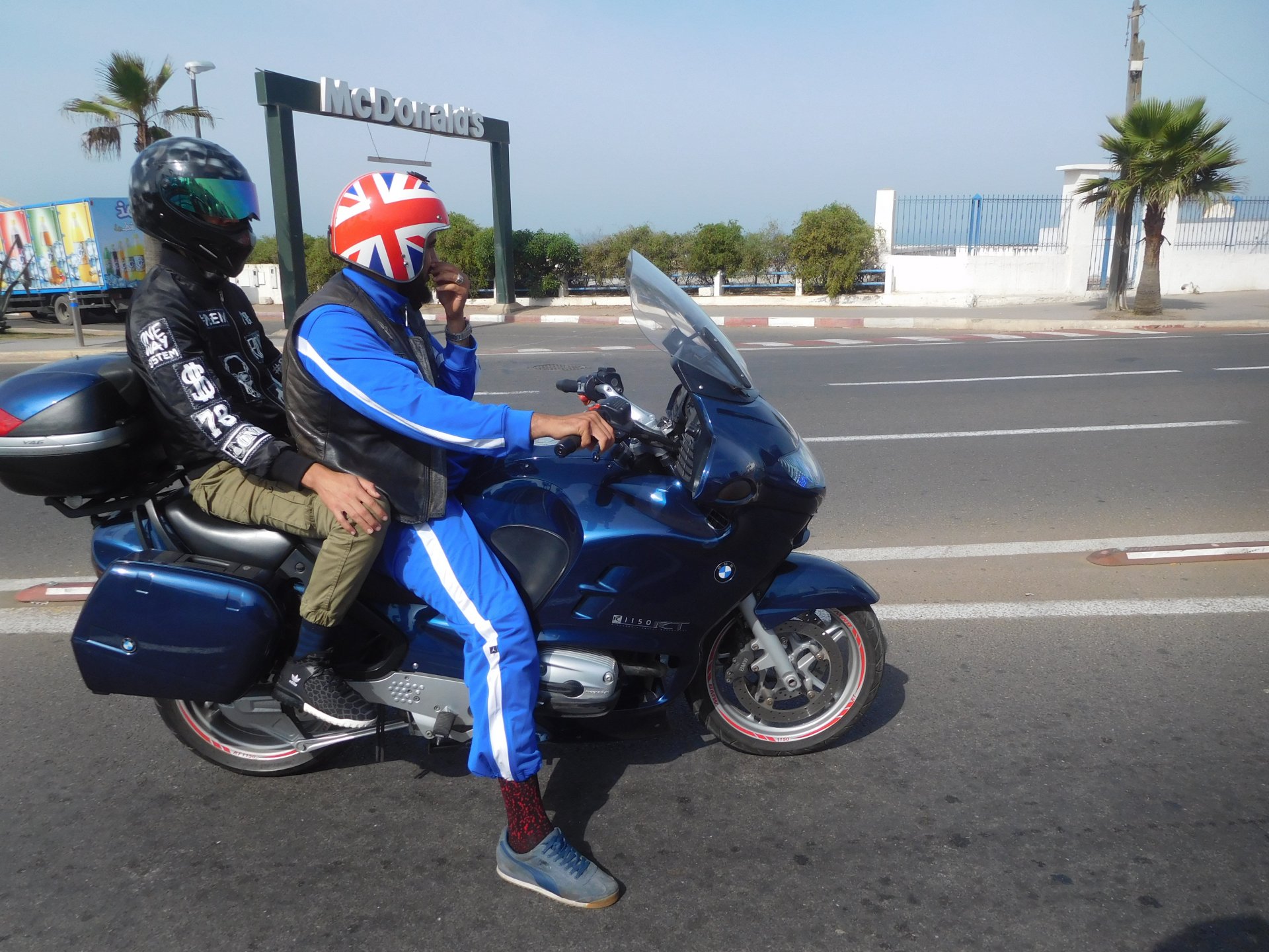 After a pretty sad meal the day before, only made better by the staff's enthusiasm over having Portuguese guests, we slept quite well listening to the sounds of the ocean. We left our hotel at our usual, not too early not too late, time, and made our way up the coast to Casablanca. Safi, a nice town with a huge refinery, not my kind of tea but people have to earn a living somehow. Never stop: we share a stoplight with this cool dude and his BMW (sound system properly on!) We get to Casablanca for an early afternoon snack instead of lunch, with Portuguese espresso We tried to visit Casablanca's mosque, apparently one of the world's most impressive religious buildings, it was closed for visitations and too foggy to even see the top It's so tall that it's got a laser that manages to be pointed and "making contact" with the minaret in Meca, and the inside is known to be amazing. I'm not one to visit buildings, so I wasn't too bothered by the fact it was closed, but the outside is impressive and beautiful. Instead we focused on finding a good deal on a hotel in the center. Casablanca is the city I've ever been in with the highest concentration of brand new Range Rovers per 100 cars, including London, but I sort of hagled a room price down. We had a nice bed and a guarded parking, that's all I need. We went out after dar for a walk and a meal, and saw a Morocco that was nothing like what we new, with neons and franchise food places, and cabarets We sat outside at a nice restaurant and had pizza and pasta, I don't remember who had what but I remember it was pretty nice. I get excited when I see a cocktail menu so ask for the wine menu, and the waiter tells me all cocktails are non alcoholic, and just that easily he breaks my heart ... Next morning we bug off early in the morning, just in time to catch rush our. It was raining drizzling, so instead of riding on and get wet I stop to look at cars for 20 minutes, it was pretty obvious why we had stopped so we got a good smile from the salespeople And off we go to Tangier But since I'm a sucker for a marina, we stop for a coffee instead ... took us AGES to leave Casablanca Somewhere, we stop for lunch in the sort of place we usually stop for lunch at. A cafe or cafe/restaurant at the side of the road, we figure that since this would be our last lunch in Morocco we might as well go native: Maria goes for the omelette with minced meat, a bold choice! She proceeds to eat it like a local, with her fingers and bread to help along, which I loved watching I have the skewers with a side of hot sauce to dip them in while eating. Onwards, because a 5 star hotel awaits us, we shall splurge! The roads aren't special at all in this area, the traffic sometimes reminds you you're still in Morocco though, but in a good way. I was feeling nostalgic during this last couple of hours of riding before Tangier. Maria asked if everything was ok with the bike, but no, it was just me trying to make it last a little longer. I love the way this people drive and treat the road and other users with respect. They don't really care for rules but at the same time will move over for a faster vehicle, will expect you to move over if they need to avoid a big pothole, if the road can fit three cars then there is no problem in fitting three cars even though there might be some random theoretical line in between, I get along with road traffic in Morocco a lot better than in Europe. This attitude to driving with survival and cooperation makes it simple. I don't get along with big city traffic, though, that is just random As we arrived to the most posh part of Tangier the sole focus is to enjoy the afternoon and evening, before going back home. Early morning and go to Tangier for breakfast, and quickly catch the ferry. This time we rode straight home, stopping right at the border between Spain and Portugal to put our rain suits on. Riding those last few hours in the rain, with the last 2 or 3 hours being already dark, and arriving home to a cold October night was a shock compared to the previous two weeks. We had little to eat at home, so did the smart thing, had a hot shower, and went out to eat while leaving the heating on to come back to a cozy house. We had grilled meat and drank wine in the only place still open in Azambuja!