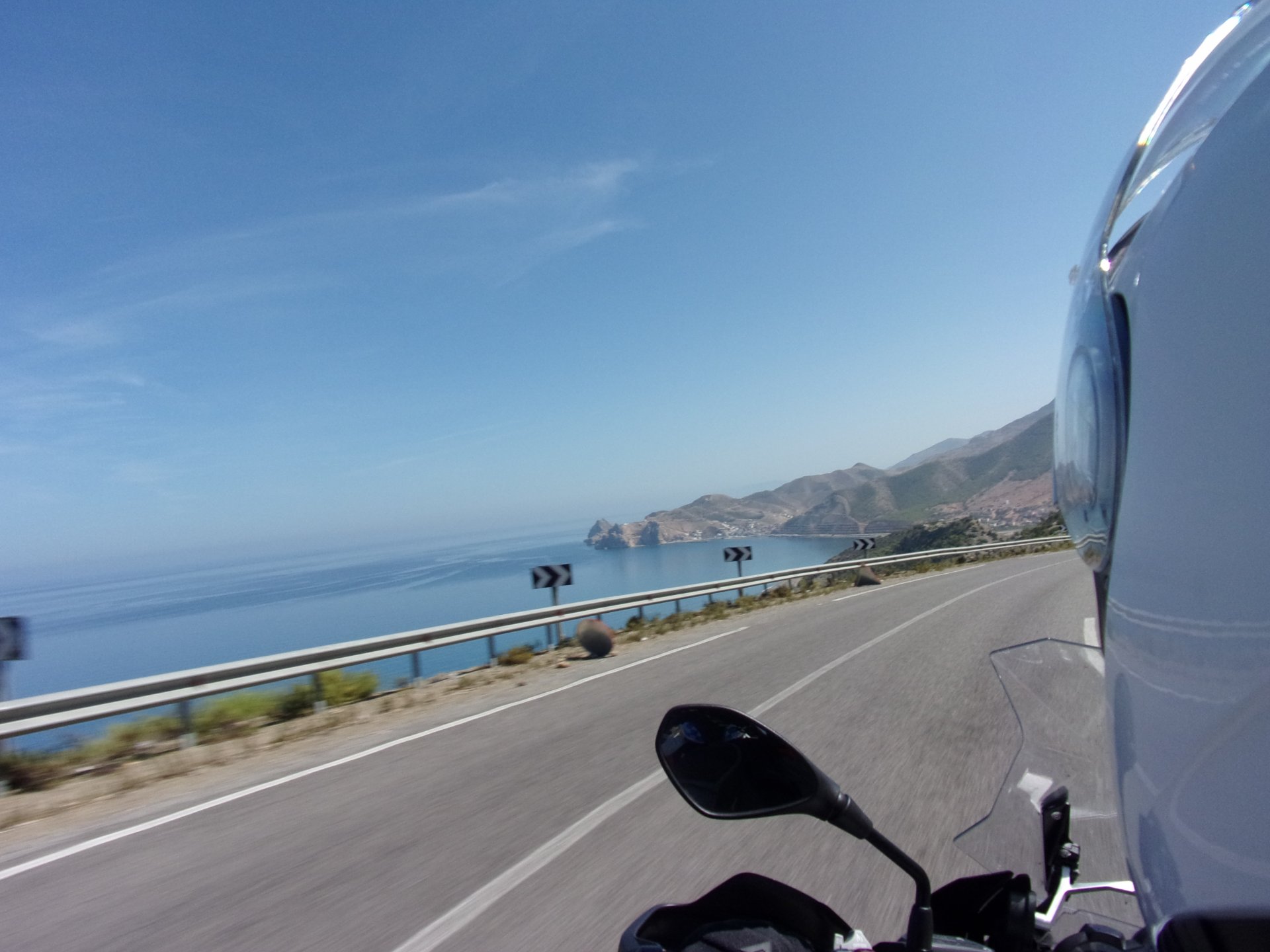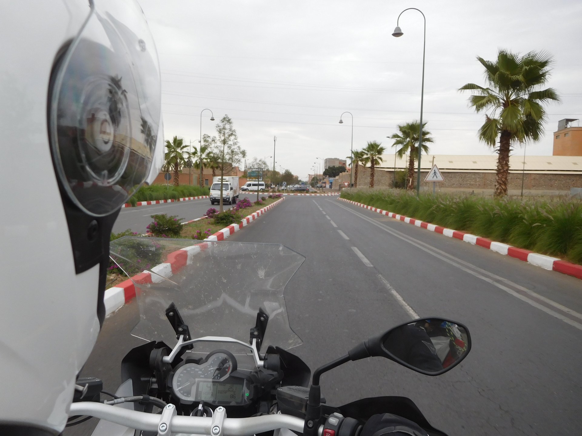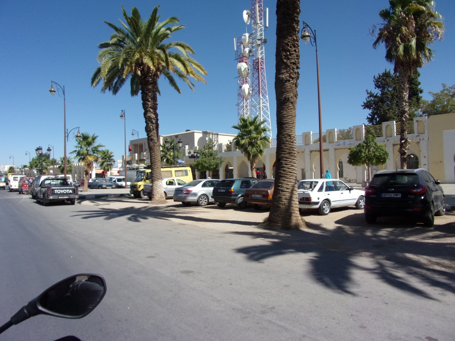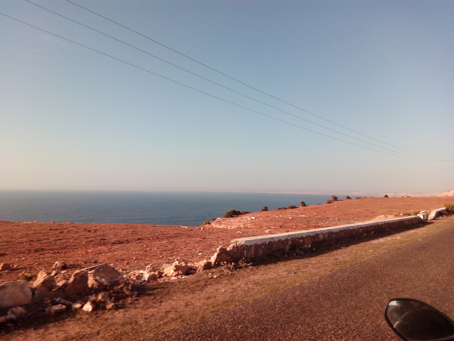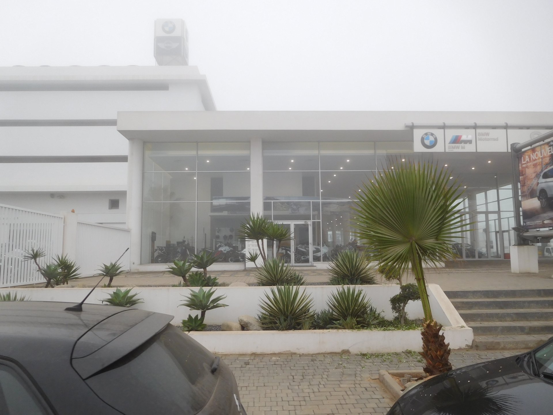 After a pretty sad meal the day before, only made better by the staff's enthusiasm over having Portuguese guests, we slept quite well listening to the sounds of the ocean. We left our hotel at our usual, not too early not too late, time, and made our way up the coast to Casablanca. Safi, a nice town with a huge refinery, not my kind of tea but people have to earn a living somehow. Never stop: we share a stoplight with this cool dude and his BMW (sound system properly on!) We get to Casablanca for an early afternoon snack instead of lunch, with Portuguese espresso We tried to visit Casablanca's mosque, apparently one of the world's most impressive religious buildings, it was closed for visitations and too foggy to even see the top It's so tall that it's got a laser that manages to be pointed and "making contact" with the minaret in Meca, and the inside is known to be amazing. I'm not one to visit buildings, so I wasn't too bothered by the fact it was closed, but the outside is impressive and beautiful. Instead we focused on finding a good deal on a hotel in the center. Casablanca is the city I've ever been in with the highest concentration of brand new Range Rovers per 100 cars, including London, but I sort of hagled a room price down. We had a nice bed and a guarded parking, that's all I need. We went out after dar for a walk and a meal, and saw a Morocco that was nothing like what we new, with neons and franchise food places, and cabarets We sat outside at a nice restaurant and had pizza and pasta, I don't remember who had what but I remember it was pretty nice. I get excited when I see a cocktail menu so ask for the wine menu, and the waiter tells me all cocktails are non alcoholic, and just that easily he breaks my heart ... Next morning we bug off early in the morning, just in time to catch rush our. It was raining drizzling, so instead of riding on and get wet I stop to look at cars for 20 minutes, it was pretty obvious why we had stopped so we got a good smile from the salespeople And off we go to Tangier But since I'm a sucker for a marina, we stop for a coffee instead ... took us AGES to leave Casablanca Somewhere, we stop for lunch in the sort of place we usually stop for lunch at. A cafe or cafe/restaurant at the side of the road, we figure that since this would be our last lunch in Morocco we might as well go native: Maria goes for the omelette with minced meat, a bold choice! She proceeds to eat it like a local, with her fingers and bread to help along, which I loved watching I have the skewers with a side of hot sauce to dip them in while eating. Onwards, because a 5 star hotel awaits us, we shall splurge! The roads aren't special at all in this area, the traffic sometimes reminds you you're still in Morocco though, but in a good way. I was feeling nostalgic during this last couple of hours of riding before Tangier. Maria asked if everything was ok with the bike, but no, it was just me trying to make it last a little longer. I love the way this people drive and treat the road and other users with respect. They don't really care for rules but at the same time will move over for a faster vehicle, will expect you to move over if they need to avoid a big pothole, if the road can fit three cars then there is no problem in fitting three cars even though there might be some random theoretical line in between, I get along with road traffic in Morocco a lot better than in Europe. This attitude to driving with survival and cooperation makes it simple. I don't get along with big city traffic, though, that is just random As we arrived to the most posh part of Tangier the sole focus is to enjoy the afternoon and evening, before going back home. Early morning and go to Tangier for breakfast, and quickly catch the ferry. This time we rode straight home, stopping right at the border between Spain and Portugal to put our rain suits on. Riding those last few hours in the rain, with the last 2 or 3 hours being already dark, and arriving home to a cold October night was a shock compared to the previous two weeks. We had little to eat at home, so did the smart thing, had a hot shower, and went out to eat while leaving the heating on to come back to a cozy house. We had grilled meat and drank wine in the only place still open in Azambuja!