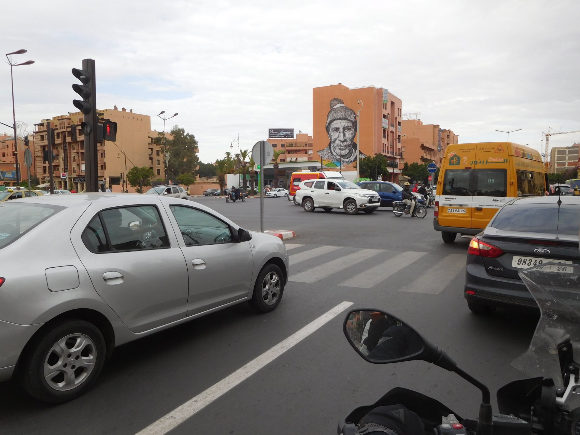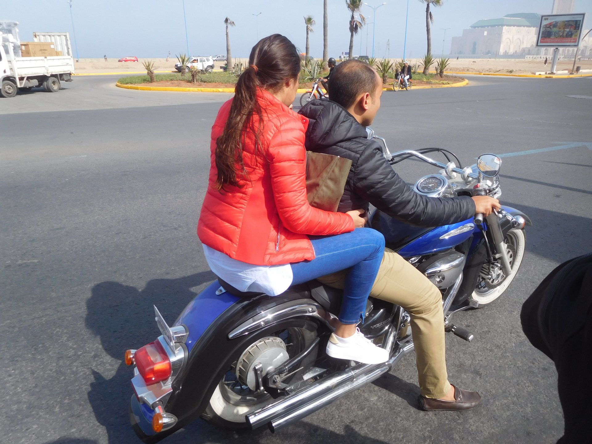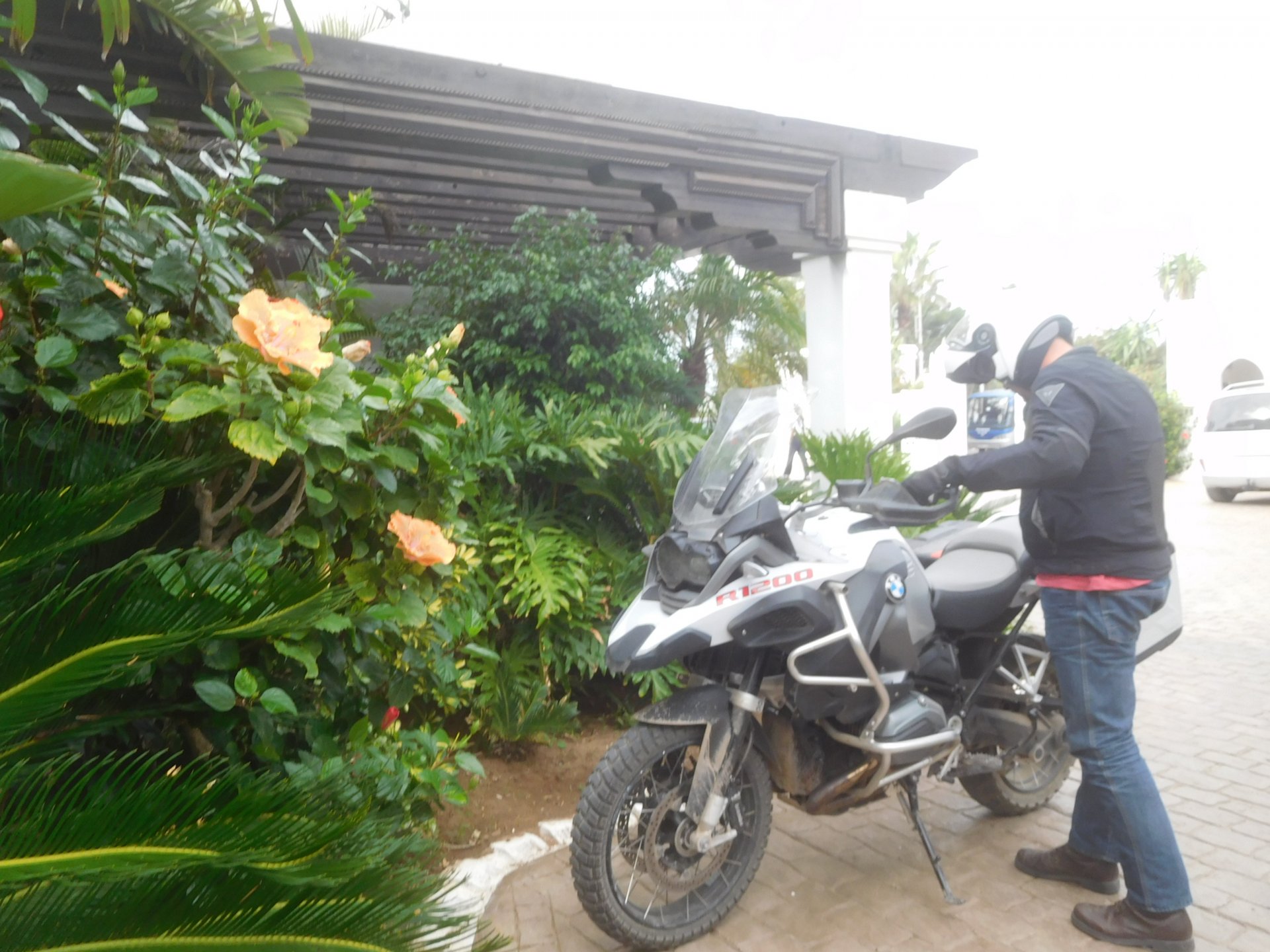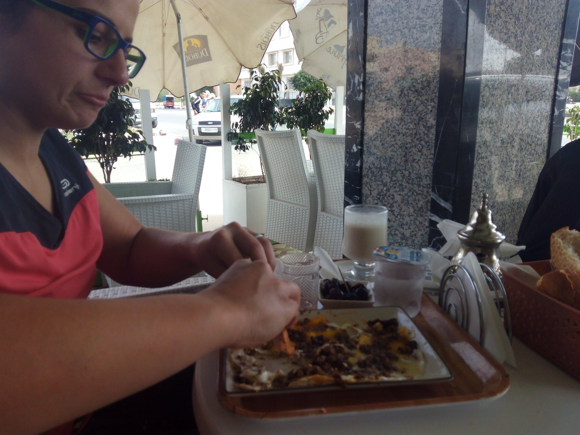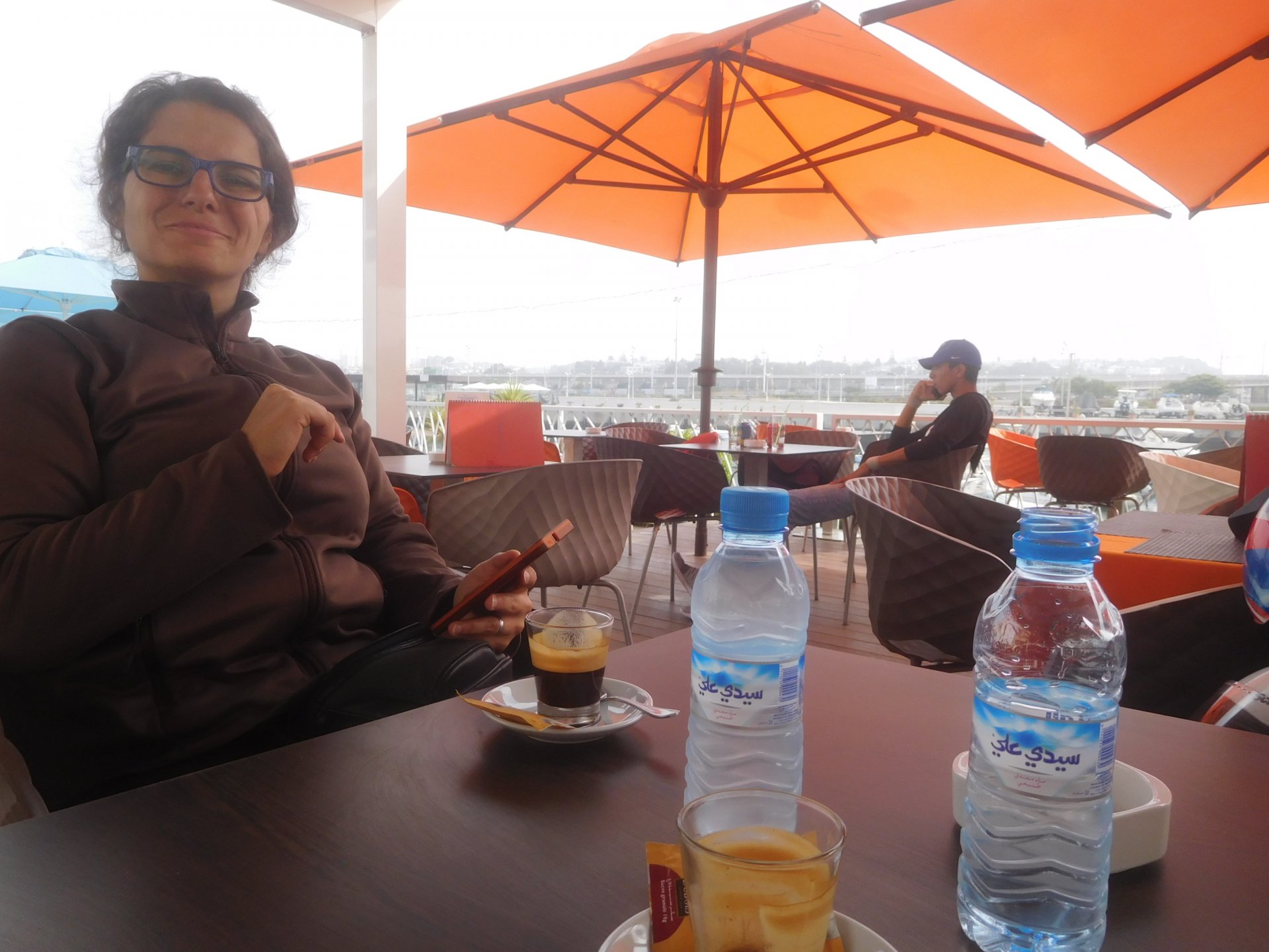 After a pretty sad meal the day before, only made better by the staff's enthusiasm over having Portuguese guests, we slept quite well listening to the sounds of the ocean. We left our hotel at our usual, not too early not too late, time, and made our way up the coast to Casablanca. Safi, a nice town with a huge refinery, not my kind of tea but people have to earn a living somehow. Never stop: we share a stoplight with this cool dude and his BMW (sound system properly on!) We get to Casablanca for an early afternoon snack instead of lunch, with Portuguese espresso We tried to visit Casablanca's mosque, apparently one of the world's most impressive religious buildings, it was closed for visitations and too foggy to even see the top It's so tall that it's got a laser that manages to be pointed and "making contact" with the minaret in Meca, and the inside is known to be amazing. I'm not one to visit buildings, so I wasn't too bothered by the fact it was closed, but the outside is impressive and beautiful. Instead we focused on finding a good deal on a hotel in the center. Casablanca is the city I've ever been in with the highest concentration of brand new Range Rovers per 100 cars, including London, but I sort of hagled a room price down. We had a nice bed and a guarded parking, that's all I need. We went out after dar for a walk and a meal, and saw a Morocco that was nothing like what we new, with neons and franchise food places, and cabarets We sat outside at a nice restaurant and had pizza and pasta, I don't remember who had what but I remember it was pretty nice. I get excited when I see a cocktail menu so ask for the wine menu, and the waiter tells me all cocktails are non alcoholic, and just that easily he breaks my heart ... Next morning we bug off early in the morning, just in time to catch rush our. It was raining drizzling, so instead of riding on and get wet I stop to look at cars for 20 minutes, it was pretty obvious why we had stopped so we got a good smile from the salespeople And off we go to Tangier But since I'm a sucker for a marina, we stop for a coffee instead ... took us AGES to leave Casablanca Somewhere, we stop for lunch in the sort of place we usually stop for lunch at. A cafe or cafe/restaurant at the side of the road, we figure that since this would be our last lunch in Morocco we might as well go native: Maria goes for the omelette with minced meat, a bold choice! She proceeds to eat it like a local, with her fingers and bread to help along, which I loved watching I have the skewers with a side of hot sauce to dip them in while eating. Onwards, because a 5 star hotel awaits us, we shall splurge! The roads aren't special at all in this area, the traffic sometimes reminds you you're still in Morocco though, but in a good way. I was feeling nostalgic during this last couple of hours of riding before Tangier. Maria asked if everything was ok with the bike, but no, it was just me trying to make it last a little longer. I love the way this people drive and treat the road and other users with respect. They don't really care for rules but at the same time will move over for a faster vehicle, will expect you to move over if they need to avoid a big pothole, if the road can fit three cars then there is no problem in fitting three cars even though there might be some random theoretical line in between, I get along with road traffic in Morocco a lot better than in Europe. This attitude to driving with survival and cooperation makes it simple. I don't get along with big city traffic, though, that is just random As we arrived to the most posh part of Tangier the sole focus is to enjoy the afternoon and evening, before going back home. Early morning and go to Tangier for breakfast, and quickly catch the ferry. This time we rode straight home, stopping right at the border between Spain and Portugal to put our rain suits on. Riding those last few hours in the rain, with the last 2 or 3 hours being already dark, and arriving home to a cold October night was a shock compared to the previous two weeks. We had little to eat at home, so did the smart thing, had a hot shower, and went out to eat while leaving the heating on to come back to a cozy house. We had grilled meat and drank wine in the only place still open in Azambuja!
