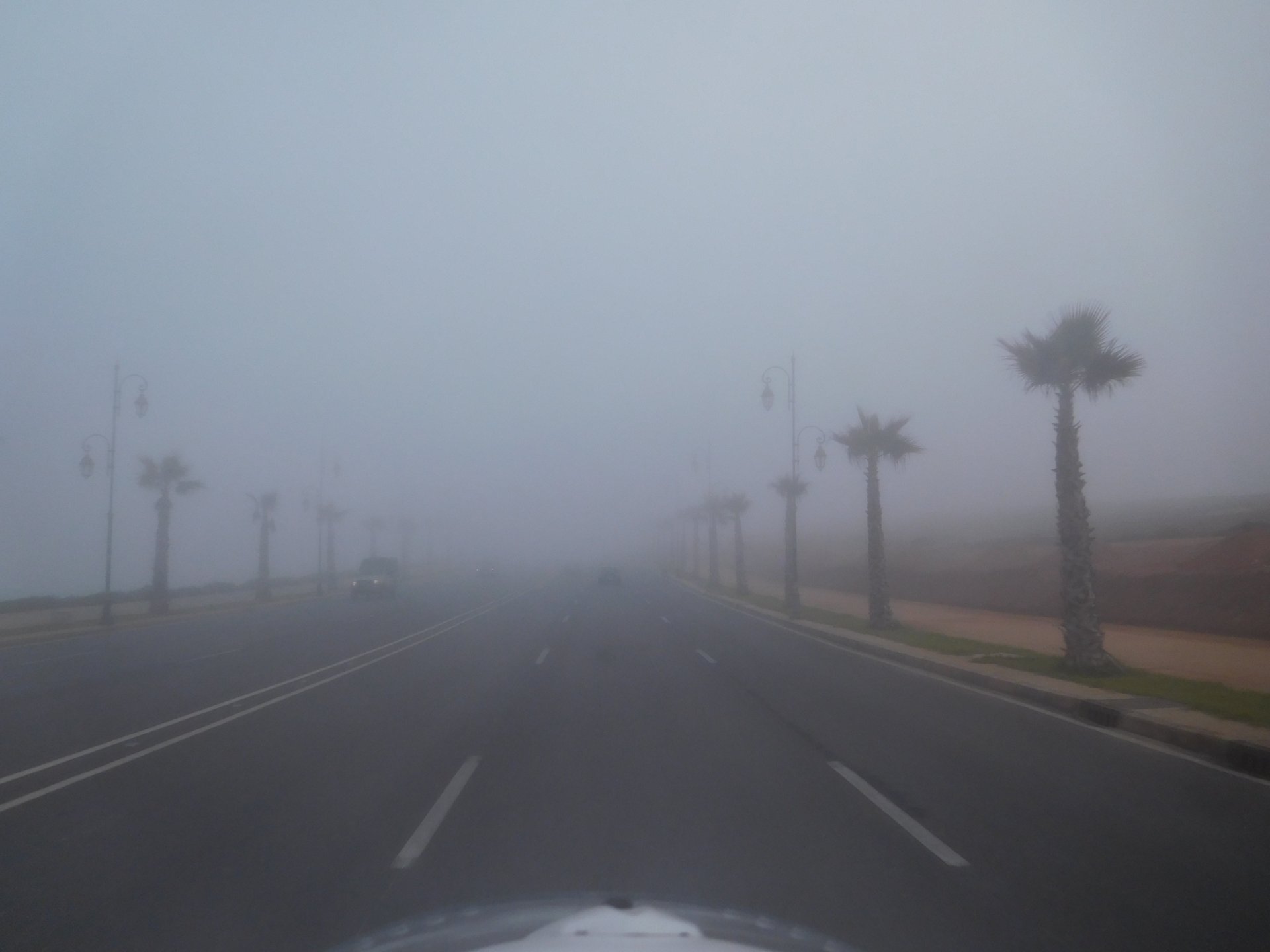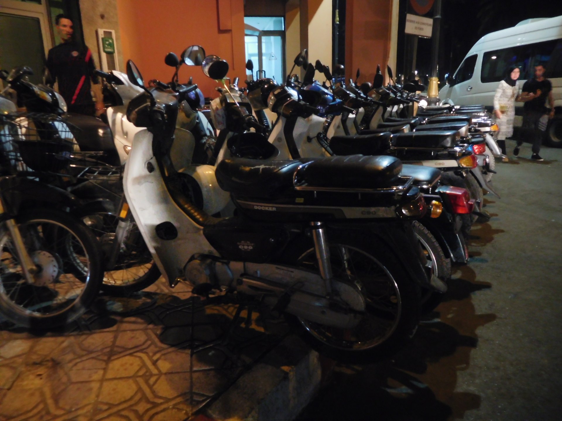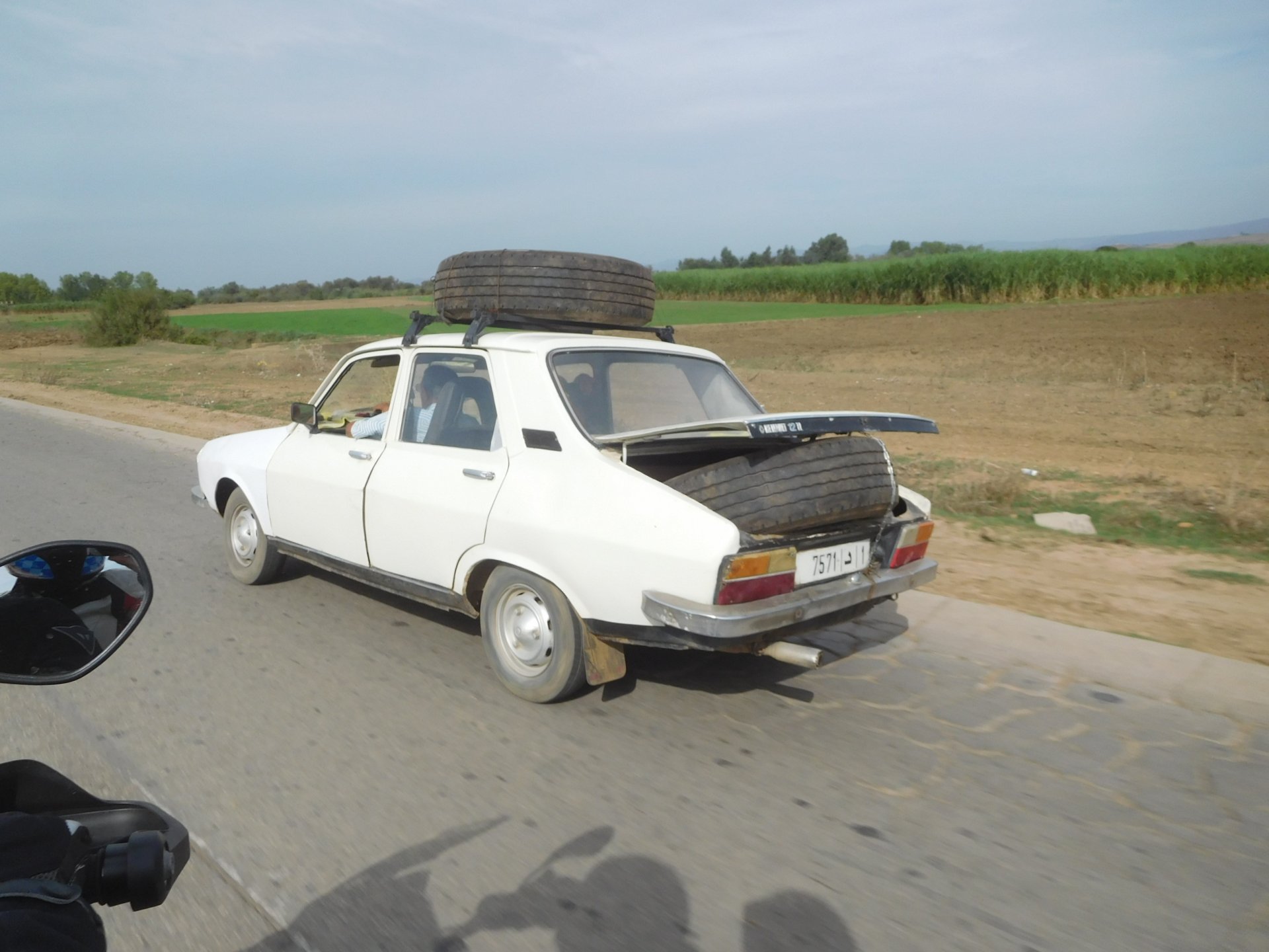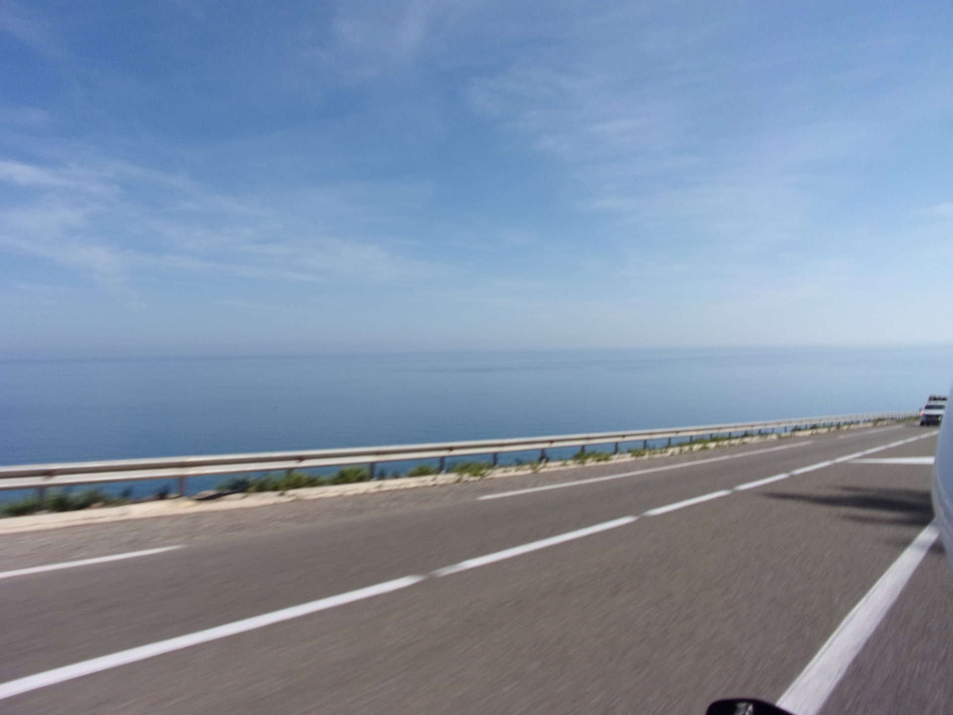 After a pretty sad meal the day before, only made better by the staff's enthusiasm over having Portuguese guests, we slept quite well listening to the sounds of the ocean. We left our hotel at our usual, not too early not too late, time, and made our way up the coast to Casablanca. Safi, a nice town with a huge refinery, not my kind of tea but people have to earn a living somehow. Never stop: we share a stoplight with this cool dude and his BMW (sound system properly on!) We get to Casablanca for an early afternoon snack instead of lunch, with Portuguese espresso We tried to visit Casablanca's mosque, apparently one of the world's most impressive religious buildings, it was closed for visitations and too foggy to even see the top It's so tall that it's got a laser that manages to be pointed and "making contact" with the minaret in Meca, and the inside is known to be amazing. I'm not one to visit buildings, so I wasn't too bothered by the fact it was closed, but the outside is impressive and beautiful. Instead we focused on finding a good deal on a hotel in the center. Casablanca is the city I've ever been in with the highest concentration of brand new Range Rovers per 100 cars, including London, but I sort of hagled a room price down. We had a nice bed and a guarded parking, that's all I need. We went out after dar for a walk and a meal, and saw a Morocco that was nothing like what we new, with neons and franchise food places, and cabarets We sat outside at a nice restaurant and had pizza and pasta, I don't remember who had what but I remember it was pretty nice. I get excited when I see a cocktail menu so ask for the wine menu, and the waiter tells me all cocktails are non alcoholic, and just that easily he breaks my heart ... Next morning we bug off early in the morning, just in time to catch rush our. It was raining drizzling, so instead of riding on and get wet I stop to look at cars for 20 minutes, it was pretty obvious why we had stopped so we got a good smile from the salespeople And off we go to Tangier But since I'm a sucker for a marina, we stop for a coffee instead ... took us AGES to leave Casablanca Somewhere, we stop for lunch in the sort of place we usually stop for lunch at. A cafe or cafe/restaurant at the side of the road, we figure that since this would be our last lunch in Morocco we might as well go native: Maria goes for the omelette with minced meat, a bold choice! She proceeds to eat it like a local, with her fingers and bread to help along, which I loved watching I have the skewers with a side of hot sauce to dip them in while eating. Onwards, because a 5 star hotel awaits us, we shall splurge! The roads aren't special at all in this area, the traffic sometimes reminds you you're still in Morocco though, but in a good way. I was feeling nostalgic during this last couple of hours of riding before Tangier. Maria asked if everything was ok with the bike, but no, it was just me trying to make it last a little longer. I love the way this people drive and treat the road and other users with respect. They don't really care for rules but at the same time will move over for a faster vehicle, will expect you to move over if they need to avoid a big pothole, if the road can fit three cars then there is no problem in fitting three cars even though there might be some random theoretical line in between, I get along with road traffic in Morocco a lot better than in Europe. This attitude to driving with survival and cooperation makes it simple. I don't get along with big city traffic, though, that is just random As we arrived to the most posh part of Tangier the sole focus is to enjoy the afternoon and evening, before going back home. Early morning and go to Tangier for breakfast, and quickly catch the ferry. This time we rode straight home, stopping right at the border between Spain and Portugal to put our rain suits on. Riding those last few hours in the rain, with the last 2 or 3 hours being already dark, and arriving home to a cold October night was a shock compared to the previous two weeks. We had little to eat at home, so did the smart thing, had a hot shower, and went out to eat while leaving the heating on to come back to a cozy house. We had grilled meat and drank wine in the only place still open in Azambuja!