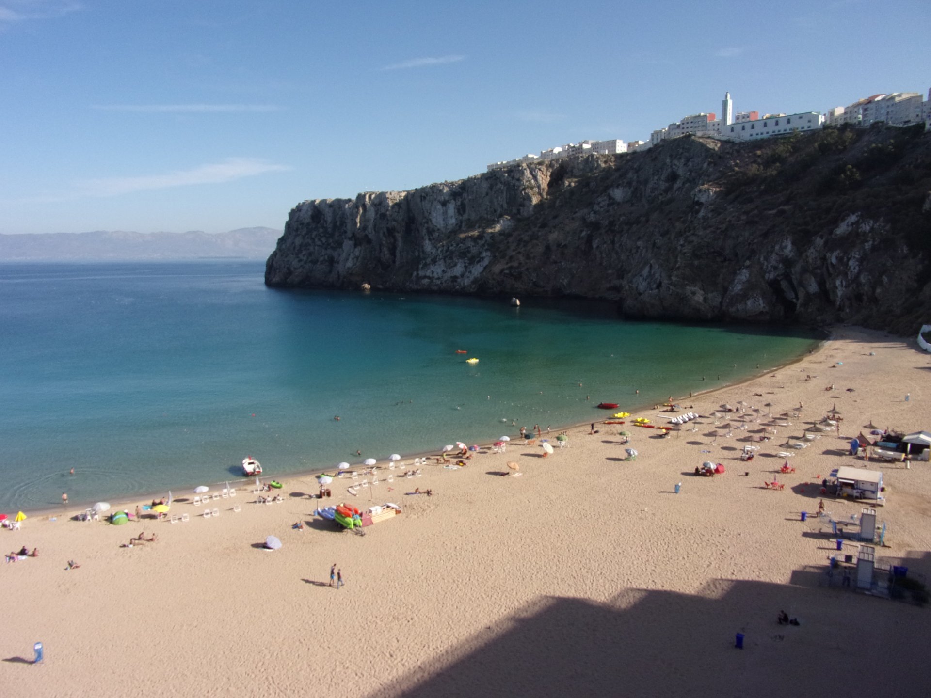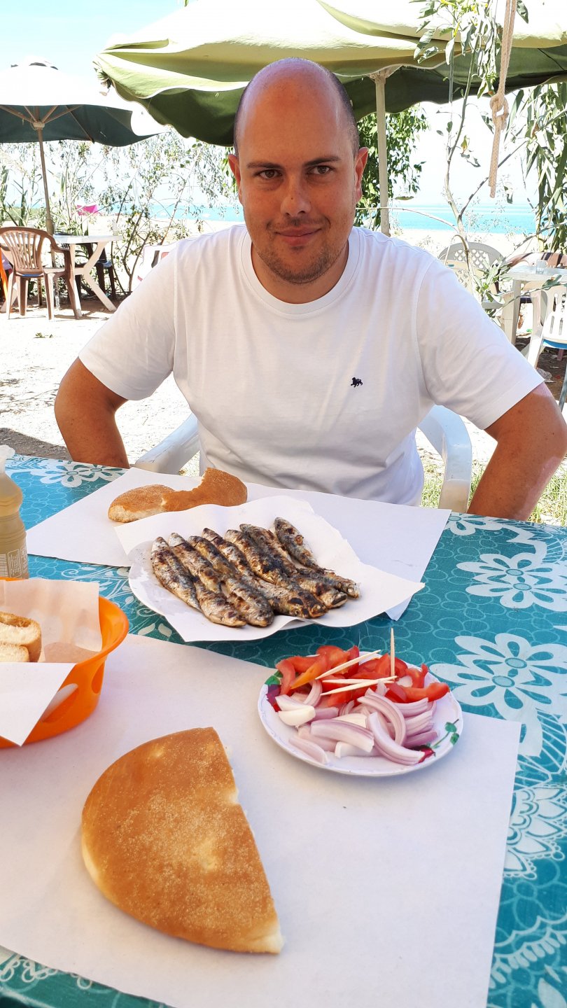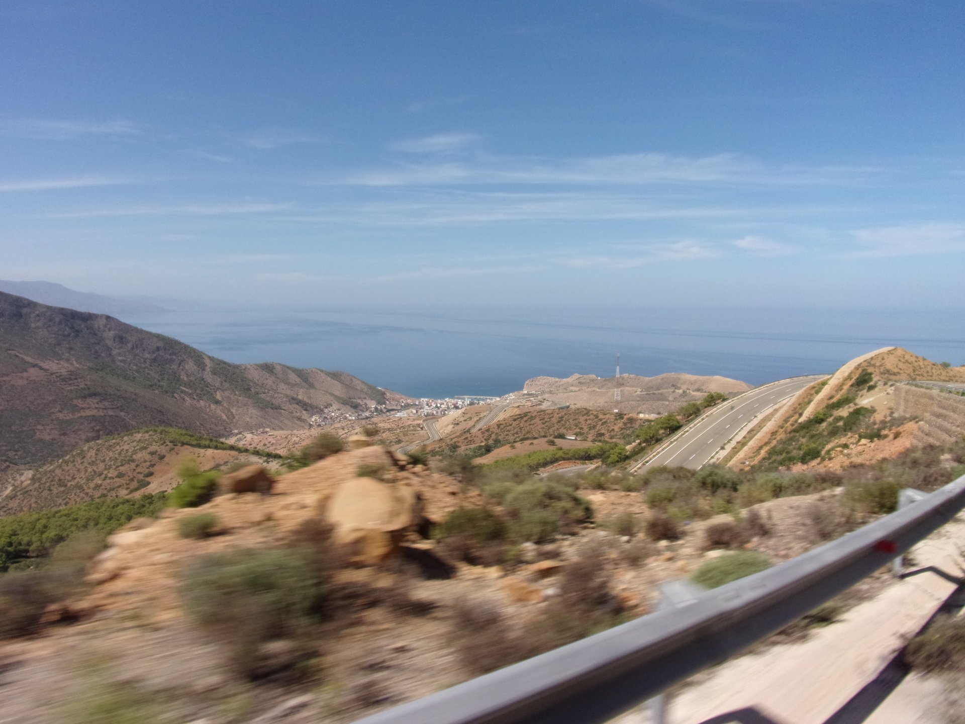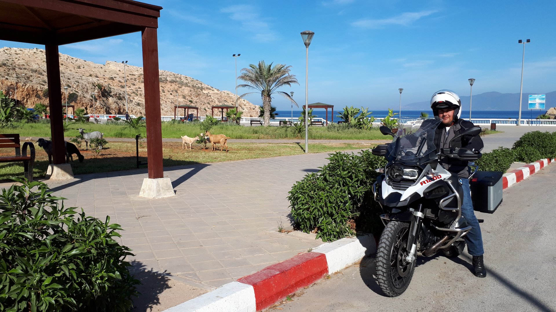 Tangier's waterfront has changed quite a bit in the three years we've been coming here We were headed to Al Hoceima, which is on the Mediterranean coast. It's a short ride, but still took longer to get there on account of a couple of detours. for @XTreme: See you in a bit, Tangier, we've got a nice coastal road to do We stopped at a fish grilling place right on the beach, and ordered whatever they had, sardines. They didn't speak any french, and a communication error meant that I ordered two doses of fish instead of fish for two, we had a huge amount of sardines to eat, the cats went home happy that day. They brought another portion right after this one Best sardines I've ever had, though, and it was quite cool to be there. Goats don't care if you're growing decorative bushes or gardens Al Hoceima looked like a paradise with little people about and the Mediterranean sea. We stayed by the sea and went to the beach, a pattern was emerging One of the ways we pack light, being a couple and using just one case for all our clothing for two weeks, is that we wash clothes frequently. Most of the places we sleep in are warm and breezy during the evenings, whenever we get somewhere we usually do our clothes in the sink, and by the time we go to bed they're dry. If you carry three sets you're almost always golden. If you carry a fourth you're safe. One o With nightfall, peaceful Al Hoceima came alive, noise and traffic, and lots and lots of people. We had a nap after the beach and went out to eat. Who says you can't have class on a street hole in the wall in Morocco? Another great day