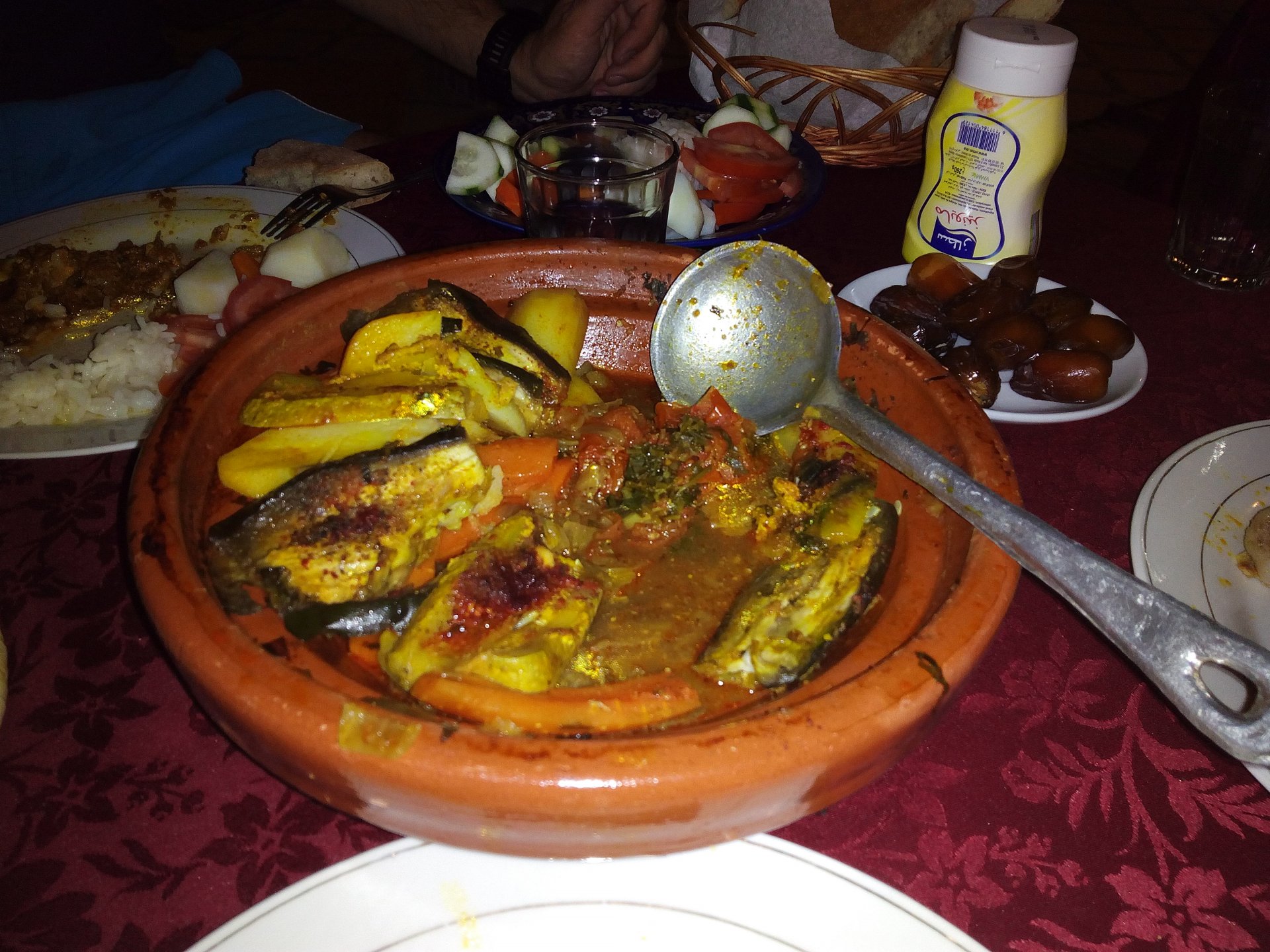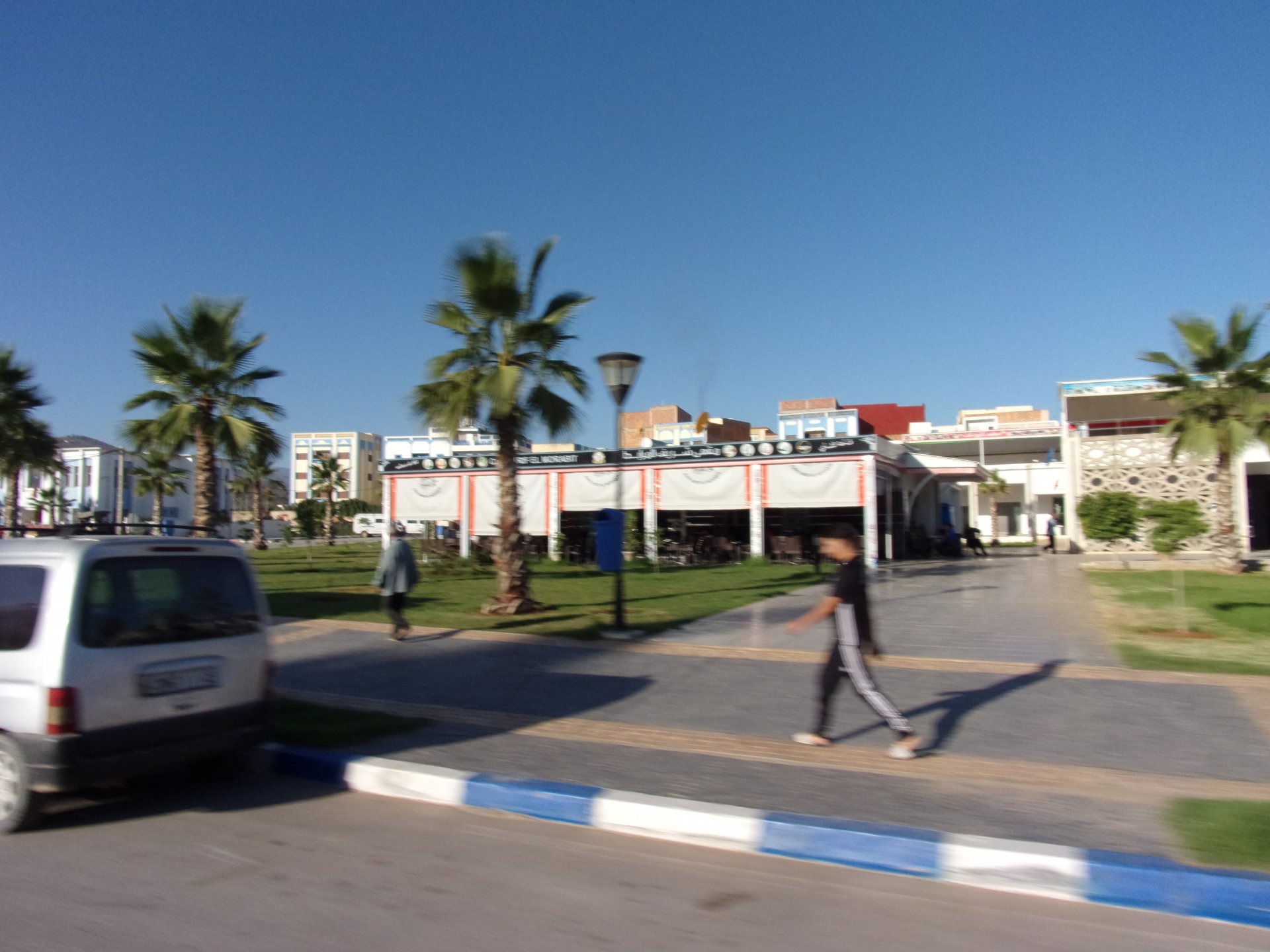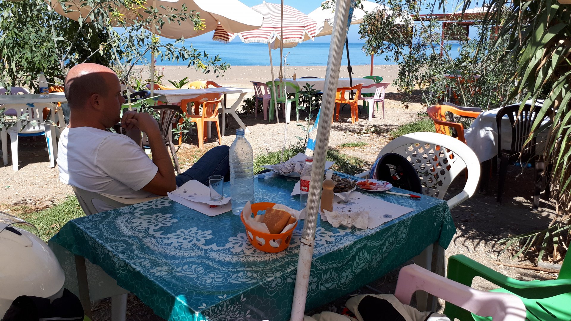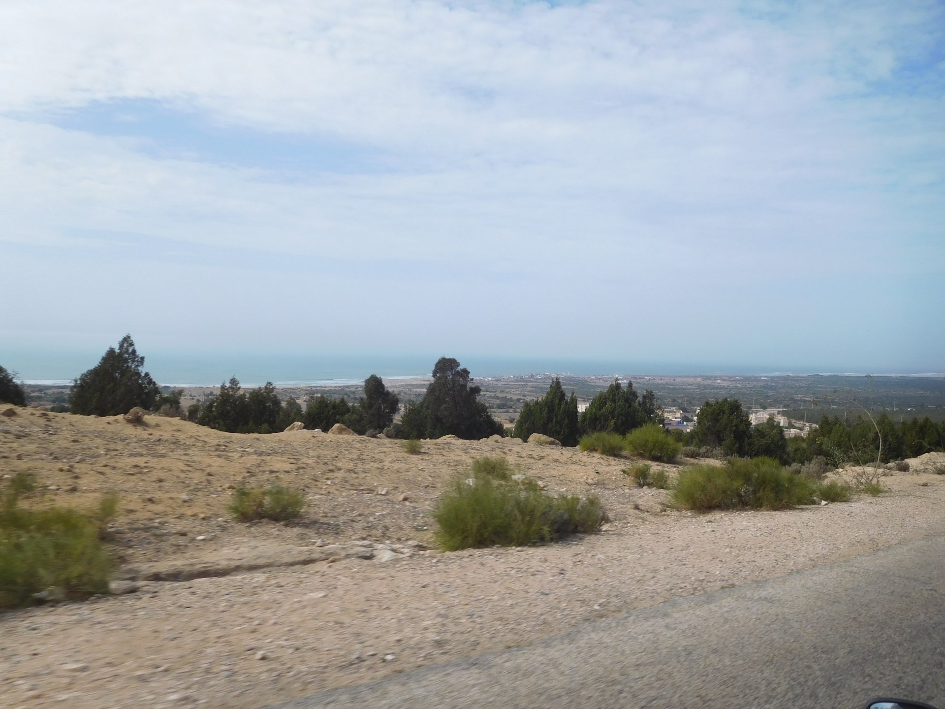 Tangier's waterfront has changed quite a bit in the three years we've been coming here We were headed to Al Hoceima, which is on the Mediterranean coast. It's a short ride, but still took longer to get there on account of a couple of detours. for @XTreme: See you in a bit, Tangier, we've got a nice coastal road to do We stopped at a fish grilling place right on the beach, and ordered whatever they had, sardines. They didn't speak any french, and a communication error meant that I ordered two doses of fish instead of fish for two, we had a huge amount of sardines to eat, the cats went home happy that day. They brought another portion right after this one Best sardines I've ever had, though, and it was quite cool to be there. Goats don't care if you're growing decorative bushes or gardens Al Hoceima looked like a paradise with little people about and the Mediterranean sea. We stayed by the sea and went to the beach, a pattern was emerging One of the ways we pack light, being a couple and using just one case for all our clothing for two weeks, is that we wash clothes frequently. Most of the places we sleep in are warm and breezy during the evenings, whenever we get somewhere we usually do our clothes in the sink, and by the time we go to bed they're dry. If you carry three sets you're almost always golden. If you carry a fourth you're safe. One o With nightfall, peaceful Al Hoceima came alive, noise and traffic, and lots and lots of people. We had a nap after the beach and went out to eat. Who says you can't have class on a street hole in the wall in Morocco? Another great day