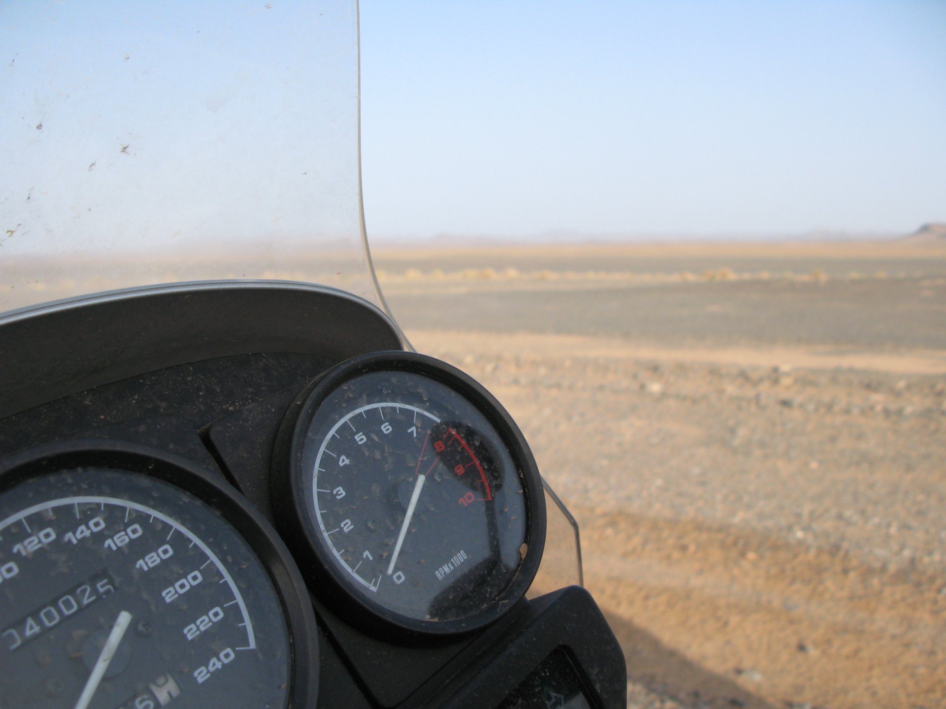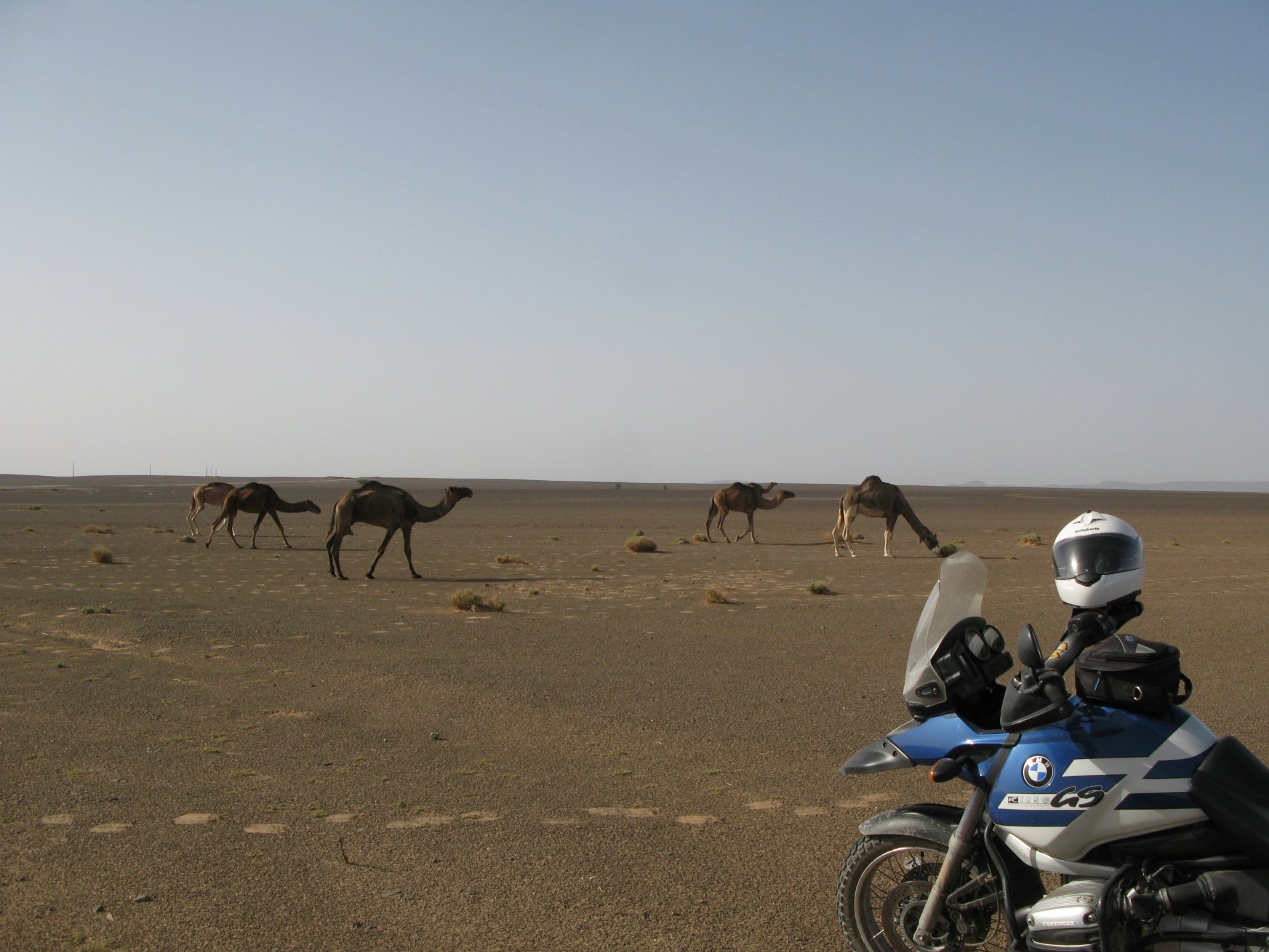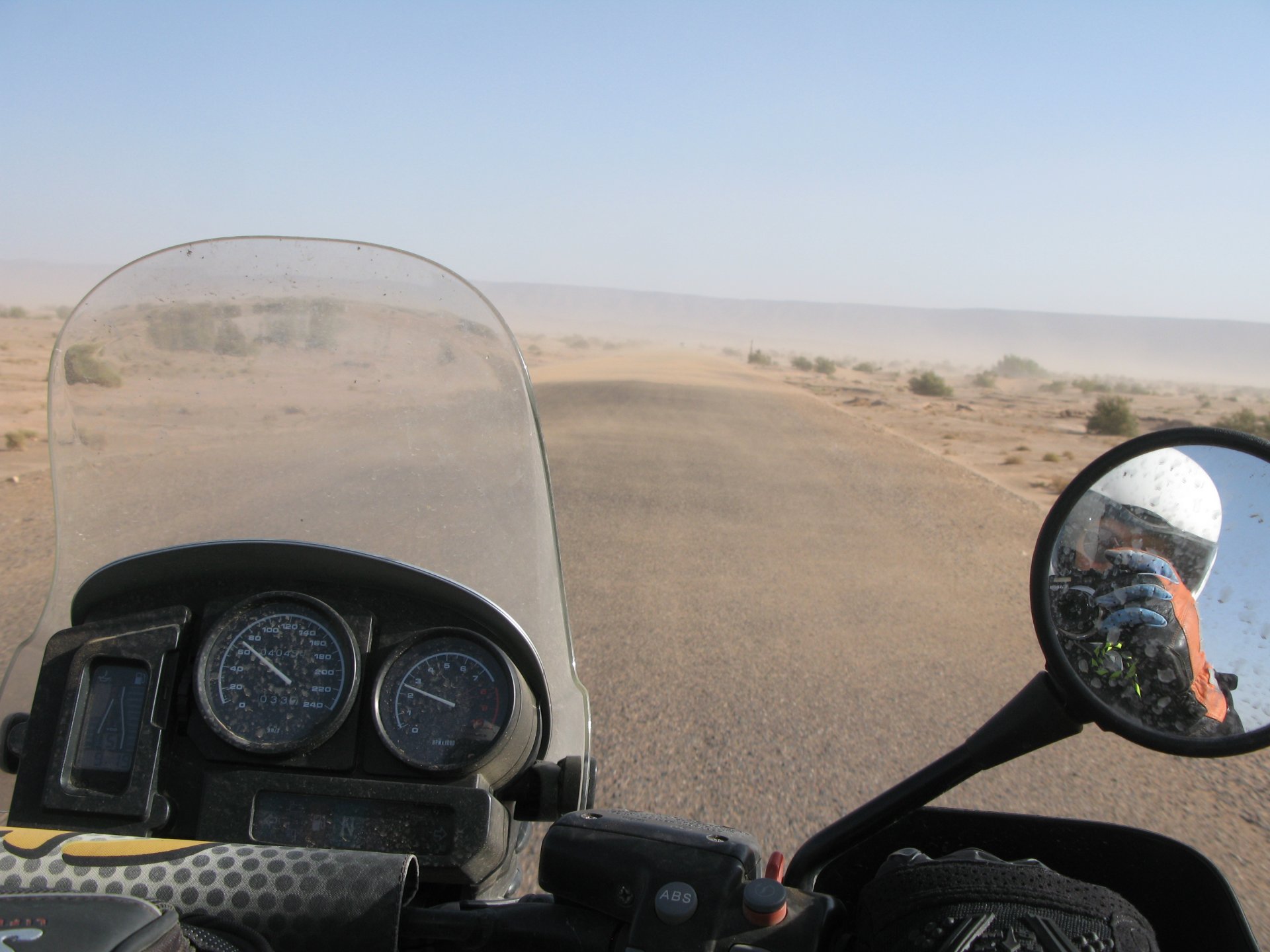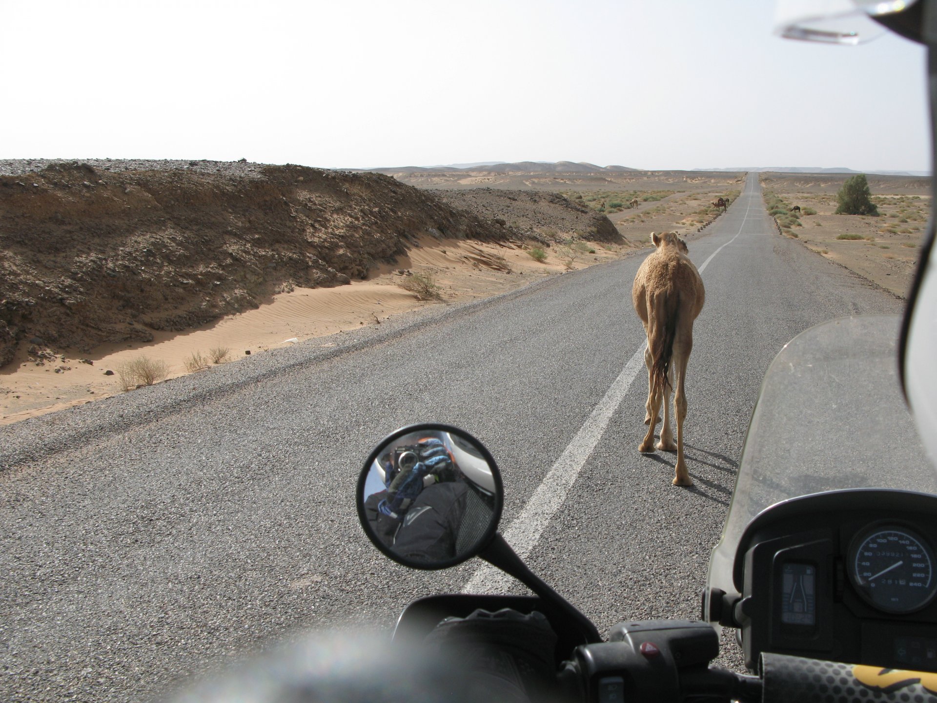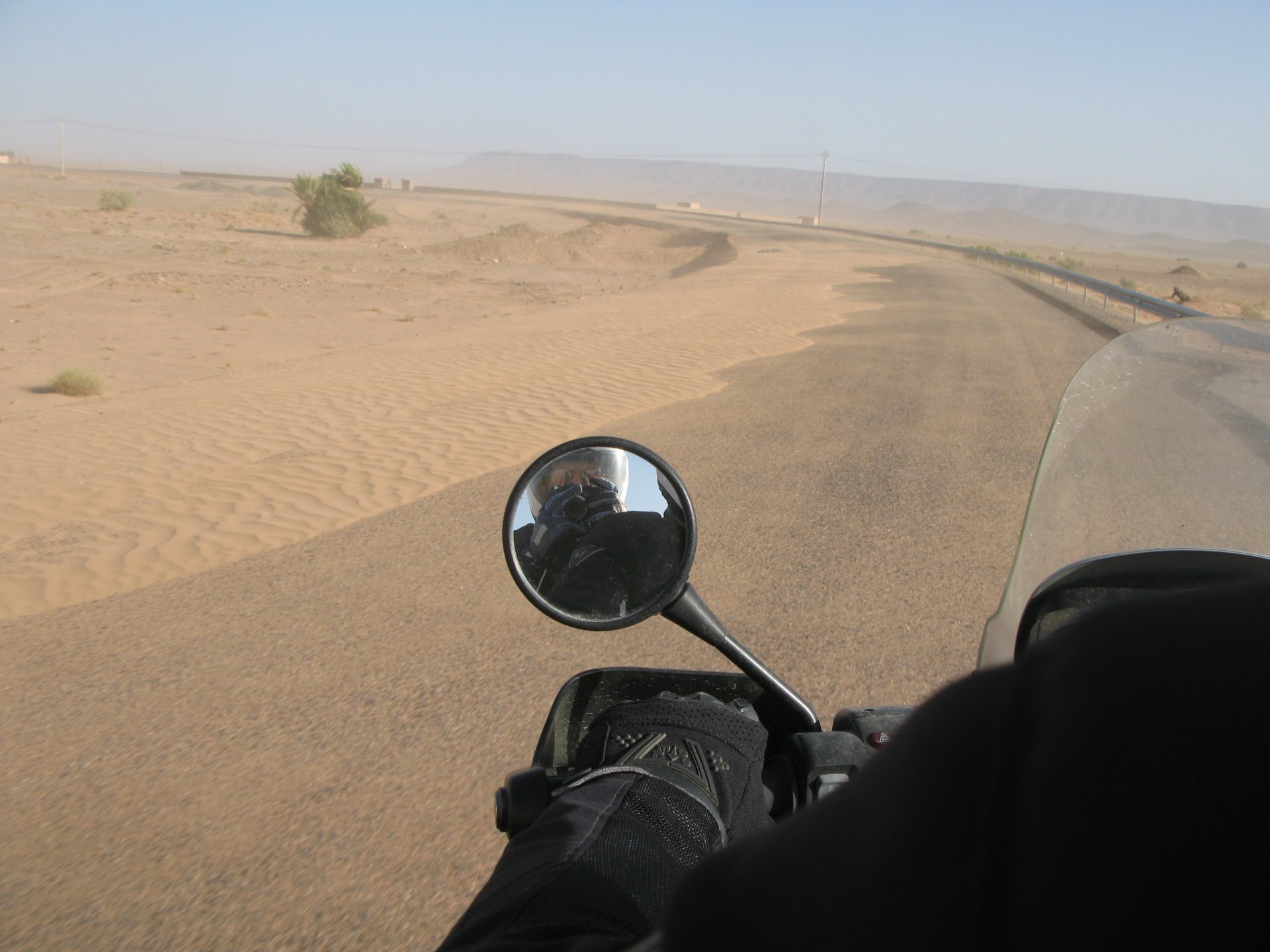 After a hard evening of riding on very dark roads, getting lost with oncoming rally trucks blasting by at very high speeds with full blinding rally lights on, the shower and warm food, and sleep, felt like heaven. Sleeping in a hotel made of mud and powered by the distance hum of a generator, it means that when they turn the generator off you get an amazing night's sleep. In the morning, Maria's plan was to see the desert sunrise so sleep better be good because I wasn't going to sleep in Good news is that the dunes are right on our back door. I discovered desert sand for the first time. Having never been, I was amazed at how fine it is, and at how it doesn't stick to your skin. Instead, it absorbs all moisture out of it and almost cleans it. I've loved this place ever since. Sand was proper cold, and he had our cardio by climbing a couple of dunes, if you're not born doing that is pretty exhausting stuff. With an apetite, I enjoyed some nice msemmen for breakfast. It's a kind of hardish crepe or pancake, not really healthy but very tasty, usually eaten with honey, butter or jam. I have it with honey usually, although it's good when still warm with proper butter. The rest of the day was spent exploring the area around, we needed a rest so took the chance to ride the bike a little with no luggage, get it stuck a little too So during the morning we goofed off in the sand and took "adventuring" pictures I had my first close encounter with camel herds, and again, was surprised at how fast they actually cover distance when appearing to walk calmly. Can't be in the desert without the Clint Eastwood snarl It had rained the previous night, so we found the water droplet marks on the sand, seemed every single drop made it's own impact. On some you could actually see a speck of green starting to appear Desert @Tym showed up, to try and sell some rocks and to show me that my 1150 motorcycle is not the best tool for riding efficiently here. The heat was starting to grow, and we hit the village center for some lunch, in Morocco you can't go wrong with some omelette and olives. Usually, away from cities you'll see the chickens pecking away around the cafes and restaurants, so you know the eggs and chicken meat is great. Maria, going for the cool adventurer look. In the afternoon, we snoozed a little, and just hang out at the hotel drinking water. My hotel room ceiling: That evening we climbed the highest dune close to the hotel to go and see the sunset, but our plans were foiled by a sandstorm, which was an event of it's own. It starts with a refreshing breeze: And you start to see fast moving weather in the distance: And soon enough you're enjoying it from the comfort of a shelter, with your nose and ears full of sand. I grew to love that place, and with time we went back but that is for other reports. On the next day we woke up at dawn and tried to have the bike packed before breakfast while it was still cool. I love having a relaxed breakfast and then just getting my jacket and helmet on and ride off, no faffing about with luggage. Allows you to not be all sweaty and yucky when riding off, and makes for much more of an enjoyable exit. You look cooler as well, for all the adventure amateurs that might be around. This is also one of the reasons we never carried more than our side cases, simplicity is coolness.