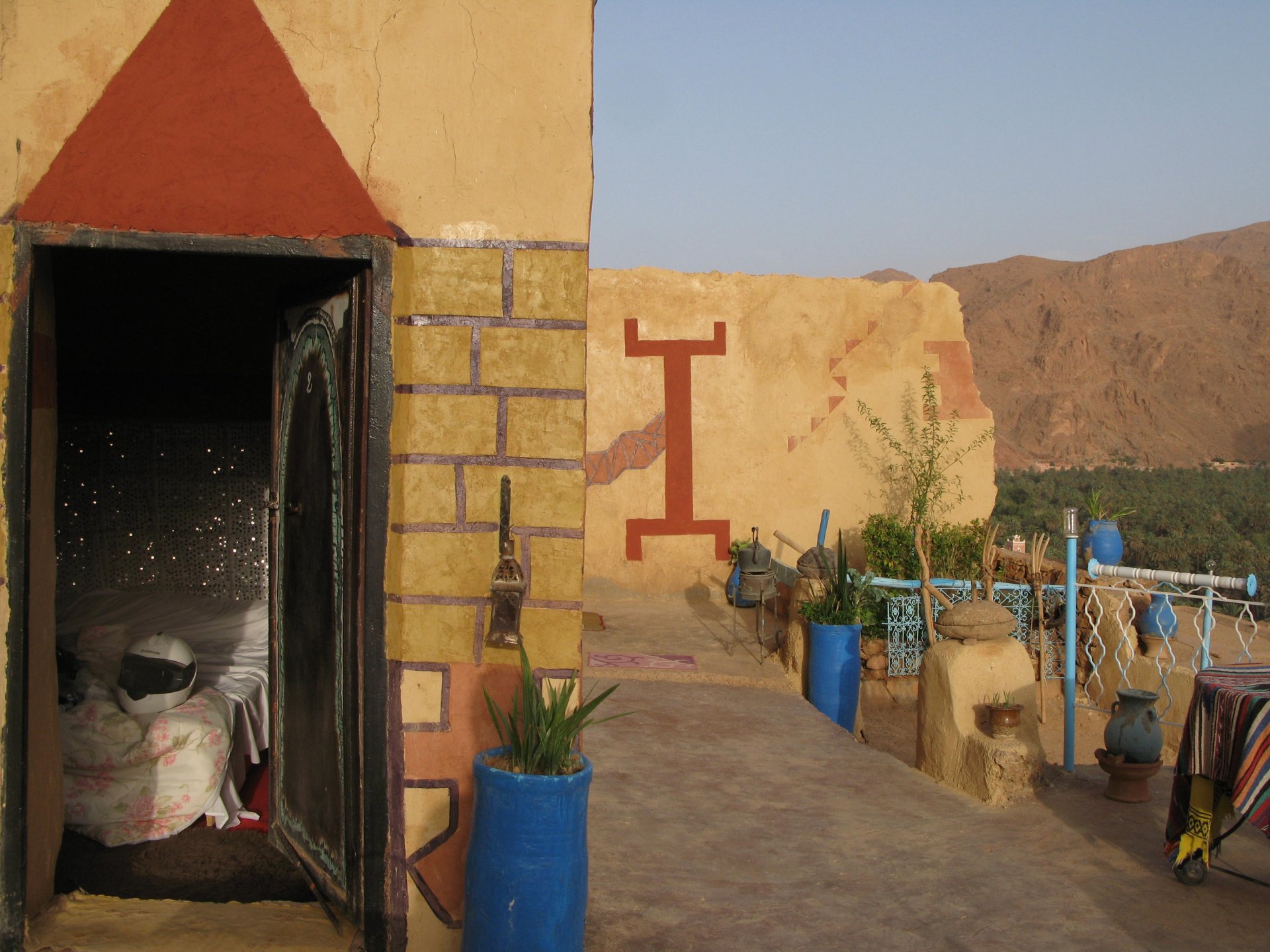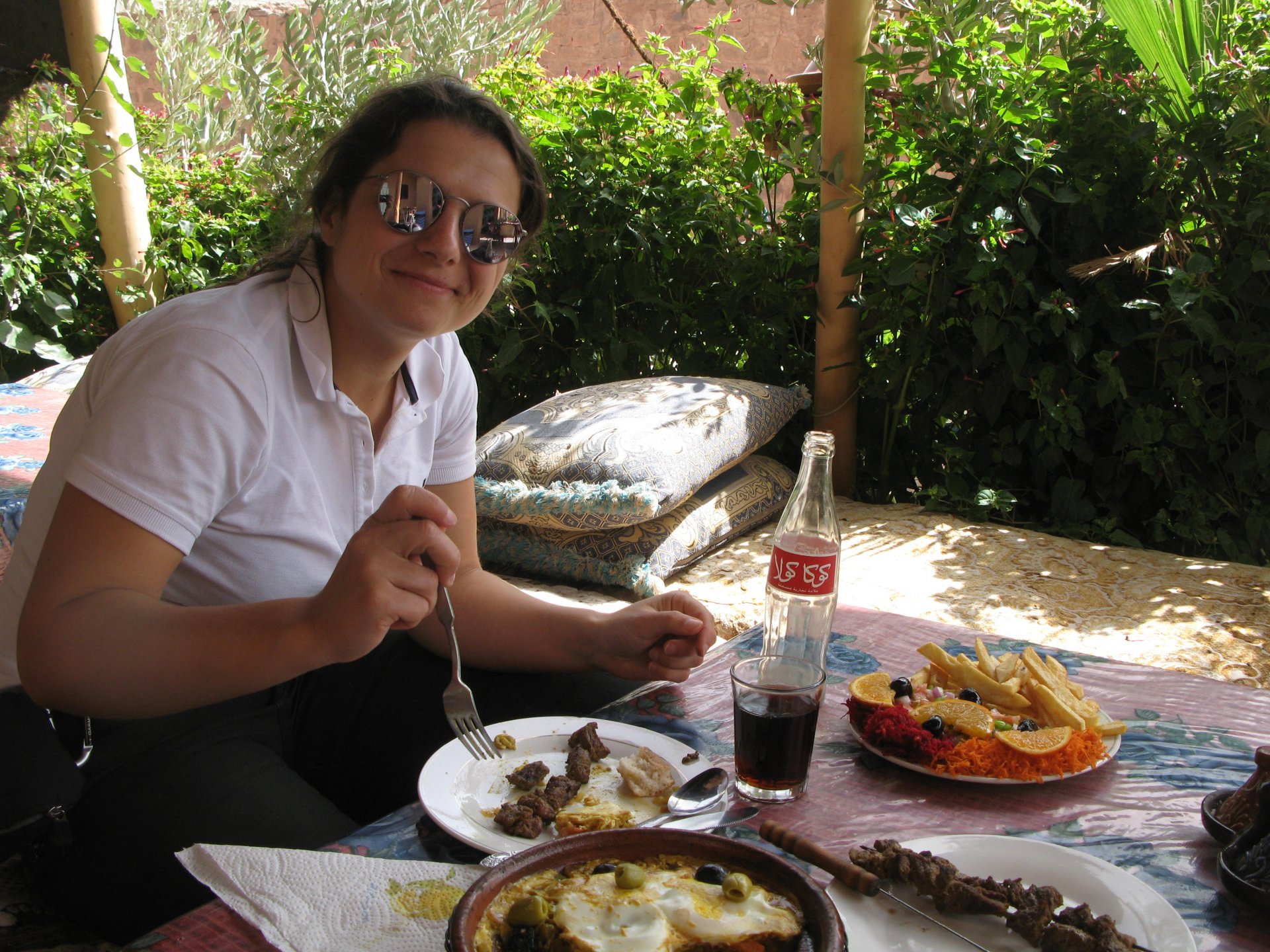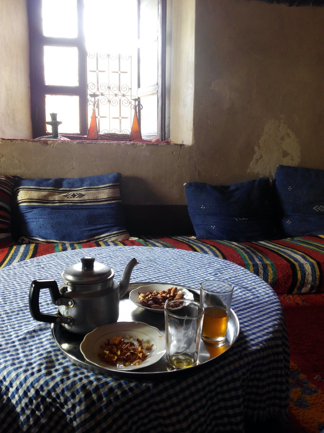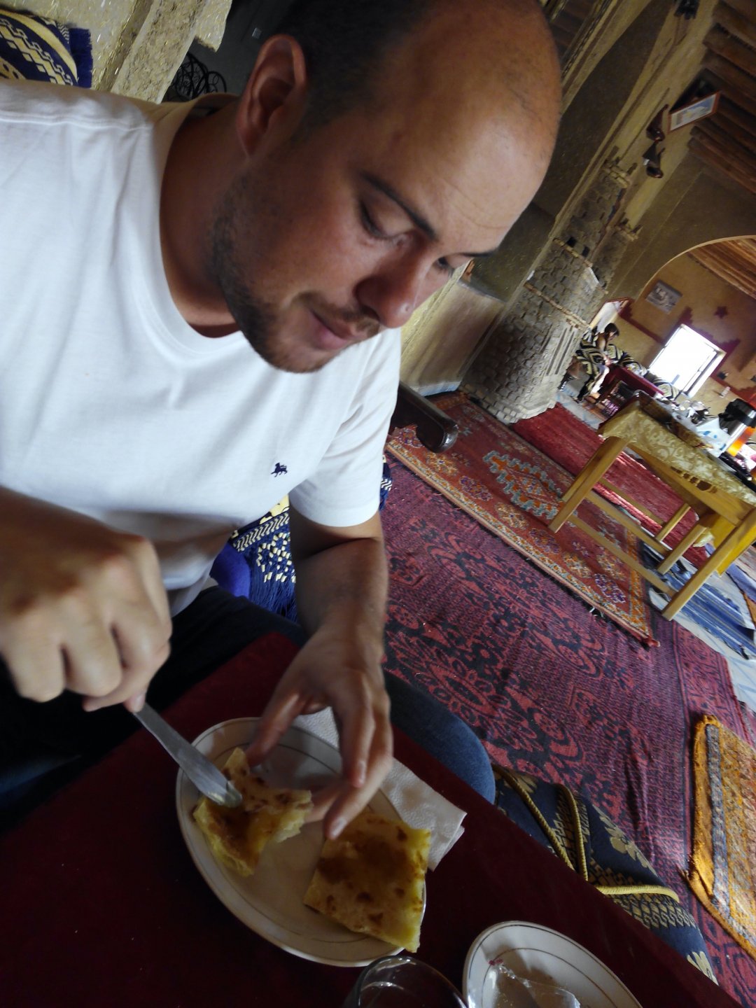 As we were negotiating our way out of the hills, we got properly lost. I had never been somewhere like this, it was obviously mid to high altitude for a Portuguese person's perception, starting to warm up but not desert. A very confusing place to be. Maria couldn't find the road we were on on any internet map, so we stopped to gather our thoughts and have a drink of water. It was here that one of the best social encounters we ever had occurred. As I am marveling in the views, and Maria is trying to get some cell coverage to figure out if we're heading the right direction, someone slowly approaches us, you can see him away in the distance. This man is tending to a few sheep or goats, and as he approaches us to say hello I offer some water. He accepts, and in return invites us to follow him, I park the bike in a way that it is less exposed to traffic and follow him to his home. We were parked less than 100 meters from his home, which was on the cliffside, and didn't even see it. In the picture below you see my bike parked from his place's viewpoint: We didn´t understand a word they said, nor did they understand us. Maria was fluent in french, but that wasn't any good, they didn't even speak arabic, only berber. We were made to sit down, have a drink of water and just hang out a little. Above you see their living and dining room. It was pretty obvious that my water offer got us invited to lunch, and something was being prepared. In the meantime, we just hang out with the grandson who played with a kitten, his mother, and his grandfather, while the grandmother cooked lunch. I don't really know how long it took but eventually we got fed up with having a camera and put it aside except to take a picture of lunch: What you see here above is the best omelette I have ever had, berber style which means it's not folded. In the smaller dish you've got butter almost in liquid form. It was a proper feast, I didn't take a picture of the plate of honey comb they brought as breaking out the camera would have spoilled the mood. It was a great meal, shared by people who don't have much to share. Our hosts eagered us to eat up, while they barely just tasted their own food to check if it was ok. It was a truly humbling experience. After we were done, out came the tea, and after three cups we were finished. As we prepared to leave their niece arrived, she knew french was was able to translate our farewells. I offered my opinel folding knife as a gift and it was well received, but the feeling that no gift was needed was pretty well understood. This had been an amazing experience, had the bike not been parked on the side of a cliff with truck traffic, we might have stayed the night as it was our hosts' intentions. To this day I treasure this memory. Getting back on the bike feeling well fed and refreshed, the scenery started to open up. We made our way through Midelt, and checked in on our hotel for the night. As we rolled in it became clear we came accross Europeans again, both rally enthusiasts and race teams, as well as touring motorcyclists. Although we were looking for some conversation with our fellow travelers, nobody showed up for dinner at the hotel's restaurant, so we entertained ourselves. Dinner is completely out of focus, but it was delicious if lacking for a nice wine. If there is something lacking in Morocco, it's wine. The next day would be a really great one as well.