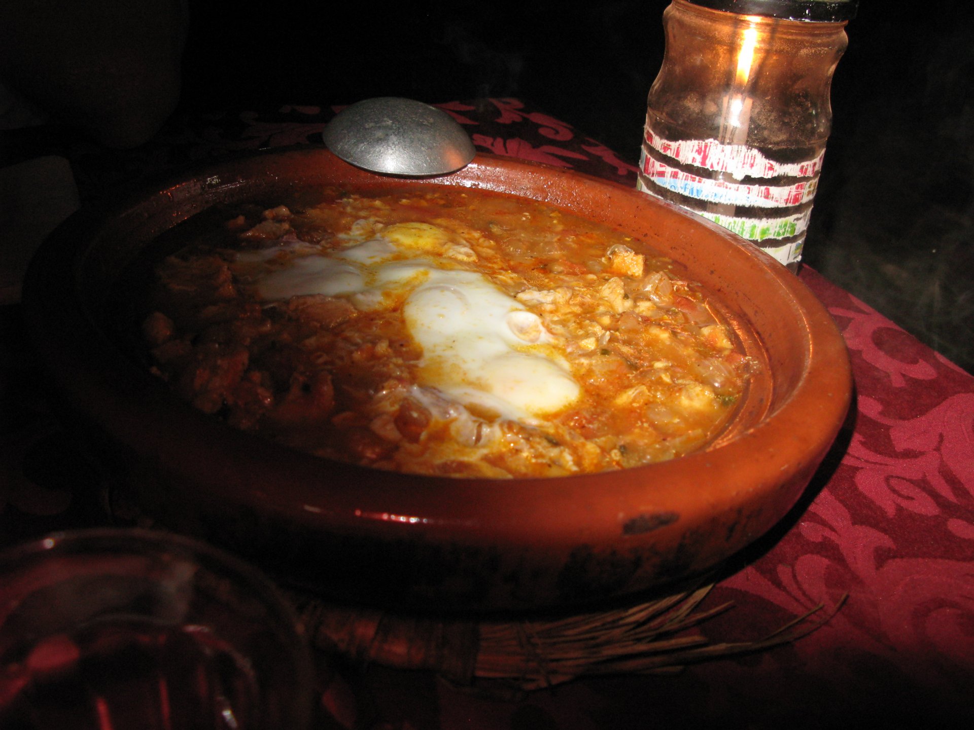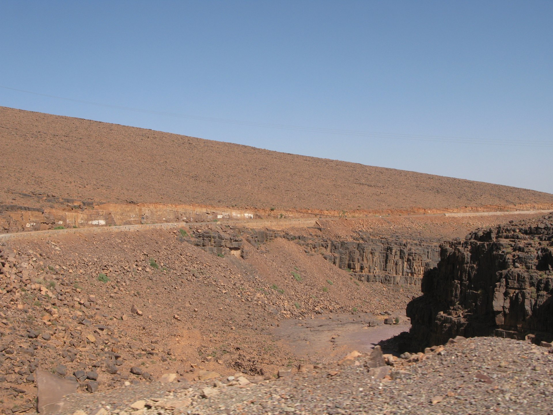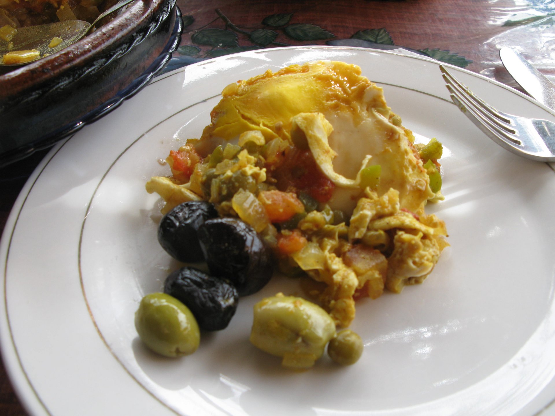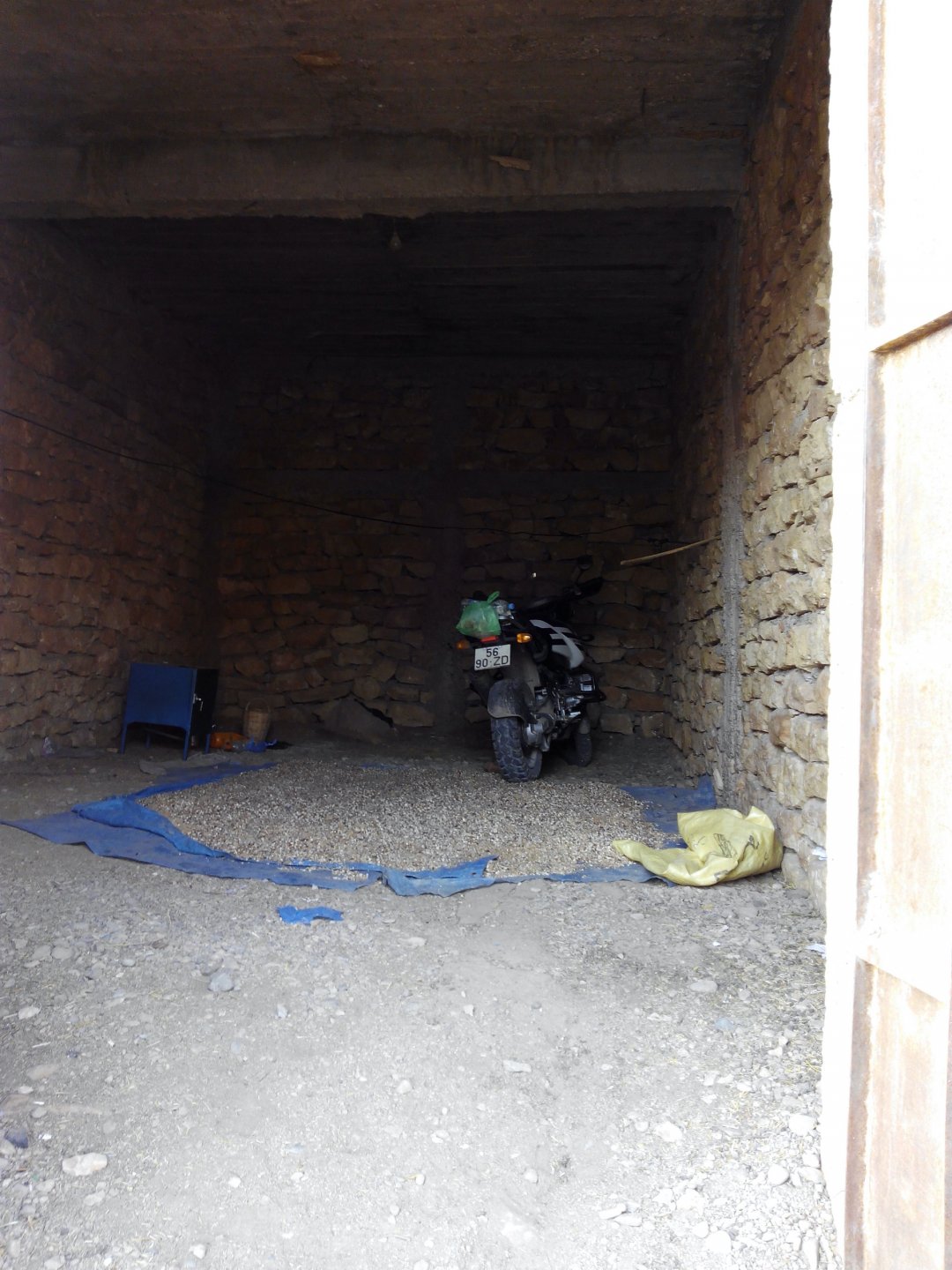 As we were negotiating our way out of the hills, we got properly lost. I had never been somewhere like this, it was obviously mid to high altitude for a Portuguese person's perception, starting to warm up but not desert. A very confusing place to be. Maria couldn't find the road we were on on any internet map, so we stopped to gather our thoughts and have a drink of water. It was here that one of the best social encounters we ever had occurred. As I am marveling in the views, and Maria is trying to get some cell coverage to figure out if we're heading the right direction, someone slowly approaches us, you can see him away in the distance. This man is tending to a few sheep or goats, and as he approaches us to say hello I offer some water. He accepts, and in return invites us to follow him, I park the bike in a way that it is less exposed to traffic and follow him to his home. We were parked less than 100 meters from his home, which was on the cliffside, and didn't even see it. In the picture below you see my bike parked from his place's viewpoint: We didn´t understand a word they said, nor did they understand us. Maria was fluent in french, but that wasn't any good, they didn't even speak arabic, only berber. We were made to sit down, have a drink of water and just hang out a little. Above you see their living and dining room. It was pretty obvious that my water offer got us invited to lunch, and something was being prepared. In the meantime, we just hang out with the grandson who played with a kitten, his mother, and his grandfather, while the grandmother cooked lunch. I don't really know how long it took but eventually we got fed up with having a camera and put it aside except to take a picture of lunch: What you see here above is the best omelette I have ever had, berber style which means it's not folded. In the smaller dish you've got butter almost in liquid form. It was a proper feast, I didn't take a picture of the plate of honey comb they brought as breaking out the camera would have spoilled the mood. It was a great meal, shared by people who don't have much to share. Our hosts eagered us to eat up, while they barely just tasted their own food to check if it was ok. It was a truly humbling experience. After we were done, out came the tea, and after three cups we were finished. As we prepared to leave their niece arrived, she knew french was was able to translate our farewells. I offered my opinel folding knife as a gift and it was well received, but the feeling that no gift was needed was pretty well understood. This had been an amazing experience, had the bike not been parked on the side of a cliff with truck traffic, we might have stayed the night as it was our hosts' intentions. To this day I treasure this memory. Getting back on the bike feeling well fed and refreshed, the scenery started to open up. We made our way through Midelt, and checked in on our hotel for the night. As we rolled in it became clear we came accross Europeans again, both rally enthusiasts and race teams, as well as touring motorcyclists. Although we were looking for some conversation with our fellow travelers, nobody showed up for dinner at the hotel's restaurant, so we entertained ourselves. Dinner is completely out of focus, but it was delicious if lacking for a nice wine. If there is something lacking in Morocco, it's wine. The next day would be a really great one as well.