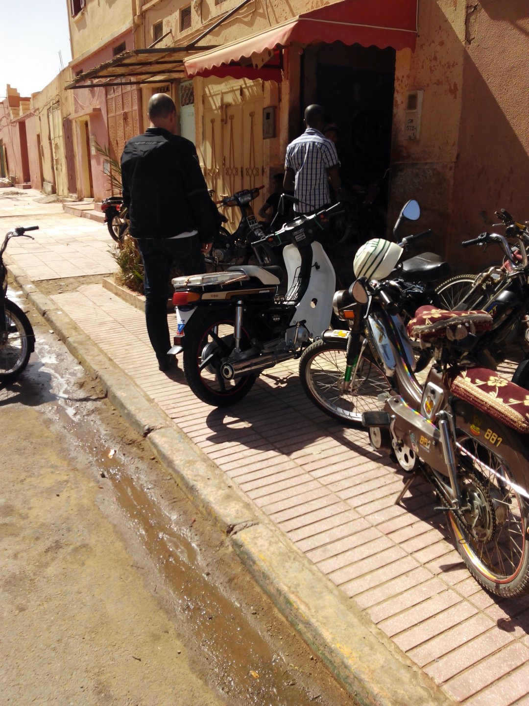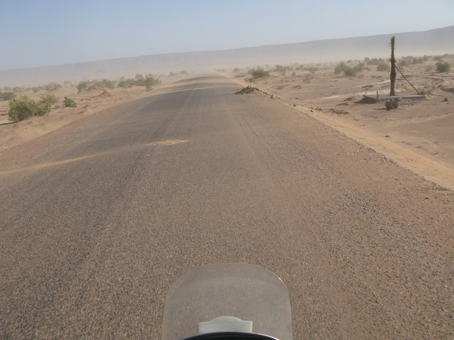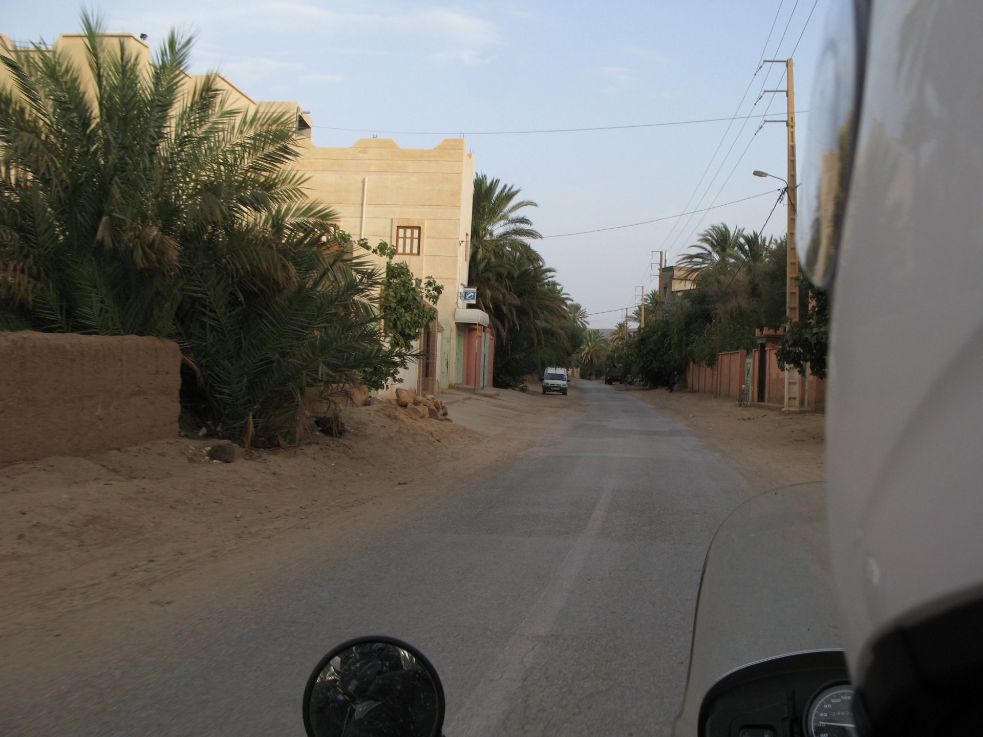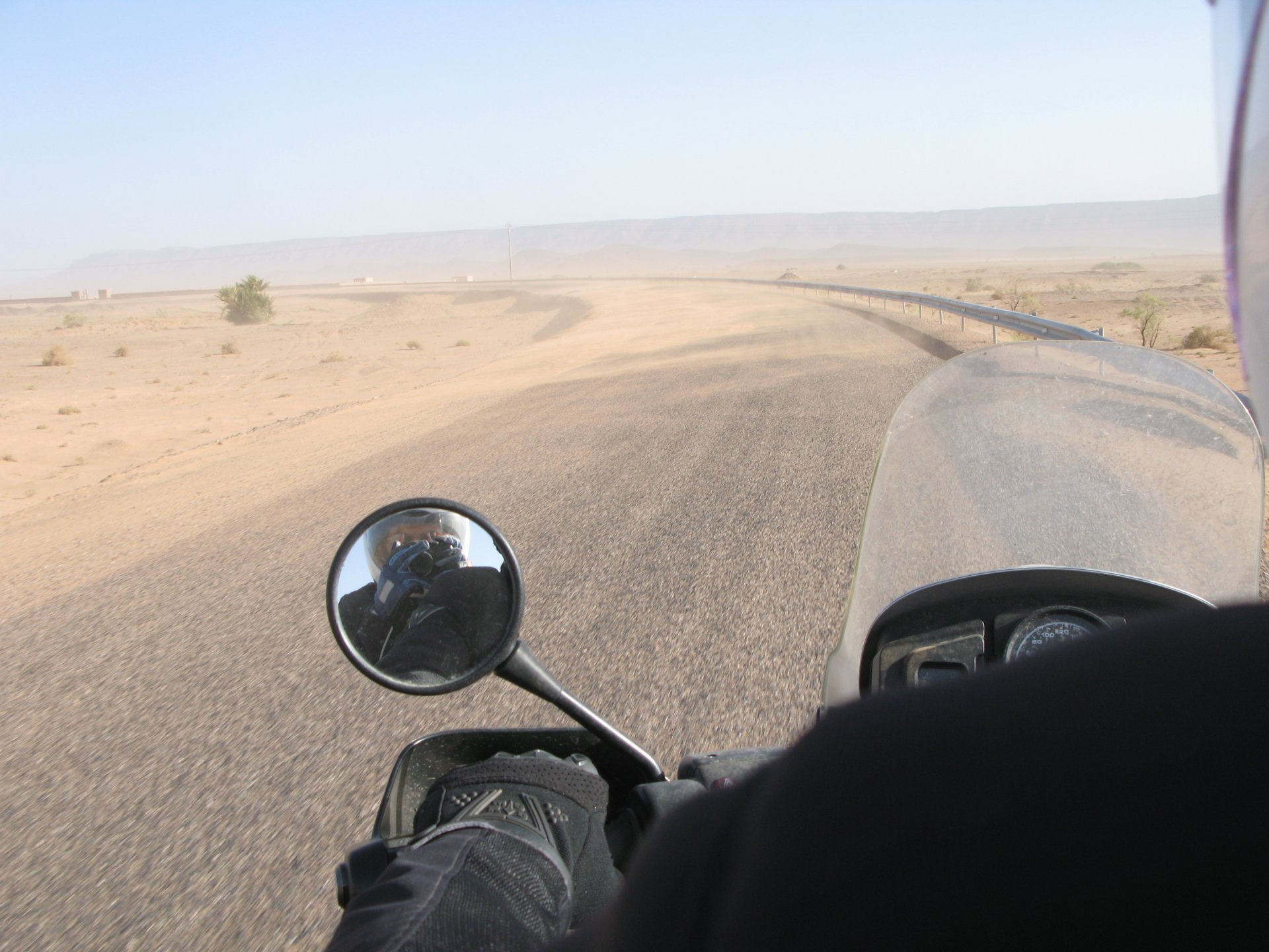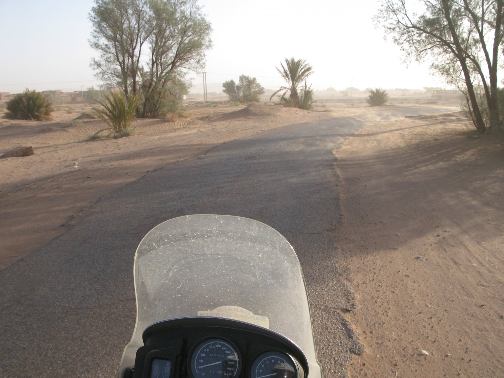 So, leaving the golden dunes of Merzouga, we planned on sleeping on Mhamid. It's only around 400km but the trip would be what I longed for when dreaming of visiting the desert. After a hearty breakfast of Msemmen and lowering my heart beat on colesterol alone, we made way, it was a hot day and you felt it from early on. The rain drops that had fallen two nights before, along with the desert sand, left the bike a mess. Here I'm collecting an acacia thorn, the desert toothpick, and proceeding to stab myself in the finger. Halfway through the morning and we stopped for some tea. One of my favourite things is to sit at a cafe having a tea or coffee, and just allowing the street scene to unfold around you. Carrying on, further on the ride I stop for urination purposes, and take the chance to look at some desert trees. I read before, never park under an Acacia. If you look at the thorns on the pictures before you'll see why. Camels actually put whole branches in the mouths and suck out the leaves. On this stop my spirits drop as we notice an oil leak on the bike. Probably coming from between the engine and gearbox. We were in the middle of nowhere, so decided to press on to Zagora and figure out what to do there. On the way there we stop to check the oil level and Maria documented the occasion with a video. Oil wasn't dropping noticeably, and I realized I didn't have a tool to open the oil filler hole even though I had a full liter of oil in my luggage. That was smart planning! Anyway, on to Zagora! This was a hard road, lots of washboard, had to surf them at 120 for the bike to be livable, it felt like I was breaking it apart. The alternative would be to ride at 30kmh, which was not doable. We make it to Zagora, and stop to take our pictures next to the famous Tombouctou sign Zagora, being a big town and a gateway to the desert, is used to having offroad enthusiasts passing by. A few mechanic shops are here, some of them are used to renting out their facilities to desert racing teams that use this as a base for testing programs. We came accross Mohammed, who received us with a smile and tea. As soon as we walked in his shop Maria noticed the pictures on the wall, and realized she and Mohammed had several friends in common from when she was involved with Baja racing teams and Dakar Rally mechanics. We spent a good while there, just laughing with them. Mohammed was a cool enough dude that i allowed him to put a sticker on my bike Next door, you could have your teeth fixed as well We came away with the oil leak still leaking, but now equipped with a tool to take the filler plug off. So now we had a way of replenishing the oil level if it lowered. I was still unsure if it was engine oil or gearbox oil that was coming out, but since it was on such low quantity we decided to ride on to Mhamid and sleep where we had planned. The ride there would be quite hard but amazing, but not before having a light snack of a little bit of crappy pizza, not worth a picture. From Zagora South, were entering properly dry areas, here water is not a commodity but a luxury. Temperatures we slightly above 40ºC, and the wind was very high, those 100 or 120km felt like 300. Eventually the winds turned into a sand storm and we struggled to keep upright, the road was well visible so we continued. As the wind increased the temperature felt higher as well, which was very weird because you couldn't see the sun and it was almost as dark as night. We felt like we were on Mars but this was an amazing ride that made us appreciate how cool it was to be doing this trip. We got to our hotel exhausted and parked the bike inside the compound next to our room We were asked to be our showers short as there was a severe lack of water in the area. Apparently during most of the year people here only have water pressure on tap for a few hours per day. We went for a walk, and got a few unfriendly looks, presumably because Maria was wearing shorts. Our host took us on a small drive to the dunes in his Land Rover, to whatch the sunset before dinner. We talked a little about the desert and the people there, their way of life and difficulties. Also, we talked how much better life there could be with just minor adjustments like water management. A week after we left there were rain floods and some of those people drowned. Next day we start to head back north and starting our way back home. We still had a lot to see but I hated how the trip started to move back to reality instead of heading towards adventure. Every pore of the road was saturated with fine sand, made for an amazing sight. Stopping for a little water, the bike was a sad state That day, unbeknown to us, Muslims were in celebration. We thought it was weird when we first started noticing slaughtered lambs outside people's homes and made for a little uneasiness, only to be explained at night on our next hotel. Brief stop for lunch, I think in Ouarzazate Ouarzazate is a major city in the area, it is mostly known for its ties with Hollywood, it's got cinema studios and is a base for whenever you need a western setting, or generic middle eastern or desert film location. It's also a little without character and didn't appeal. We moved on. That evening we stayed at a small family owned auberge, we shared a few travel stories and they did as well having travelled all over Morocco in a Fiat Uno. We were served delicious tea upon arrival and Maria made friends with the little girl Owner's runaround moped, it's seen things and been places: Dinner was enjoyed on the rooftop, she's not very impressed with my photography skills A nice night's sleep was had