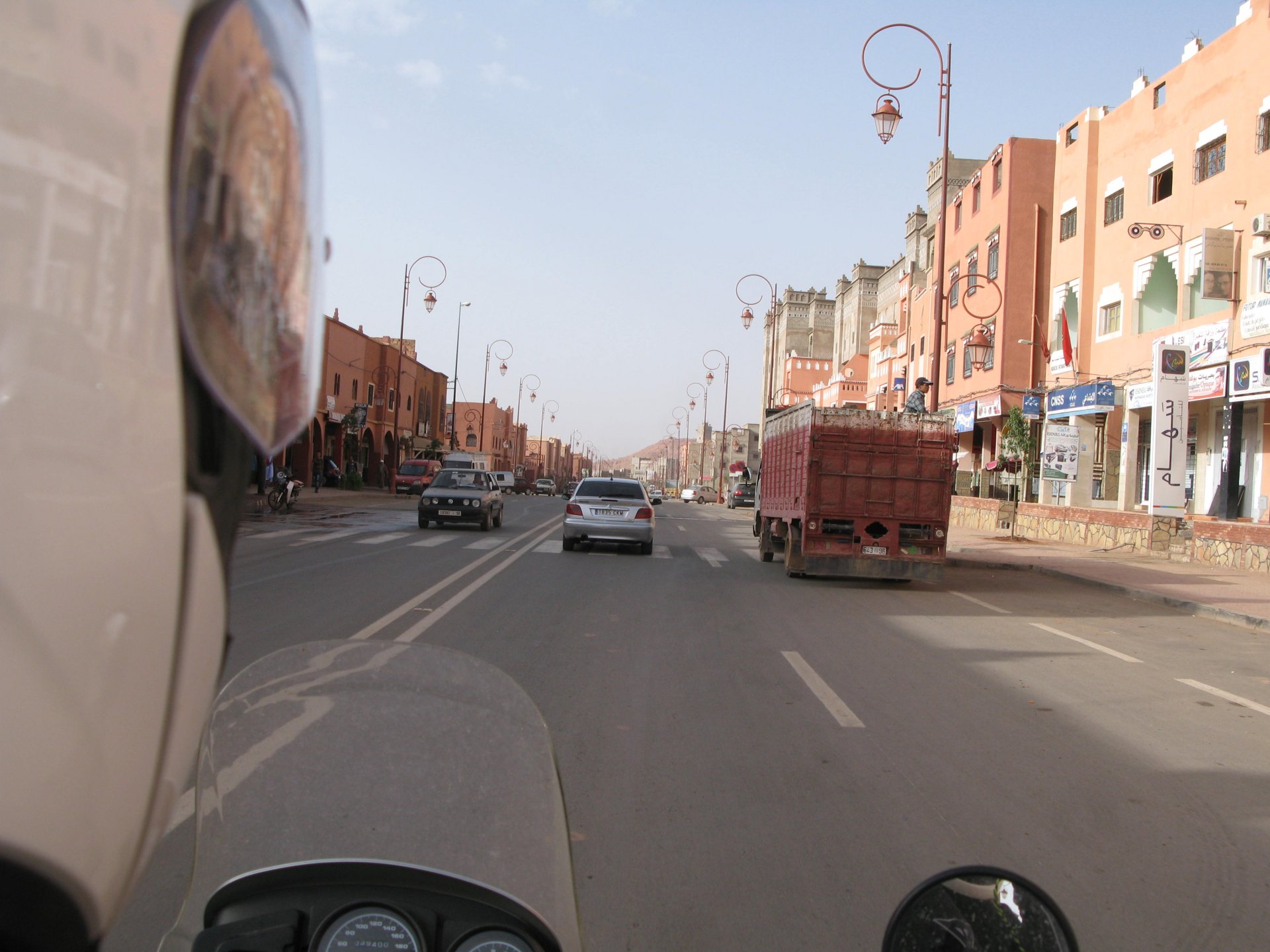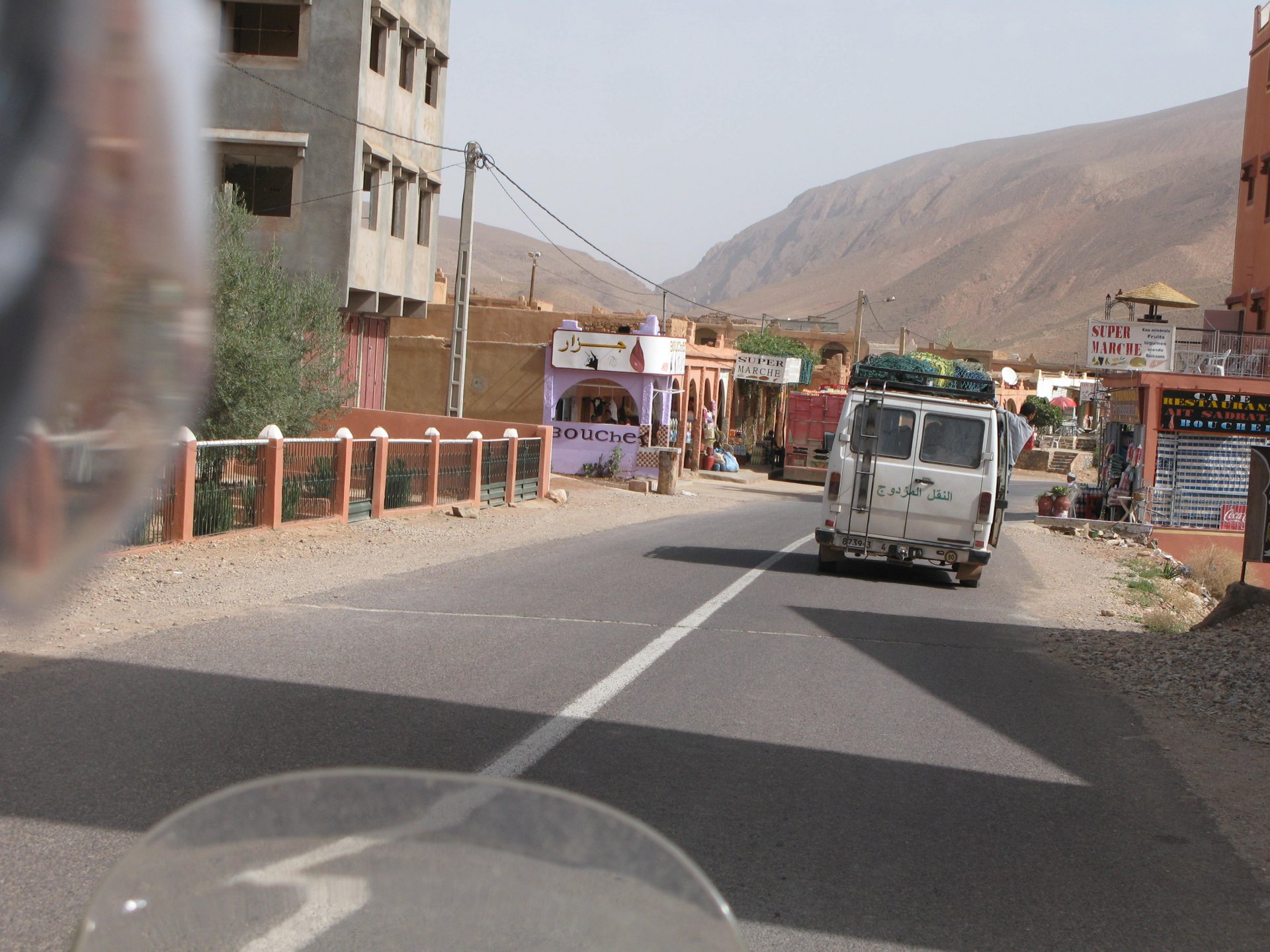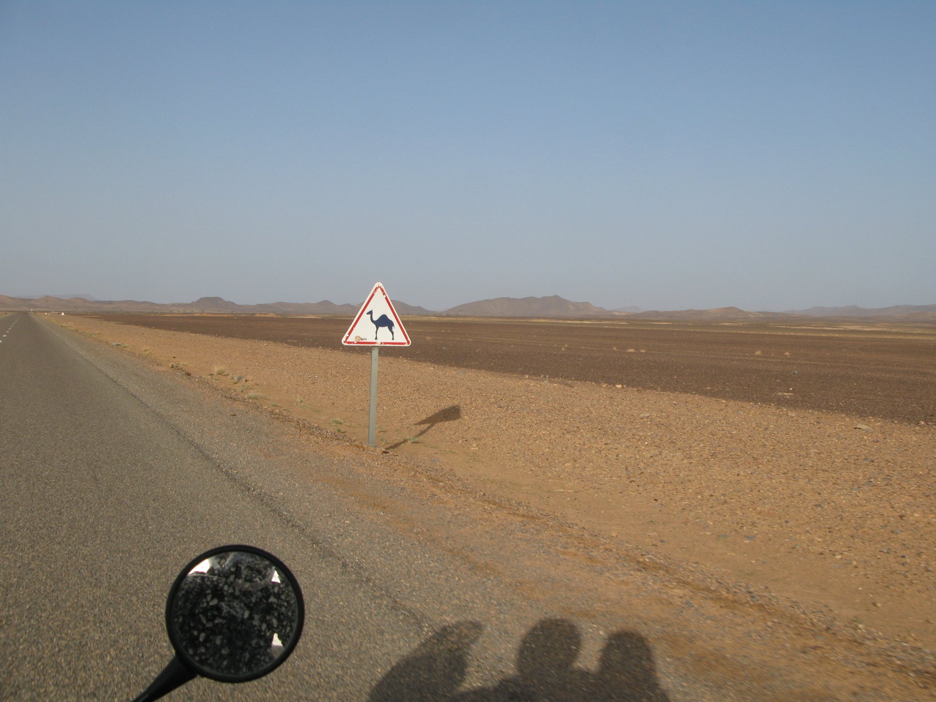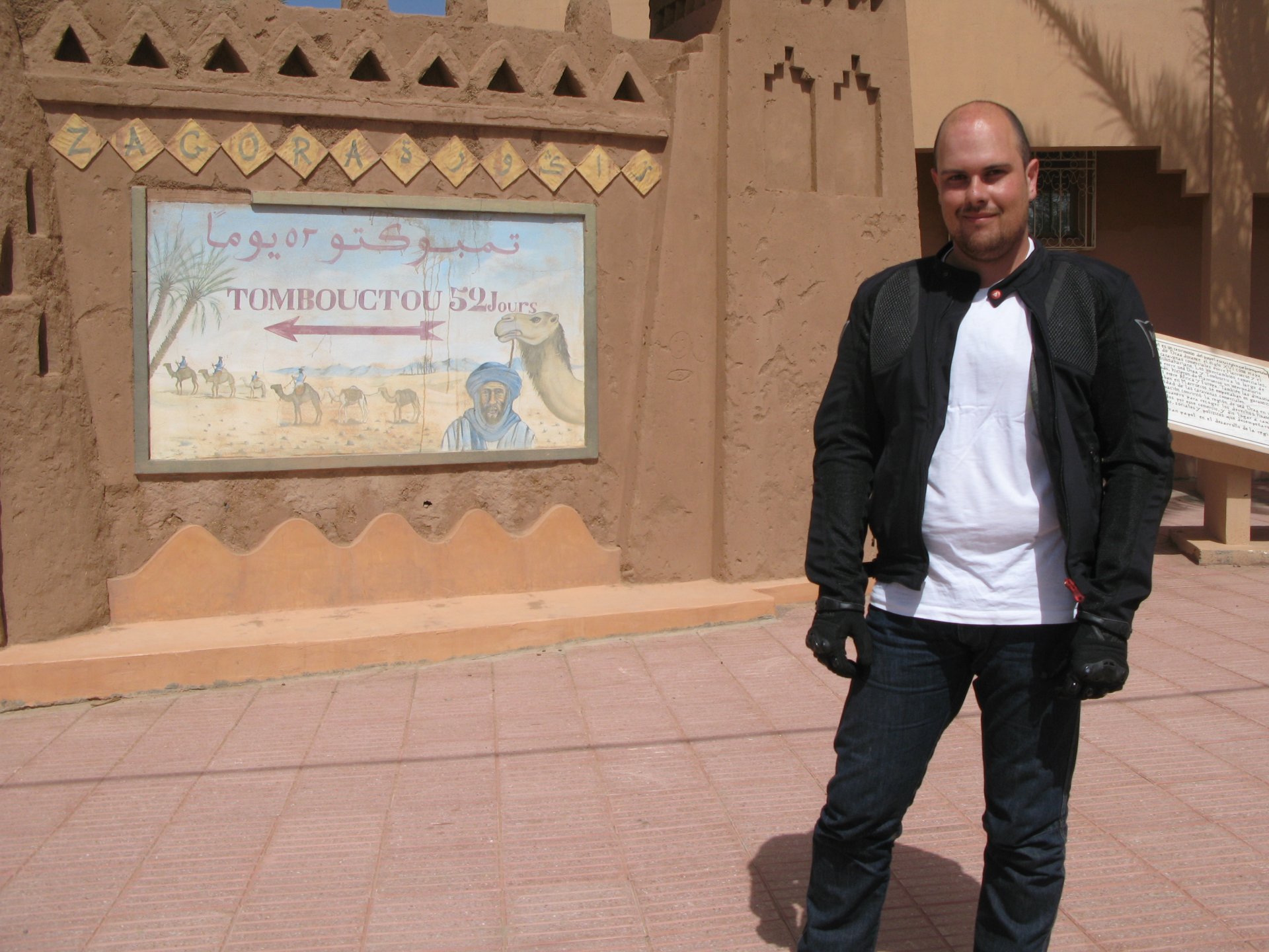 So, leaving the golden dunes of Merzouga, we planned on sleeping on Mhamid. It's only around 400km but the trip would be what I longed for when dreaming of visiting the desert. After a hearty breakfast of Msemmen and lowering my heart beat on colesterol alone, we made way, it was a hot day and you felt it from early on. The rain drops that had fallen two nights before, along with the desert sand, left the bike a mess. Here I'm collecting an acacia thorn, the desert toothpick, and proceeding to stab myself in the finger. Halfway through the morning and we stopped for some tea. One of my favourite things is to sit at a cafe having a tea or coffee, and just allowing the street scene to unfold around you. Carrying on, further on the ride I stop for urination purposes, and take the chance to look at some desert trees. I read before, never park under an Acacia. If you look at the thorns on the pictures before you'll see why. Camels actually put whole branches in the mouths and suck out the leaves. On this stop my spirits drop as we notice an oil leak on the bike. Probably coming from between the engine and gearbox. We were in the middle of nowhere, so decided to press on to Zagora and figure out what to do there. On the way there we stop to check the oil level and Maria documented the occasion with a video. Oil wasn't dropping noticeably, and I realized I didn't have a tool to open the oil filler hole even though I had a full liter of oil in my luggage. That was smart planning! Anyway, on to Zagora! This was a hard road, lots of washboard, had to surf them at 120 for the bike to be livable, it felt like I was breaking it apart. The alternative would be to ride at 30kmh, which was not doable. We make it to Zagora, and stop to take our pictures next to the famous Tombouctou sign Zagora, being a big town and a gateway to the desert, is used to having offroad enthusiasts passing by. A few mechanic shops are here, some of them are used to renting out their facilities to desert racing teams that use this as a base for testing programs. We came accross Mohammed, who received us with a smile and tea. As soon as we walked in his shop Maria noticed the pictures on the wall, and realized she and Mohammed had several friends in common from when she was involved with Baja racing teams and Dakar Rally mechanics. We spent a good while there, just laughing with them. Mohammed was a cool enough dude that i allowed him to put a sticker on my bike Next door, you could have your teeth fixed as well We came away with the oil leak still leaking, but now equipped with a tool to take the filler plug off. So now we had a way of replenishing the oil level if it lowered. I was still unsure if it was engine oil or gearbox oil that was coming out, but since it was on such low quantity we decided to ride on to Mhamid and sleep where we had planned. The ride there would be quite hard but amazing, but not before having a light snack of a little bit of crappy pizza, not worth a picture. From Zagora South, were entering properly dry areas, here water is not a commodity but a luxury. Temperatures we slightly above 40ºC, and the wind was very high, those 100 or 120km felt like 300. Eventually the winds turned into a sand storm and we struggled to keep upright, the road was well visible so we continued. As the wind increased the temperature felt higher as well, which was very weird because you couldn't see the sun and it was almost as dark as night. We felt like we were on Mars but this was an amazing ride that made us appreciate how cool it was to be doing this trip. We got to our hotel exhausted and parked the bike inside the compound next to our room We were asked to be our showers short as there was a severe lack of water in the area. Apparently during most of the year people here only have water pressure on tap for a few hours per day. We went for a walk, and got a few unfriendly looks, presumably because Maria was wearing shorts. Our host took us on a small drive to the dunes in his Land Rover, to whatch the sunset before dinner. We talked a little about the desert and the people there, their way of life and difficulties. Also, we talked how much better life there could be with just minor adjustments like water management. A week after we left there were rain floods and some of those people drowned. Next day we start to head back north and starting our way back home. We still had a lot to see but I hated how the trip started to move back to reality instead of heading towards adventure. Every pore of the road was saturated with fine sand, made for an amazing sight. Stopping for a little water, the bike was a sad state That day, unbeknown to us, Muslims were in celebration. We thought it was weird when we first started noticing slaughtered lambs outside people's homes and made for a little uneasiness, only to be explained at night on our next hotel. Brief stop for lunch, I think in Ouarzazate Ouarzazate is a major city in the area, it is mostly known for its ties with Hollywood, it's got cinema studios and is a base for whenever you need a western setting, or generic middle eastern or desert film location. It's also a little without character and didn't appeal. We moved on. That evening we stayed at a small family owned auberge, we shared a few travel stories and they did as well having travelled all over Morocco in a Fiat Uno. We were served delicious tea upon arrival and Maria made friends with the little girl Owner's runaround moped, it's seen things and been places: Dinner was enjoyed on the rooftop, she's not very impressed with my photography skills A nice night's sleep was had