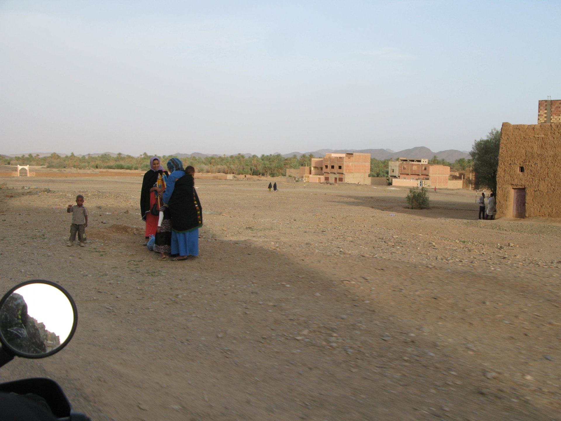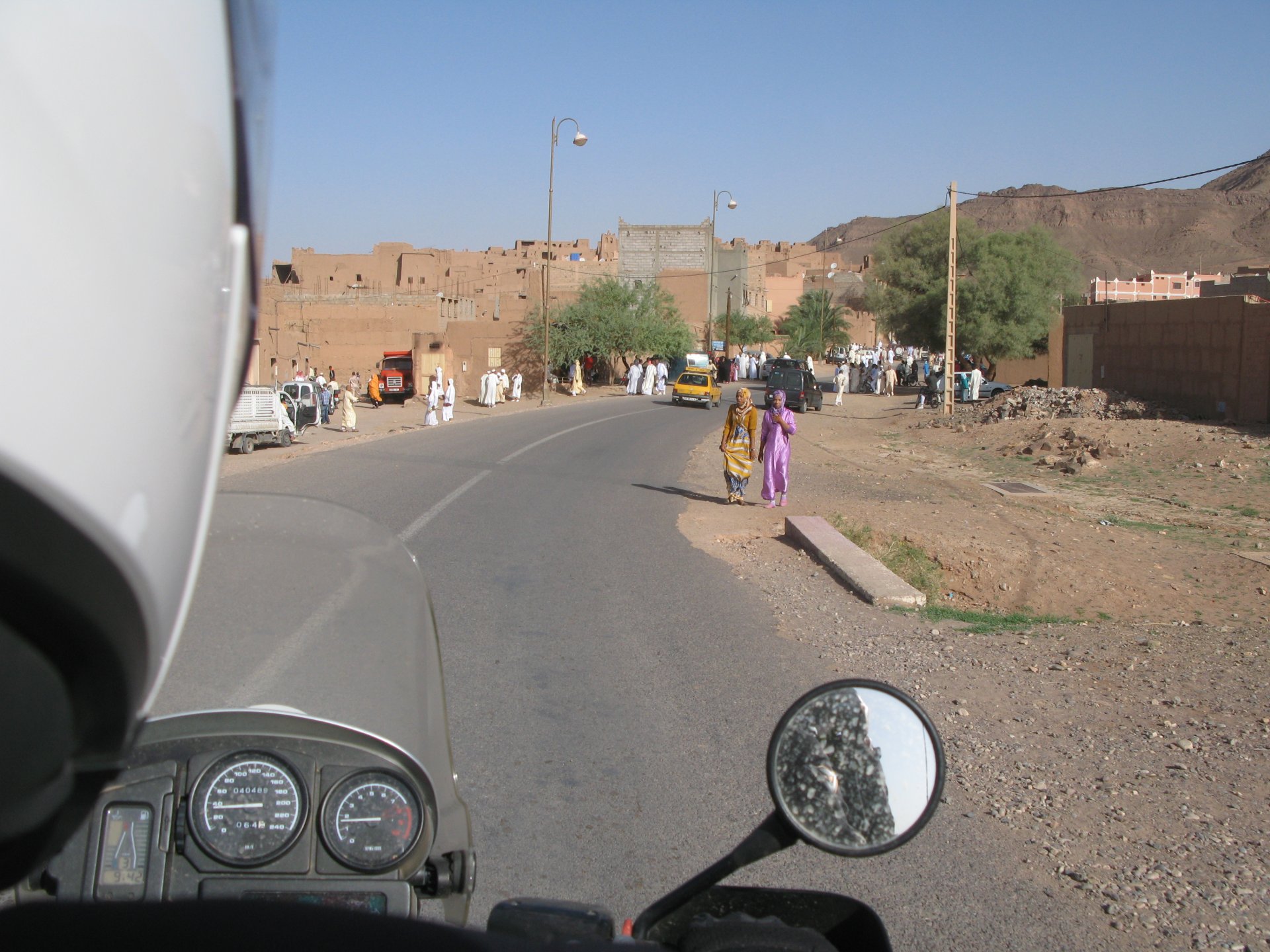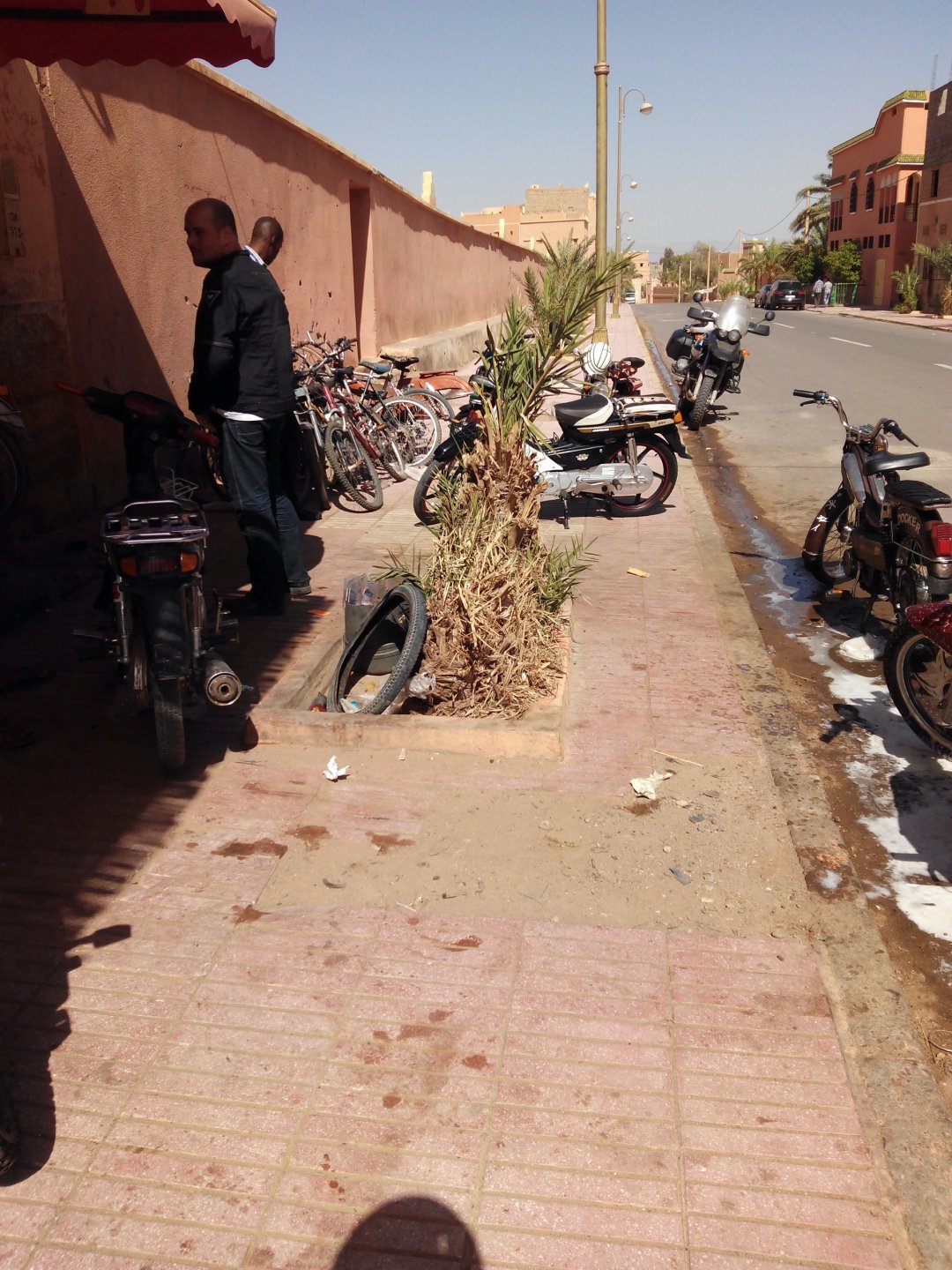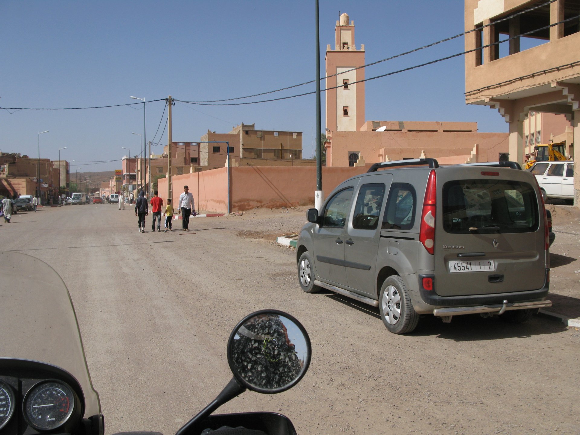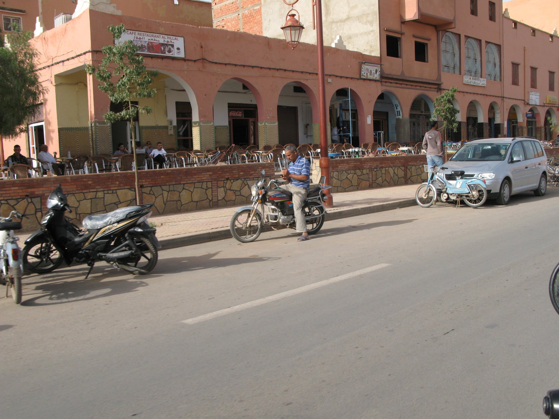 So, leaving the golden dunes of Merzouga, we planned on sleeping on Mhamid. It's only around 400km but the trip would be what I longed for when dreaming of visiting the desert. After a hearty breakfast of Msemmen and lowering my heart beat on colesterol alone, we made way, it was a hot day and you felt it from early on. The rain drops that had fallen two nights before, along with the desert sand, left the bike a mess. Here I'm collecting an acacia thorn, the desert toothpick, and proceeding to stab myself in the finger. Halfway through the morning and we stopped for some tea. One of my favourite things is to sit at a cafe having a tea or coffee, and just allowing the street scene to unfold around you. Carrying on, further on the ride I stop for urination purposes, and take the chance to look at some desert trees. I read before, never park under an Acacia. If you look at the thorns on the pictures before you'll see why. Camels actually put whole branches in the mouths and suck out the leaves. On this stop my spirits drop as we notice an oil leak on the bike. Probably coming from between the engine and gearbox. We were in the middle of nowhere, so decided to press on to Zagora and figure out what to do there. On the way there we stop to check the oil level and Maria documented the occasion with a video. Oil wasn't dropping noticeably, and I realized I didn't have a tool to open the oil filler hole even though I had a full liter of oil in my luggage. That was smart planning! Anyway, on to Zagora! This was a hard road, lots of washboard, had to surf them at 120 for the bike to be livable, it felt like I was breaking it apart. The alternative would be to ride at 30kmh, which was not doable. We make it to Zagora, and stop to take our pictures next to the famous Tombouctou sign Zagora, being a big town and a gateway to the desert, is used to having offroad enthusiasts passing by. A few mechanic shops are here, some of them are used to renting out their facilities to desert racing teams that use this as a base for testing programs. We came accross Mohammed, who received us with a smile and tea. As soon as we walked in his shop Maria noticed the pictures on the wall, and realized she and Mohammed had several friends in common from when she was involved with Baja racing teams and Dakar Rally mechanics. We spent a good while there, just laughing with them. Mohammed was a cool enough dude that i allowed him to put a sticker on my bike Next door, you could have your teeth fixed as well We came away with the oil leak still leaking, but now equipped with a tool to take the filler plug off. So now we had a way of replenishing the oil level if it lowered. I was still unsure if it was engine oil or gearbox oil that was coming out, but since it was on such low quantity we decided to ride on to Mhamid and sleep where we had planned. The ride there would be quite hard but amazing, but not before having a light snack of a little bit of crappy pizza, not worth a picture. From Zagora South, were entering properly dry areas, here water is not a commodity but a luxury. Temperatures we slightly above 40ºC, and the wind was very high, those 100 or 120km felt like 300. Eventually the winds turned into a sand storm and we struggled to keep upright, the road was well visible so we continued. As the wind increased the temperature felt higher as well, which was very weird because you couldn't see the sun and it was almost as dark as night. We felt like we were on Mars but this was an amazing ride that made us appreciate how cool it was to be doing this trip. We got to our hotel exhausted and parked the bike inside the compound next to our room We were asked to be our showers short as there was a severe lack of water in the area. Apparently during most of the year people here only have water pressure on tap for a few hours per day. We went for a walk, and got a few unfriendly looks, presumably because Maria was wearing shorts. Our host took us on a small drive to the dunes in his Land Rover, to whatch the sunset before dinner. We talked a little about the desert and the people there, their way of life and difficulties. Also, we talked how much better life there could be with just minor adjustments like water management. A week after we left there were rain floods and some of those people drowned. Next day we start to head back north and starting our way back home. We still had a lot to see but I hated how the trip started to move back to reality instead of heading towards adventure. Every pore of the road was saturated with fine sand, made for an amazing sight. Stopping for a little water, the bike was a sad state That day, unbeknown to us, Muslims were in celebration. We thought it was weird when we first started noticing slaughtered lambs outside people's homes and made for a little uneasiness, only to be explained at night on our next hotel. Brief stop for lunch, I think in Ouarzazate Ouarzazate is a major city in the area, it is mostly known for its ties with Hollywood, it's got cinema studios and is a base for whenever you need a western setting, or generic middle eastern or desert film location. It's also a little without character and didn't appeal. We moved on. That evening we stayed at a small family owned auberge, we shared a few travel stories and they did as well having travelled all over Morocco in a Fiat Uno. We were served delicious tea upon arrival and Maria made friends with the little girl Owner's runaround moped, it's seen things and been places: Dinner was enjoyed on the rooftop, she's not very impressed with my photography skills A nice night's sleep was had