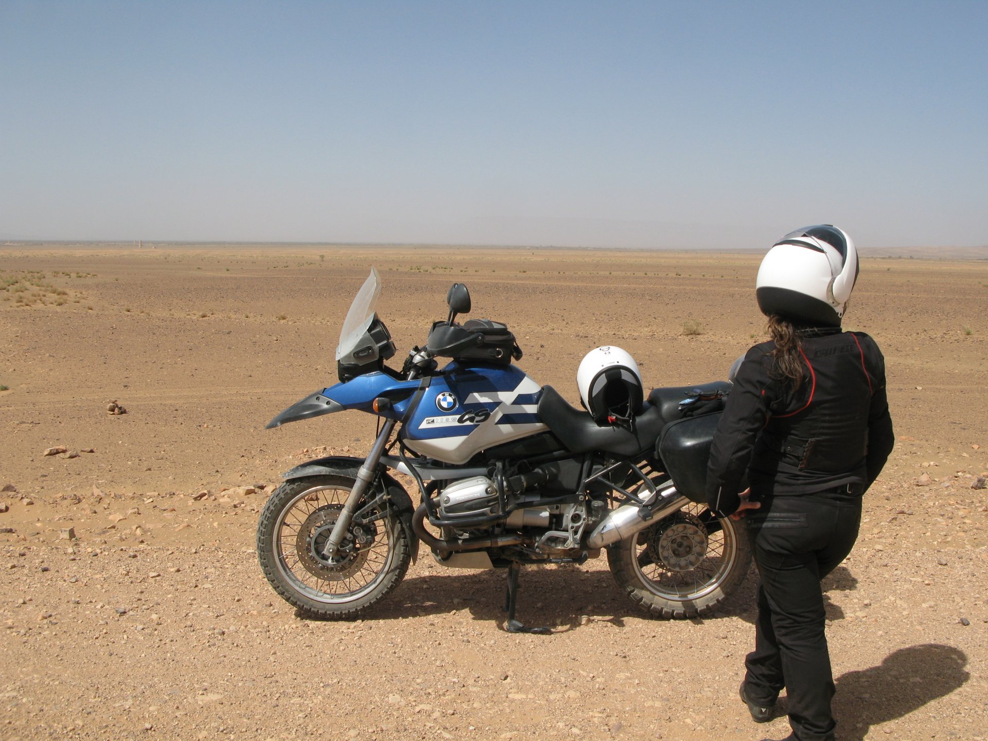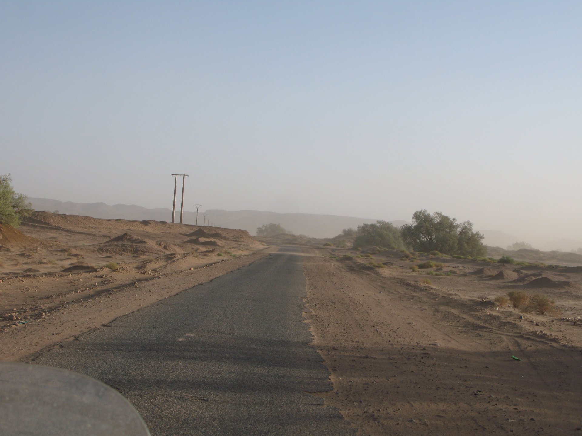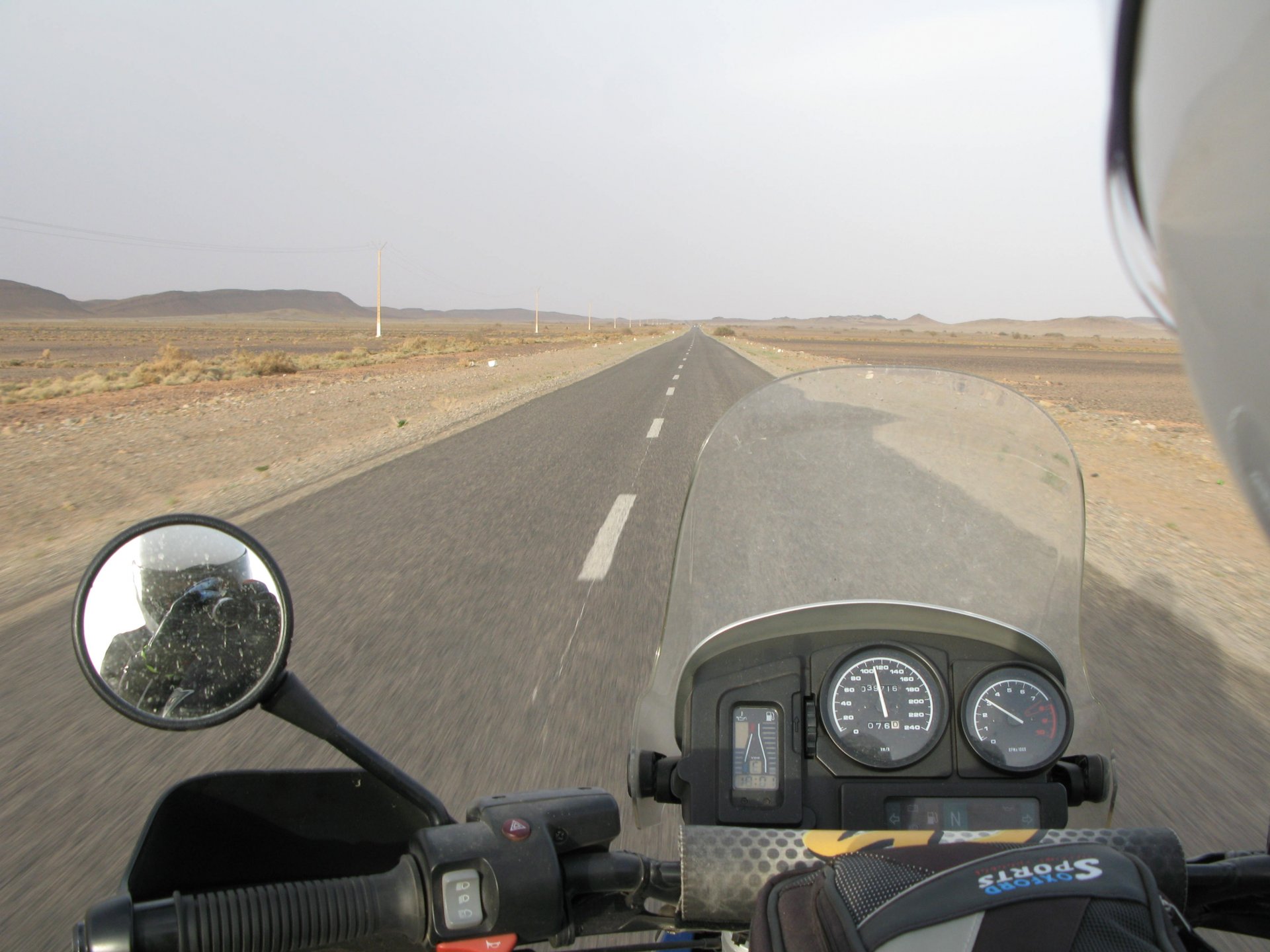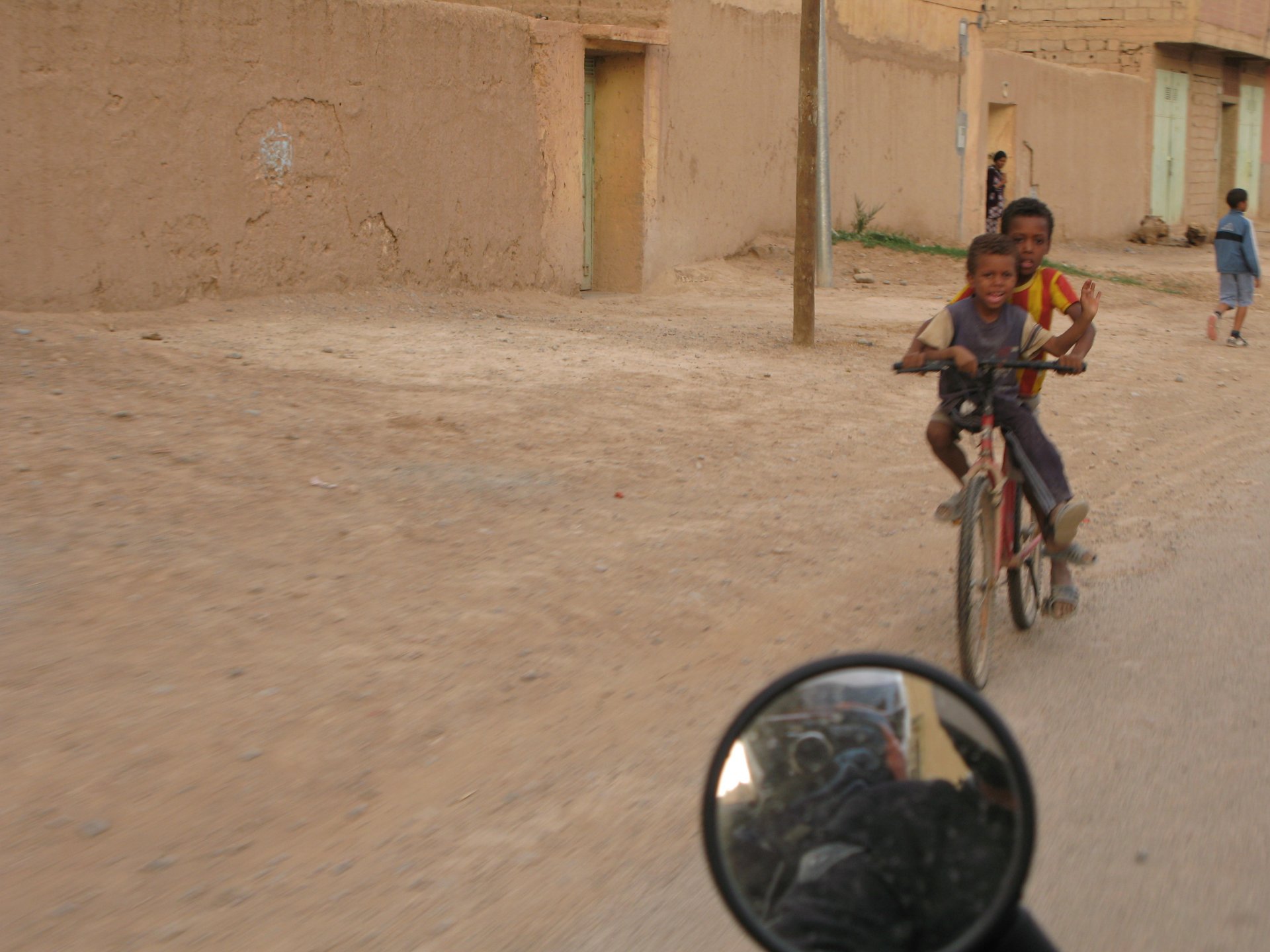 So, leaving the golden dunes of Merzouga, we planned on sleeping on Mhamid. It's only around 400km but the trip would be what I longed for when dreaming of visiting the desert. After a hearty breakfast of Msemmen and lowering my heart beat on colesterol alone, we made way, it was a hot day and you felt it from early on. The rain drops that had fallen two nights before, along with the desert sand, left the bike a mess. Here I'm collecting an acacia thorn, the desert toothpick, and proceeding to stab myself in the finger. Halfway through the morning and we stopped for some tea. One of my favourite things is to sit at a cafe having a tea or coffee, and just allowing the street scene to unfold around you. Carrying on, further on the ride I stop for urination purposes, and take the chance to look at some desert trees. I read before, never park under an Acacia. If you look at the thorns on the pictures before you'll see why. Camels actually put whole branches in the mouths and suck out the leaves. On this stop my spirits drop as we notice an oil leak on the bike. Probably coming from between the engine and gearbox. We were in the middle of nowhere, so decided to press on to Zagora and figure out what to do there. On the way there we stop to check the oil level and Maria documented the occasion with a video. Oil wasn't dropping noticeably, and I realized I didn't have a tool to open the oil filler hole even though I had a full liter of oil in my luggage. That was smart planning! Anyway, on to Zagora! This was a hard road, lots of washboard, had to surf them at 120 for the bike to be livable, it felt like I was breaking it apart. The alternative would be to ride at 30kmh, which was not doable. We make it to Zagora, and stop to take our pictures next to the famous Tombouctou sign Zagora, being a big town and a gateway to the desert, is used to having offroad enthusiasts passing by. A few mechanic shops are here, some of them are used to renting out their facilities to desert racing teams that use this as a base for testing programs. We came accross Mohammed, who received us with a smile and tea. As soon as we walked in his shop Maria noticed the pictures on the wall, and realized she and Mohammed had several friends in common from when she was involved with Baja racing teams and Dakar Rally mechanics. We spent a good while there, just laughing with them. Mohammed was a cool enough dude that i allowed him to put a sticker on my bike Next door, you could have your teeth fixed as well We came away with the oil leak still leaking, but now equipped with a tool to take the filler plug off. So now we had a way of replenishing the oil level if it lowered. I was still unsure if it was engine oil or gearbox oil that was coming out, but since it was on such low quantity we decided to ride on to Mhamid and sleep where we had planned. The ride there would be quite hard but amazing, but not before having a light snack of a little bit of crappy pizza, not worth a picture. From Zagora South, were entering properly dry areas, here water is not a commodity but a luxury. Temperatures we slightly above 40ºC, and the wind was very high, those 100 or 120km felt like 300. Eventually the winds turned into a sand storm and we struggled to keep upright, the road was well visible so we continued. As the wind increased the temperature felt higher as well, which was very weird because you couldn't see the sun and it was almost as dark as night. We felt like we were on Mars but this was an amazing ride that made us appreciate how cool it was to be doing this trip. We got to our hotel exhausted and parked the bike inside the compound next to our room We were asked to be our showers short as there was a severe lack of water in the area. Apparently during most of the year people here only have water pressure on tap for a few hours per day. We went for a walk, and got a few unfriendly looks, presumably because Maria was wearing shorts. Our host took us on a small drive to the dunes in his Land Rover, to whatch the sunset before dinner. We talked a little about the desert and the people there, their way of life and difficulties. Also, we talked how much better life there could be with just minor adjustments like water management. A week after we left there were rain floods and some of those people drowned. Next day we start to head back north and starting our way back home. We still had a lot to see but I hated how the trip started to move back to reality instead of heading towards adventure. Every pore of the road was saturated with fine sand, made for an amazing sight. Stopping for a little water, the bike was a sad state That day, unbeknown to us, Muslims were in celebration. We thought it was weird when we first started noticing slaughtered lambs outside people's homes and made for a little uneasiness, only to be explained at night on our next hotel. Brief stop for lunch, I think in Ouarzazate Ouarzazate is a major city in the area, it is mostly known for its ties with Hollywood, it's got cinema studios and is a base for whenever you need a western setting, or generic middle eastern or desert film location. It's also a little without character and didn't appeal. We moved on. That evening we stayed at a small family owned auberge, we shared a few travel stories and they did as well having travelled all over Morocco in a Fiat Uno. We were served delicious tea upon arrival and Maria made friends with the little girl Owner's runaround moped, it's seen things and been places: Dinner was enjoyed on the rooftop, she's not very impressed with my photography skills A nice night's sleep was had
