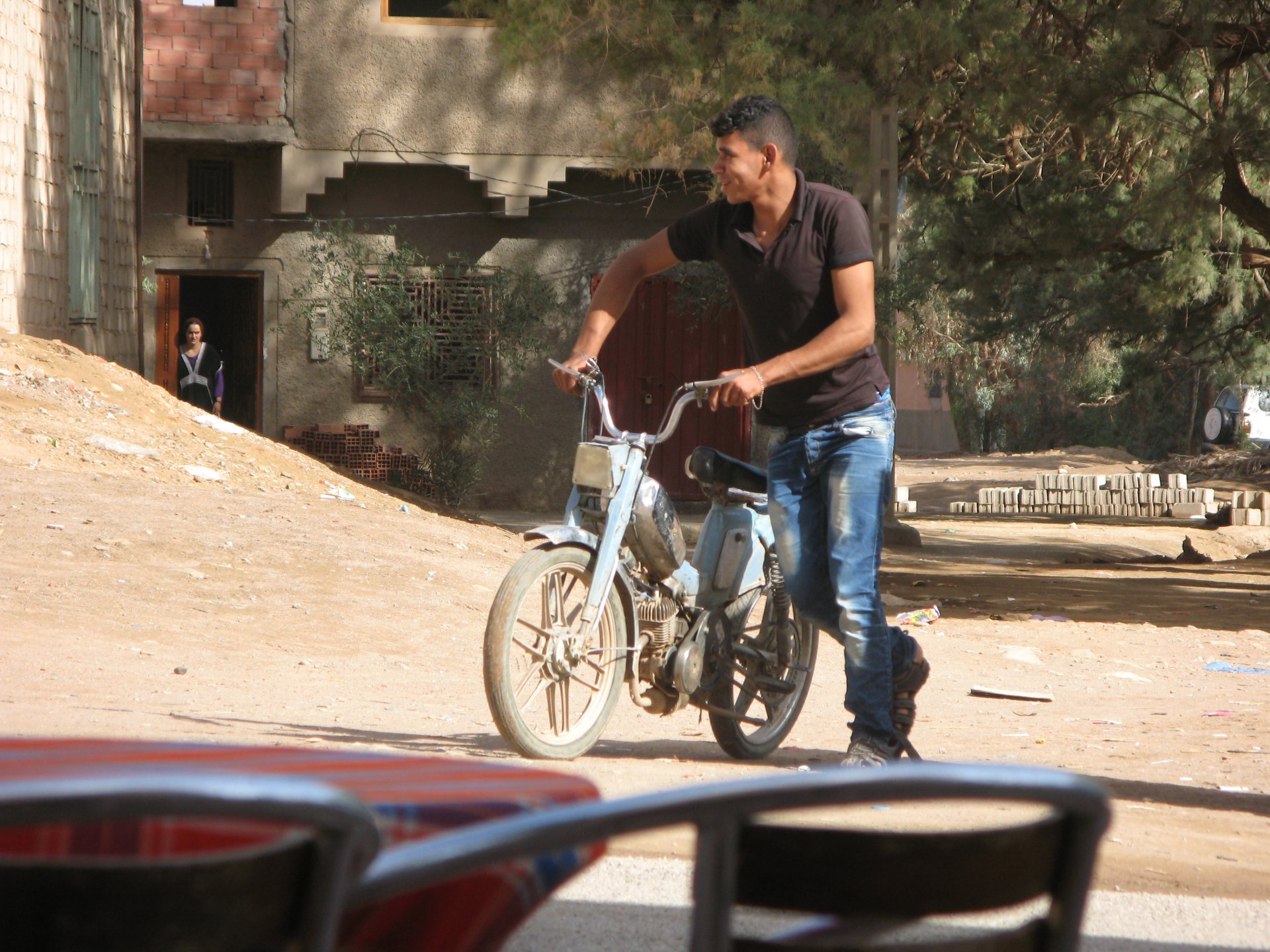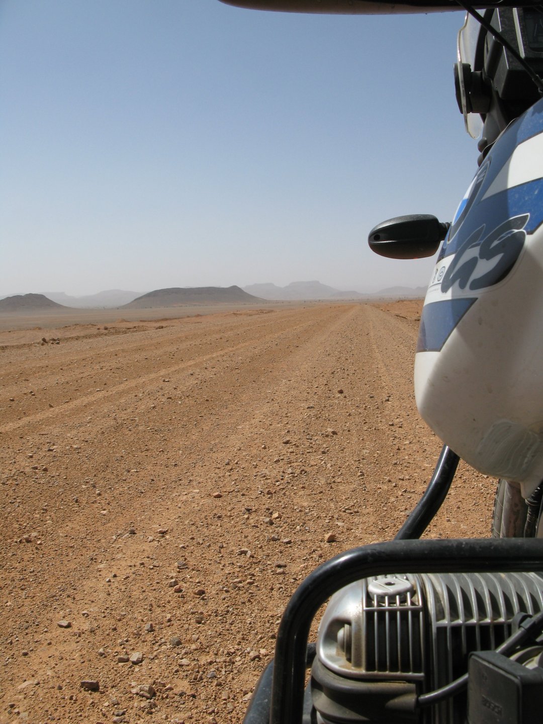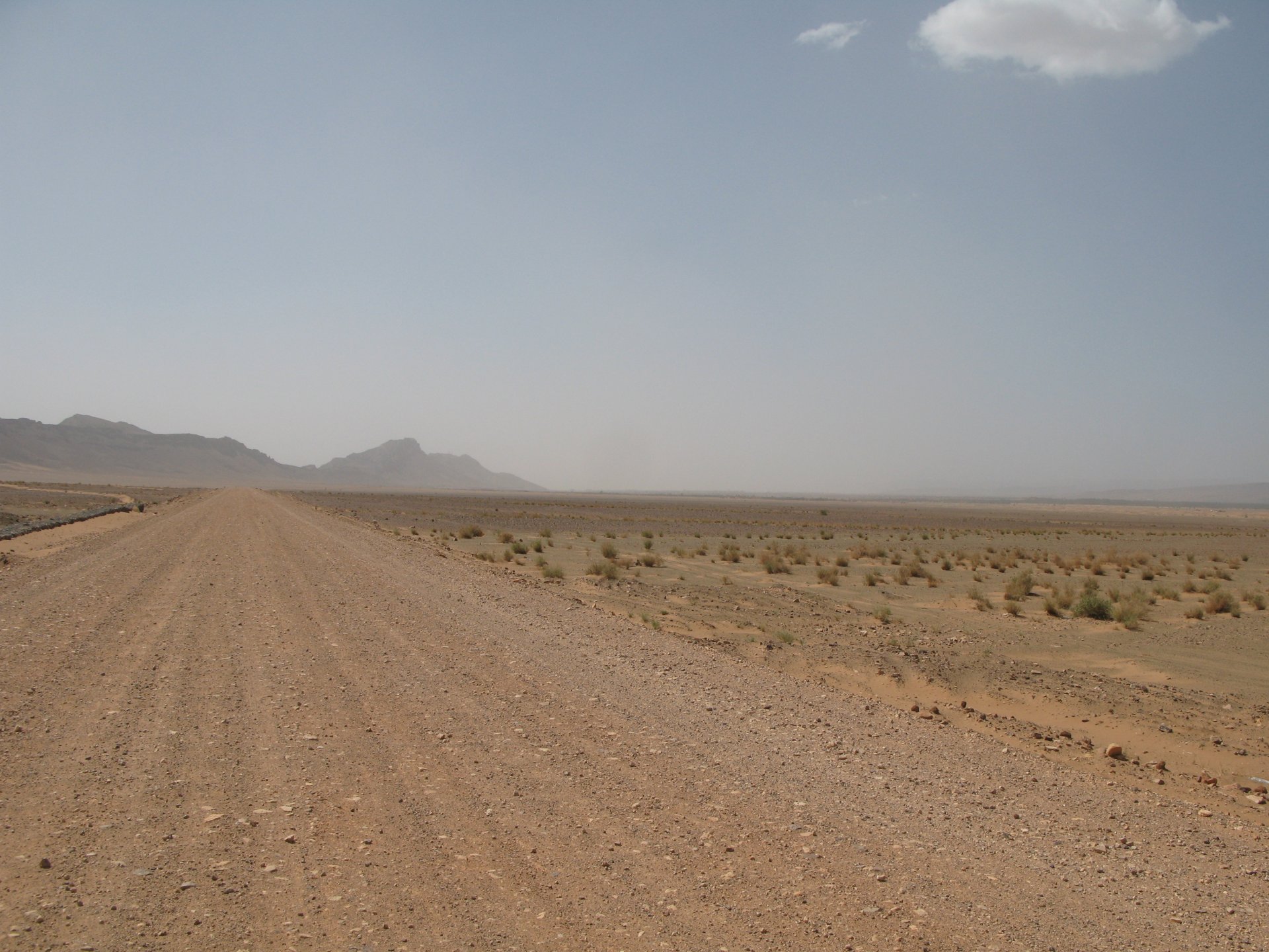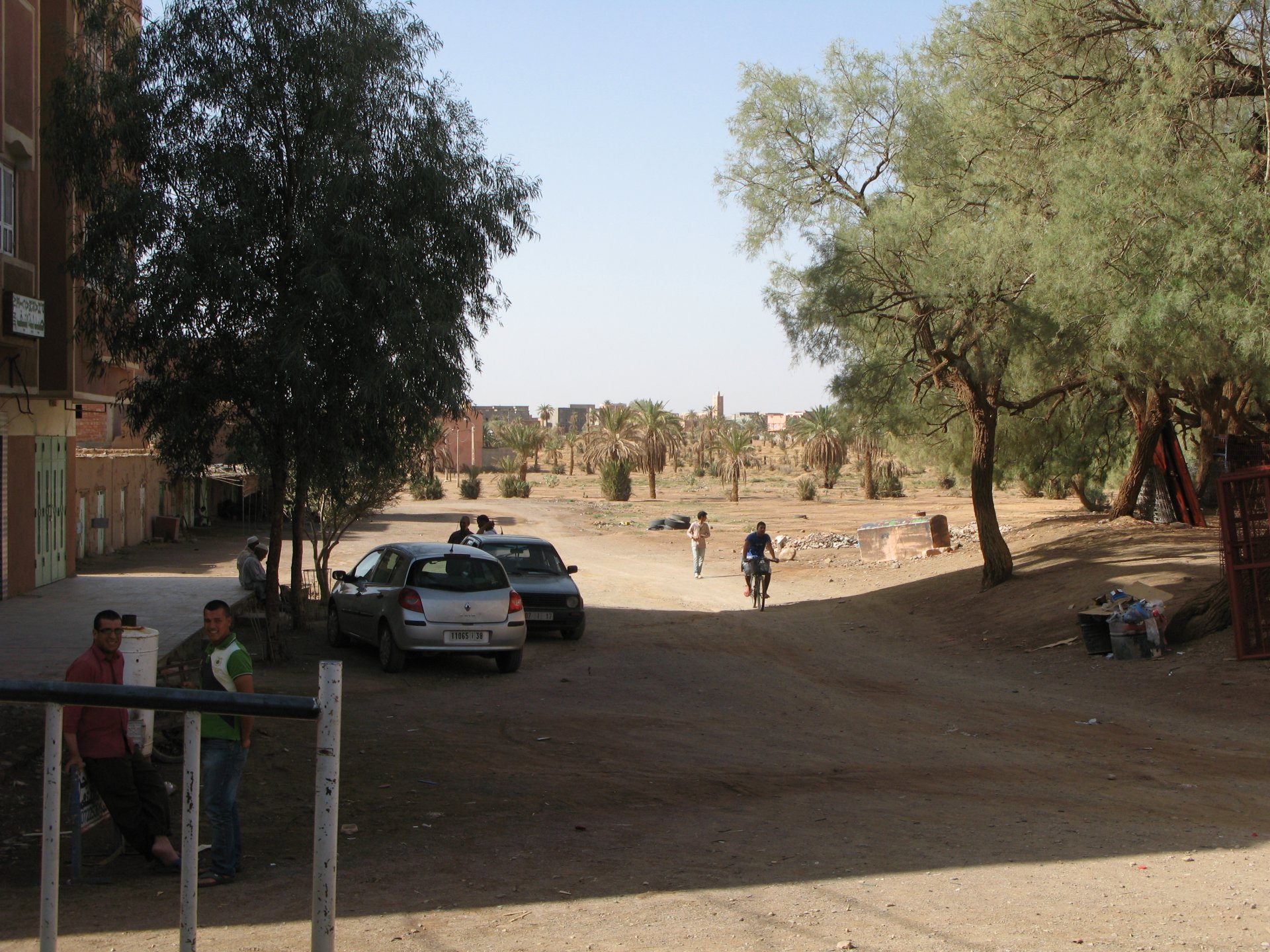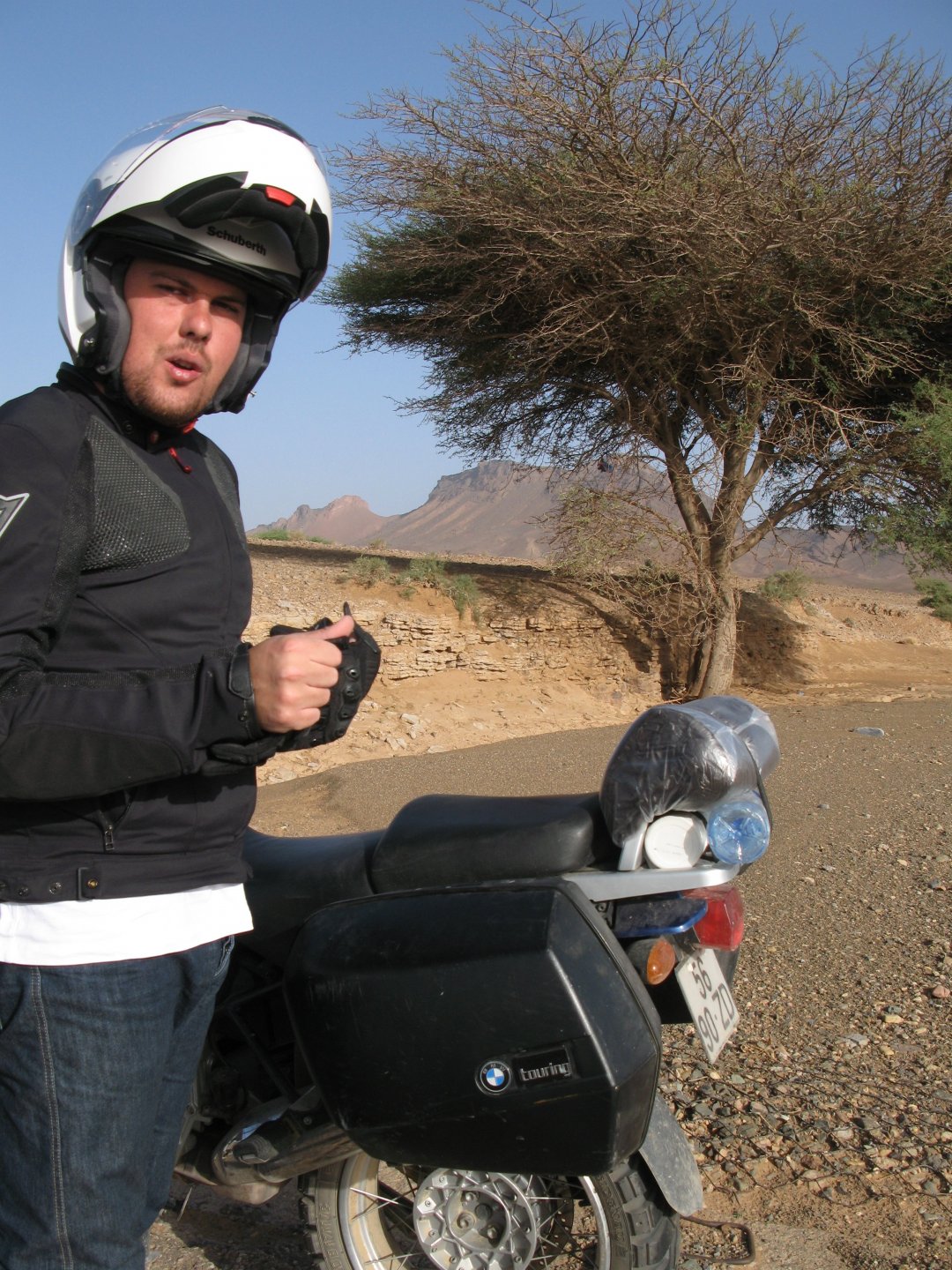 So, leaving the golden dunes of Merzouga, we planned on sleeping on Mhamid. It's only around 400km but the trip would be what I longed for when dreaming of visiting the desert. After a hearty breakfast of Msemmen and lowering my heart beat on colesterol alone, we made way, it was a hot day and you felt it from early on. The rain drops that had fallen two nights before, along with the desert sand, left the bike a mess. Here I'm collecting an acacia thorn, the desert toothpick, and proceeding to stab myself in the finger. Halfway through the morning and we stopped for some tea. One of my favourite things is to sit at a cafe having a tea or coffee, and just allowing the street scene to unfold around you. Carrying on, further on the ride I stop for urination purposes, and take the chance to look at some desert trees. I read before, never park under an Acacia. If you look at the thorns on the pictures before you'll see why. Camels actually put whole branches in the mouths and suck out the leaves. On this stop my spirits drop as we notice an oil leak on the bike. Probably coming from between the engine and gearbox. We were in the middle of nowhere, so decided to press on to Zagora and figure out what to do there. On the way there we stop to check the oil level and Maria documented the occasion with a video. Oil wasn't dropping noticeably, and I realized I didn't have a tool to open the oil filler hole even though I had a full liter of oil in my luggage. That was smart planning! Anyway, on to Zagora! This was a hard road, lots of washboard, had to surf them at 120 for the bike to be livable, it felt like I was breaking it apart. The alternative would be to ride at 30kmh, which was not doable. We make it to Zagora, and stop to take our pictures next to the famous Tombouctou sign Zagora, being a big town and a gateway to the desert, is used to having offroad enthusiasts passing by. A few mechanic shops are here, some of them are used to renting out their facilities to desert racing teams that use this as a base for testing programs. We came accross Mohammed, who received us with a smile and tea. As soon as we walked in his shop Maria noticed the pictures on the wall, and realized she and Mohammed had several friends in common from when she was involved with Baja racing teams and Dakar Rally mechanics. We spent a good while there, just laughing with them. Mohammed was a cool enough dude that i allowed him to put a sticker on my bike Next door, you could have your teeth fixed as well We came away with the oil leak still leaking, but now equipped with a tool to take the filler plug off. So now we had a way of replenishing the oil level if it lowered. I was still unsure if it was engine oil or gearbox oil that was coming out, but since it was on such low quantity we decided to ride on to Mhamid and sleep where we had planned. The ride there would be quite hard but amazing, but not before having a light snack of a little bit of crappy pizza, not worth a picture. From Zagora South, were entering properly dry areas, here water is not a commodity but a luxury. Temperatures we slightly above 40ºC, and the wind was very high, those 100 or 120km felt like 300. Eventually the winds turned into a sand storm and we struggled to keep upright, the road was well visible so we continued. As the wind increased the temperature felt higher as well, which was very weird because you couldn't see the sun and it was almost as dark as night. We felt like we were on Mars but this was an amazing ride that made us appreciate how cool it was to be doing this trip. We got to our hotel exhausted and parked the bike inside the compound next to our room We were asked to be our showers short as there was a severe lack of water in the area. Apparently during most of the year people here only have water pressure on tap for a few hours per day. We went for a walk, and got a few unfriendly looks, presumably because Maria was wearing shorts. Our host took us on a small drive to the dunes in his Land Rover, to whatch the sunset before dinner. We talked a little about the desert and the people there, their way of life and difficulties. Also, we talked how much better life there could be with just minor adjustments like water management. A week after we left there were rain floods and some of those people drowned. Next day we start to head back north and starting our way back home. We still had a lot to see but I hated how the trip started to move back to reality instead of heading towards adventure. Every pore of the road was saturated with fine sand, made for an amazing sight. Stopping for a little water, the bike was a sad state That day, unbeknown to us, Muslims were in celebration. We thought it was weird when we first started noticing slaughtered lambs outside people's homes and made for a little uneasiness, only to be explained at night on our next hotel. Brief stop for lunch, I think in Ouarzazate Ouarzazate is a major city in the area, it is mostly known for its ties with Hollywood, it's got cinema studios and is a base for whenever you need a western setting, or generic middle eastern or desert film location. It's also a little without character and didn't appeal. We moved on. That evening we stayed at a small family owned auberge, we shared a few travel stories and they did as well having travelled all over Morocco in a Fiat Uno. We were served delicious tea upon arrival and Maria made friends with the little girl Owner's runaround moped, it's seen things and been places: Dinner was enjoyed on the rooftop, she's not very impressed with my photography skills A nice night's sleep was had