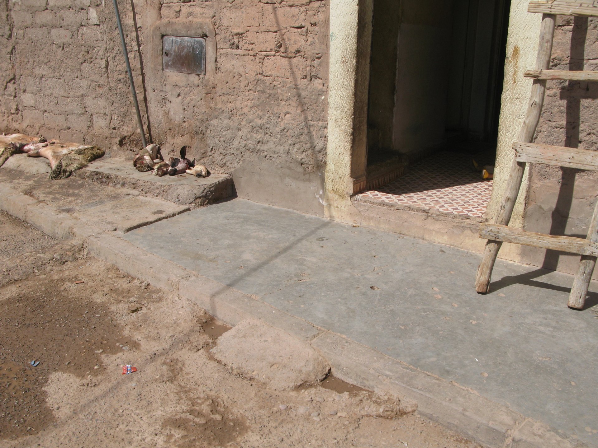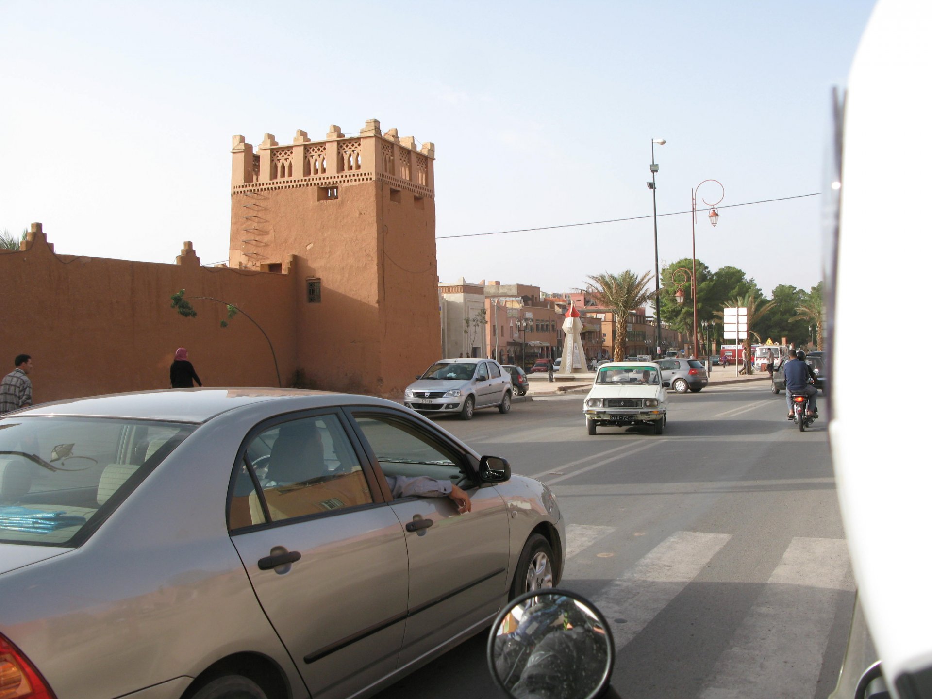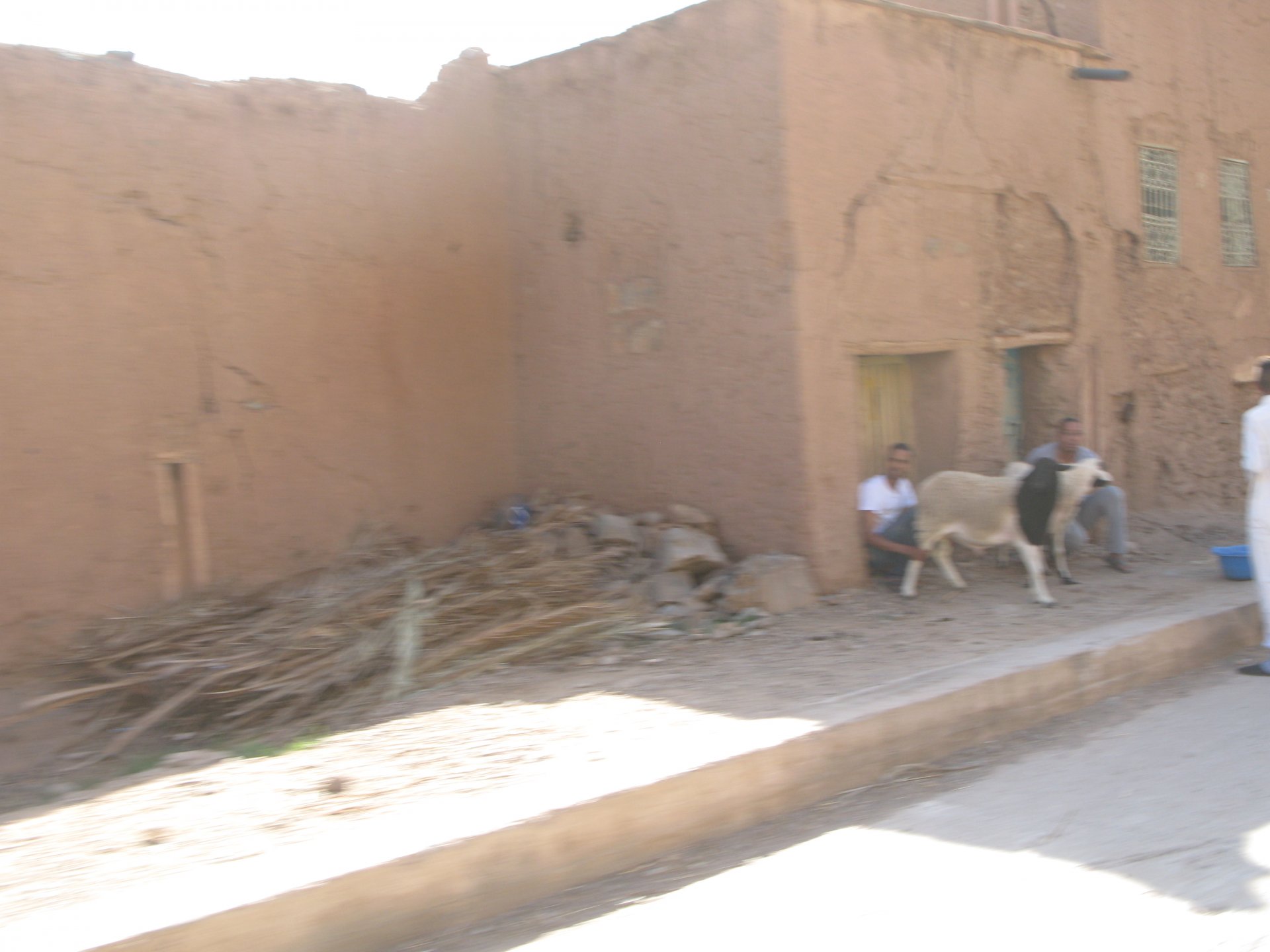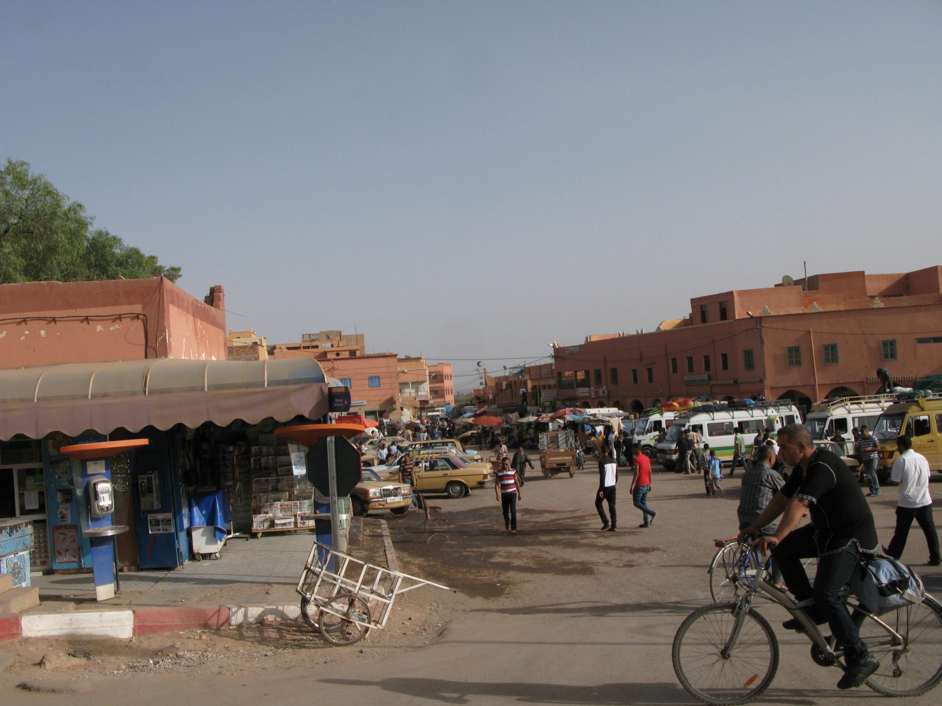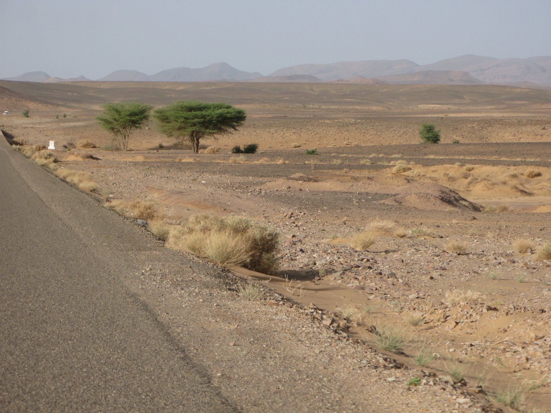 So, leaving the golden dunes of Merzouga, we planned on sleeping on Mhamid. It's only around 400km but the trip would be what I longed for when dreaming of visiting the desert. After a hearty breakfast of Msemmen and lowering my heart beat on colesterol alone, we made way, it was a hot day and you felt it from early on. The rain drops that had fallen two nights before, along with the desert sand, left the bike a mess. Here I'm collecting an acacia thorn, the desert toothpick, and proceeding to stab myself in the finger. Halfway through the morning and we stopped for some tea. One of my favourite things is to sit at a cafe having a tea or coffee, and just allowing the street scene to unfold around you. Carrying on, further on the ride I stop for urination purposes, and take the chance to look at some desert trees. I read before, never park under an Acacia. If you look at the thorns on the pictures before you'll see why. Camels actually put whole branches in the mouths and suck out the leaves. On this stop my spirits drop as we notice an oil leak on the bike. Probably coming from between the engine and gearbox. We were in the middle of nowhere, so decided to press on to Zagora and figure out what to do there. On the way there we stop to check the oil level and Maria documented the occasion with a video. Oil wasn't dropping noticeably, and I realized I didn't have a tool to open the oil filler hole even though I had a full liter of oil in my luggage. That was smart planning! Anyway, on to Zagora! This was a hard road, lots of washboard, had to surf them at 120 for the bike to be livable, it felt like I was breaking it apart. The alternative would be to ride at 30kmh, which was not doable. We make it to Zagora, and stop to take our pictures next to the famous Tombouctou sign Zagora, being a big town and a gateway to the desert, is used to having offroad enthusiasts passing by. A few mechanic shops are here, some of them are used to renting out their facilities to desert racing teams that use this as a base for testing programs. We came accross Mohammed, who received us with a smile and tea. As soon as we walked in his shop Maria noticed the pictures on the wall, and realized she and Mohammed had several friends in common from when she was involved with Baja racing teams and Dakar Rally mechanics. We spent a good while there, just laughing with them. Mohammed was a cool enough dude that i allowed him to put a sticker on my bike Next door, you could have your teeth fixed as well We came away with the oil leak still leaking, but now equipped with a tool to take the filler plug off. So now we had a way of replenishing the oil level if it lowered. I was still unsure if it was engine oil or gearbox oil that was coming out, but since it was on such low quantity we decided to ride on to Mhamid and sleep where we had planned. The ride there would be quite hard but amazing, but not before having a light snack of a little bit of crappy pizza, not worth a picture. From Zagora South, were entering properly dry areas, here water is not a commodity but a luxury. Temperatures we slightly above 40ºC, and the wind was very high, those 100 or 120km felt like 300. Eventually the winds turned into a sand storm and we struggled to keep upright, the road was well visible so we continued. As the wind increased the temperature felt higher as well, which was very weird because you couldn't see the sun and it was almost as dark as night. We felt like we were on Mars but this was an amazing ride that made us appreciate how cool it was to be doing this trip. We got to our hotel exhausted and parked the bike inside the compound next to our room We were asked to be our showers short as there was a severe lack of water in the area. Apparently during most of the year people here only have water pressure on tap for a few hours per day. We went for a walk, and got a few unfriendly looks, presumably because Maria was wearing shorts. Our host took us on a small drive to the dunes in his Land Rover, to whatch the sunset before dinner. We talked a little about the desert and the people there, their way of life and difficulties. Also, we talked how much better life there could be with just minor adjustments like water management. A week after we left there were rain floods and some of those people drowned. Next day we start to head back north and starting our way back home. We still had a lot to see but I hated how the trip started to move back to reality instead of heading towards adventure. Every pore of the road was saturated with fine sand, made for an amazing sight. Stopping for a little water, the bike was a sad state That day, unbeknown to us, Muslims were in celebration. We thought it was weird when we first started noticing slaughtered lambs outside people's homes and made for a little uneasiness, only to be explained at night on our next hotel. Brief stop for lunch, I think in Ouarzazate Ouarzazate is a major city in the area, it is mostly known for its ties with Hollywood, it's got cinema studios and is a base for whenever you need a western setting, or generic middle eastern or desert film location. It's also a little without character and didn't appeal. We moved on. That evening we stayed at a small family owned auberge, we shared a few travel stories and they did as well having travelled all over Morocco in a Fiat Uno. We were served delicious tea upon arrival and Maria made friends with the little girl Owner's runaround moped, it's seen things and been places: Dinner was enjoyed on the rooftop, she's not very impressed with my photography skills A nice night's sleep was had