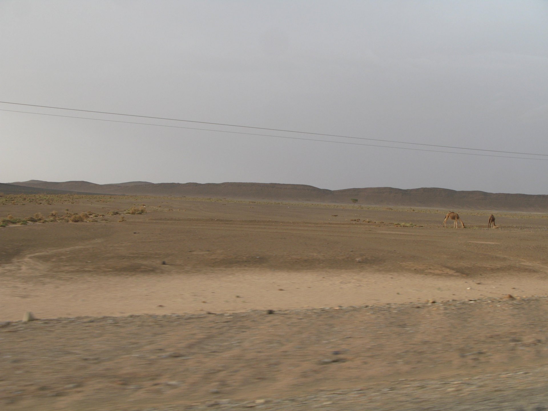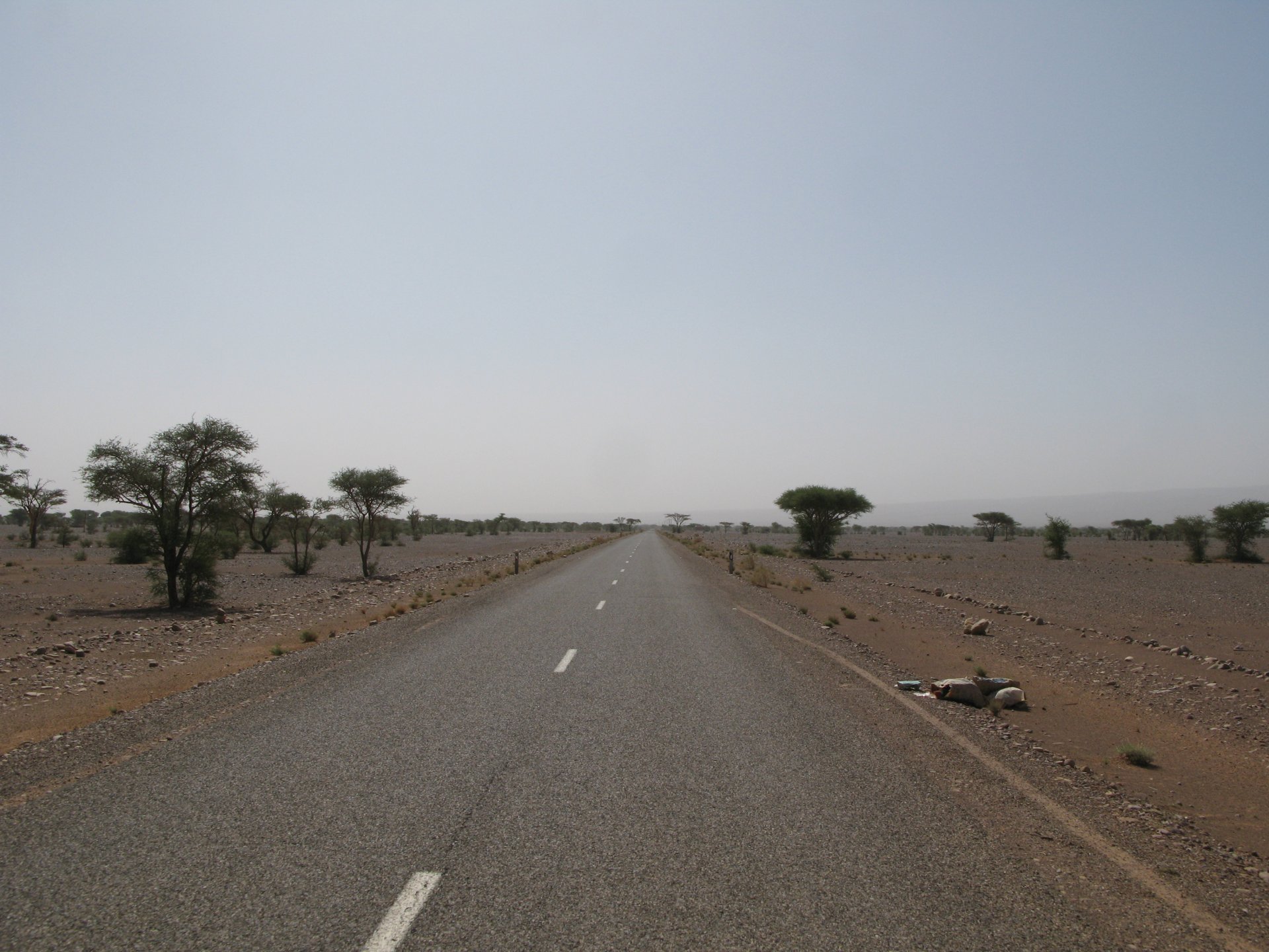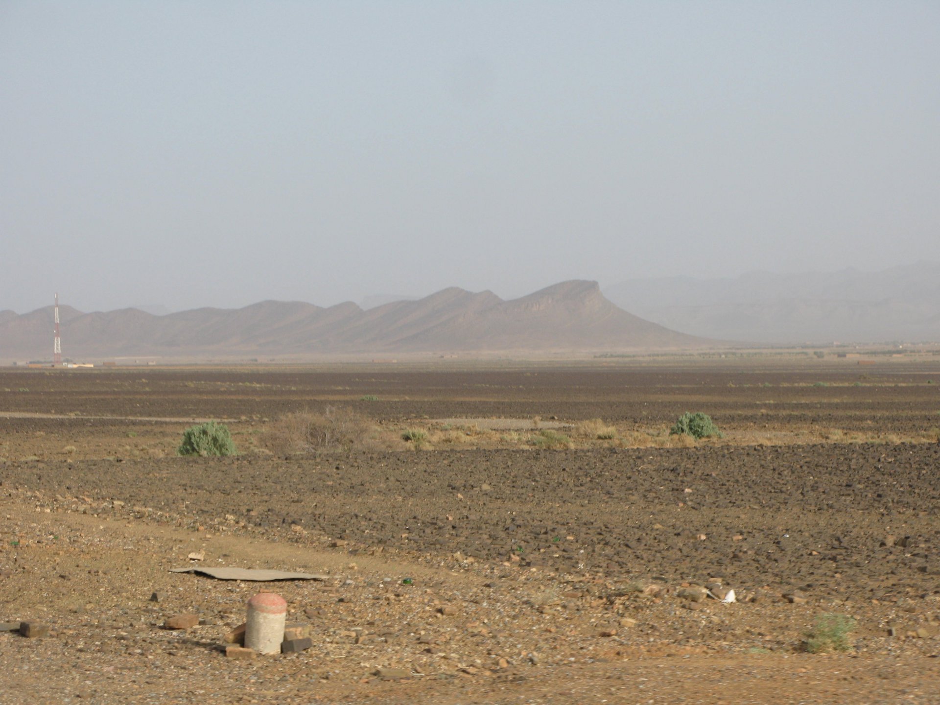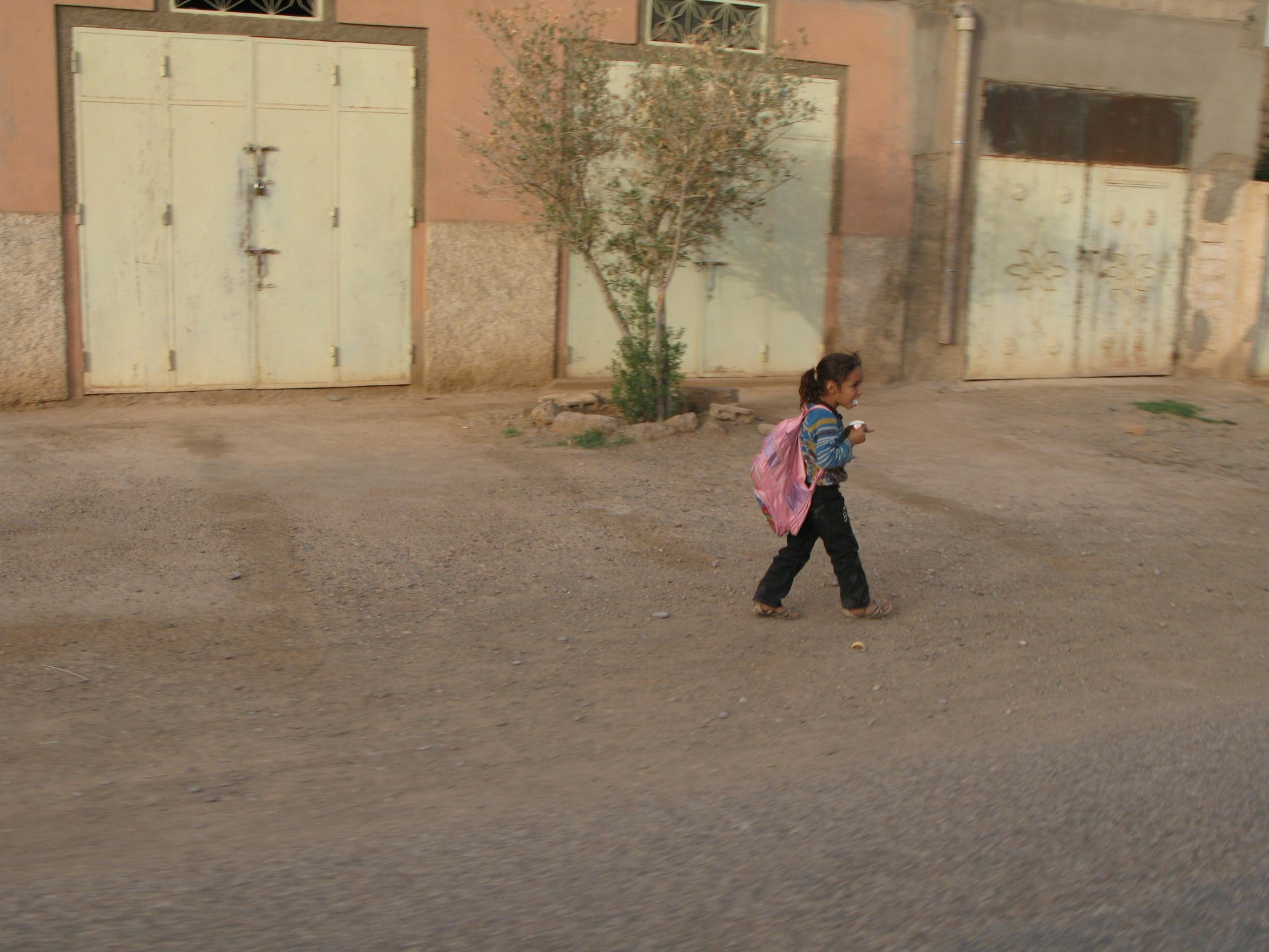 So, leaving the golden dunes of Merzouga, we planned on sleeping on Mhamid. It's only around 400km but the trip would be what I longed for when dreaming of visiting the desert. After a hearty breakfast of Msemmen and lowering my heart beat on colesterol alone, we made way, it was a hot day and you felt it from early on. The rain drops that had fallen two nights before, along with the desert sand, left the bike a mess. Here I'm collecting an acacia thorn, the desert toothpick, and proceeding to stab myself in the finger. Halfway through the morning and we stopped for some tea. One of my favourite things is to sit at a cafe having a tea or coffee, and just allowing the street scene to unfold around you. Carrying on, further on the ride I stop for urination purposes, and take the chance to look at some desert trees. I read before, never park under an Acacia. If you look at the thorns on the pictures before you'll see why. Camels actually put whole branches in the mouths and suck out the leaves. On this stop my spirits drop as we notice an oil leak on the bike. Probably coming from between the engine and gearbox. We were in the middle of nowhere, so decided to press on to Zagora and figure out what to do there. On the way there we stop to check the oil level and Maria documented the occasion with a video. Oil wasn't dropping noticeably, and I realized I didn't have a tool to open the oil filler hole even though I had a full liter of oil in my luggage. That was smart planning! Anyway, on to Zagora! This was a hard road, lots of washboard, had to surf them at 120 for the bike to be livable, it felt like I was breaking it apart. The alternative would be to ride at 30kmh, which was not doable. We make it to Zagora, and stop to take our pictures next to the famous Tombouctou sign Zagora, being a big town and a gateway to the desert, is used to having offroad enthusiasts passing by. A few mechanic shops are here, some of them are used to renting out their facilities to desert racing teams that use this as a base for testing programs. We came accross Mohammed, who received us with a smile and tea. As soon as we walked in his shop Maria noticed the pictures on the wall, and realized she and Mohammed had several friends in common from when she was involved with Baja racing teams and Dakar Rally mechanics. We spent a good while there, just laughing with them. Mohammed was a cool enough dude that i allowed him to put a sticker on my bike Next door, you could have your teeth fixed as well We came away with the oil leak still leaking, but now equipped with a tool to take the filler plug off. So now we had a way of replenishing the oil level if it lowered. I was still unsure if it was engine oil or gearbox oil that was coming out, but since it was on such low quantity we decided to ride on to Mhamid and sleep where we had planned. The ride there would be quite hard but amazing, but not before having a light snack of a little bit of crappy pizza, not worth a picture. From Zagora South, were entering properly dry areas, here water is not a commodity but a luxury. Temperatures we slightly above 40ºC, and the wind was very high, those 100 or 120km felt like 300. Eventually the winds turned into a sand storm and we struggled to keep upright, the road was well visible so we continued. As the wind increased the temperature felt higher as well, which was very weird because you couldn't see the sun and it was almost as dark as night. We felt like we were on Mars but this was an amazing ride that made us appreciate how cool it was to be doing this trip. We got to our hotel exhausted and parked the bike inside the compound next to our room We were asked to be our showers short as there was a severe lack of water in the area. Apparently during most of the year people here only have water pressure on tap for a few hours per day. We went for a walk, and got a few unfriendly looks, presumably because Maria was wearing shorts. Our host took us on a small drive to the dunes in his Land Rover, to whatch the sunset before dinner. We talked a little about the desert and the people there, their way of life and difficulties. Also, we talked how much better life there could be with just minor adjustments like water management. A week after we left there were rain floods and some of those people drowned. Next day we start to head back north and starting our way back home. We still had a lot to see but I hated how the trip started to move back to reality instead of heading towards adventure. Every pore of the road was saturated with fine sand, made for an amazing sight. Stopping for a little water, the bike was a sad state That day, unbeknown to us, Muslims were in celebration. We thought it was weird when we first started noticing slaughtered lambs outside people's homes and made for a little uneasiness, only to be explained at night on our next hotel. Brief stop for lunch, I think in Ouarzazate Ouarzazate is a major city in the area, it is mostly known for its ties with Hollywood, it's got cinema studios and is a base for whenever you need a western setting, or generic middle eastern or desert film location. It's also a little without character and didn't appeal. We moved on. That evening we stayed at a small family owned auberge, we shared a few travel stories and they did as well having travelled all over Morocco in a Fiat Uno. We were served delicious tea upon arrival and Maria made friends with the little girl Owner's runaround moped, it's seen things and been places: Dinner was enjoyed on the rooftop, she's not very impressed with my photography skills A nice night's sleep was had