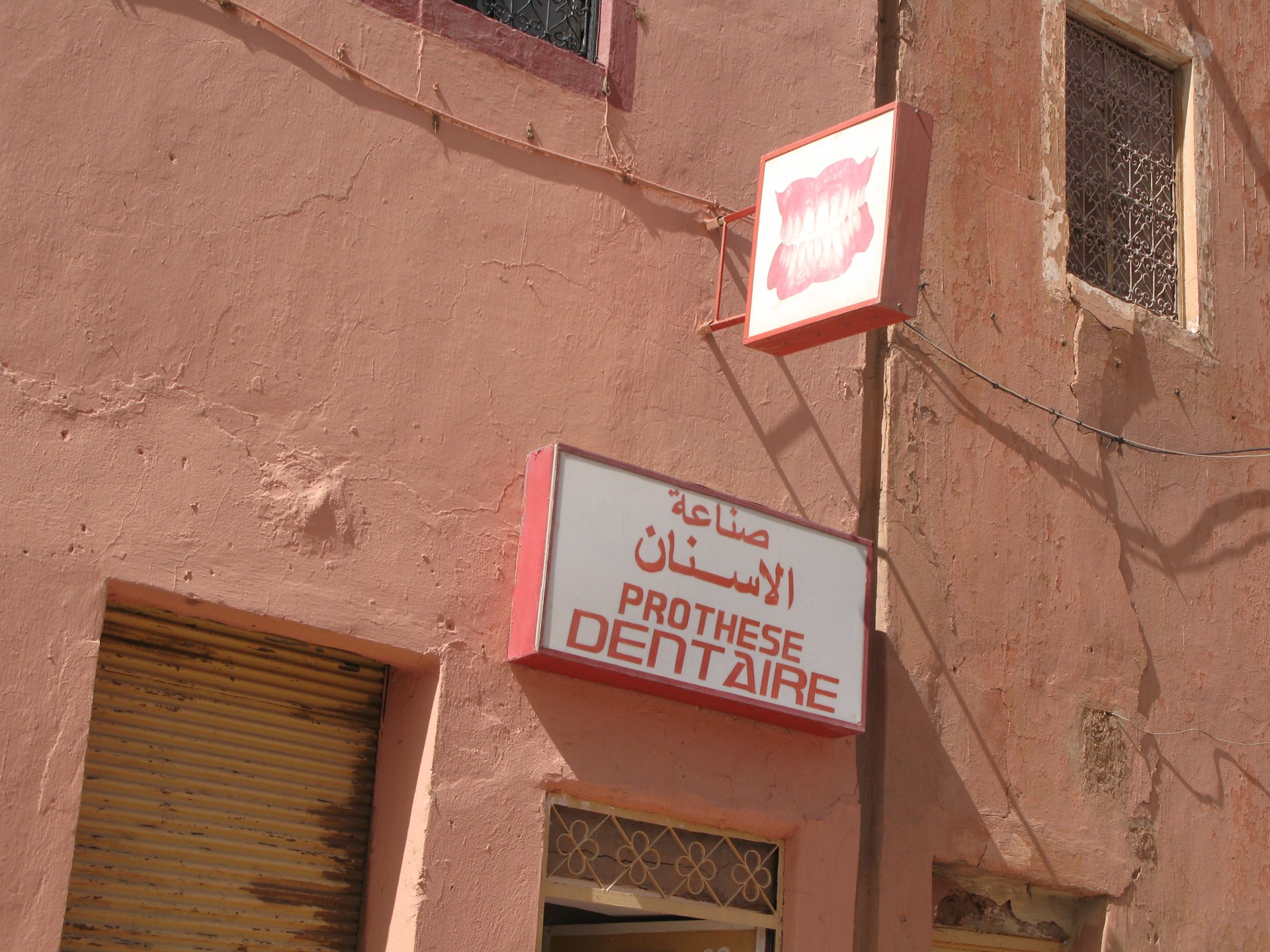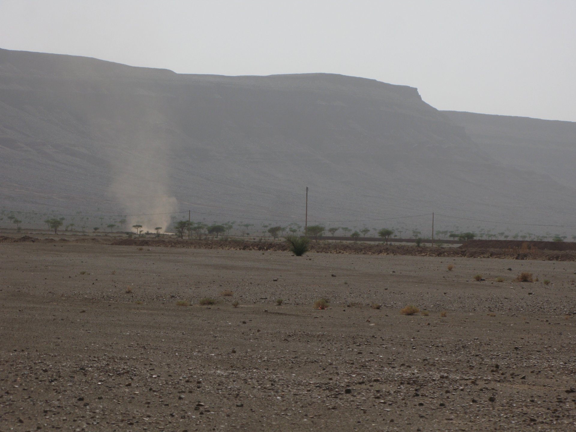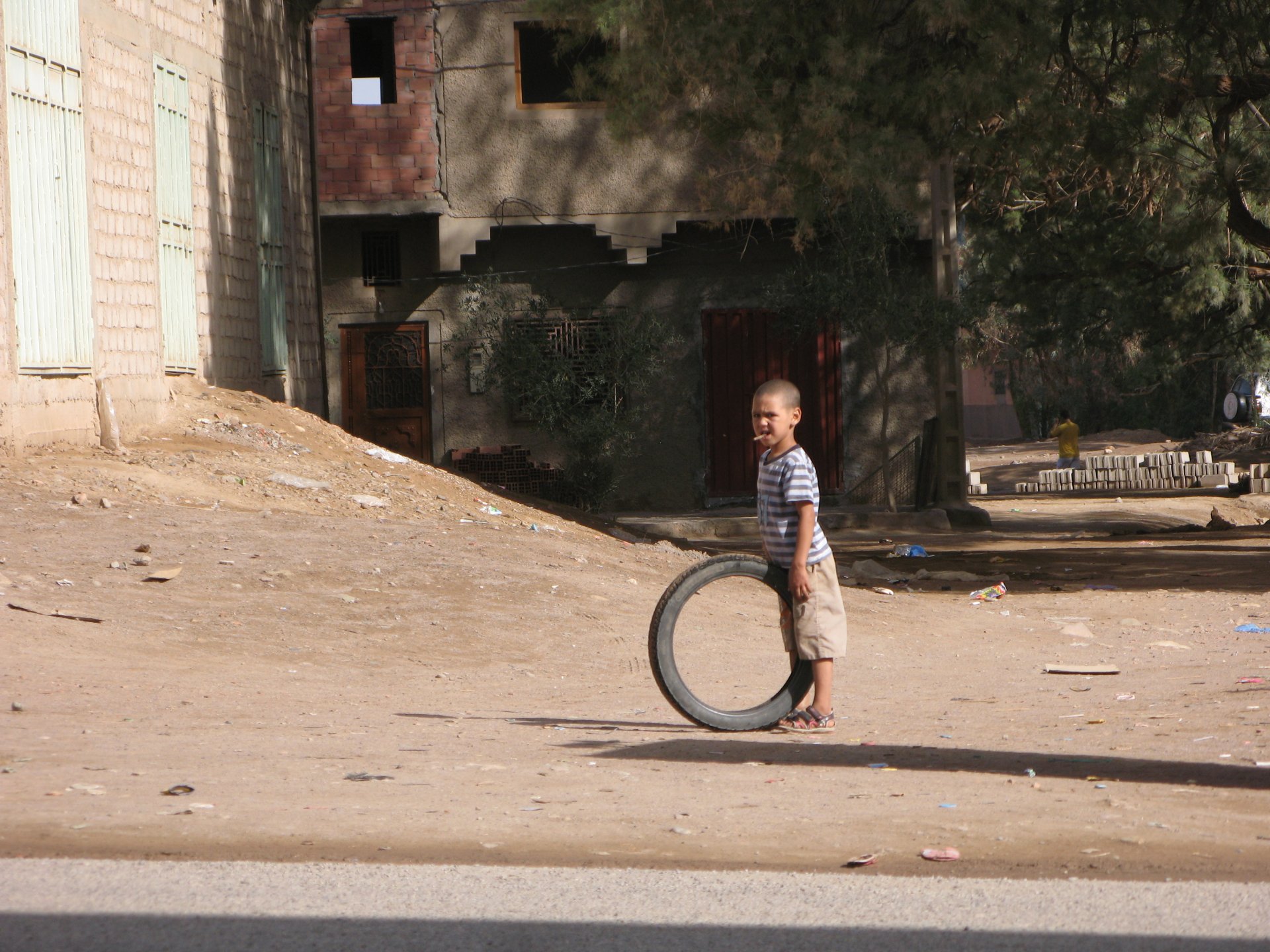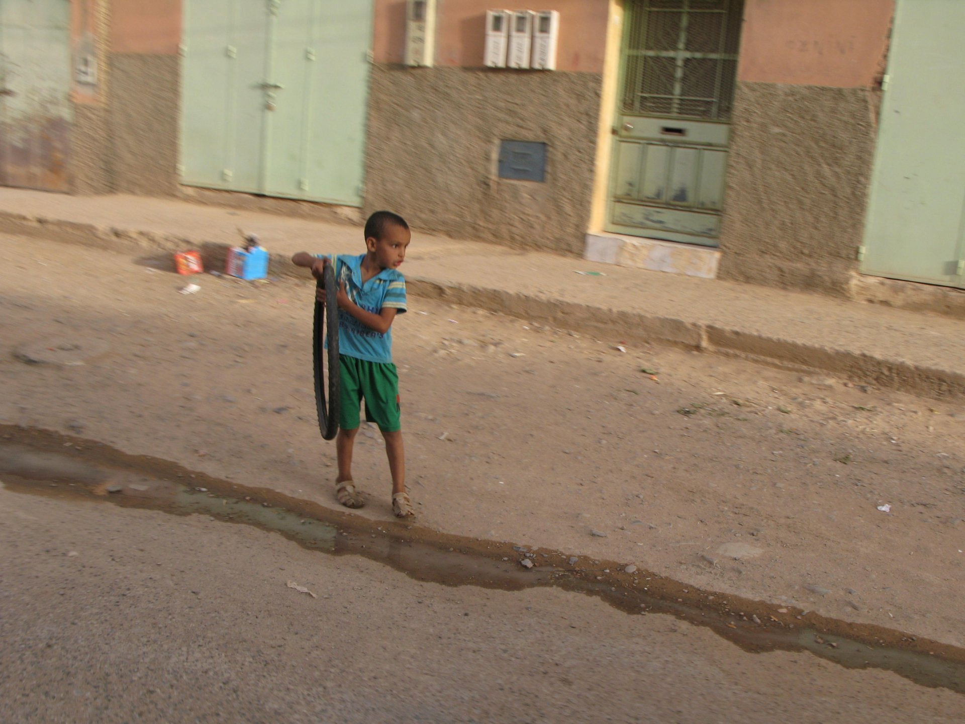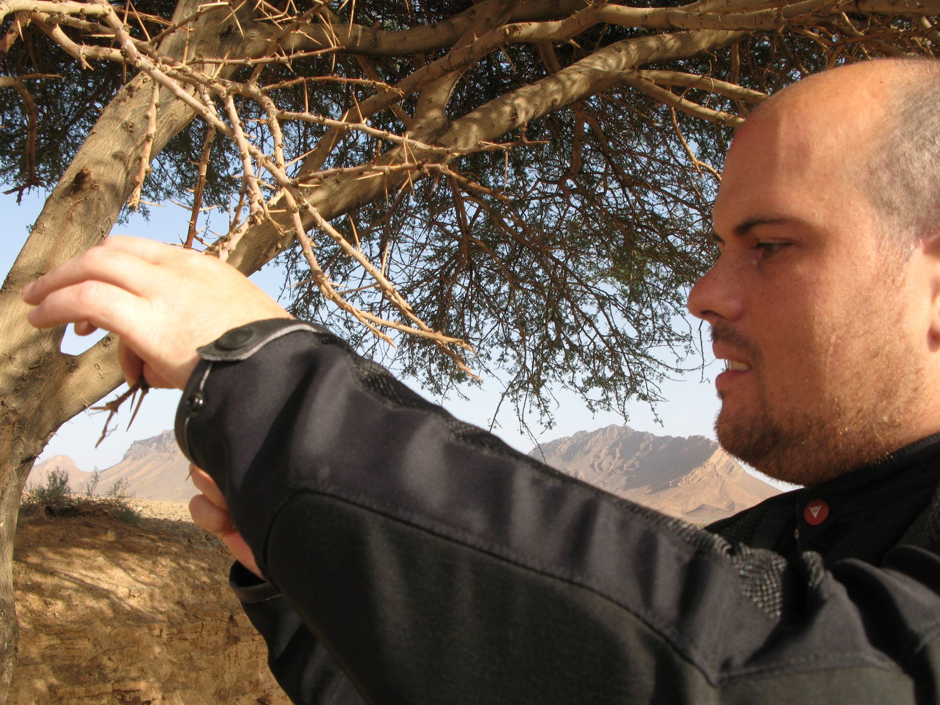 So, leaving the golden dunes of Merzouga, we planned on sleeping on Mhamid. It's only around 400km but the trip would be what I longed for when dreaming of visiting the desert. After a hearty breakfast of Msemmen and lowering my heart beat on colesterol alone, we made way, it was a hot day and you felt it from early on. The rain drops that had fallen two nights before, along with the desert sand, left the bike a mess. Here I'm collecting an acacia thorn, the desert toothpick, and proceeding to stab myself in the finger. Halfway through the morning and we stopped for some tea. One of my favourite things is to sit at a cafe having a tea or coffee, and just allowing the street scene to unfold around you. Carrying on, further on the ride I stop for urination purposes, and take the chance to look at some desert trees. I read before, never park under an Acacia. If you look at the thorns on the pictures before you'll see why. Camels actually put whole branches in the mouths and suck out the leaves. On this stop my spirits drop as we notice an oil leak on the bike. Probably coming from between the engine and gearbox. We were in the middle of nowhere, so decided to press on to Zagora and figure out what to do there. On the way there we stop to check the oil level and Maria documented the occasion with a video. Oil wasn't dropping noticeably, and I realized I didn't have a tool to open the oil filler hole even though I had a full liter of oil in my luggage. That was smart planning! Anyway, on to Zagora! This was a hard road, lots of washboard, had to surf them at 120 for the bike to be livable, it felt like I was breaking it apart. The alternative would be to ride at 30kmh, which was not doable. We make it to Zagora, and stop to take our pictures next to the famous Tombouctou sign Zagora, being a big town and a gateway to the desert, is used to having offroad enthusiasts passing by. A few mechanic shops are here, some of them are used to renting out their facilities to desert racing teams that use this as a base for testing programs. We came accross Mohammed, who received us with a smile and tea. As soon as we walked in his shop Maria noticed the pictures on the wall, and realized she and Mohammed had several friends in common from when she was involved with Baja racing teams and Dakar Rally mechanics. We spent a good while there, just laughing with them. Mohammed was a cool enough dude that i allowed him to put a sticker on my bike Next door, you could have your teeth fixed as well We came away with the oil leak still leaking, but now equipped with a tool to take the filler plug off. So now we had a way of replenishing the oil level if it lowered. I was still unsure if it was engine oil or gearbox oil that was coming out, but since it was on such low quantity we decided to ride on to Mhamid and sleep where we had planned. The ride there would be quite hard but amazing, but not before having a light snack of a little bit of crappy pizza, not worth a picture. From Zagora South, were entering properly dry areas, here water is not a commodity but a luxury. Temperatures we slightly above 40ºC, and the wind was very high, those 100 or 120km felt like 300. Eventually the winds turned into a sand storm and we struggled to keep upright, the road was well visible so we continued. As the wind increased the temperature felt higher as well, which was very weird because you couldn't see the sun and it was almost as dark as night. We felt like we were on Mars but this was an amazing ride that made us appreciate how cool it was to be doing this trip. We got to our hotel exhausted and parked the bike inside the compound next to our room We were asked to be our showers short as there was a severe lack of water in the area. Apparently during most of the year people here only have water pressure on tap for a few hours per day. We went for a walk, and got a few unfriendly looks, presumably because Maria was wearing shorts. Our host took us on a small drive to the dunes in his Land Rover, to whatch the sunset before dinner. We talked a little about the desert and the people there, their way of life and difficulties. Also, we talked how much better life there could be with just minor adjustments like water management. A week after we left there were rain floods and some of those people drowned. Next day we start to head back north and starting our way back home. We still had a lot to see but I hated how the trip started to move back to reality instead of heading towards adventure. Every pore of the road was saturated with fine sand, made for an amazing sight. Stopping for a little water, the bike was a sad state That day, unbeknown to us, Muslims were in celebration. We thought it was weird when we first started noticing slaughtered lambs outside people's homes and made for a little uneasiness, only to be explained at night on our next hotel. Brief stop for lunch, I think in Ouarzazate Ouarzazate is a major city in the area, it is mostly known for its ties with Hollywood, it's got cinema studios and is a base for whenever you need a western setting, or generic middle eastern or desert film location. It's also a little without character and didn't appeal. We moved on. That evening we stayed at a small family owned auberge, we shared a few travel stories and they did as well having travelled all over Morocco in a Fiat Uno. We were served delicious tea upon arrival and Maria made friends with the little girl Owner's runaround moped, it's seen things and been places: Dinner was enjoyed on the rooftop, she's not very impressed with my photography skills A nice night's sleep was had