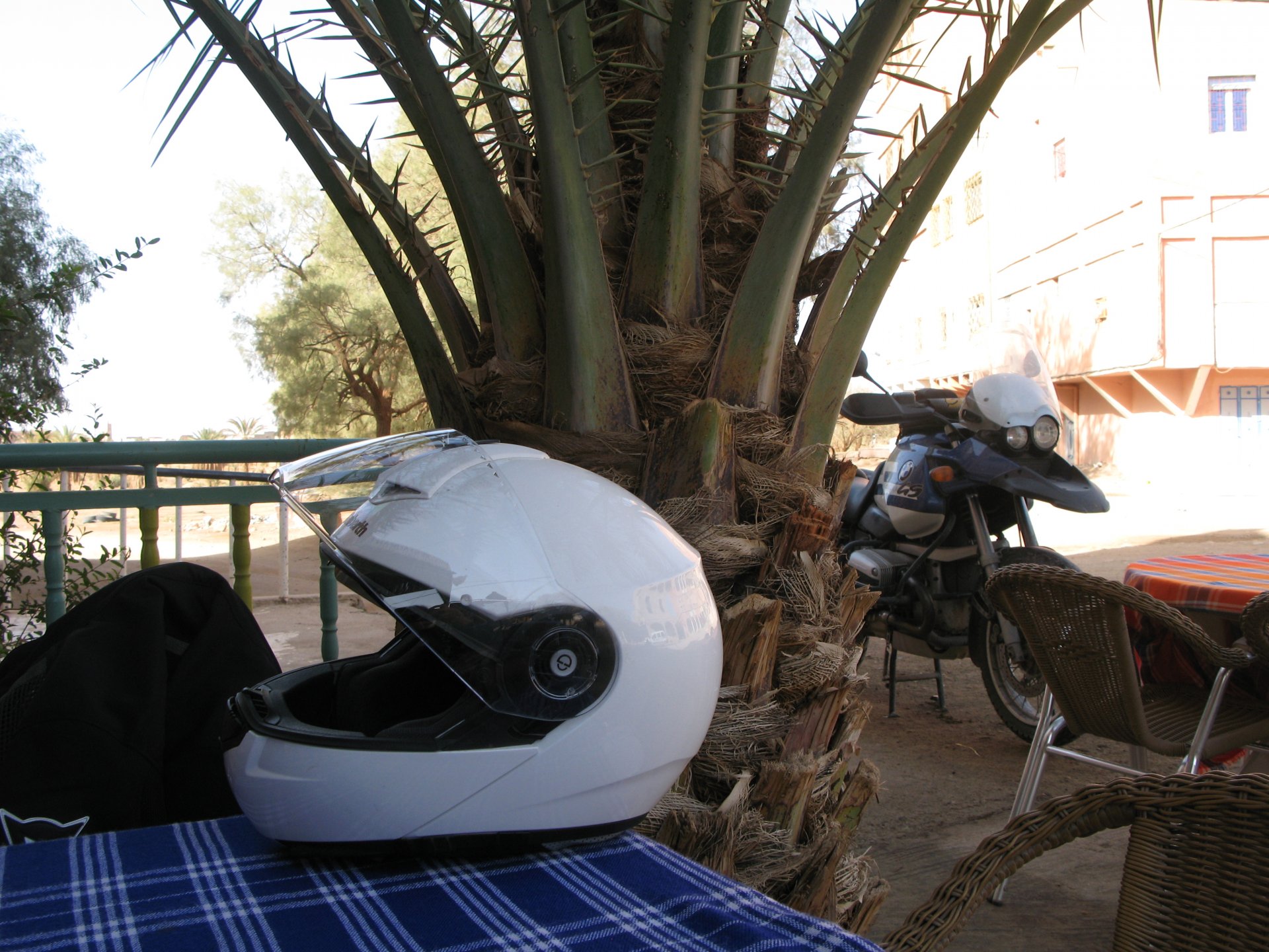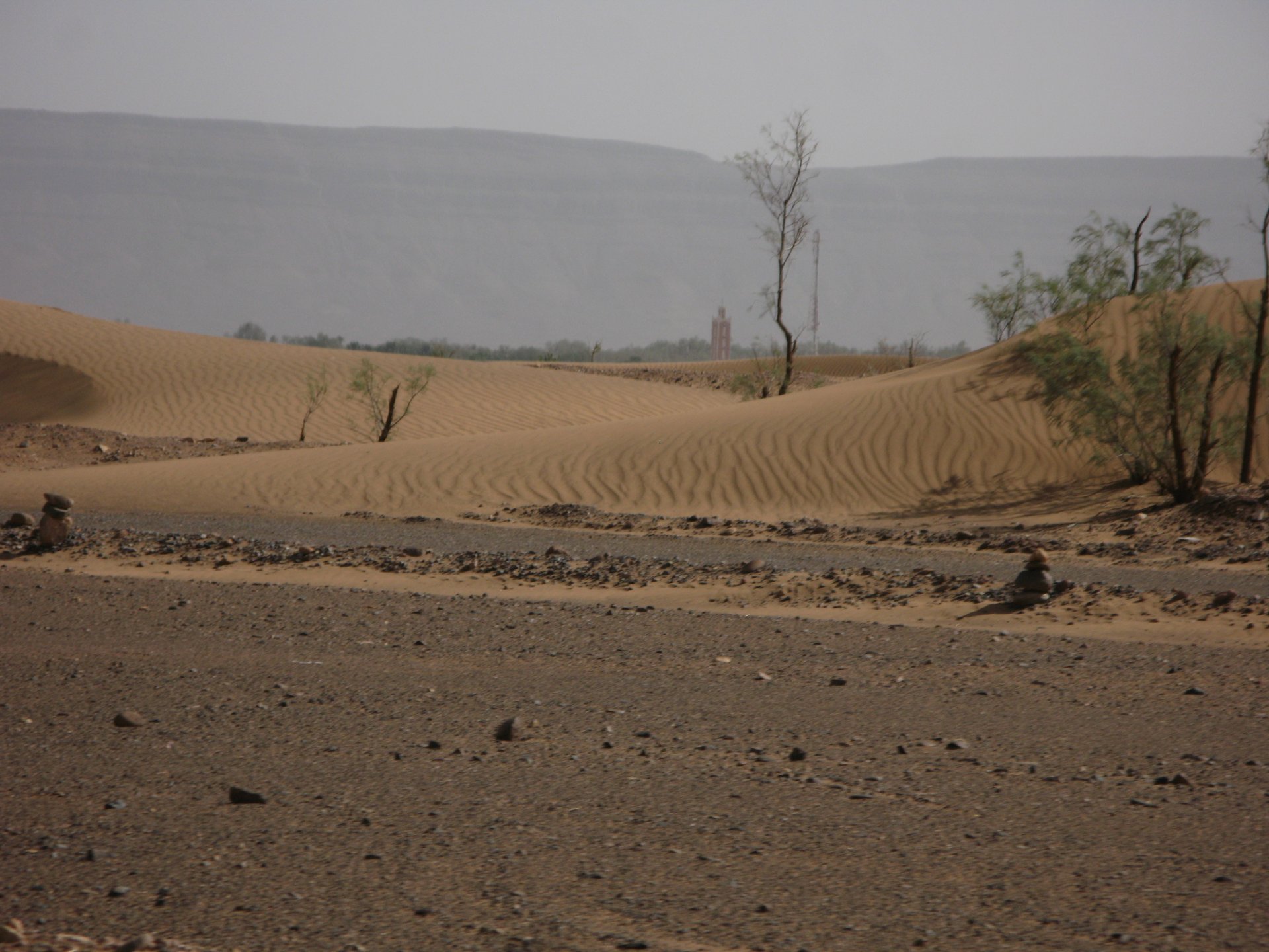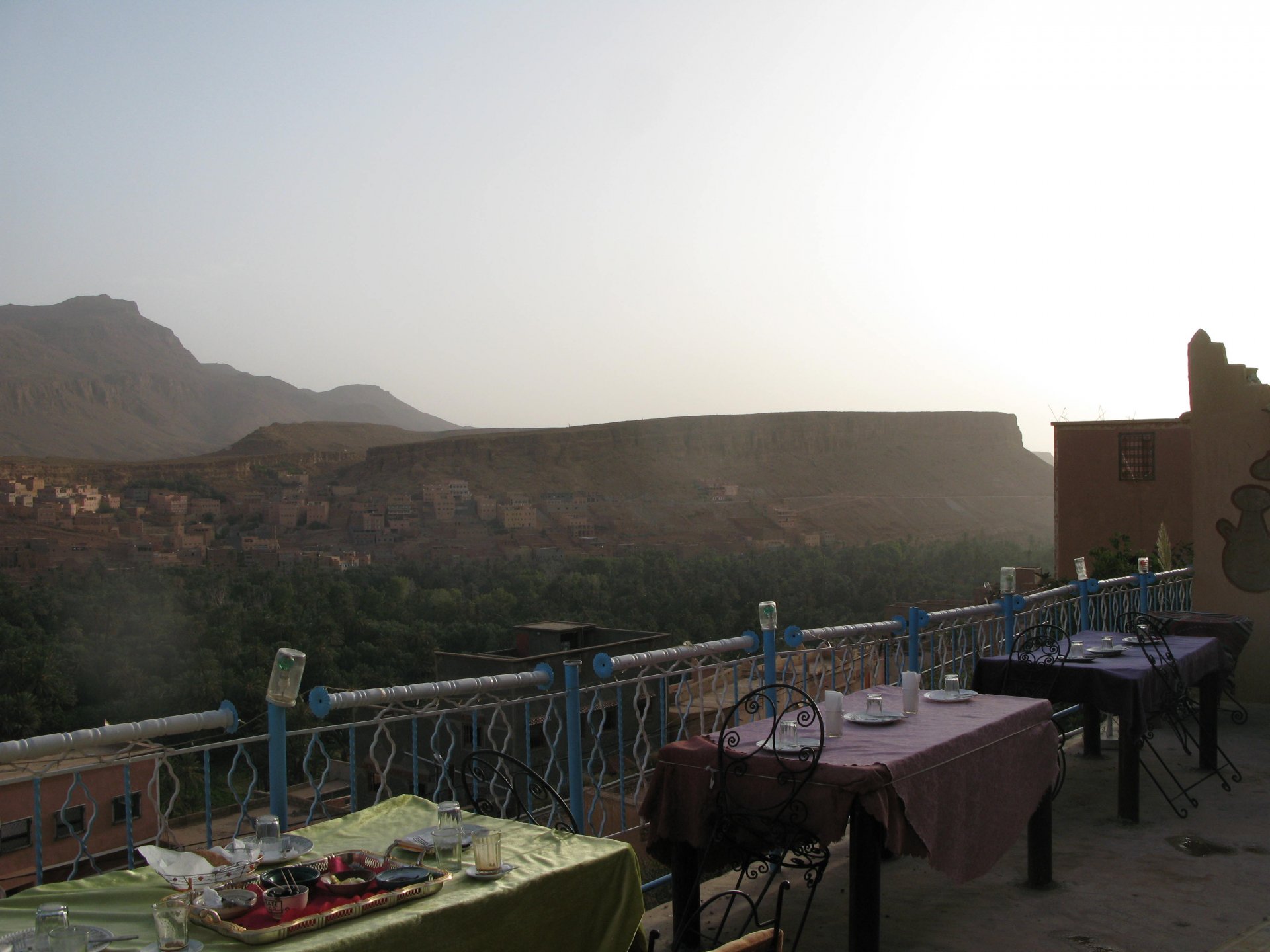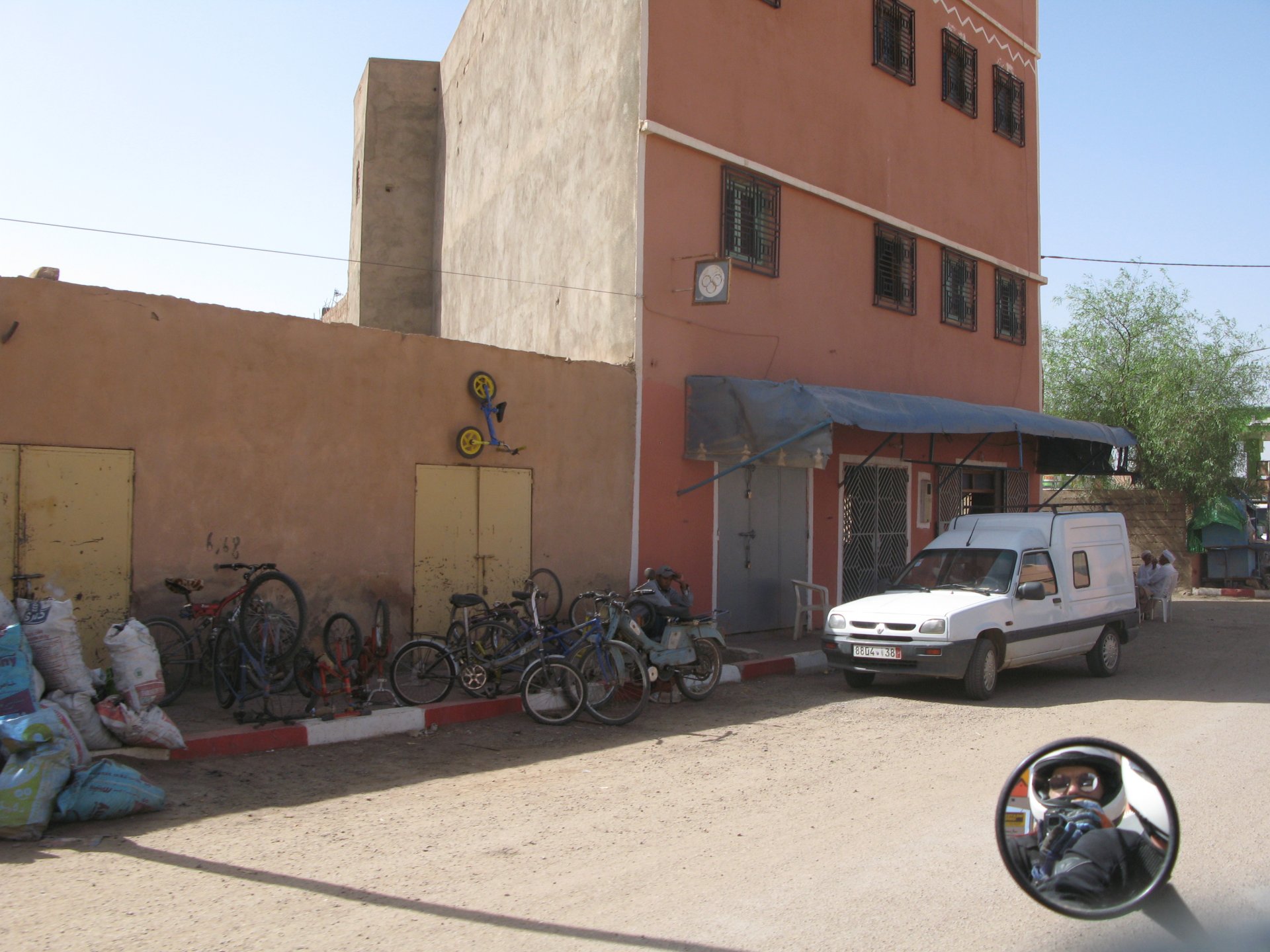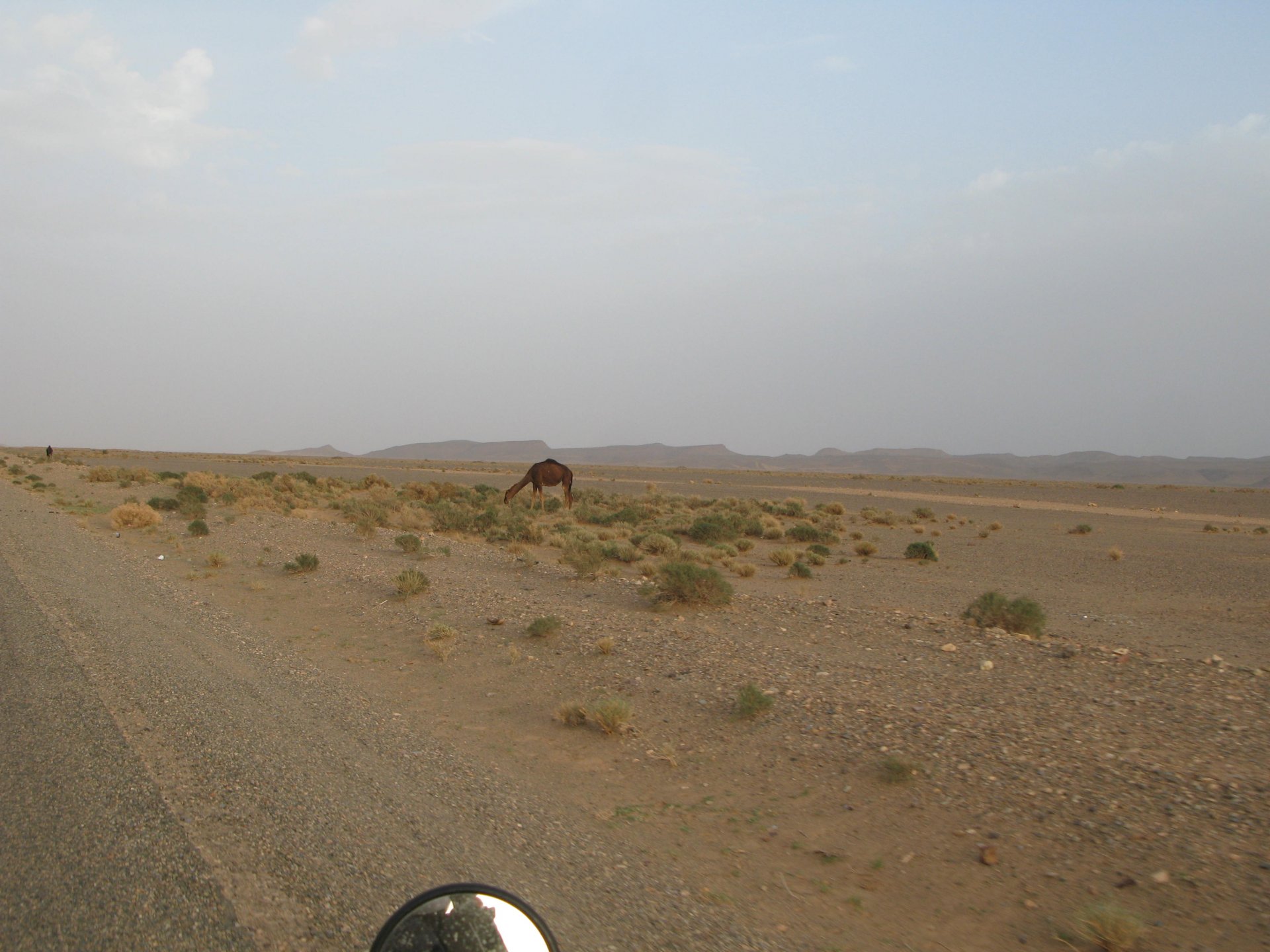 It had gotten cold(er) during the night so waking up in a cozy hay mattress felt like something from the movies. Morning light revealed what a great place we had slept in, and we had a great breakfast with the greatest view. There is nothing like a palm field in the desert, it's magnetic and comfortable. We rode off after drinking all the tea we could stomach and just as it was starting to warm a little. We needn't worry, as by the time we left the gorge and made it to Tinghir, only a few kms south, it was properly hot already: From Tinghir, we would go West and visit the Dades Gorges, maybe hook up a mountain (dirt) route back to the same place we slept in, before going to the Sahara. Going to the Dades Gorges was a great idea, we had a brief idea of desert heat before going back up to a gorge: I like the idea of that building up there in the rocks, that two years later we would sleep there. To the right of this tiny road was the most intense drop and views I've ever seen, pictures don't do it justice. After this amazing stretch of road it already lunch time and we needed a break, so found somewhere under a cool shade to sit and had some great lunch The restaurant owner quickly put our hopes to rest by telling us that the route we planned to go over wasn't passable. Apparently the same rains that washed the previous day's road and made this one not passable, with the difference that being dirt and on a cliff face the mud slide had really deleted any way through. Our plan quickly changed to heading back down the Gorge again, back to Tinghir and then onto the Sahara proper and to head towards the dunes. This would prove to be a little too long as we didn't know the Morocco Rally was about to start. Going back the Gorge du Dades And onto the open desert We stopped at Tinghir, for a cold drink in an air conditioned cafe, and decided where to go next. A booking was made for the golden dunes after Merzouga, a mere 200km away, shouldn't take a lot longer than 2 hours on the open desert. That was the plan, but we didn't factor getting lost, nor for the palm fields before Merzouga, and the complete darkness riding through those palms, and to top it all we didn't factor in that the Morocco Rally was about to start, and all rally jeeps and trucks would be coming back from the desert to Merzouga at night, going quite fast with a huge amount of lighting helping them. Quite scary. The plus, was looking at the desert's wide open spaces for the first time, and camel herds in the distance also for the first time. By the time we made it to the hotel, it was again too dark to appreciate the surroundings. As the hotel was located a few kms into a maze of pistes and google maps pointed it as being in the town's center, we were proper lost until someone showed us the way. This took an extra hour. Had a nice shower to wash the dust off, and tucked into a berber omelette and salad. I would have paid extra for a few cold beers, but no chance of that this time. The plan for the day after was for it to be a rest day. Sleep in the same place, just a ride around the area, and lounge a little drinking cold water and enjoying the desert and the dunes.