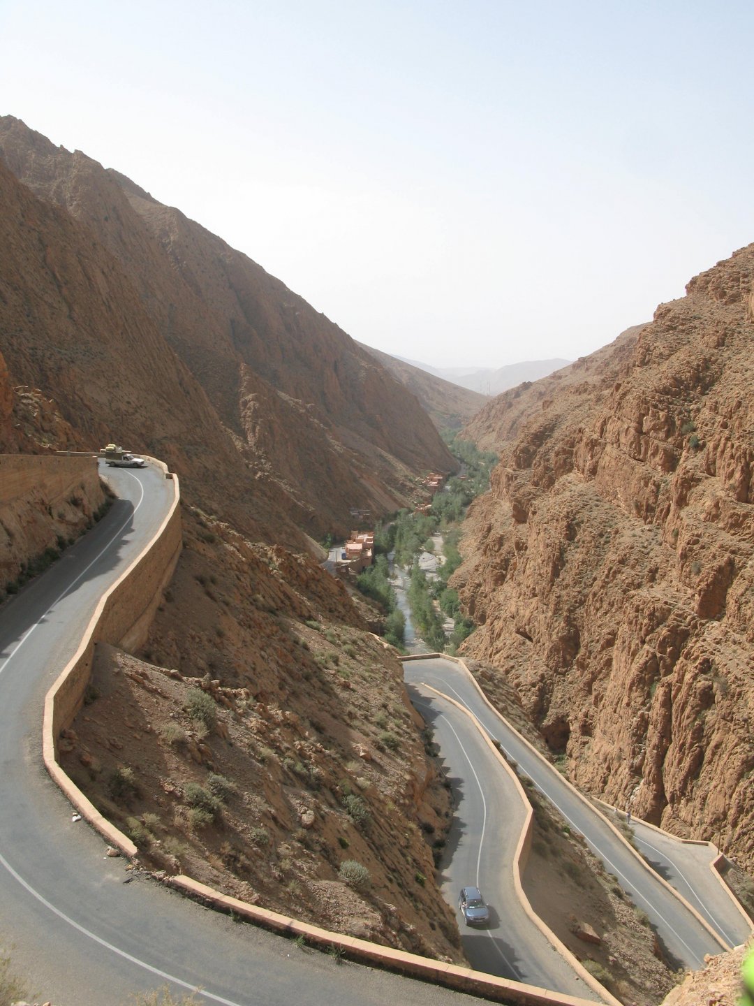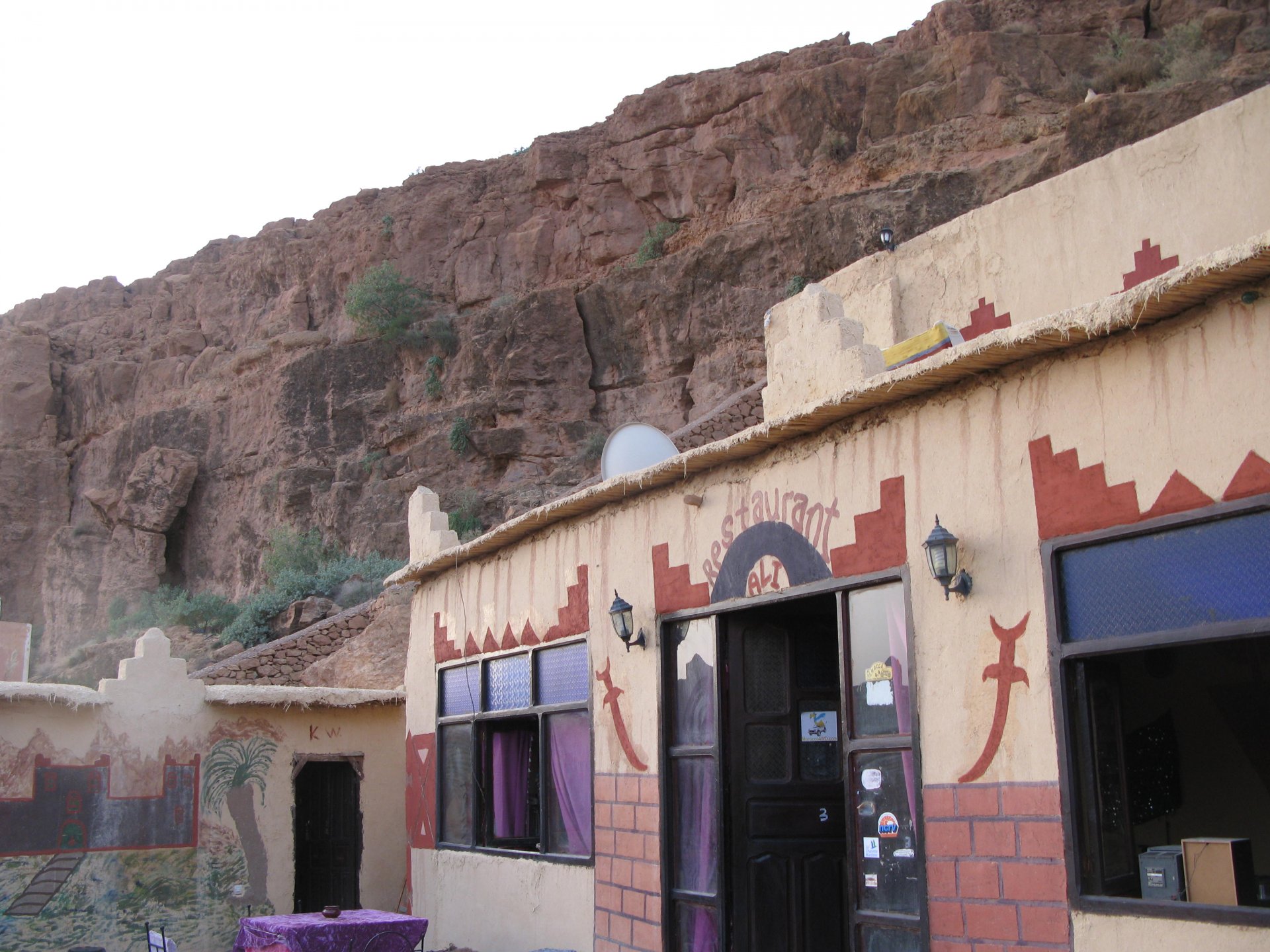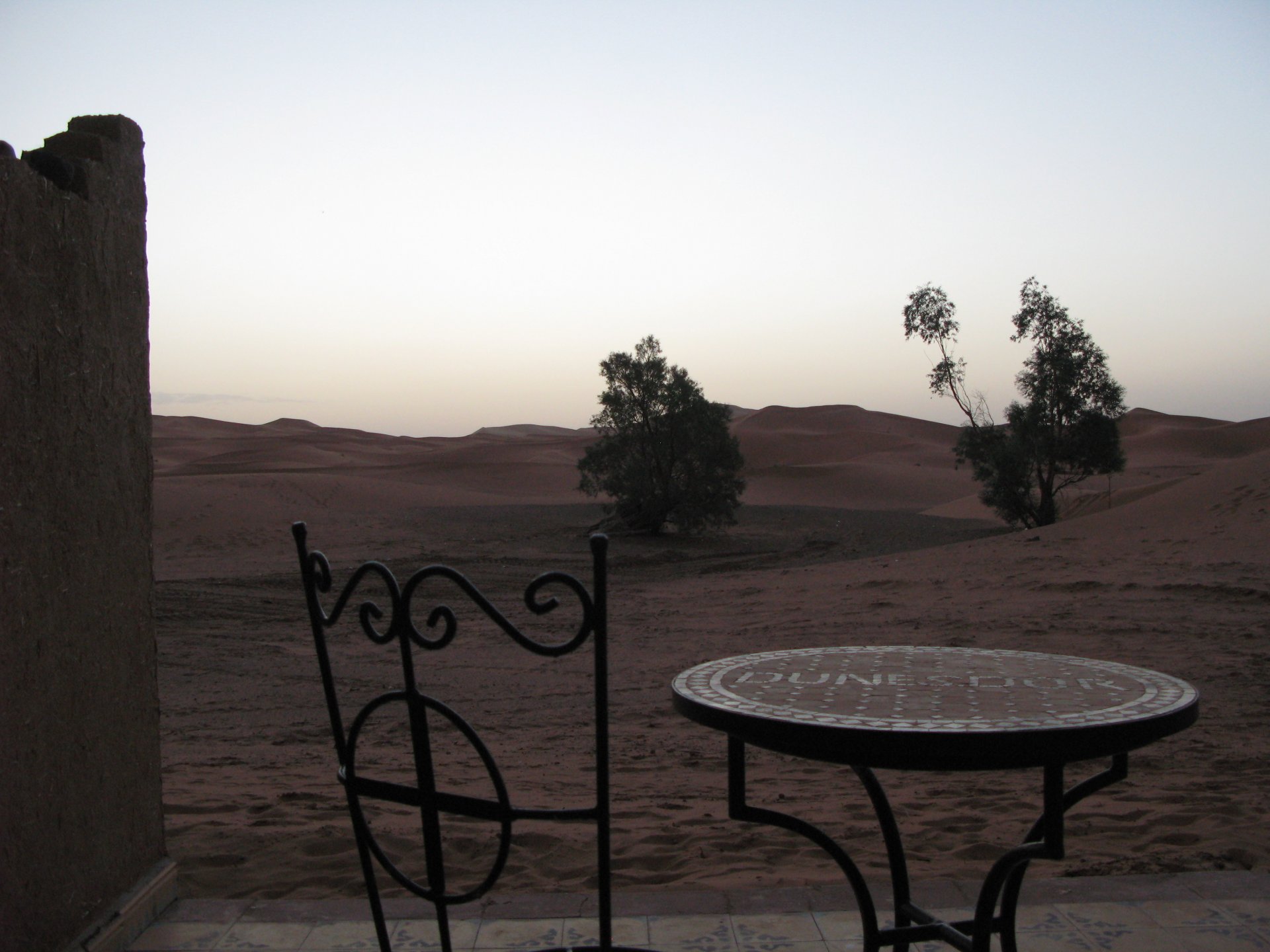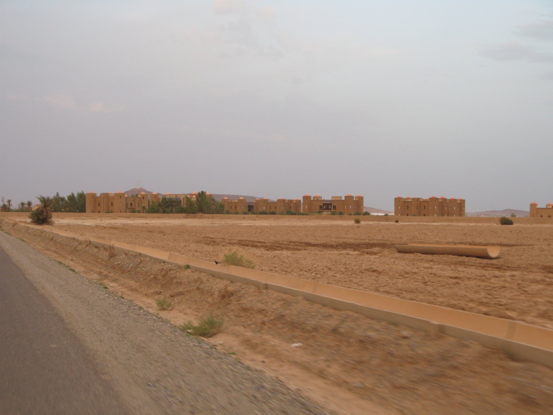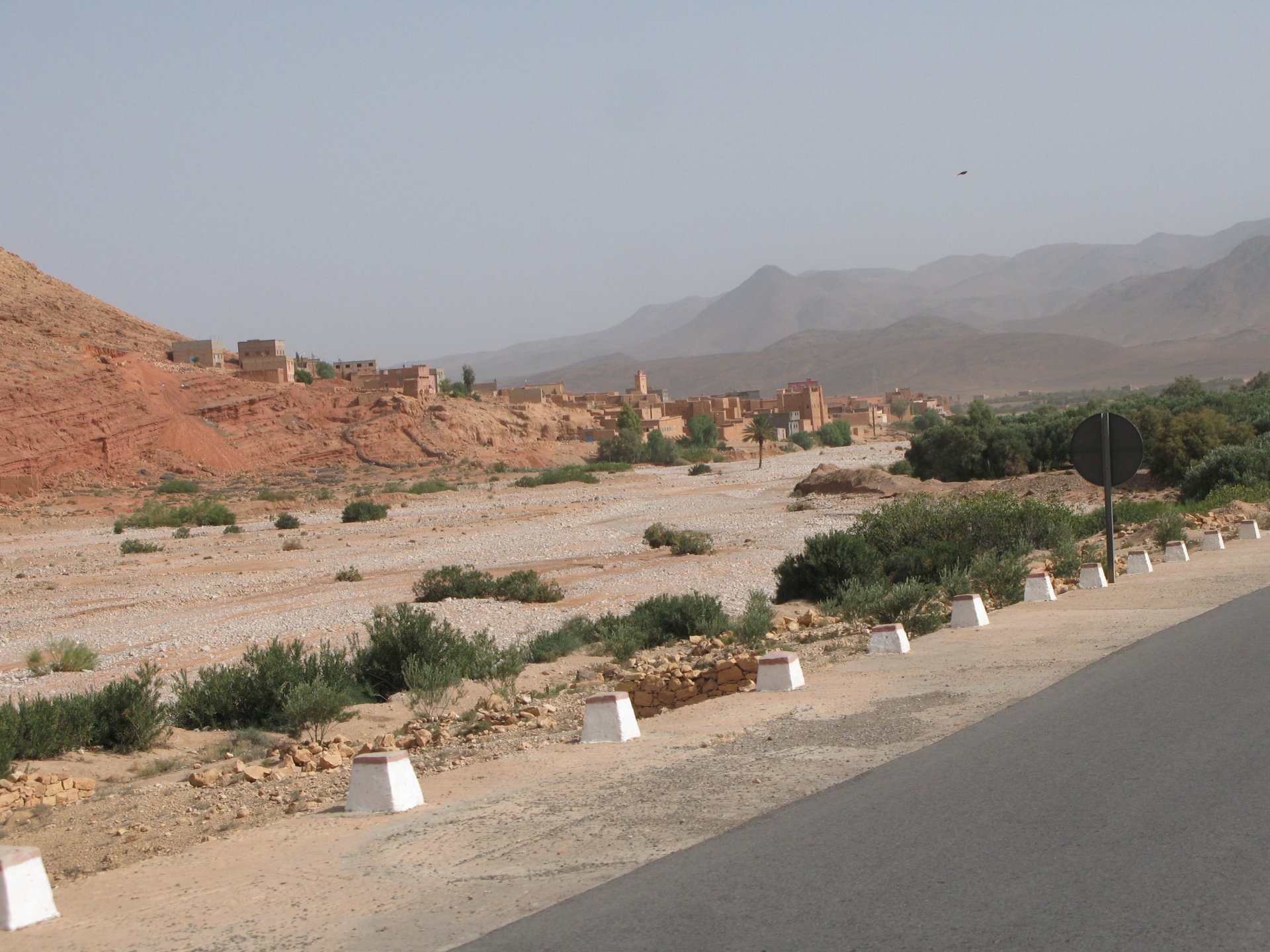 It had gotten cold(er) during the night so waking up in a cozy hay mattress felt like something from the movies. Morning light revealed what a great place we had slept in, and we had a great breakfast with the greatest view. There is nothing like a palm field in the desert, it's magnetic and comfortable. We rode off after drinking all the tea we could stomach and just as it was starting to warm a little. We needn't worry, as by the time we left the gorge and made it to Tinghir, only a few kms south, it was properly hot already: From Tinghir, we would go West and visit the Dades Gorges, maybe hook up a mountain (dirt) route back to the same place we slept in, before going to the Sahara. Going to the Dades Gorges was a great idea, we had a brief idea of desert heat before going back up to a gorge: I like the idea of that building up there in the rocks, that two years later we would sleep there. To the right of this tiny road was the most intense drop and views I've ever seen, pictures don't do it justice. After this amazing stretch of road it already lunch time and we needed a break, so found somewhere under a cool shade to sit and had some great lunch The restaurant owner quickly put our hopes to rest by telling us that the route we planned to go over wasn't passable. Apparently the same rains that washed the previous day's road and made this one not passable, with the difference that being dirt and on a cliff face the mud slide had really deleted any way through. Our plan quickly changed to heading back down the Gorge again, back to Tinghir and then onto the Sahara proper and to head towards the dunes. This would prove to be a little too long as we didn't know the Morocco Rally was about to start. Going back the Gorge du Dades And onto the open desert We stopped at Tinghir, for a cold drink in an air conditioned cafe, and decided where to go next. A booking was made for the golden dunes after Merzouga, a mere 200km away, shouldn't take a lot longer than 2 hours on the open desert. That was the plan, but we didn't factor getting lost, nor for the palm fields before Merzouga, and the complete darkness riding through those palms, and to top it all we didn't factor in that the Morocco Rally was about to start, and all rally jeeps and trucks would be coming back from the desert to Merzouga at night, going quite fast with a huge amount of lighting helping them. Quite scary. The plus, was looking at the desert's wide open spaces for the first time, and camel herds in the distance also for the first time. By the time we made it to the hotel, it was again too dark to appreciate the surroundings. As the hotel was located a few kms into a maze of pistes and google maps pointed it as being in the town's center, we were proper lost until someone showed us the way. This took an extra hour. Had a nice shower to wash the dust off, and tucked into a berber omelette and salad. I would have paid extra for a few cold beers, but no chance of that this time. The plan for the day after was for it to be a rest day. Sleep in the same place, just a ride around the area, and lounge a little drinking cold water and enjoying the desert and the dunes.