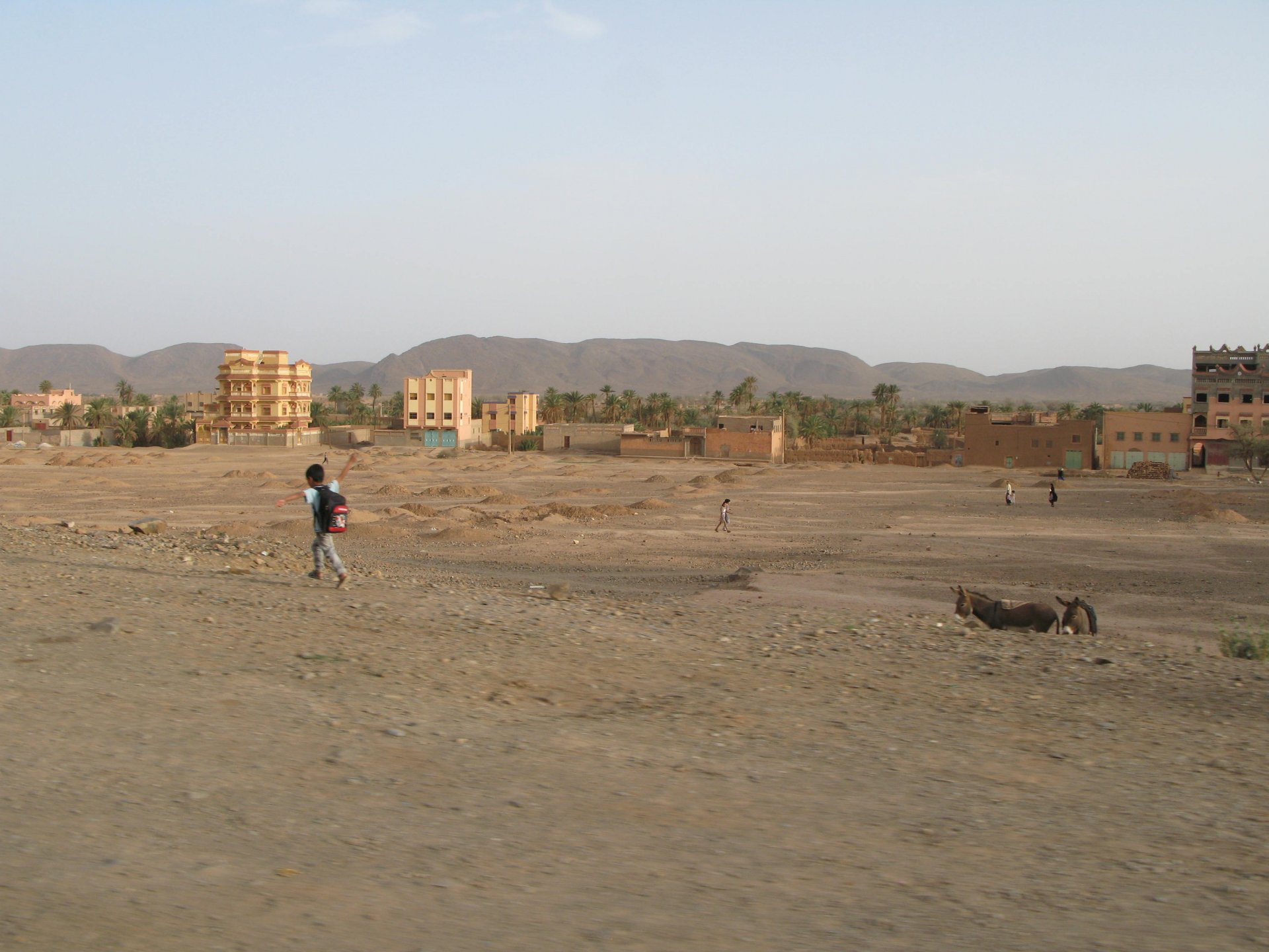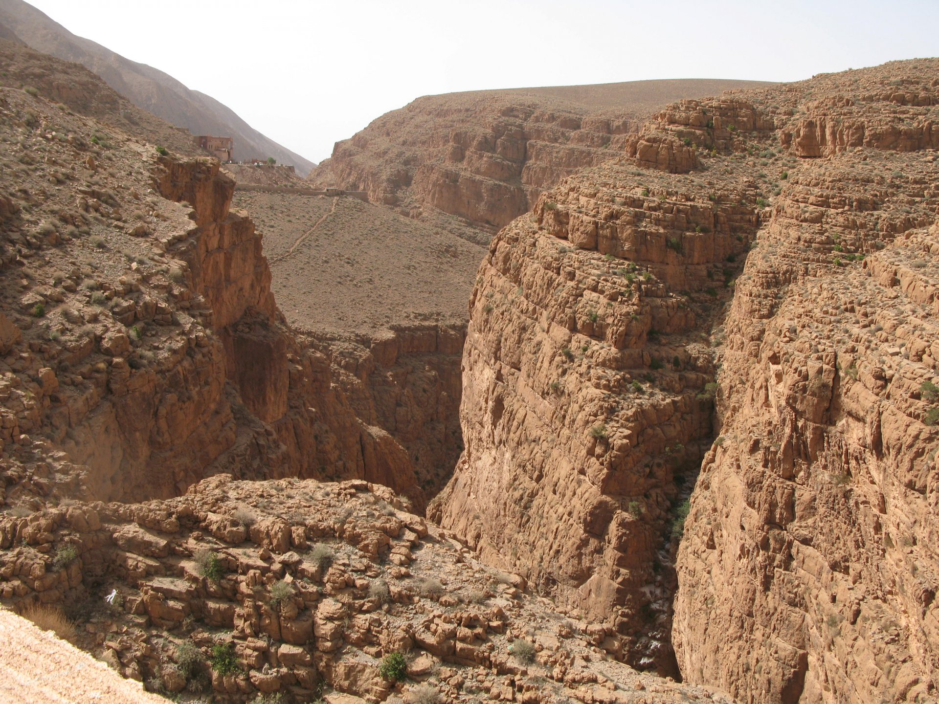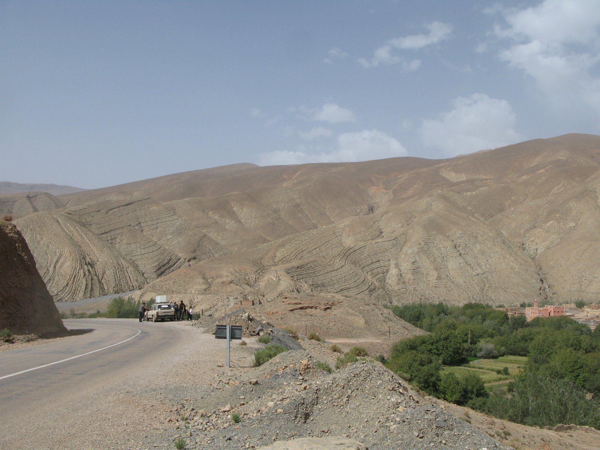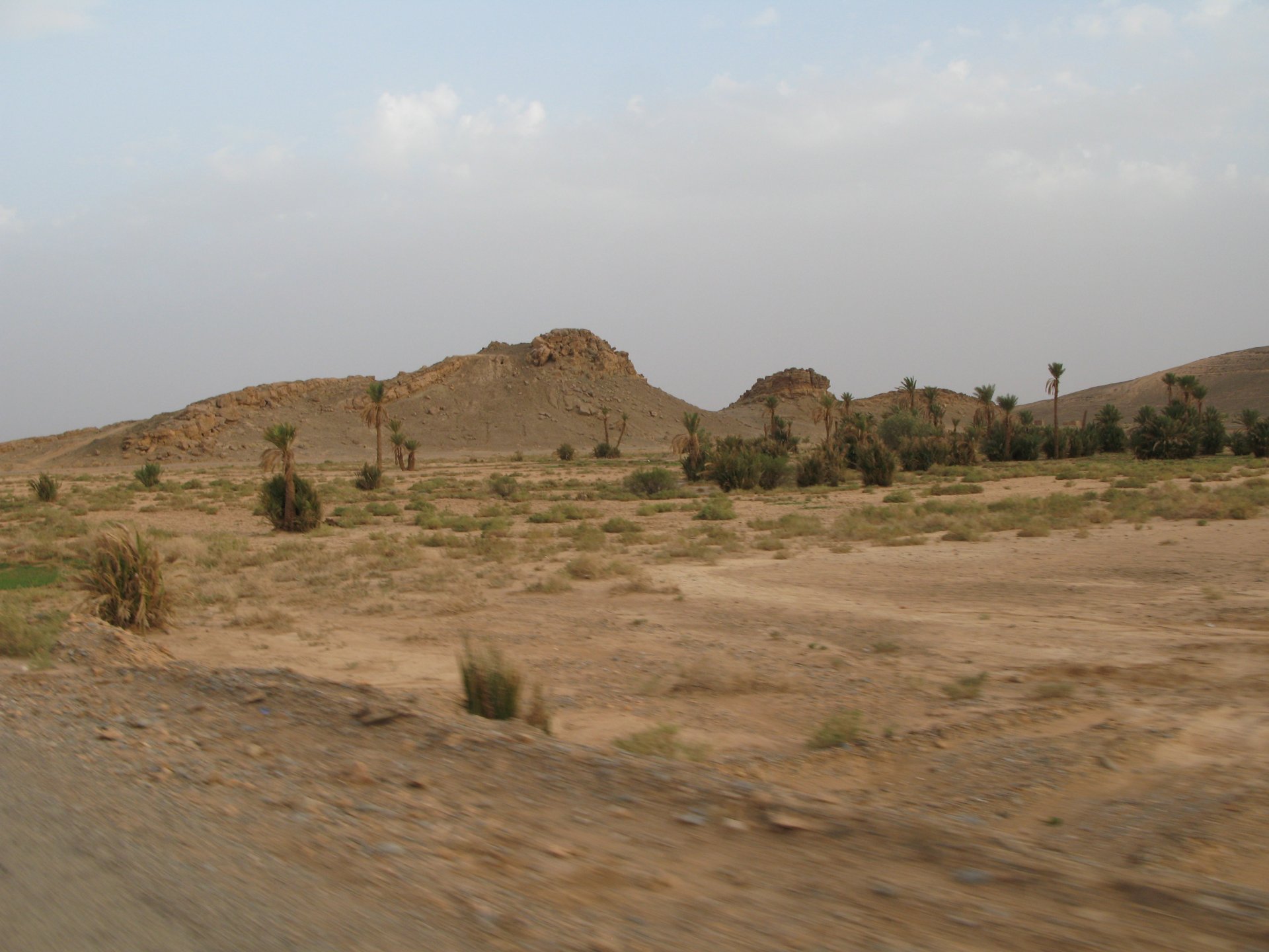 It had gotten cold(er) during the night so waking up in a cozy hay mattress felt like something from the movies. Morning light revealed what a great place we had slept in, and we had a great breakfast with the greatest view. There is nothing like a palm field in the desert, it's magnetic and comfortable. We rode off after drinking all the tea we could stomach and just as it was starting to warm a little. We needn't worry, as by the time we left the gorge and made it to Tinghir, only a few kms south, it was properly hot already: From Tinghir, we would go West and visit the Dades Gorges, maybe hook up a mountain (dirt) route back to the same place we slept in, before going to the Sahara. Going to the Dades Gorges was a great idea, we had a brief idea of desert heat before going back up to a gorge: I like the idea of that building up there in the rocks, that two years later we would sleep there. To the right of this tiny road was the most intense drop and views I've ever seen, pictures don't do it justice. After this amazing stretch of road it already lunch time and we needed a break, so found somewhere under a cool shade to sit and had some great lunch The restaurant owner quickly put our hopes to rest by telling us that the route we planned to go over wasn't passable. Apparently the same rains that washed the previous day's road and made this one not passable, with the difference that being dirt and on a cliff face the mud slide had really deleted any way through. Our plan quickly changed to heading back down the Gorge again, back to Tinghir and then onto the Sahara proper and to head towards the dunes. This would prove to be a little too long as we didn't know the Morocco Rally was about to start. Going back the Gorge du Dades And onto the open desert We stopped at Tinghir, for a cold drink in an air conditioned cafe, and decided where to go next. A booking was made for the golden dunes after Merzouga, a mere 200km away, shouldn't take a lot longer than 2 hours on the open desert. That was the plan, but we didn't factor getting lost, nor for the palm fields before Merzouga, and the complete darkness riding through those palms, and to top it all we didn't factor in that the Morocco Rally was about to start, and all rally jeeps and trucks would be coming back from the desert to Merzouga at night, going quite fast with a huge amount of lighting helping them. Quite scary. The plus, was looking at the desert's wide open spaces for the first time, and camel herds in the distance also for the first time. By the time we made it to the hotel, it was again too dark to appreciate the surroundings. As the hotel was located a few kms into a maze of pistes and google maps pointed it as being in the town's center, we were proper lost until someone showed us the way. This took an extra hour. Had a nice shower to wash the dust off, and tucked into a berber omelette and salad. I would have paid extra for a few cold beers, but no chance of that this time. The plan for the day after was for it to be a rest day. Sleep in the same place, just a ride around the area, and lounge a little drinking cold water and enjoying the desert and the dunes.