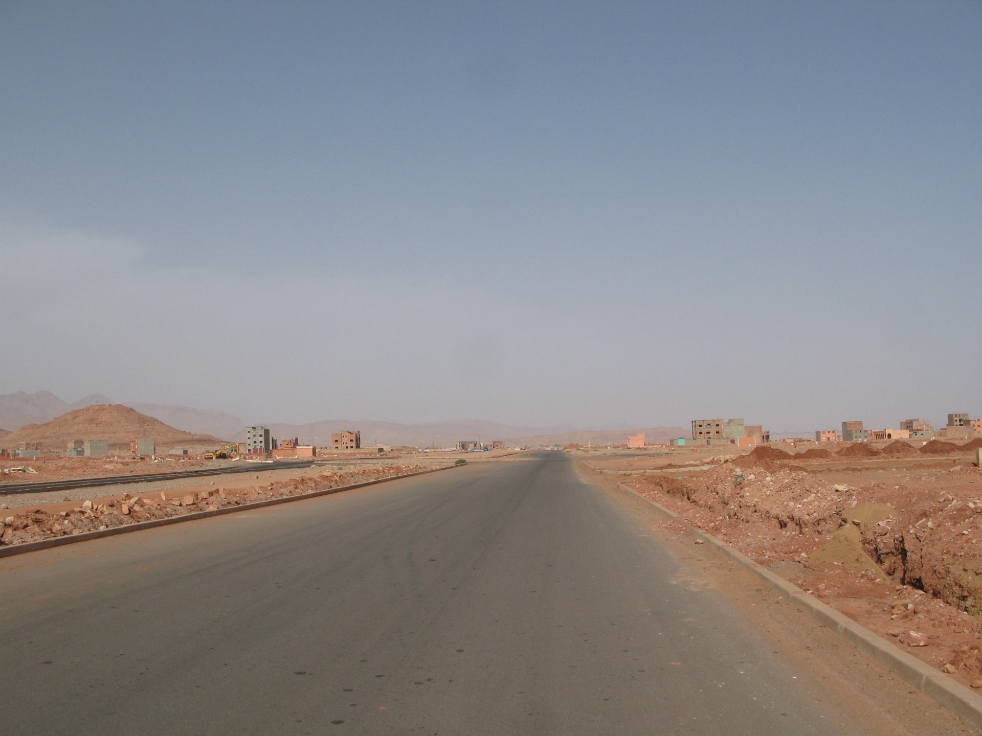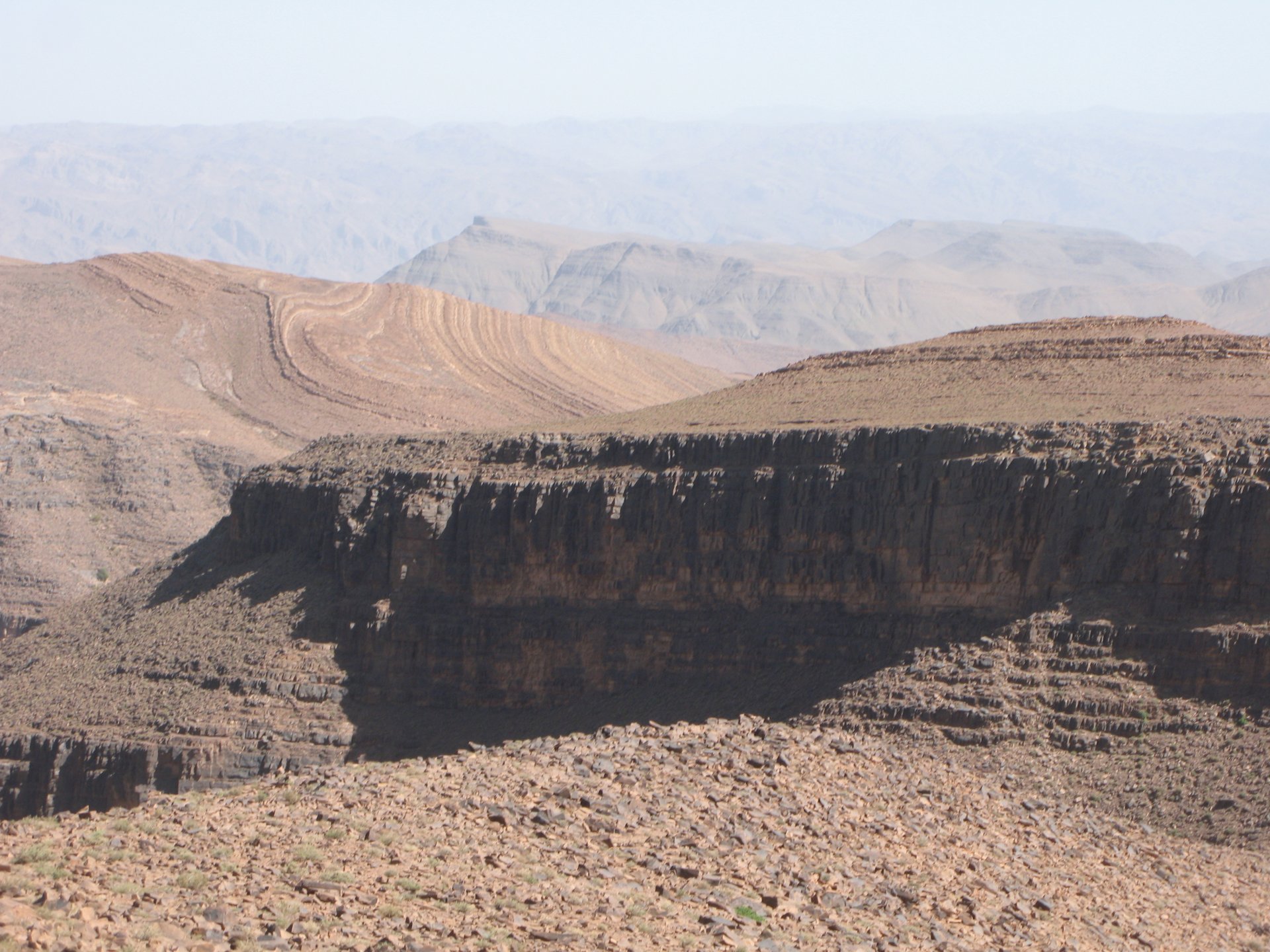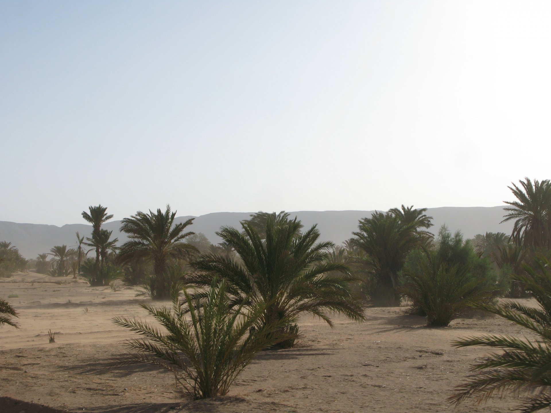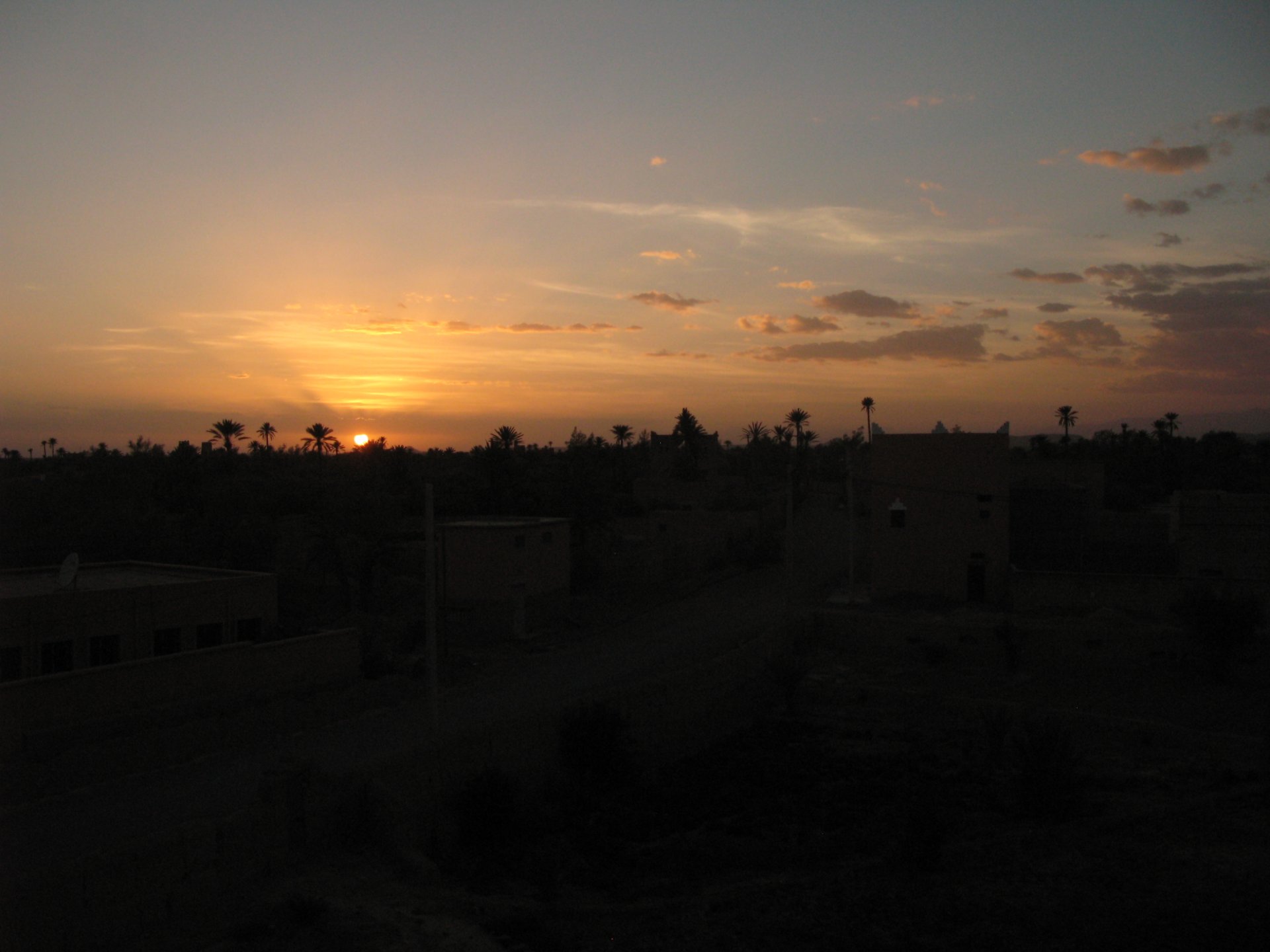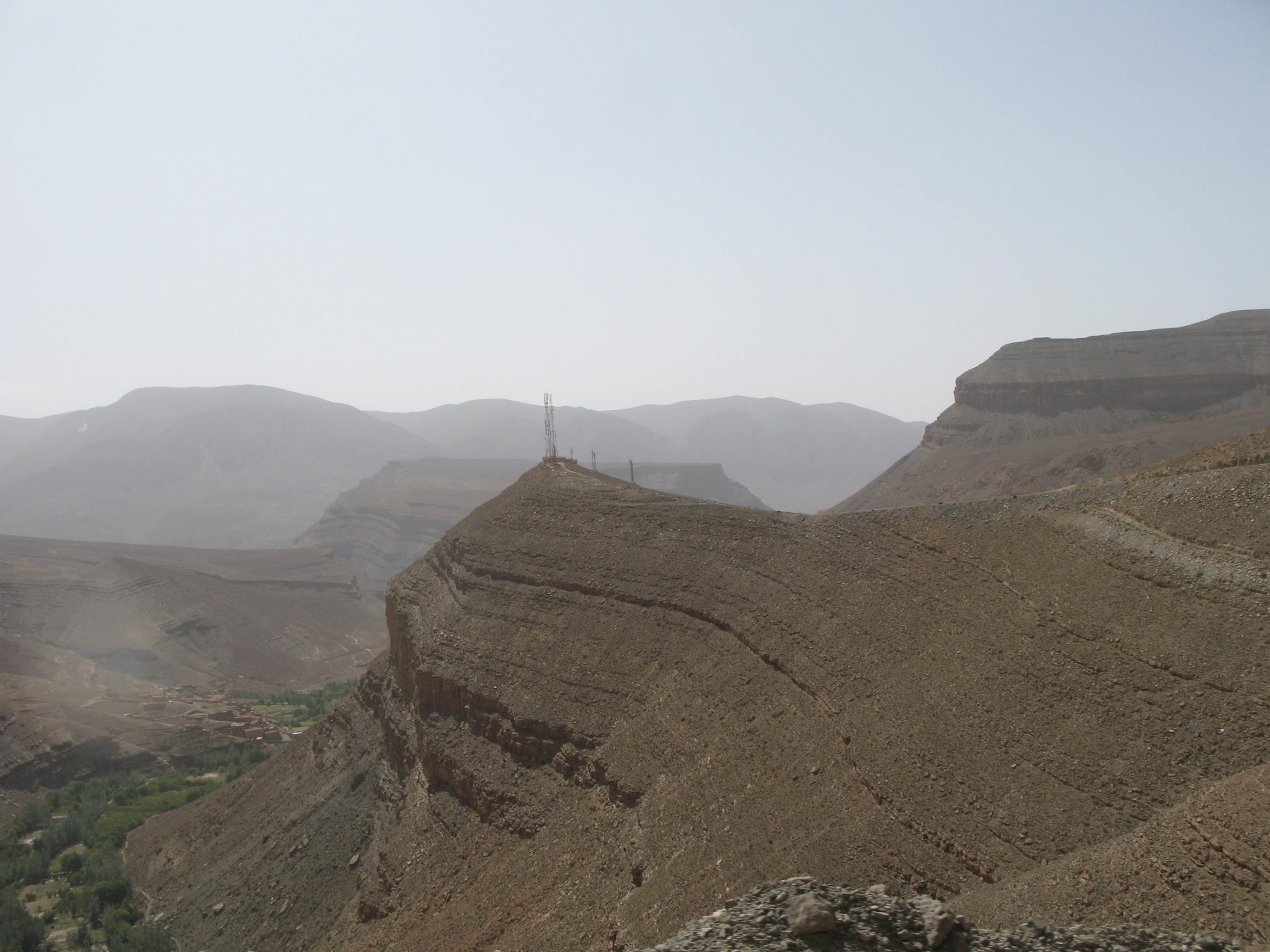 It had gotten cold(er) during the night so waking up in a cozy hay mattress felt like something from the movies. Morning light revealed what a great place we had slept in, and we had a great breakfast with the greatest view. There is nothing like a palm field in the desert, it's magnetic and comfortable. We rode off after drinking all the tea we could stomach and just as it was starting to warm a little. We needn't worry, as by the time we left the gorge and made it to Tinghir, only a few kms south, it was properly hot already: From Tinghir, we would go West and visit the Dades Gorges, maybe hook up a mountain (dirt) route back to the same place we slept in, before going to the Sahara. Going to the Dades Gorges was a great idea, we had a brief idea of desert heat before going back up to a gorge: I like the idea of that building up there in the rocks, that two years later we would sleep there. To the right of this tiny road was the most intense drop and views I've ever seen, pictures don't do it justice. After this amazing stretch of road it already lunch time and we needed a break, so found somewhere under a cool shade to sit and had some great lunch The restaurant owner quickly put our hopes to rest by telling us that the route we planned to go over wasn't passable. Apparently the same rains that washed the previous day's road and made this one not passable, with the difference that being dirt and on a cliff face the mud slide had really deleted any way through. Our plan quickly changed to heading back down the Gorge again, back to Tinghir and then onto the Sahara proper and to head towards the dunes. This would prove to be a little too long as we didn't know the Morocco Rally was about to start. Going back the Gorge du Dades And onto the open desert We stopped at Tinghir, for a cold drink in an air conditioned cafe, and decided where to go next. A booking was made for the golden dunes after Merzouga, a mere 200km away, shouldn't take a lot longer than 2 hours on the open desert. That was the plan, but we didn't factor getting lost, nor for the palm fields before Merzouga, and the complete darkness riding through those palms, and to top it all we didn't factor in that the Morocco Rally was about to start, and all rally jeeps and trucks would be coming back from the desert to Merzouga at night, going quite fast with a huge amount of lighting helping them. Quite scary. The plus, was looking at the desert's wide open spaces for the first time, and camel herds in the distance also for the first time. By the time we made it to the hotel, it was again too dark to appreciate the surroundings. As the hotel was located a few kms into a maze of pistes and google maps pointed it as being in the town's center, we were proper lost until someone showed us the way. This took an extra hour. Had a nice shower to wash the dust off, and tucked into a berber omelette and salad. I would have paid extra for a few cold beers, but no chance of that this time. The plan for the day after was for it to be a rest day. Sleep in the same place, just a ride around the area, and lounge a little drinking cold water and enjoying the desert and the dunes.