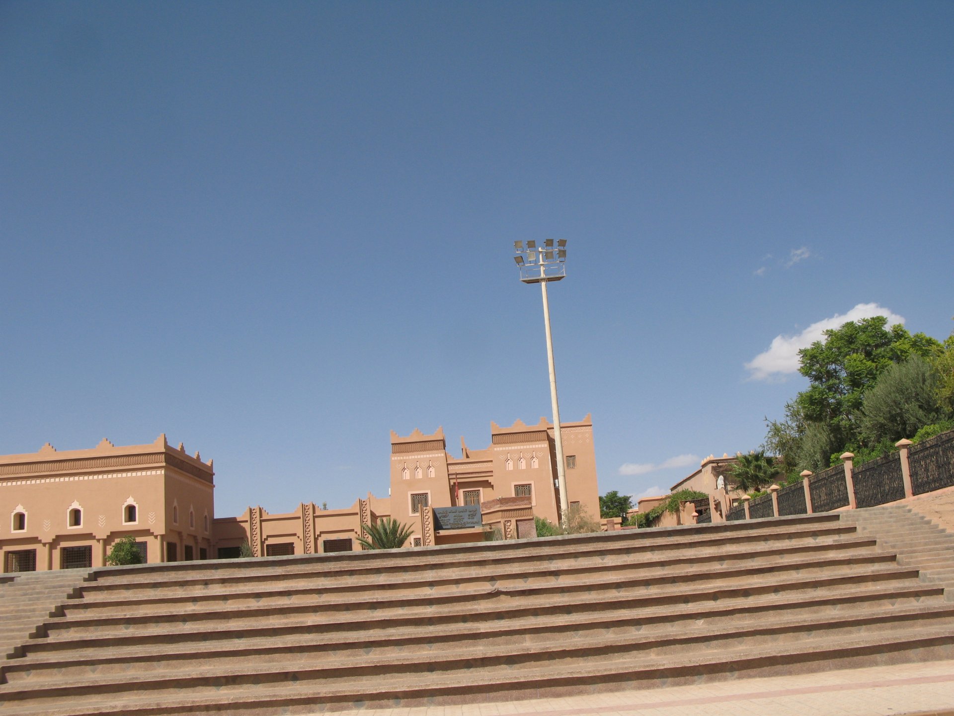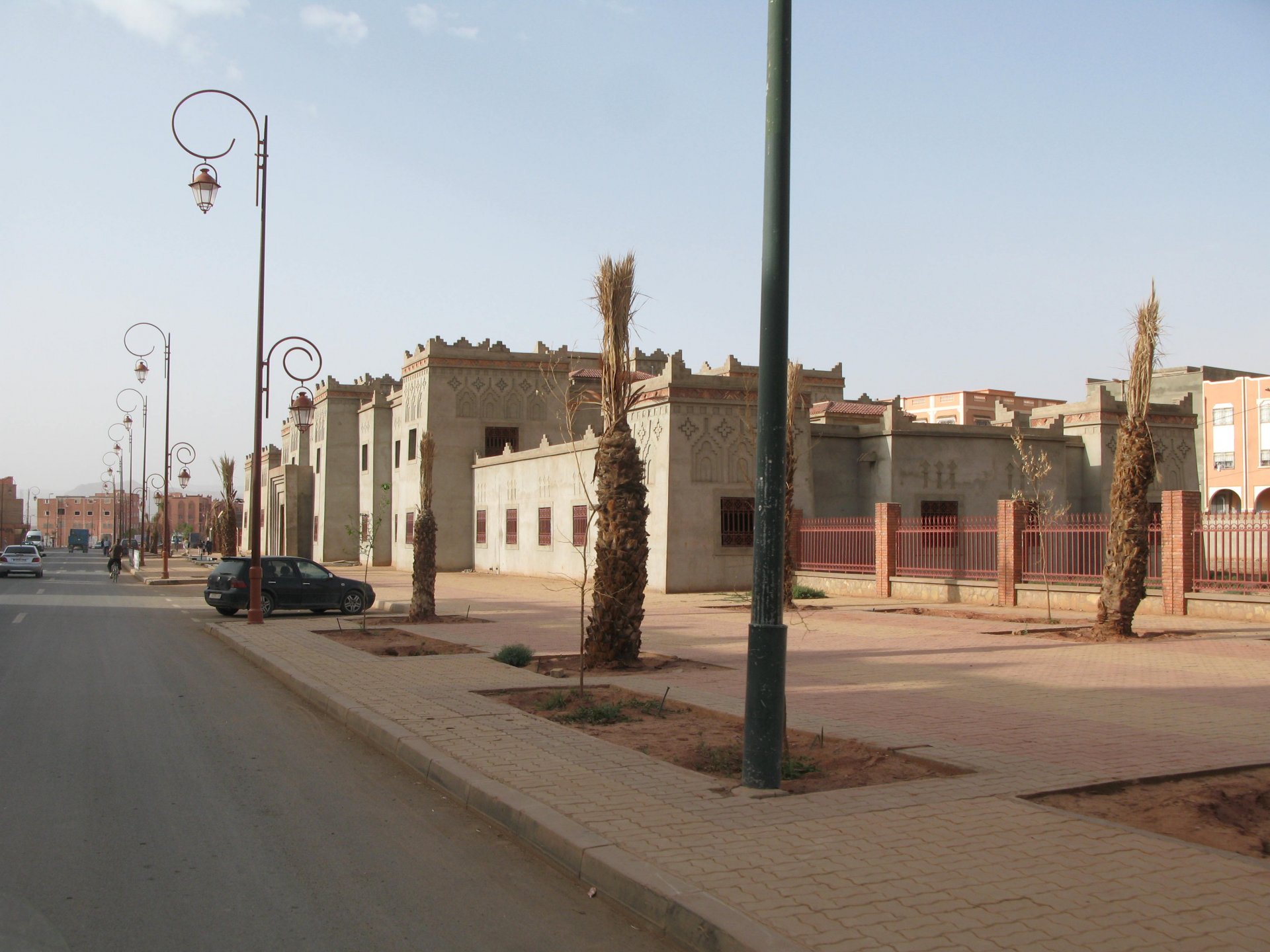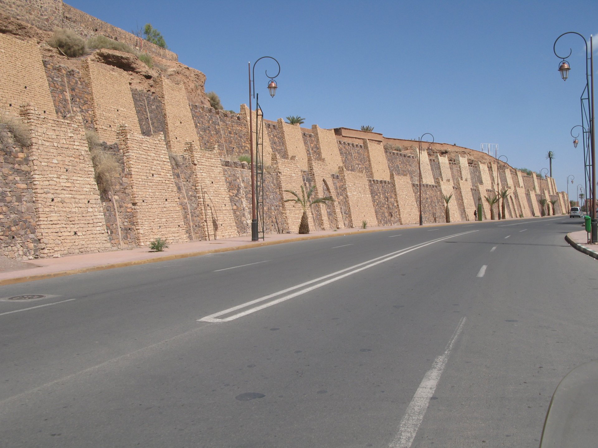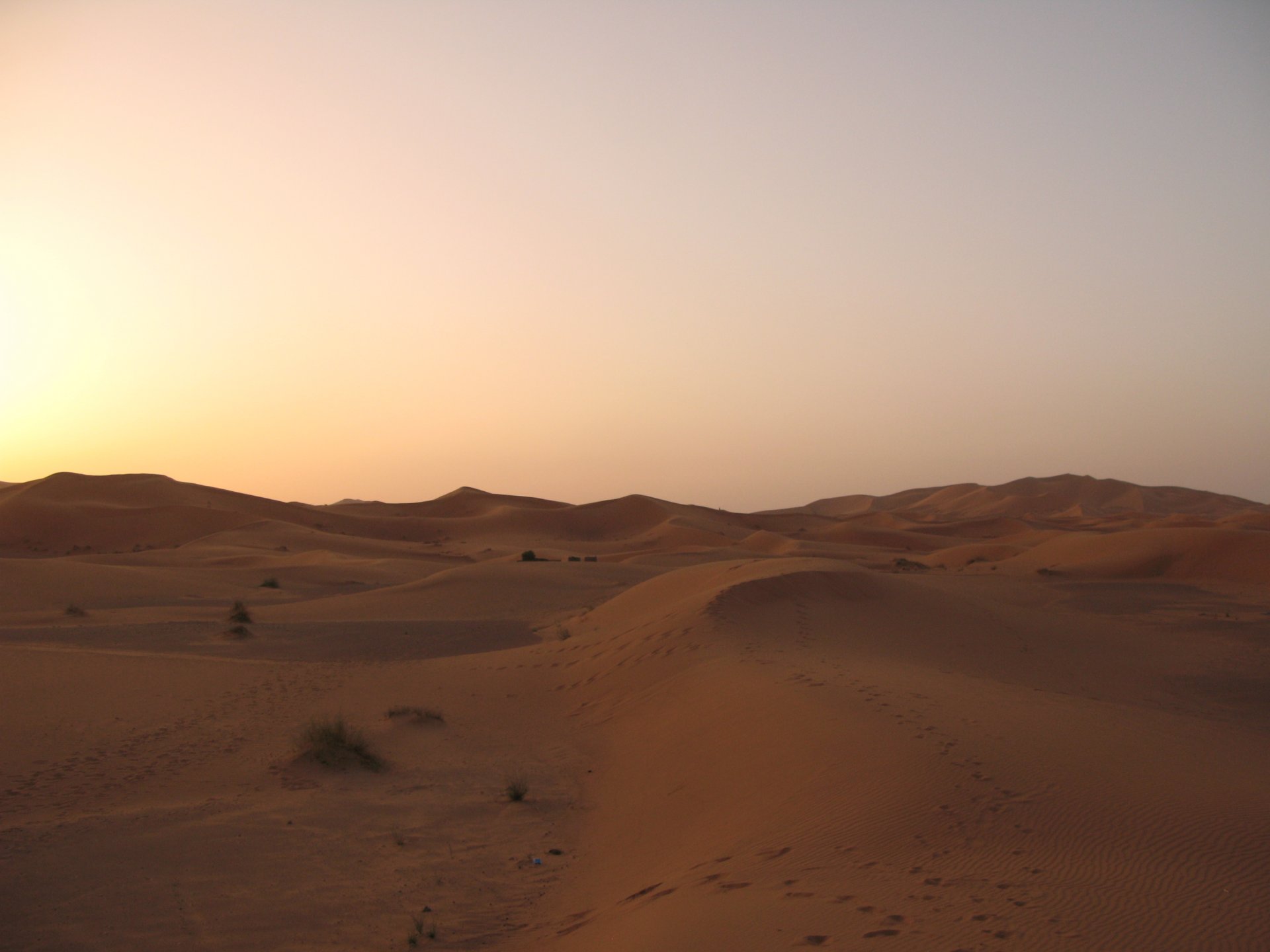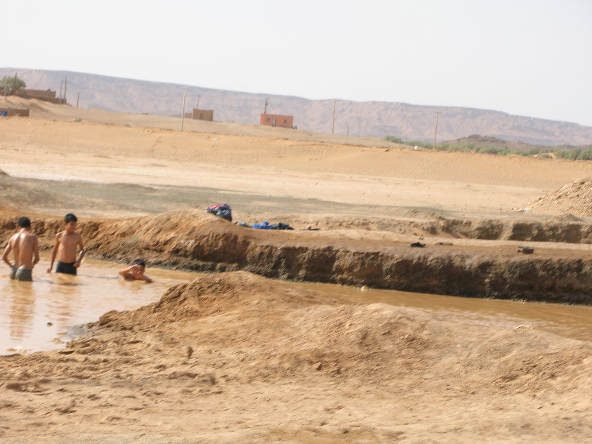 It had gotten cold(er) during the night so waking up in a cozy hay mattress felt like something from the movies. Morning light revealed what a great place we had slept in, and we had a great breakfast with the greatest view. There is nothing like a palm field in the desert, it's magnetic and comfortable. We rode off after drinking all the tea we could stomach and just as it was starting to warm a little. We needn't worry, as by the time we left the gorge and made it to Tinghir, only a few kms south, it was properly hot already: From Tinghir, we would go West and visit the Dades Gorges, maybe hook up a mountain (dirt) route back to the same place we slept in, before going to the Sahara. Going to the Dades Gorges was a great idea, we had a brief idea of desert heat before going back up to a gorge: I like the idea of that building up there in the rocks, that two years later we would sleep there. To the right of this tiny road was the most intense drop and views I've ever seen, pictures don't do it justice. After this amazing stretch of road it already lunch time and we needed a break, so found somewhere under a cool shade to sit and had some great lunch The restaurant owner quickly put our hopes to rest by telling us that the route we planned to go over wasn't passable. Apparently the same rains that washed the previous day's road and made this one not passable, with the difference that being dirt and on a cliff face the mud slide had really deleted any way through. Our plan quickly changed to heading back down the Gorge again, back to Tinghir and then onto the Sahara proper and to head towards the dunes. This would prove to be a little too long as we didn't know the Morocco Rally was about to start. Going back the Gorge du Dades And onto the open desert We stopped at Tinghir, for a cold drink in an air conditioned cafe, and decided where to go next. A booking was made for the golden dunes after Merzouga, a mere 200km away, shouldn't take a lot longer than 2 hours on the open desert. That was the plan, but we didn't factor getting lost, nor for the palm fields before Merzouga, and the complete darkness riding through those palms, and to top it all we didn't factor in that the Morocco Rally was about to start, and all rally jeeps and trucks would be coming back from the desert to Merzouga at night, going quite fast with a huge amount of lighting helping them. Quite scary. The plus, was looking at the desert's wide open spaces for the first time, and camel herds in the distance also for the first time. By the time we made it to the hotel, it was again too dark to appreciate the surroundings. As the hotel was located a few kms into a maze of pistes and google maps pointed it as being in the town's center, we were proper lost until someone showed us the way. This took an extra hour. Had a nice shower to wash the dust off, and tucked into a berber omelette and salad. I would have paid extra for a few cold beers, but no chance of that this time. The plan for the day after was for it to be a rest day. Sleep in the same place, just a ride around the area, and lounge a little drinking cold water and enjoying the desert and the dunes.
