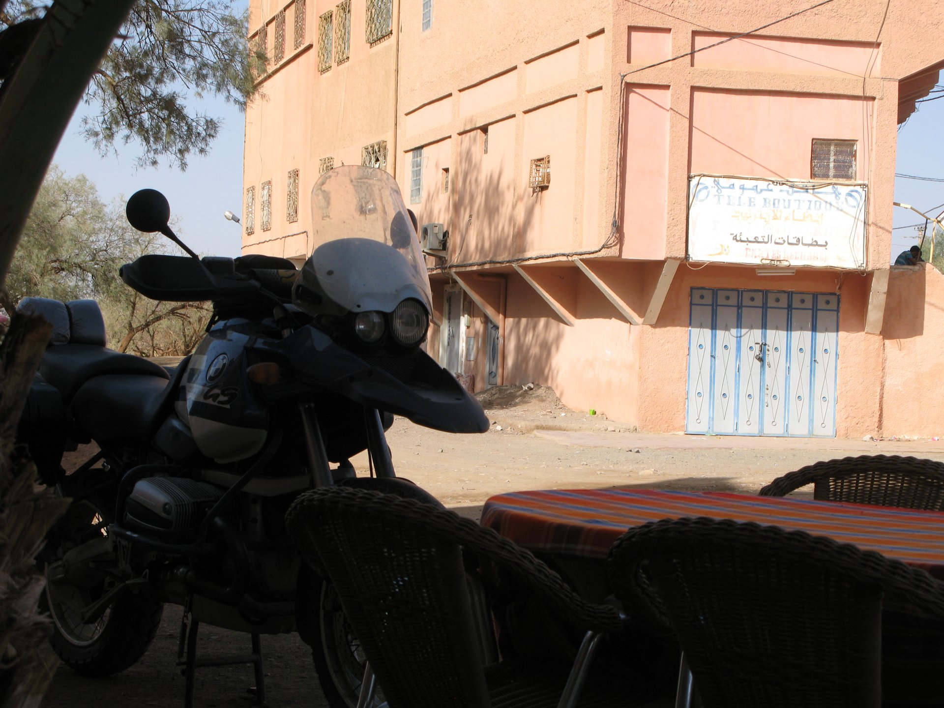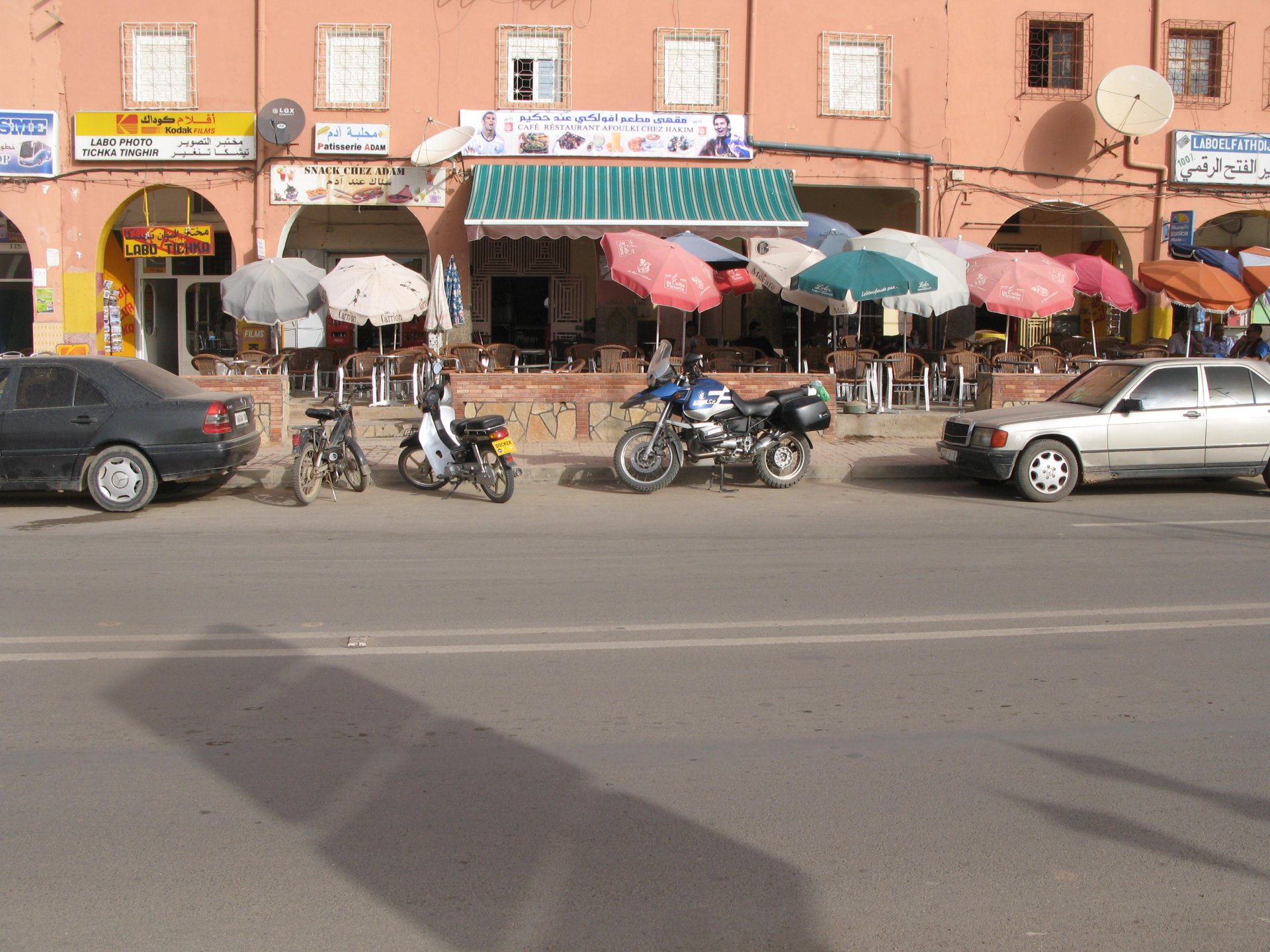 I will post 4 ride reports from Morocco, from the past, from 2014 to 2017. Here is the first. Early in 2014 I bought a BMW R1150GS, specifically to tour with Maria, my girlfriend. I had been without a road bike for a long time, ever since I had sold the Transalp, and we both felt like touring together. First trip had been to the Algarve, and served as a shakedown run, it was good fun, ever since I had updated some of my gear and the bike had been fitted with Heidenau K60 tires which offered a lot more confidence out of tarmac. Tires were fitted the previous day, so I wasn't too confident on them On the 27th, early morning we fueled up on our local gas station and I was feeling properly excited like a hardcore adventurer ? We travelled with a phone and a small camera, Maria used the camera to take most of the onboard pictures, the reason there are none from the road during the first two or three days is that I deleted them all one morning while checking the camera when waking up. We had about 8 or 900km to go to get to Tarifa and catch our Ferry. Had I not deleted the pictures we would have some great ones of us riding into a rain storm on the way there, and stopping under a motorway bridge to put our plastic overalls on. As such, there is only this one of a brief coffee stop in Portugal, before venturing into Spain and coffee instantly turning to shit. Weather was shit, but spirits were high. Like real VIPs, we rolled into Tarifa and into the port, must have waited no more than 10 minutes before arriving and passing a long line of cars, bikes being given priority into the Ferry. Maria, unquestionably the better half of us We messed around taking selfies and making videos such as this one, of me trying for the first time pack Maria's plastic rainsuit into it's own pocket. We thought we had all the time in the world, never having been on this boat we didn't know that customs immigration desk was aboard the boat, by the time we realized what the big line was about we had a nice long line to get behind of. At least you now have the rain suit video because of that. Getting off the ferry was easy, and customs were easy too, with just enough difficulty to make a newbie feel like an adventurer. We had booked a hotel in Tangier and only had a couple of km to ride to get to it. First meters into Morocco, for the first time: I'll never forget these minutes first entering this country, traffic was noisier, roundabouts weren't quite dealt with in the same fashion as in Europe, temperature was higher than when boarding the boat in Spain, you could smell Africa in more ways than one. I'm glad we have this short video, nothing really interesting to see but I remember how happy and fearless I felt doing this. Easily made our way to our hotel, securely parked the bike on a guarded parking, and checked in. I'm taking my time describing all this because it really felt like everything was new, from the way we were saluted when getting in, to the hotel decor itself, not European at all The room didn't share any of the grandeur of the lobby, so no picture of that A quick shower, a little rest, and we're off to have dinner and a walk. Also buying a mobile data card to use on Maria's phone. I loved leaving my own phone with an employee so that he dealt with everything while I was gone. Mercedes station wagon converted into a snail selling food van (just to clarify, snails as food): Made our way into the Medina, which was pretty busy, and went into a proper restaurant to have our first meal in Morocco, I was starving: Here I am waiting for my full tasting menu viewed from the second floor: First some soup and light entries Pastilla, which is a some of sweet and sour pastry, with lots of cinnamon outside and curry chicken or vegetables inside: I was full by the time the tajine arrived, but I had never lost a fight against a meal before and wasn't about to either. Furniture was built with no regard for industry standards, here are Maria's feet while sitting on the restaurant After dinner, we made our way back through some deserted streets and went to bed early. Noisy street outside the hotel, heat, and most of all excitement prevented me from falling asleep early and I must have stayed up until 2 or 3 AM thinking of what would happen the next day. Will continue later on.