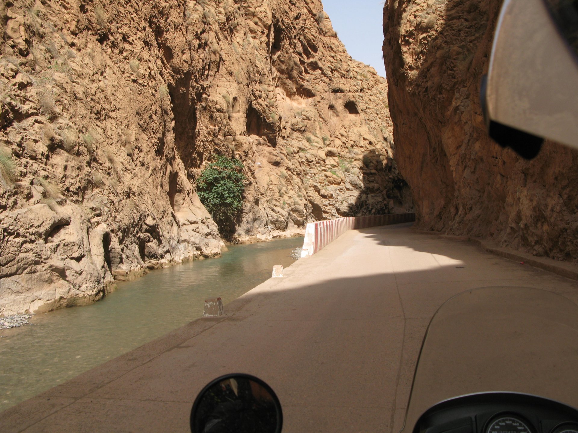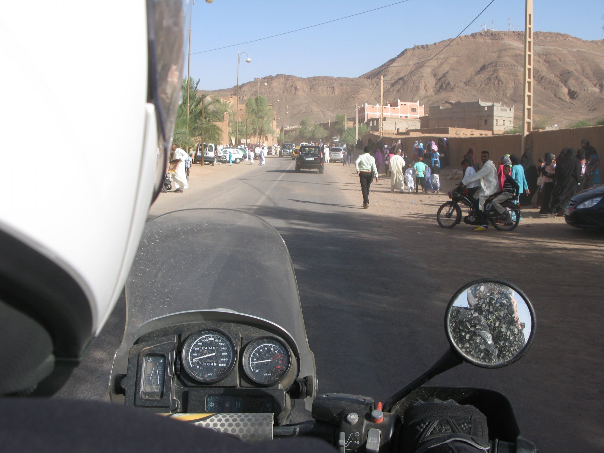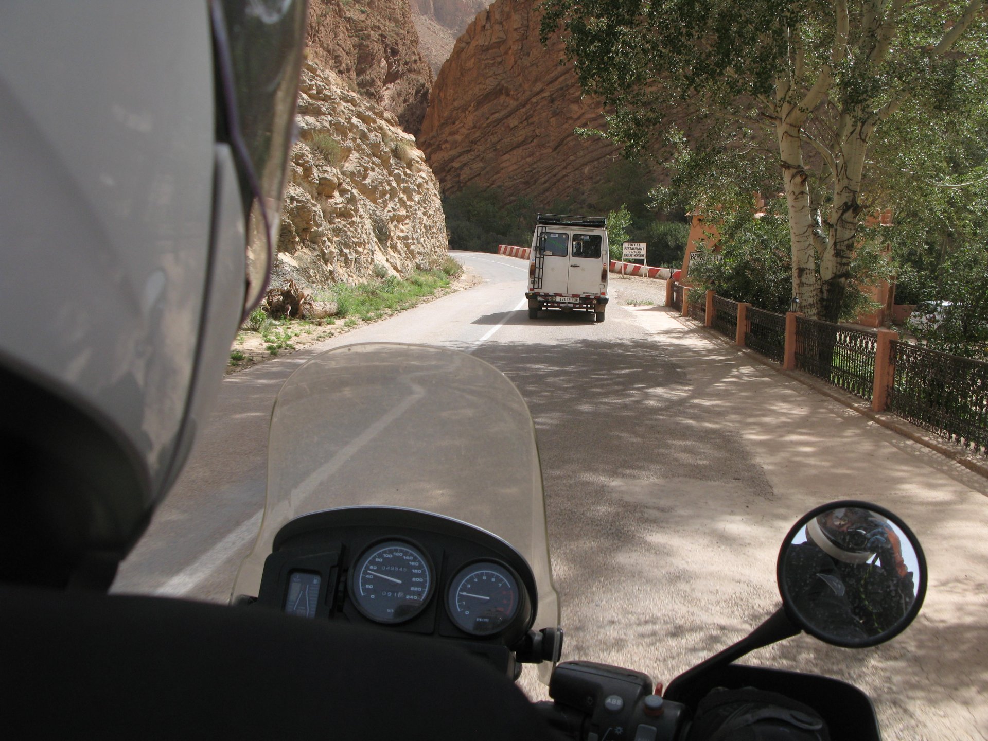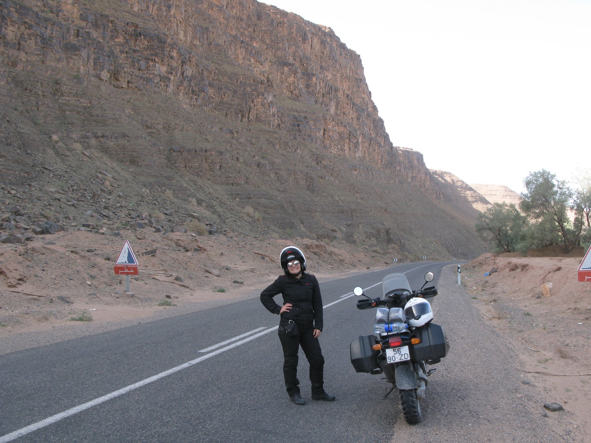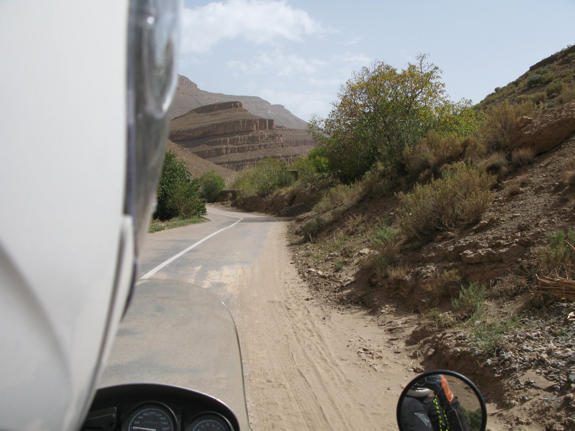 I apologize if there are too many pictures with crooked horizons, but Maria shot most of the onboard pictures one handed with a tiny camera, so you get what you pay for, I treasure them so I'm posting. I'm also making an effort to trim it down cause there are about 2000 pictures of this trip alone Next day, leaving near Midelt and the goal is to visit somewhere called Cirque de Jaaffar, just because it sounded epic. On the way we got sort of lost, and just decided to make our way to Imilchil, just because (to me) it sounded like some last frontier from Star Wars . We would be taking small roads, but as always is the case maps don't tell the terrain. First, some desolation And then we turned to the hills, to the Atlas, and it didn't disappoint. This is one of the best riding days of my life and also one of the ones which photos least tell the story. We started to make our way following a tiny road on one of Maria's maps, which to me were like some sort of dark magic, and the views were great and inspiring Passing through a few villages heading towards the mountains, we were pretty glad to follow this half dry riverbed, expect we came up to this: I walked a little along the riverbed, to see if there was any kind of road or path on the other side, but there wasn't. At least a full km had been washed out by the previous days' rains. My goal was never to try and do serious offroad with this heavy bike and a passenger, so we turned it down Instead went back a few kms and found a "detour" plate, and followed that road instead. Although it didn't appear in any of our maps it proved to be a nice one, and although not really deserted we rode for a long time with no other traffic whatsoever. High altitudes, high enough for me to be a little sick and feel weak. After a long climb to well over 3000m, I am feeling tired, and after a good couple of hours from the detour, we stop for a snack. The madeleines Maria decided to buy the previous day were very welcome. And we continued towards Imilchil ... Back then Maria didn't feel very much at ease on dirt without holding on so there weren't a lot of onboard pictured when riding on gravel. The road was very entertaining, lots of surface changes, whatever dirt there was was smooth enough and with plenty of moisture for grip but not mud, great stuff. After a while it started to get green and greener around us, and we started to drop in elevation, farming started to be more intense, and we were though the mountains and started arriving close to Imilchil. Roads in Morocco never lacking for drama: Arriving at Imilchil, turns out it is indeed a small village with a few shops, cafes, grilled food restaurants, basically a small mountain towing which everything converges. I felt like taking it in and maybe staying there as I was proper tired, but decided to oblige Maria who wasn't happy at all with staying in a one horse town for a few hours before sunset, and made way for the Gorges du Todra. As always, her choice would prove to be the right one Rolling on from Imilchil we were dropping in altitude, temperatures increasing slightly but rain also starting, so out came the plastic overcoats yet again. Views were ok What's happening now is that we're dropping from the mountains to desert level, though the gorges carved by rivers over centuries. These are the most touristy place in Morocco if you're driving or riding bikes, but between the weather and the hours at which we arrived, we managed to arrive with an amazing dying light and also nobody else around. It was unforgettable, plus you could smell the desert more and more. We had booked into a hotel right on the gorges, near the exit where the palm trees and houses are, and arrived right after dark. Parked the bike in the dude's maze warehouse, had a cold shower and a hot meal, and were very happy with it all.