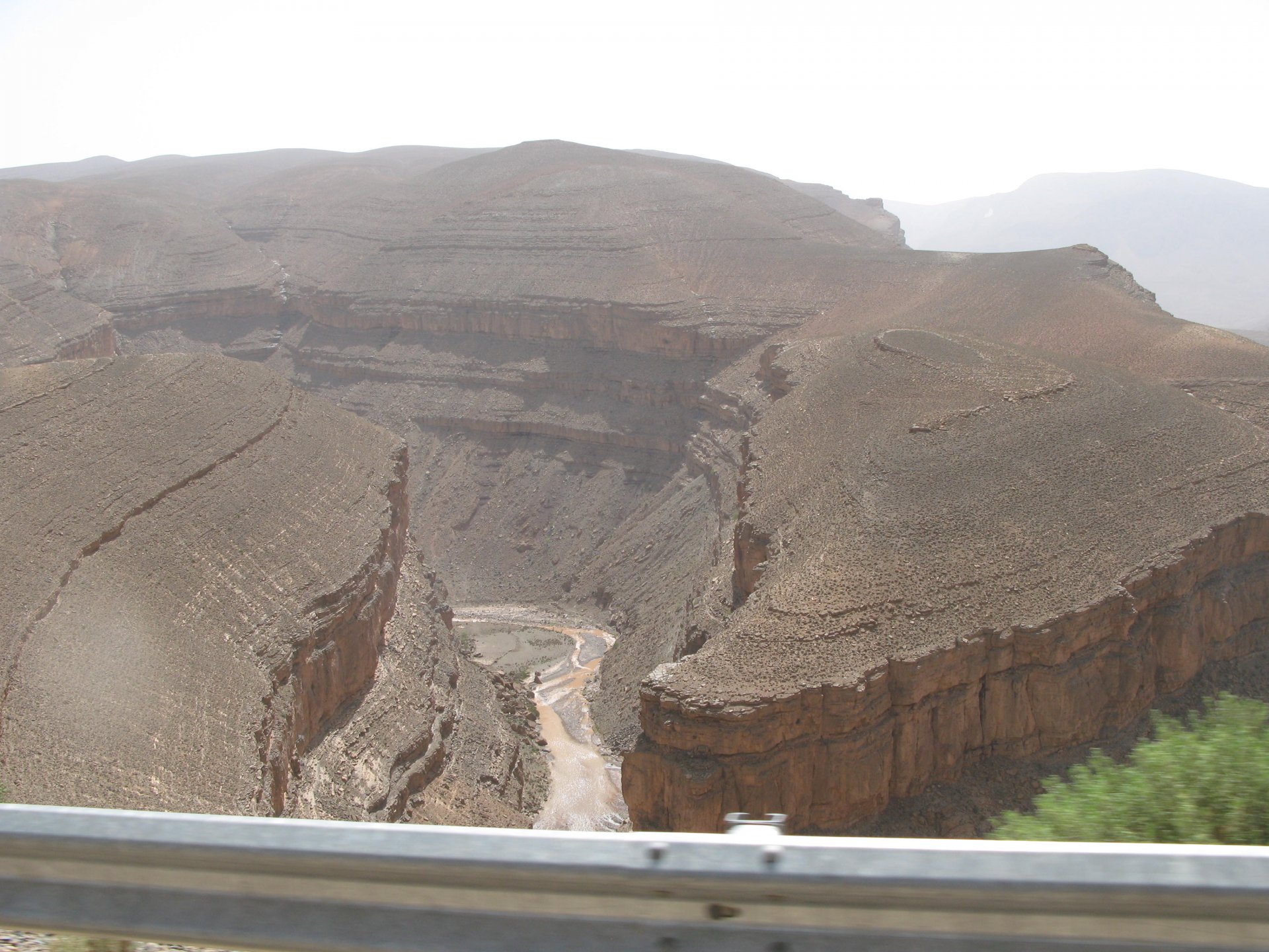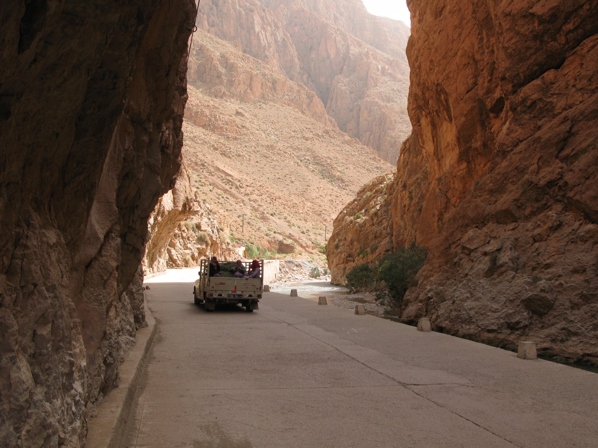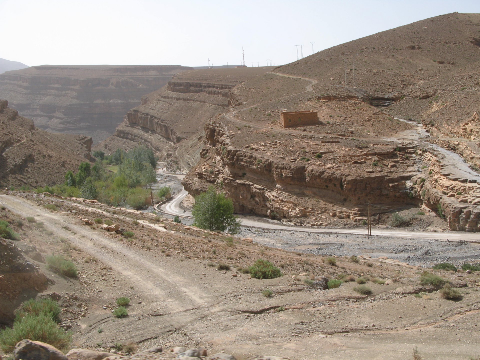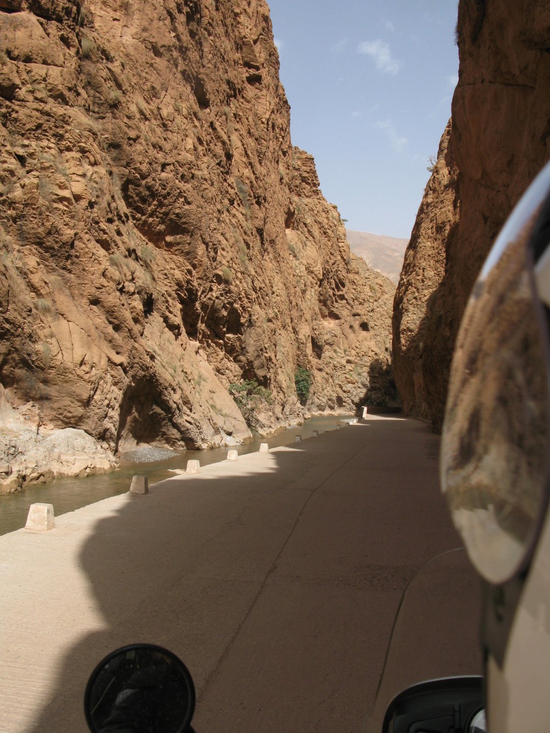 I apologize if there are too many pictures with crooked horizons, but Maria shot most of the onboard pictures one handed with a tiny camera, so you get what you pay for, I treasure them so I'm posting. I'm also making an effort to trim it down cause there are about 2000 pictures of this trip alone Next day, leaving near Midelt and the goal is to visit somewhere called Cirque de Jaaffar, just because it sounded epic. On the way we got sort of lost, and just decided to make our way to Imilchil, just because (to me) it sounded like some last frontier from Star Wars . We would be taking small roads, but as always is the case maps don't tell the terrain. First, some desolation And then we turned to the hills, to the Atlas, and it didn't disappoint. This is one of the best riding days of my life and also one of the ones which photos least tell the story. We started to make our way following a tiny road on one of Maria's maps, which to me were like some sort of dark magic, and the views were great and inspiring Passing through a few villages heading towards the mountains, we were pretty glad to follow this half dry riverbed, expect we came up to this: I walked a little along the riverbed, to see if there was any kind of road or path on the other side, but there wasn't. At least a full km had been washed out by the previous days' rains. My goal was never to try and do serious offroad with this heavy bike and a passenger, so we turned it down Instead went back a few kms and found a "detour" plate, and followed that road instead. Although it didn't appear in any of our maps it proved to be a nice one, and although not really deserted we rode for a long time with no other traffic whatsoever. High altitudes, high enough for me to be a little sick and feel weak. After a long climb to well over 3000m, I am feeling tired, and after a good couple of hours from the detour, we stop for a snack. The madeleines Maria decided to buy the previous day were very welcome. And we continued towards Imilchil ... Back then Maria didn't feel very much at ease on dirt without holding on so there weren't a lot of onboard pictured when riding on gravel. The road was very entertaining, lots of surface changes, whatever dirt there was was smooth enough and with plenty of moisture for grip but not mud, great stuff. After a while it started to get green and greener around us, and we started to drop in elevation, farming started to be more intense, and we were though the mountains and started arriving close to Imilchil. Roads in Morocco never lacking for drama: Arriving at Imilchil, turns out it is indeed a small village with a few shops, cafes, grilled food restaurants, basically a small mountain towing which everything converges. I felt like taking it in and maybe staying there as I was proper tired, but decided to oblige Maria who wasn't happy at all with staying in a one horse town for a few hours before sunset, and made way for the Gorges du Todra. As always, her choice would prove to be the right one Rolling on from Imilchil we were dropping in altitude, temperatures increasing slightly but rain also starting, so out came the plastic overcoats yet again. Views were ok What's happening now is that we're dropping from the mountains to desert level, though the gorges carved by rivers over centuries. These are the most touristy place in Morocco if you're driving or riding bikes, but between the weather and the hours at which we arrived, we managed to arrive with an amazing dying light and also nobody else around. It was unforgettable, plus you could smell the desert more and more. We had booked into a hotel right on the gorges, near the exit where the palm trees and houses are, and arrived right after dark. Parked the bike in the dude's maze warehouse, had a cold shower and a hot meal, and were very happy with it all.