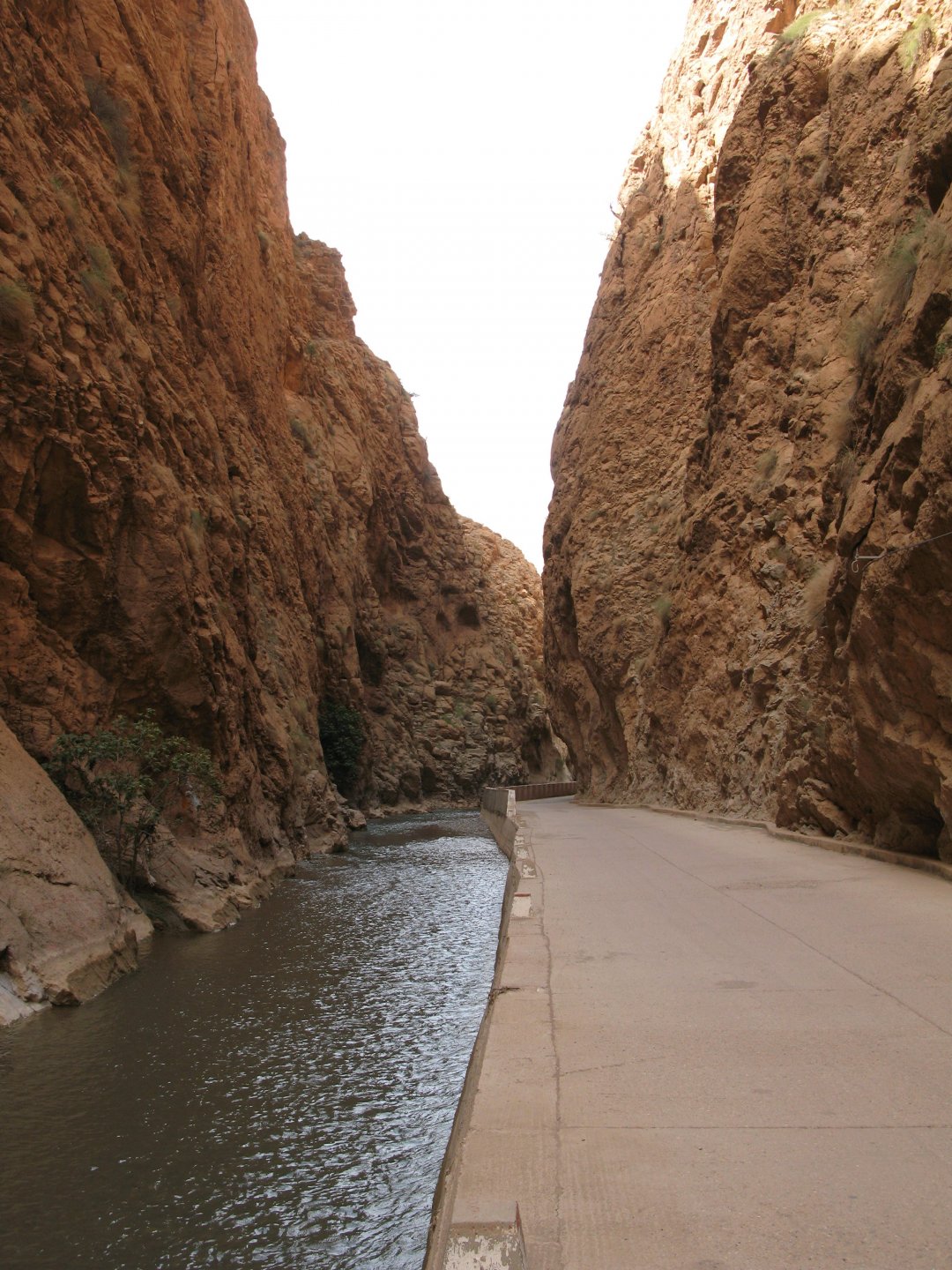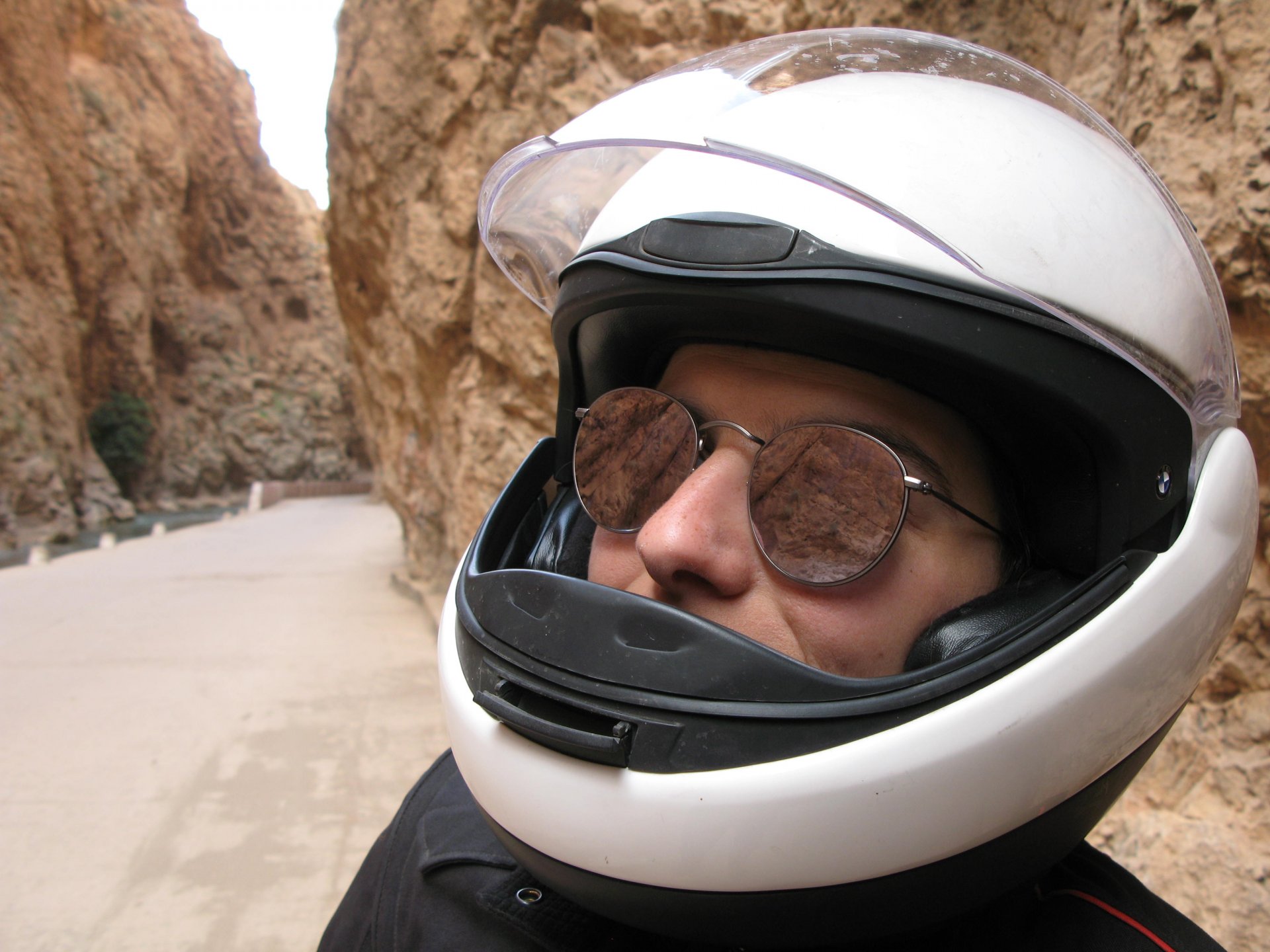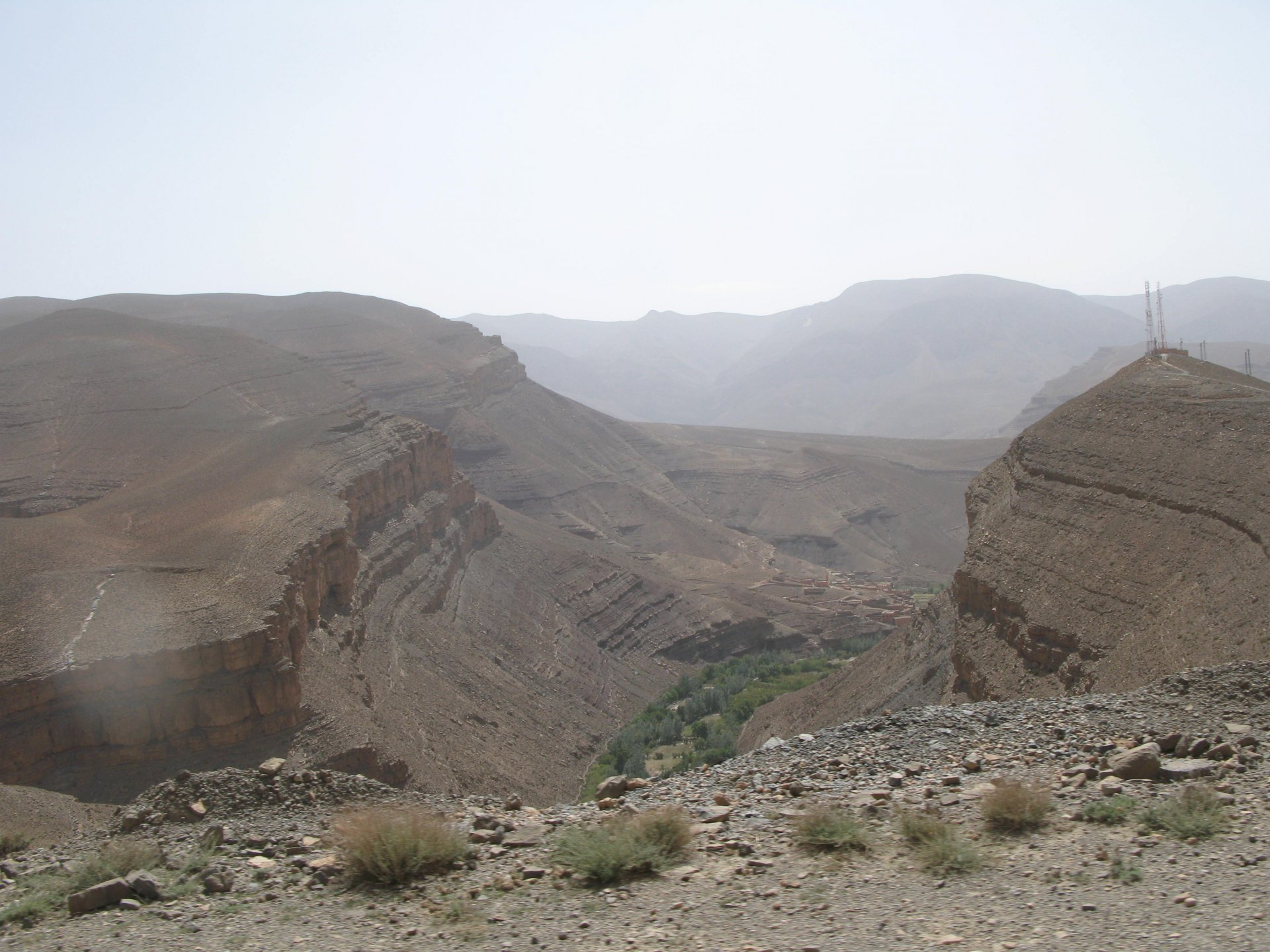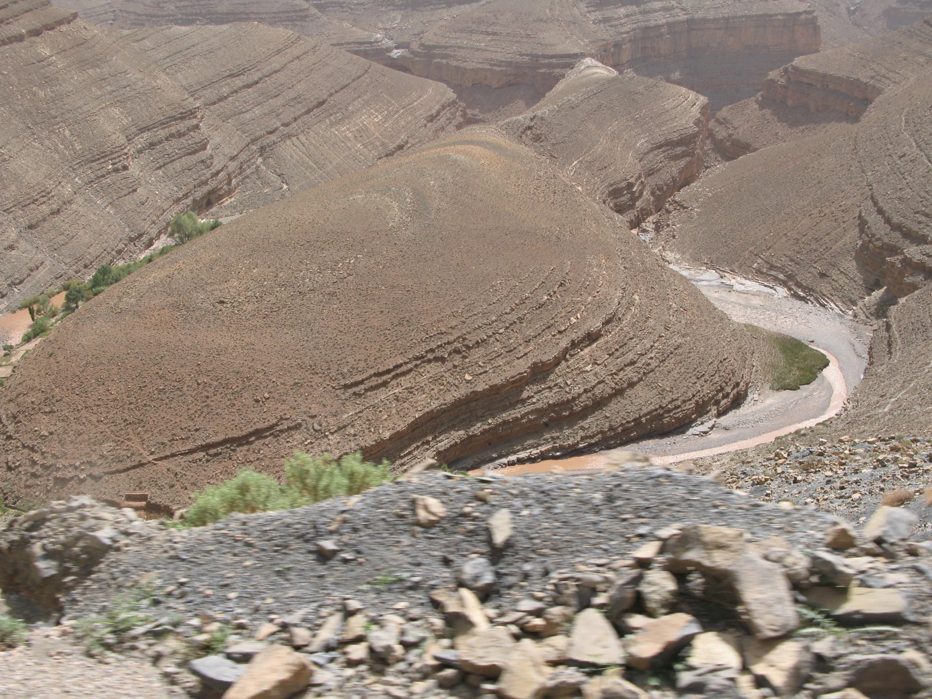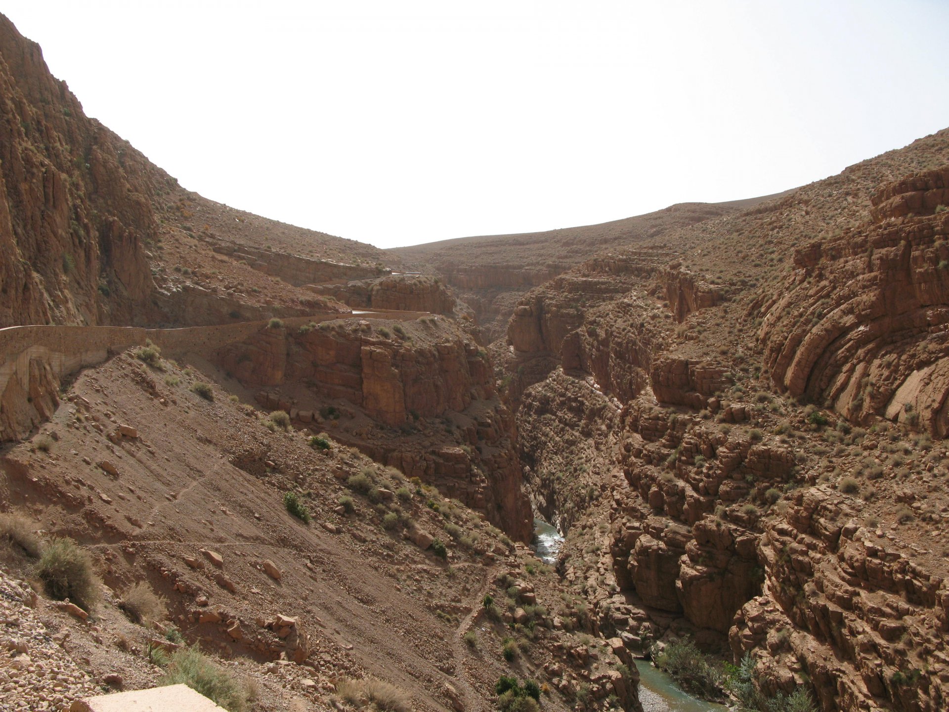 I apologize if there are too many pictures with crooked horizons, but Maria shot most of the onboard pictures one handed with a tiny camera, so you get what you pay for, I treasure them so I'm posting. I'm also making an effort to trim it down cause there are about 2000 pictures of this trip alone Next day, leaving near Midelt and the goal is to visit somewhere called Cirque de Jaaffar, just because it sounded epic. On the way we got sort of lost, and just decided to make our way to Imilchil, just because (to me) it sounded like some last frontier from Star Wars . We would be taking small roads, but as always is the case maps don't tell the terrain. First, some desolation And then we turned to the hills, to the Atlas, and it didn't disappoint. This is one of the best riding days of my life and also one of the ones which photos least tell the story. We started to make our way following a tiny road on one of Maria's maps, which to me were like some sort of dark magic, and the views were great and inspiring Passing through a few villages heading towards the mountains, we were pretty glad to follow this half dry riverbed, expect we came up to this: I walked a little along the riverbed, to see if there was any kind of road or path on the other side, but there wasn't. At least a full km had been washed out by the previous days' rains. My goal was never to try and do serious offroad with this heavy bike and a passenger, so we turned it down Instead went back a few kms and found a "detour" plate, and followed that road instead. Although it didn't appear in any of our maps it proved to be a nice one, and although not really deserted we rode for a long time with no other traffic whatsoever. High altitudes, high enough for me to be a little sick and feel weak. After a long climb to well over 3000m, I am feeling tired, and after a good couple of hours from the detour, we stop for a snack. The madeleines Maria decided to buy the previous day were very welcome. And we continued towards Imilchil ... Back then Maria didn't feel very much at ease on dirt without holding on so there weren't a lot of onboard pictured when riding on gravel. The road was very entertaining, lots of surface changes, whatever dirt there was was smooth enough and with plenty of moisture for grip but not mud, great stuff. After a while it started to get green and greener around us, and we started to drop in elevation, farming started to be more intense, and we were though the mountains and started arriving close to Imilchil. Roads in Morocco never lacking for drama: Arriving at Imilchil, turns out it is indeed a small village with a few shops, cafes, grilled food restaurants, basically a small mountain towing which everything converges. I felt like taking it in and maybe staying there as I was proper tired, but decided to oblige Maria who wasn't happy at all with staying in a one horse town for a few hours before sunset, and made way for the Gorges du Todra. As always, her choice would prove to be the right one Rolling on from Imilchil we were dropping in altitude, temperatures increasing slightly but rain also starting, so out came the plastic overcoats yet again. Views were ok What's happening now is that we're dropping from the mountains to desert level, though the gorges carved by rivers over centuries. These are the most touristy place in Morocco if you're driving or riding bikes, but between the weather and the hours at which we arrived, we managed to arrive with an amazing dying light and also nobody else around. It was unforgettable, plus you could smell the desert more and more. We had booked into a hotel right on the gorges, near the exit where the palm trees and houses are, and arrived right after dark. Parked the bike in the dude's maze warehouse, had a cold shower and a hot meal, and were very happy with it all.