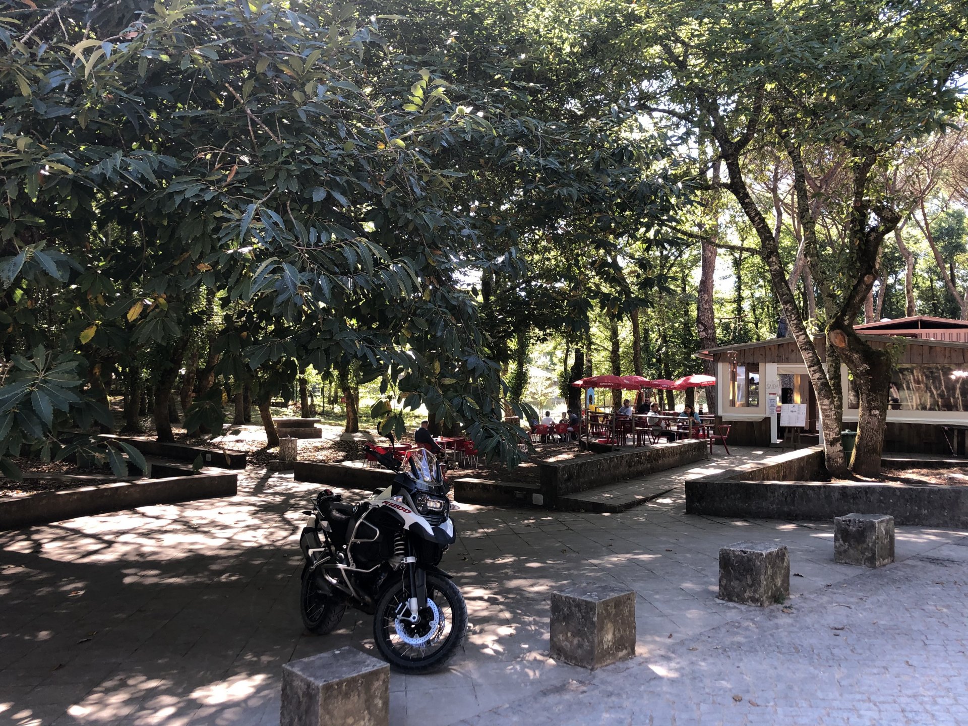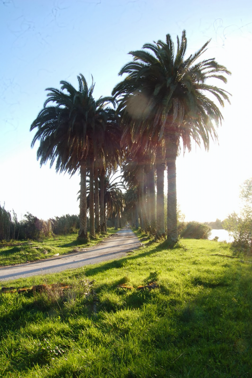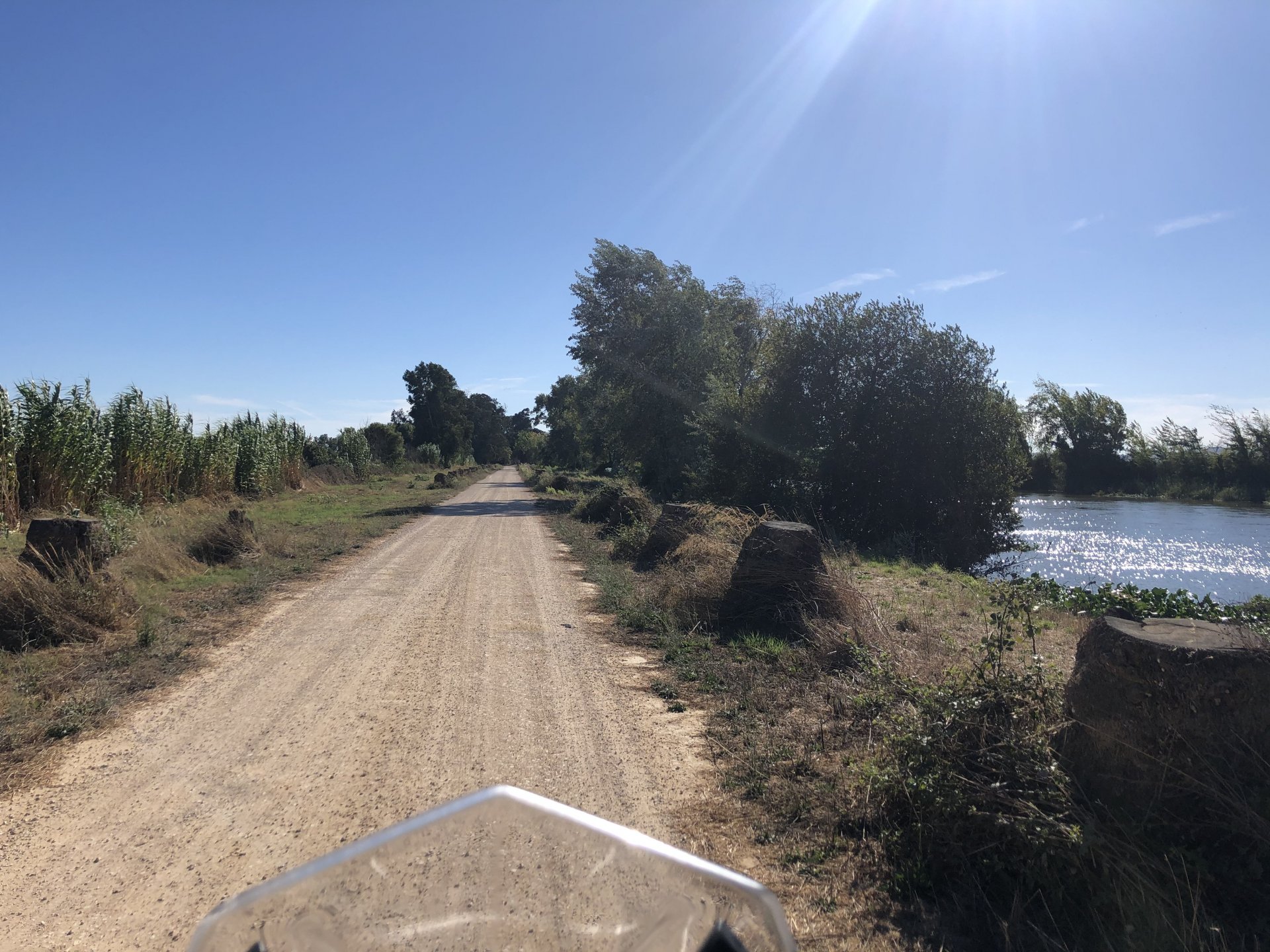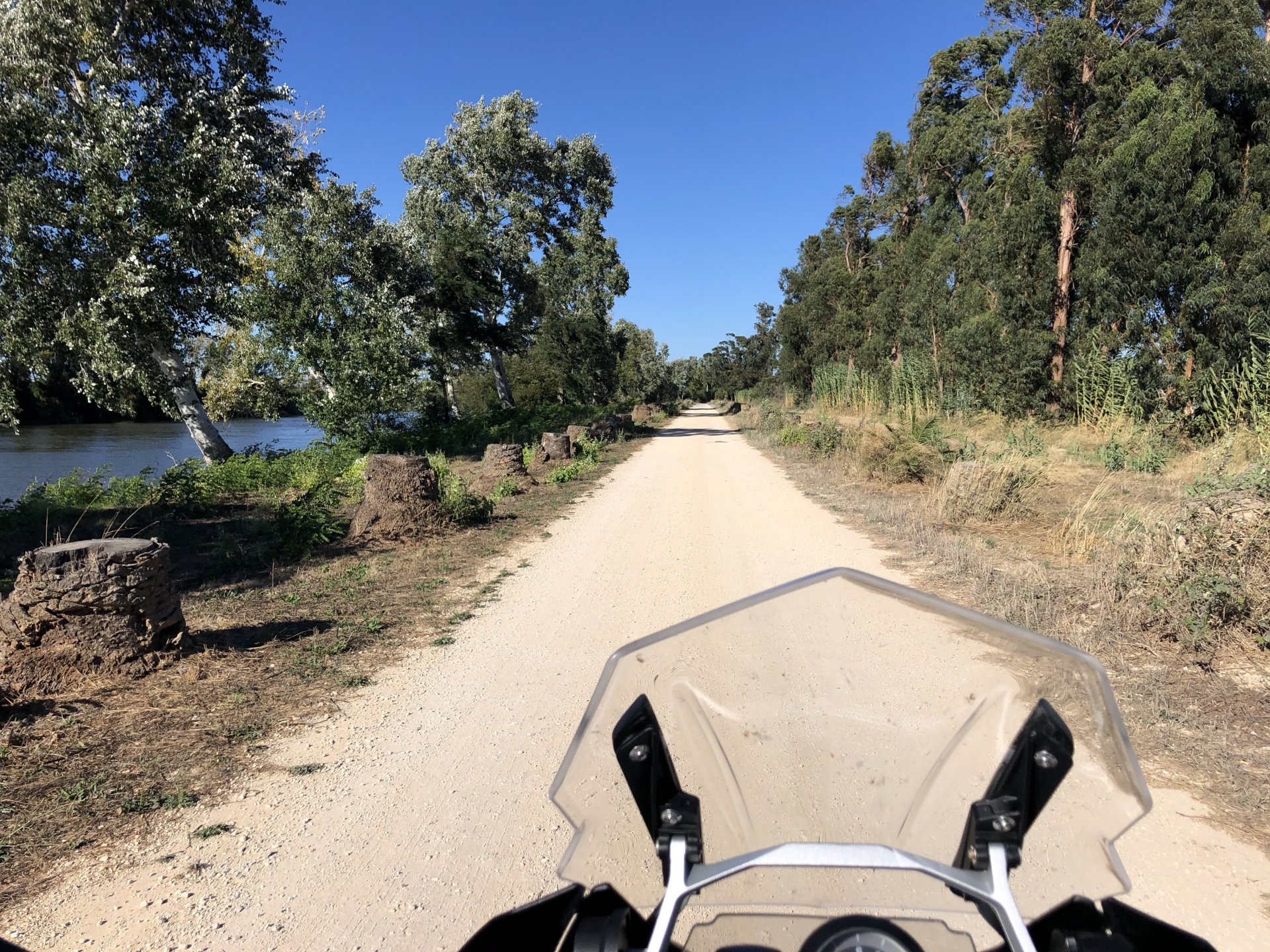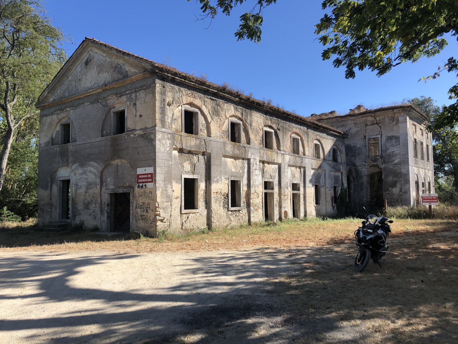 I was being sort of lazy after lunch, a few work e-mails and then started to think of just staying home snoozing instead of going out for my ride. Made an effort thinking it would be the first time I would be riding my familiar roads with the new suspension. At first thought of visiting a friend but didn't really feel like being with anyone and headed for the hills. On the way up, this is maybe my favourite piece of 2km road in this area, bumpy on tight corners with tree roots lifting the tarmac, unfortunately you can't see any of that in this video: Had a good cup of coffee in my favourite cafe up there, regardless of how hot the weather is at my home, up here under these trees it's always nice. A few bikes turn here on sundays, but it's always calm on week days. Heading back down: Someone left a nice couple of circles, I wouldn't be brave enough to do that here. Back in Azambuja I decided to make this a sort of dark motorcycling themed thing as it was a little to early to go home and I felt like taking a little more advantage of the afternoon, ended up with more of a ruin motorcycling than dark. Went to visit the Palacio das Obras Novas (also known as Palacio da Rainha, queen's palace), this building was erected in the end of the eighteenth century and acted as a control point for ship that used to travel in this canal between Lisbon and Vila Nova de Constancia. They had a hotel or an inn of sorts as support for the steam boat traffic, but since the surrounding area was pretty majestic it attracted important guests for long stays, becoming well know for Kind D.Carlos enjoyment of the place. (There you go, culture!) The road leading to it goes through tomato fields, but the last straight used to be lined with a very impressive row of huge palm trees, all gone now from a palm tree beetle infestation a few years ago: Before the bugs ate the palm trees it used to look like this, not my picture: Riding back, past a few trailers full of tomatoes ready to go for the local tomato juice factory, most of the tomato pulp in Portugal is made here. They might be a little overloaded Made it back home pretty dusty.