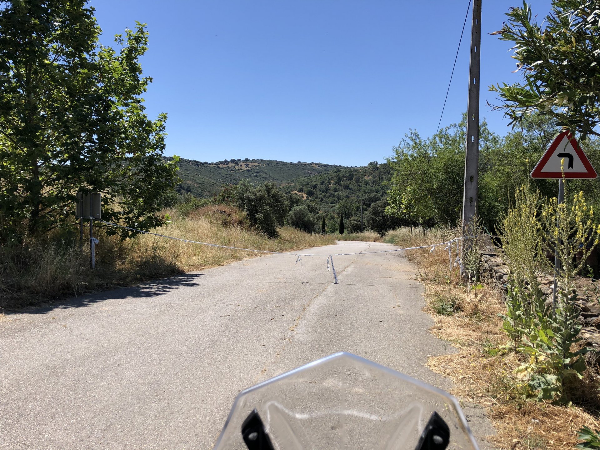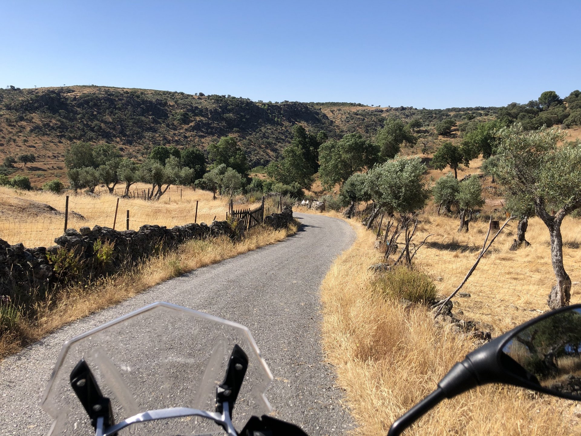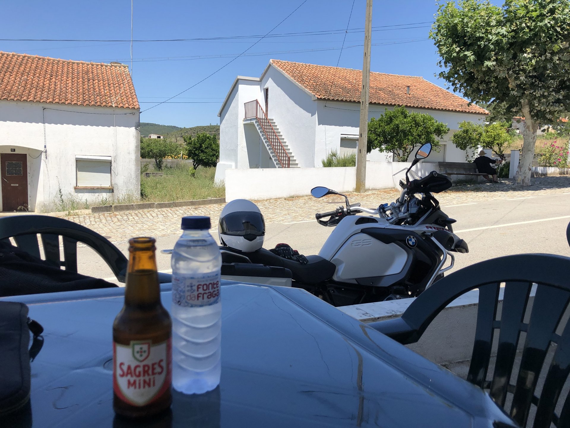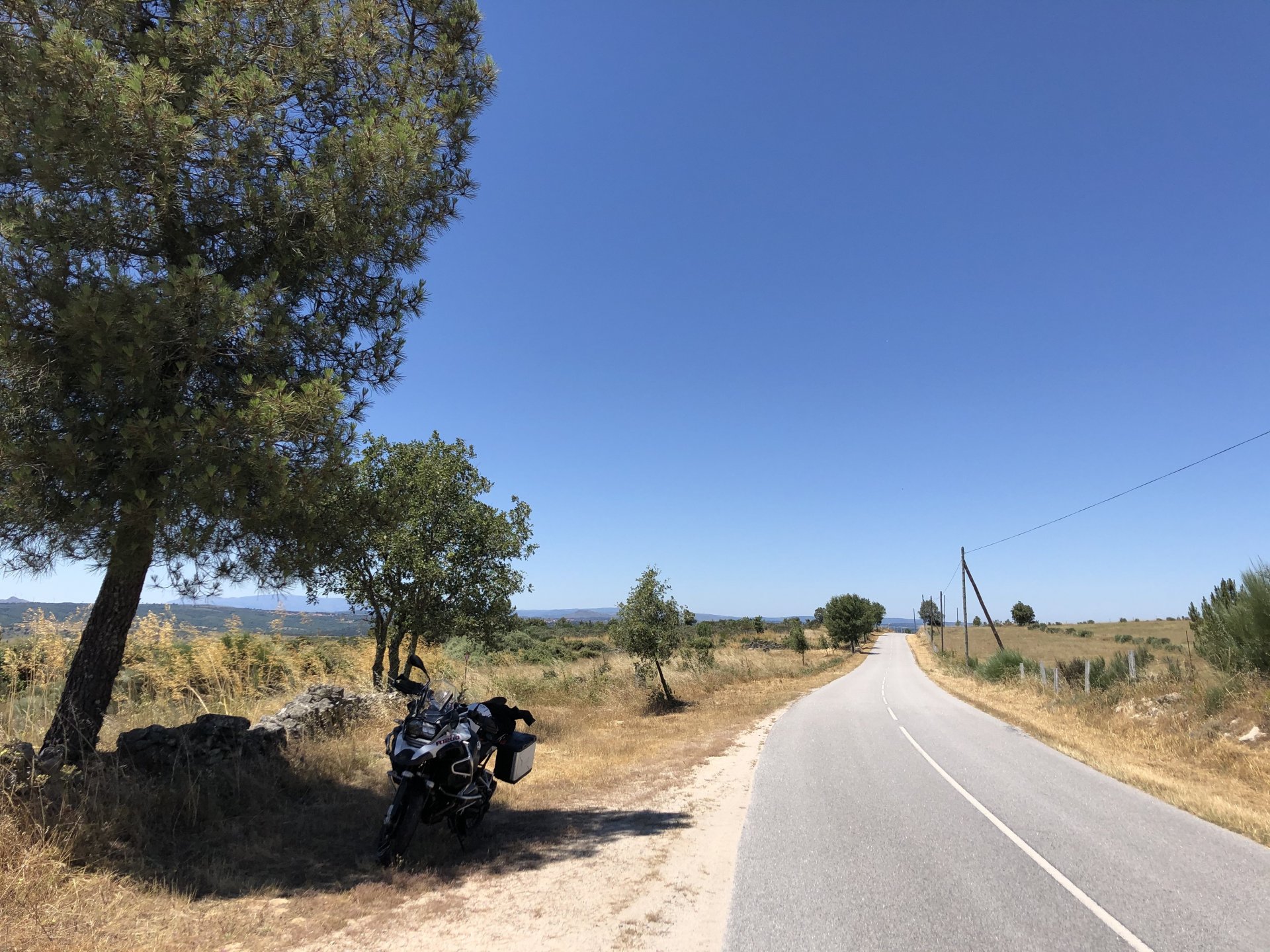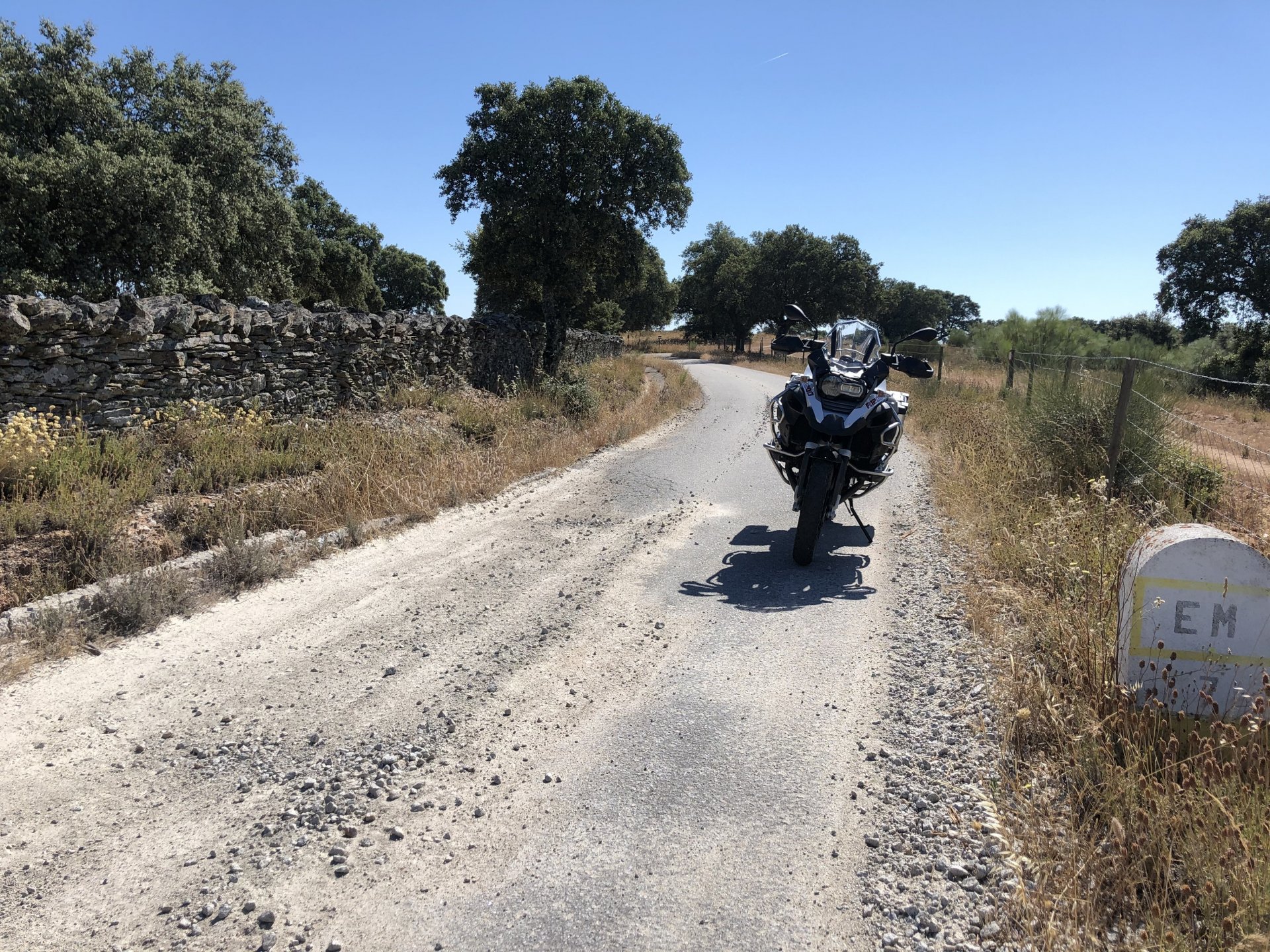 So, yesterday started well, not very warm by the time I left the hotel at around 9am, made my way to find some petrol as the bike was on reserve and in this part of the country you can ride for a while without fuel in rural areas, I mean 40km, not really such a drama. The big GS is quite frugal if you avoid motorways, and by the time I fueled up I had 600km on that tank with 50km range left. Landscape is changing now With a full tank I explore a little, there is no rush in going fast south, but I seem only be able to find dead ends, like this The grass is a little too tall for my liking, it's now getting a little hot and windy so I decide to go back to tarmac roads. A hot catalytic converter and tall dry grass is a great way to start a wildfire, and there has been enough of that over the last years. The road is good, though, I try to stick to small ones: See that on the other side of the river? That's Spain It's steeper than it looks My favourite road so far, as far as fun handling a motorcycle, it's barely wide enough for one van, and rolling and weaving through hills, with patches of dirt thrown in to keep it interesting: It was now getting hot, at around 11:30 it was over 37º, still I couldn't resist this dirt road: It only lasted for a few km, not even 15 I think. By now I am getting hot and hungry, so decide to find a small place for lunch. I stop at the first cafe that has shade outside, sit down and do a few calls and emails while I wait for my ham sandwich. Some water and a cold small beer go down a treat. Old lady in the cafe put some butter on the sandwich, "because I think this is your lunch, and you should have a proper lunch" Street scene, after these two dudes sat together having a drink inside, they proceeded to have a conversation outside while maintaining their social distancing , there's so much rural portugal in this picture ... Old lady over there in the shade with her cane is wearing full black, and it's 37º, she's got the cane ready for when the cat comes to shit on her flowers Back on the road, and a few kms later I stop to check my itinerary and a mini castle. Most common big birds now are storks: Pretty proud of myself taking this picture, and I go and put my thumb in it Half an hour later, the roads are ok but the heat is barely manageable. I stop at a fountain and wash my head to cool down. Last stop before getting to the hotel is Marvão and it's castle. It's very high up and worth it for the views alone. There it is in the distance: Make it to the hotel, and quickly make my way to the pool, to finish the day. I drank almost 1,5 liters of water just sitting there, plus a couple of beers, before starting to feel less thirsty. Sofia joined me for dinner, I had some greats cuttlefish and clams cooked in garlic and olive oil, it was amazing. Too much wine was had.