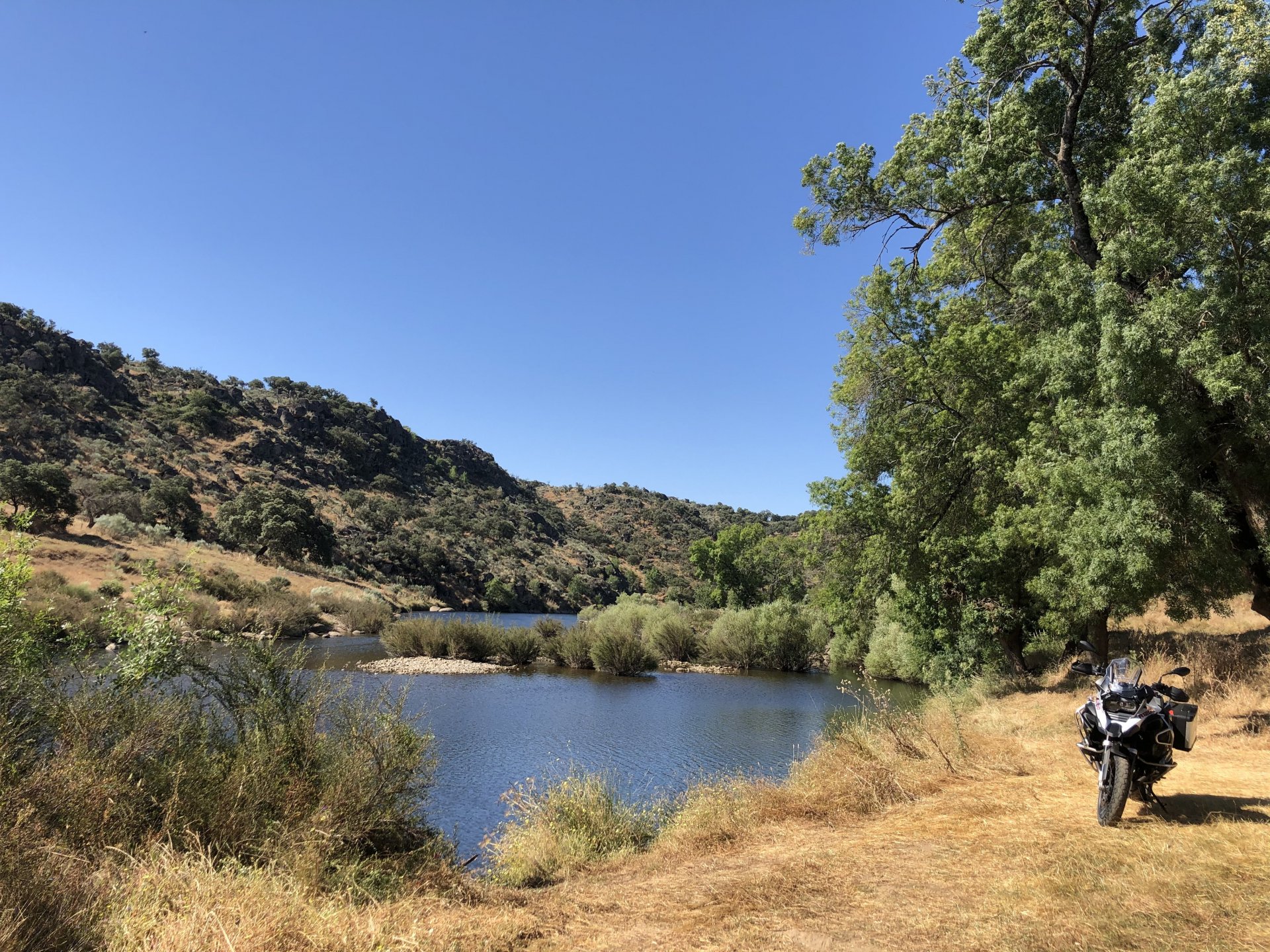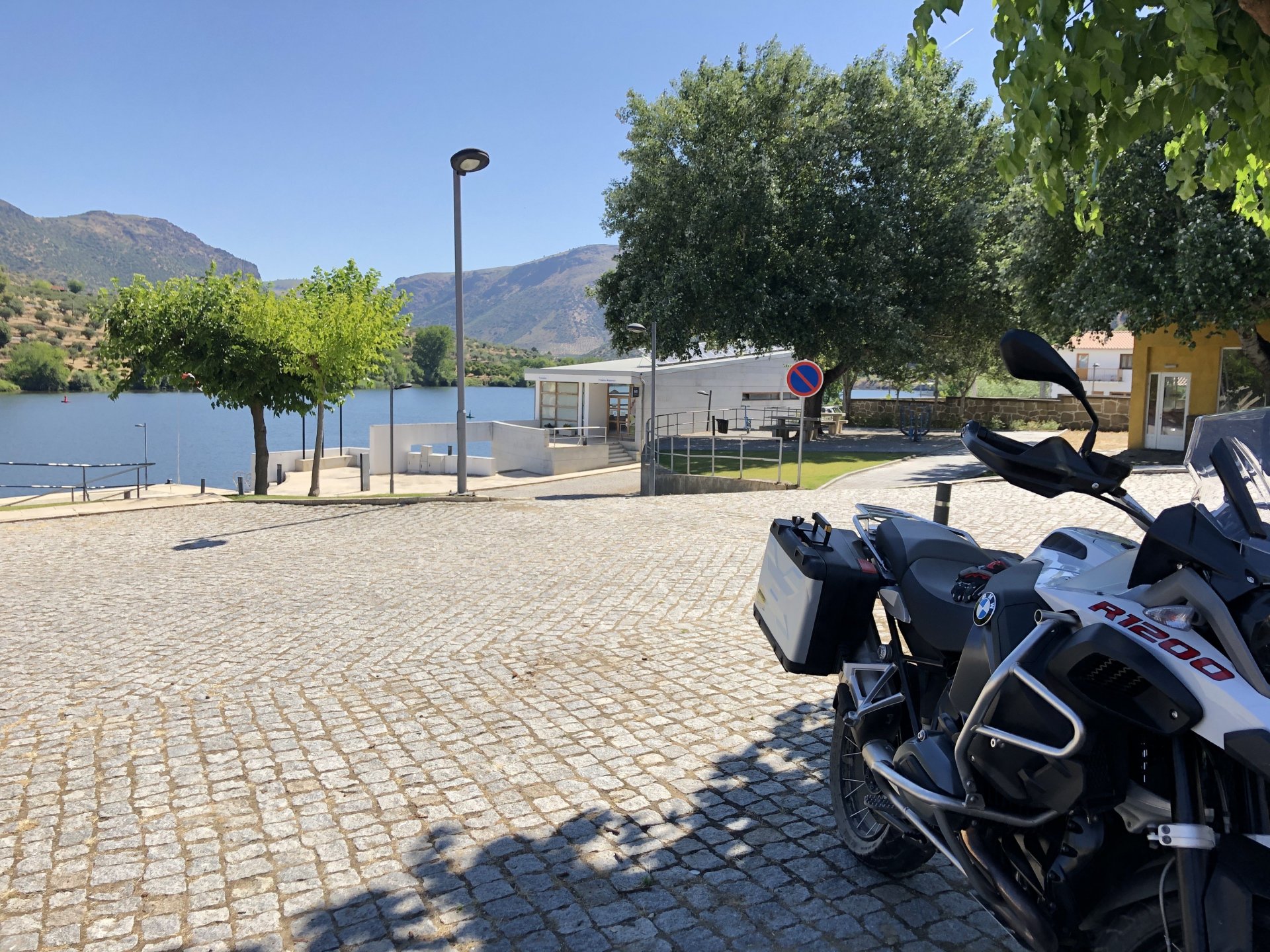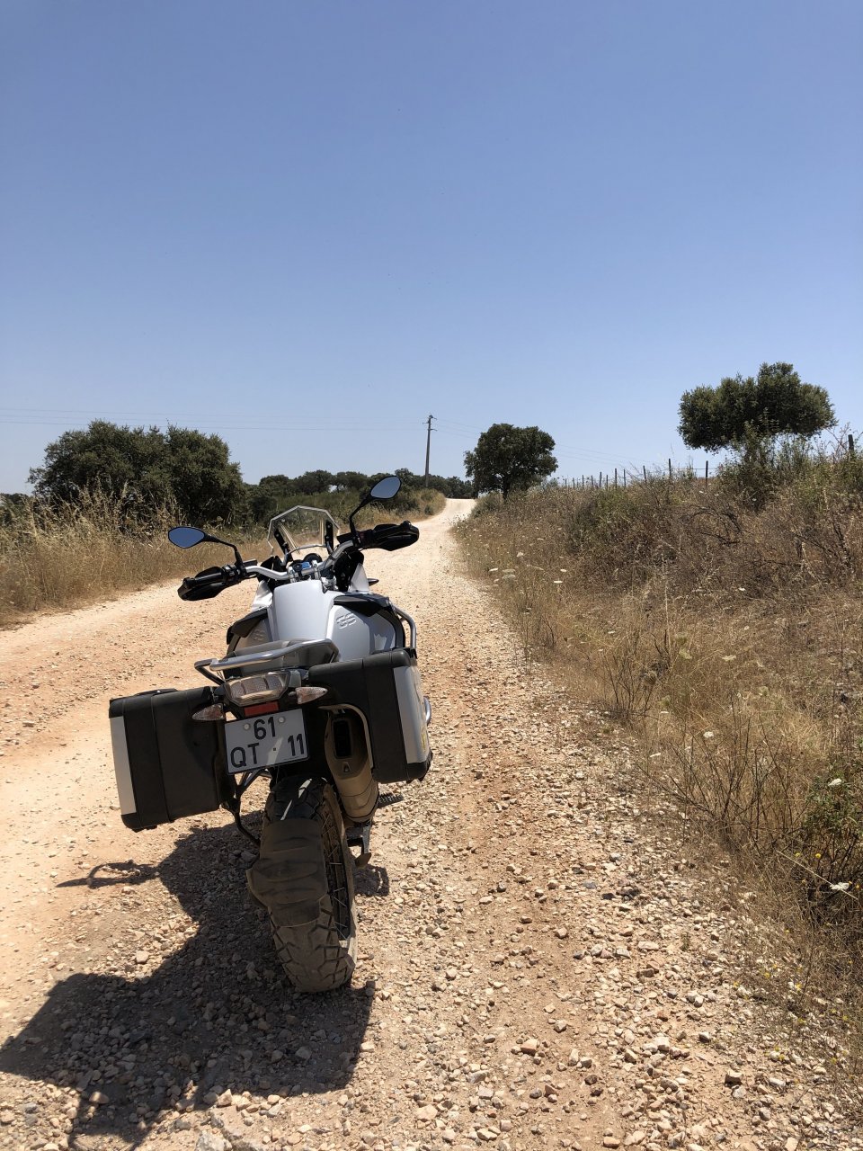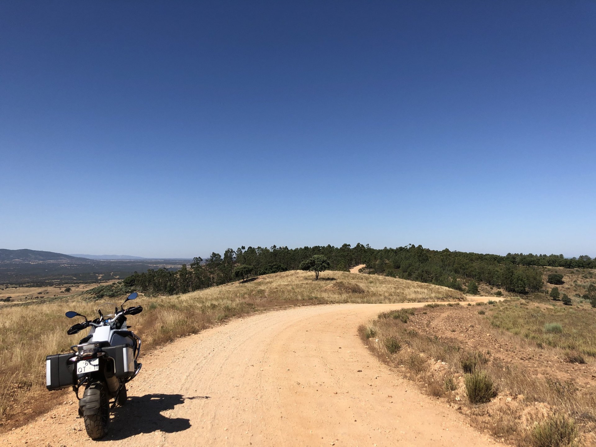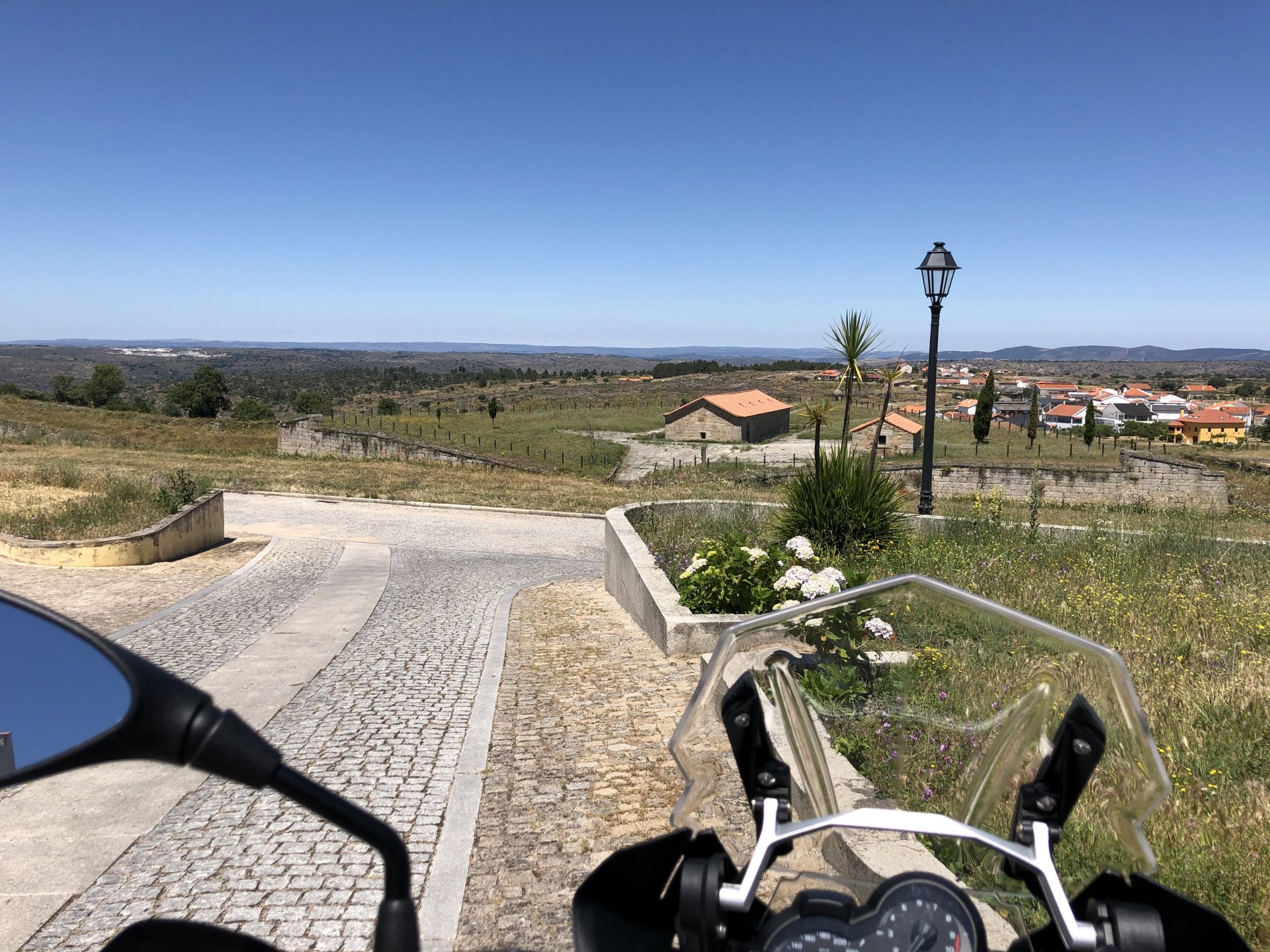So, yesterday started well, not very warm by the time I left the hotel at around 9am, made my way to find some petrol as the bike was on reserve and in this part of the country you can ride for a while without fuel in rural areas, I mean 40km, not really such a drama. The big GS is quite frugal if you avoid motorways, and by the time I fueled up I had 600km on that tank with 50km range left. Landscape is changing now With a full tank I explore a little, there is no rush in going fast south, but I seem only be able to find dead ends, like this The grass is a little too tall for my liking, it's now getting a little hot and windy so I decide to go back to tarmac roads. A hot catalytic converter and tall dry grass is a great way to start a wildfire, and there has been enough of that over the last years. The road is good, though, I try to stick to small ones: See that on the other side of the river? That's Spain It's steeper than it looks My favourite road so far, as far as fun handling a motorcycle, it's barely wide enough for one van, and rolling and weaving through hills, with patches of dirt thrown in to keep it interesting: It was now getting hot, at around 11:30 it was over 37º, still I couldn't resist this dirt road: It only lasted for a few km, not even 15 I think. By now I am getting hot and hungry, so decide to find a small place for lunch. I stop at the first cafe that has shade outside, sit down and do a few calls and emails while I wait for my ham sandwich. Some water and a cold small beer go down a treat. Old lady in the cafe put some butter on the sandwich, "because I think this is your lunch, and you should have a proper lunch" Street scene, after these two dudes sat together having a drink inside, they proceeded to have a conversation outside while maintaining their social distancing , there's so much rural portugal in this picture ... Old lady over there in the shade with her cane is wearing full black, and it's 37º, she's got the cane ready for when the cat comes to shit on her flowers Back on the road, and a few kms later I stop to check my itinerary and a mini castle. Most common big birds now are storks: Pretty proud of myself taking this picture, and I go and put my thumb in it Half an hour later, the roads are ok but the heat is barely manageable. I stop at a fountain and wash my head to cool down. Last stop before getting to the hotel is Marvão and it's castle. It's very high up and worth it for the views alone. There it is in the distance: Make it to the hotel, and quickly make my way to the pool, to finish the day. I drank almost 1,5 liters of water just sitting there, plus a couple of beers, before starting to feel less thirsty. Sofia joined me for dinner, I had some greats cuttlefish and clams cooked in garlic and olive oil, it was amazing. Too much wine was had.