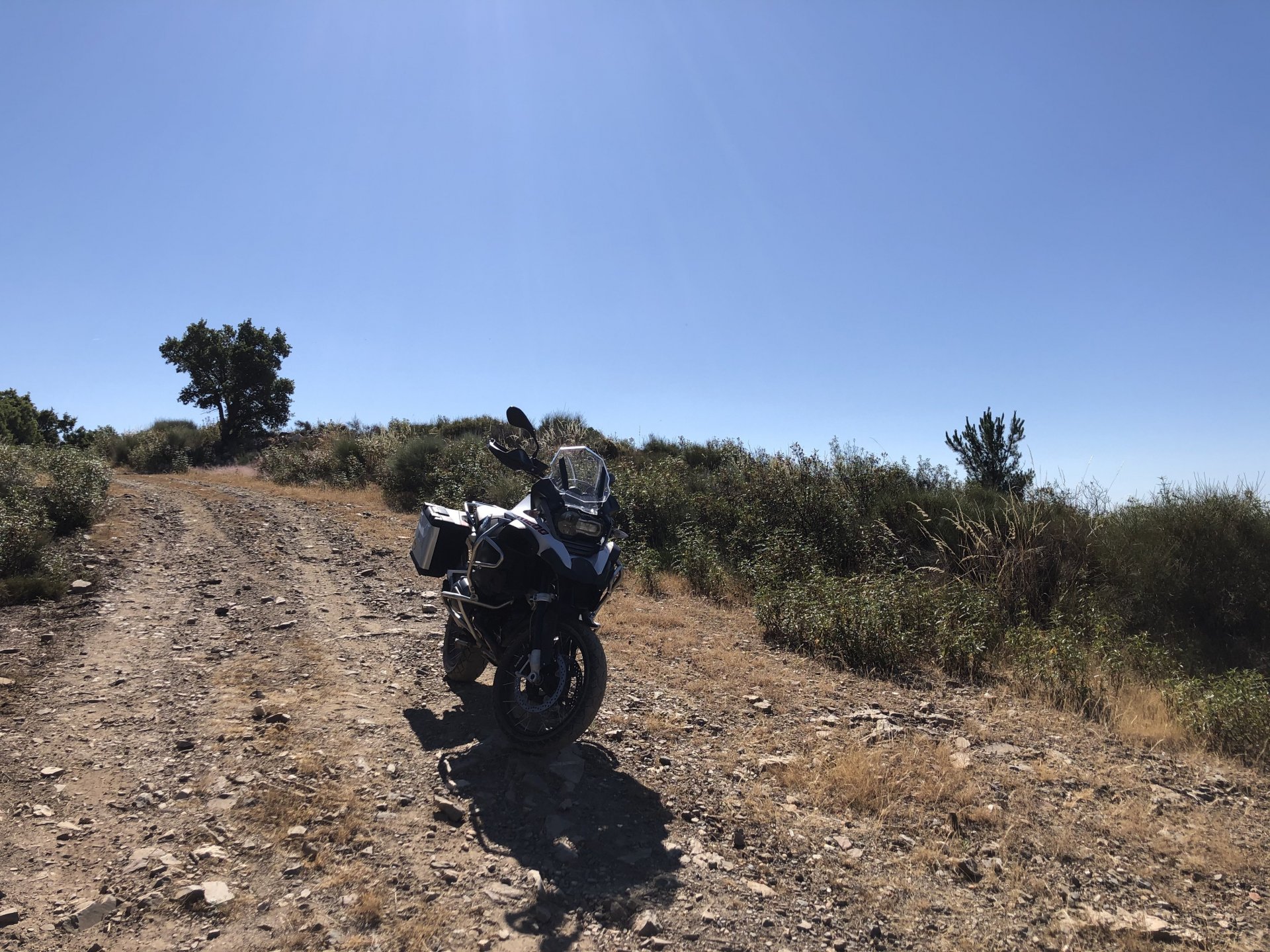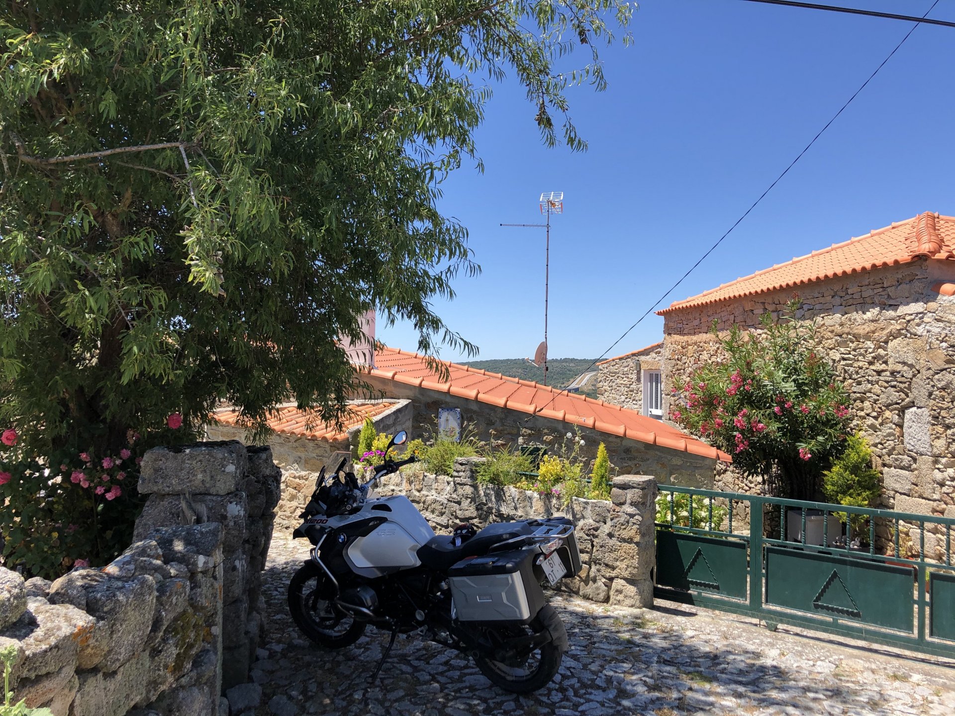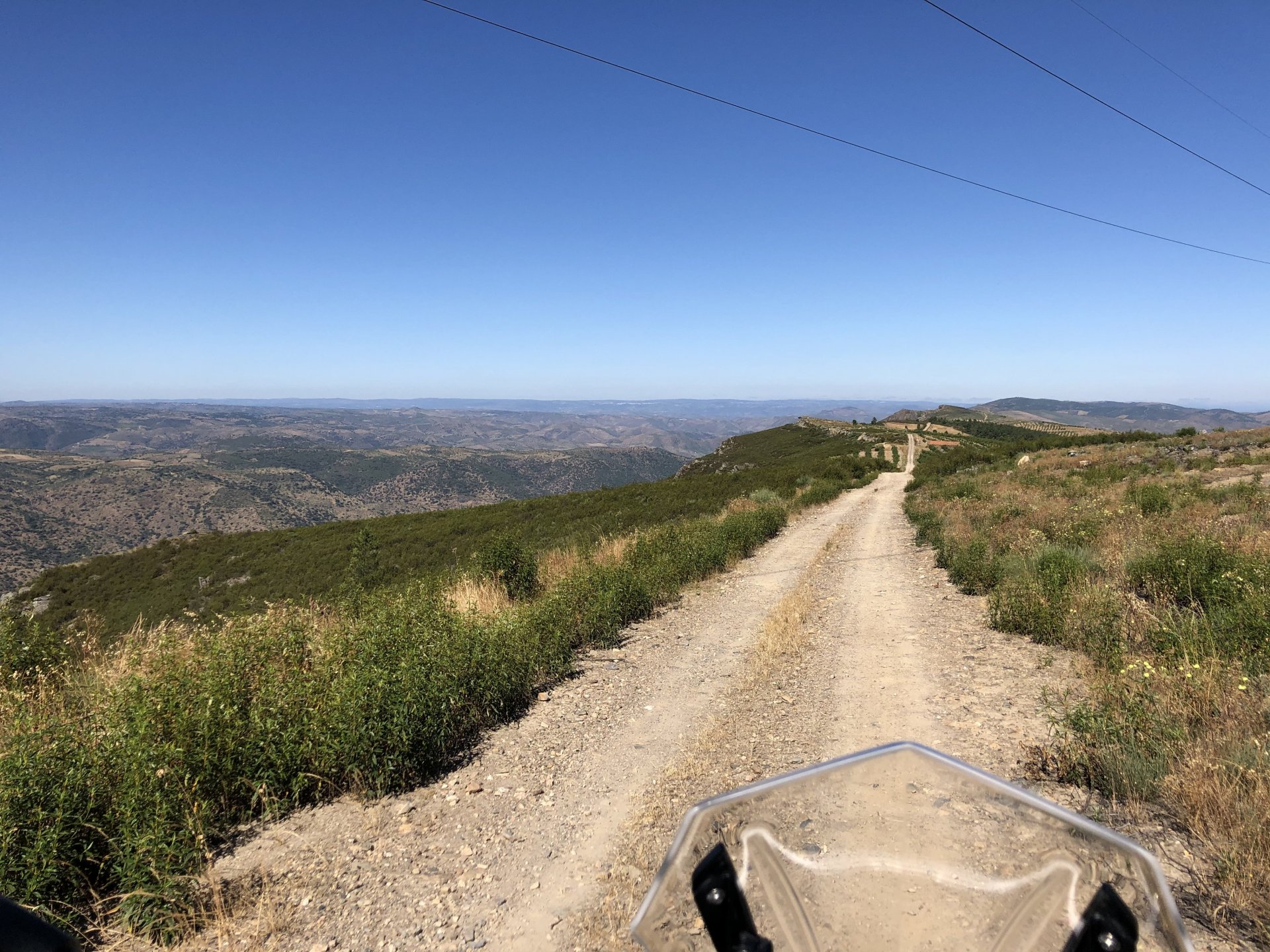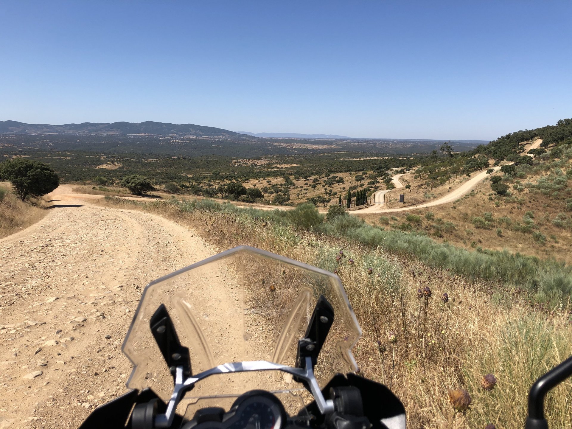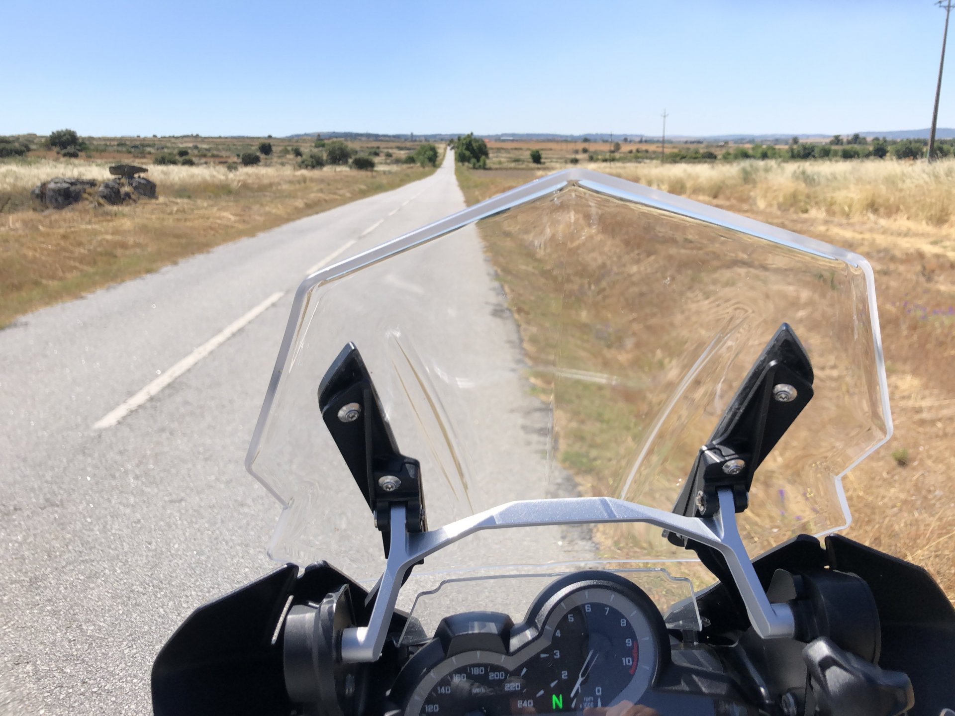 So, yesterday started well, not very warm by the time I left the hotel at around 9am, made my way to find some petrol as the bike was on reserve and in this part of the country you can ride for a while without fuel in rural areas, I mean 40km, not really such a drama. The big GS is quite frugal if you avoid motorways, and by the time I fueled up I had 600km on that tank with 50km range left. Landscape is changing now With a full tank I explore a little, there is no rush in going fast south, but I seem only be able to find dead ends, like this The grass is a little too tall for my liking, it's now getting a little hot and windy so I decide to go back to tarmac roads. A hot catalytic converter and tall dry grass is a great way to start a wildfire, and there has been enough of that over the last years. The road is good, though, I try to stick to small ones: See that on the other side of the river? That's Spain It's steeper than it looks My favourite road so far, as far as fun handling a motorcycle, it's barely wide enough for one van, and rolling and weaving through hills, with patches of dirt thrown in to keep it interesting: It was now getting hot, at around 11:30 it was over 37º, still I couldn't resist this dirt road: It only lasted for a few km, not even 15 I think. By now I am getting hot and hungry, so decide to find a small place for lunch. I stop at the first cafe that has shade outside, sit down and do a few calls and emails while I wait for my ham sandwich. Some water and a cold small beer go down a treat. Old lady in the cafe put some butter on the sandwich, "because I think this is your lunch, and you should have a proper lunch" Street scene, after these two dudes sat together having a drink inside, they proceeded to have a conversation outside while maintaining their social distancing , there's so much rural portugal in this picture ... Old lady over there in the shade with her cane is wearing full black, and it's 37º, she's got the cane ready for when the cat comes to shit on her flowers Back on the road, and a few kms later I stop to check my itinerary and a mini castle. Most common big birds now are storks: Pretty proud of myself taking this picture, and I go and put my thumb in it Half an hour later, the roads are ok but the heat is barely manageable. I stop at a fountain and wash my head to cool down. Last stop before getting to the hotel is Marvão and it's castle. It's very high up and worth it for the views alone. There it is in the distance: Make it to the hotel, and quickly make my way to the pool, to finish the day. I drank almost 1,5 liters of water just sitting there, plus a couple of beers, before starting to feel less thirsty. Sofia joined me for dinner, I had some greats cuttlefish and clams cooked in garlic and olive oil, it was amazing. Too much wine was had.