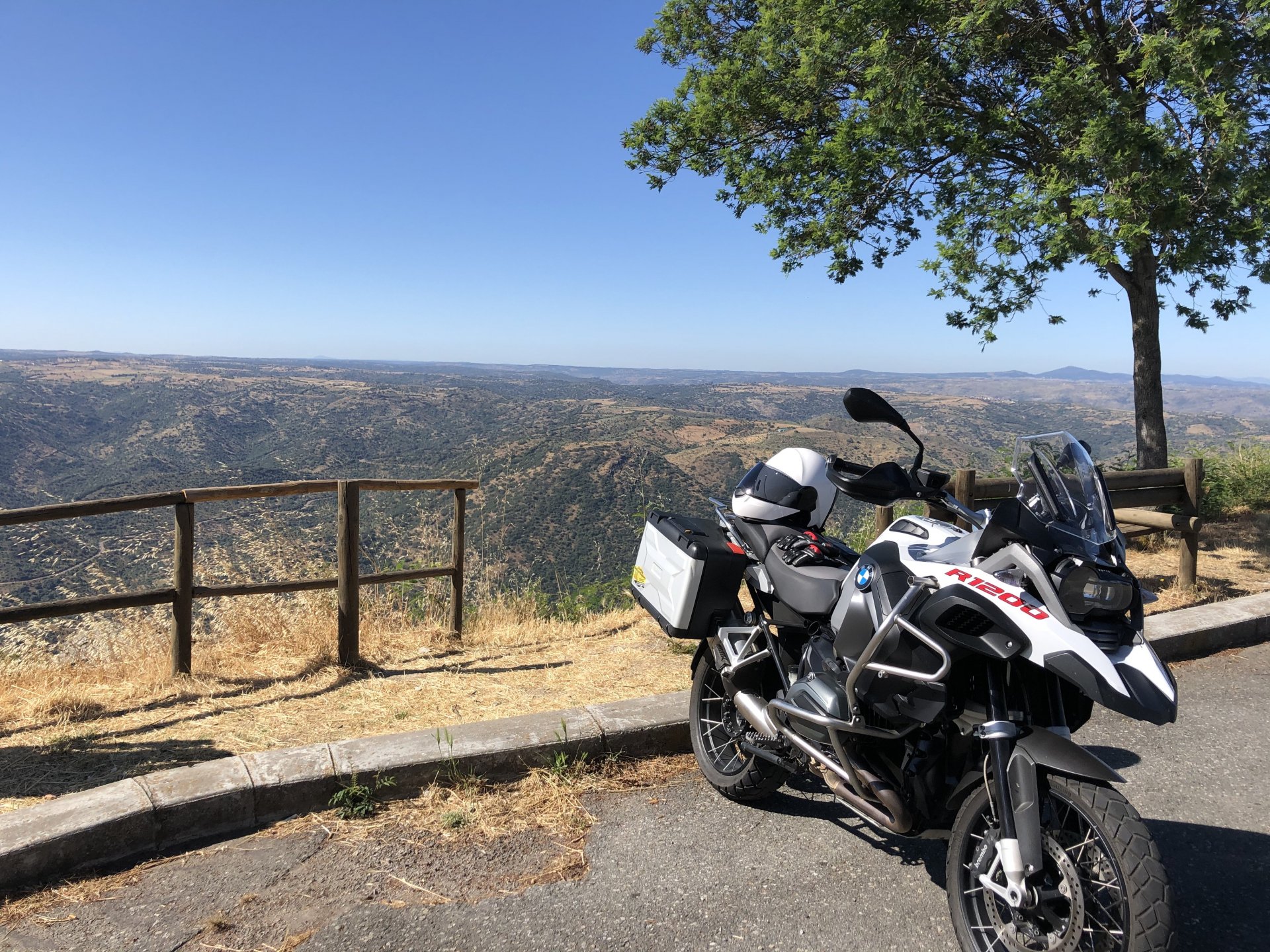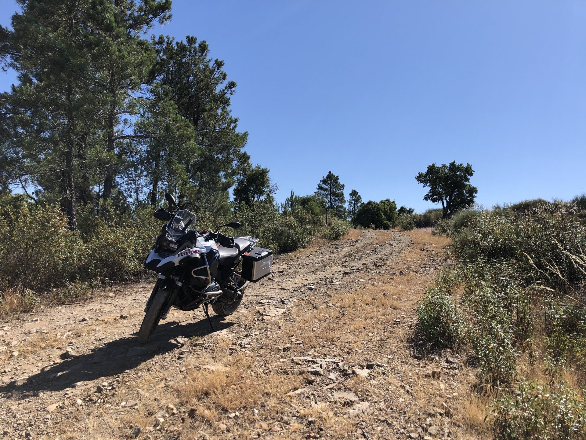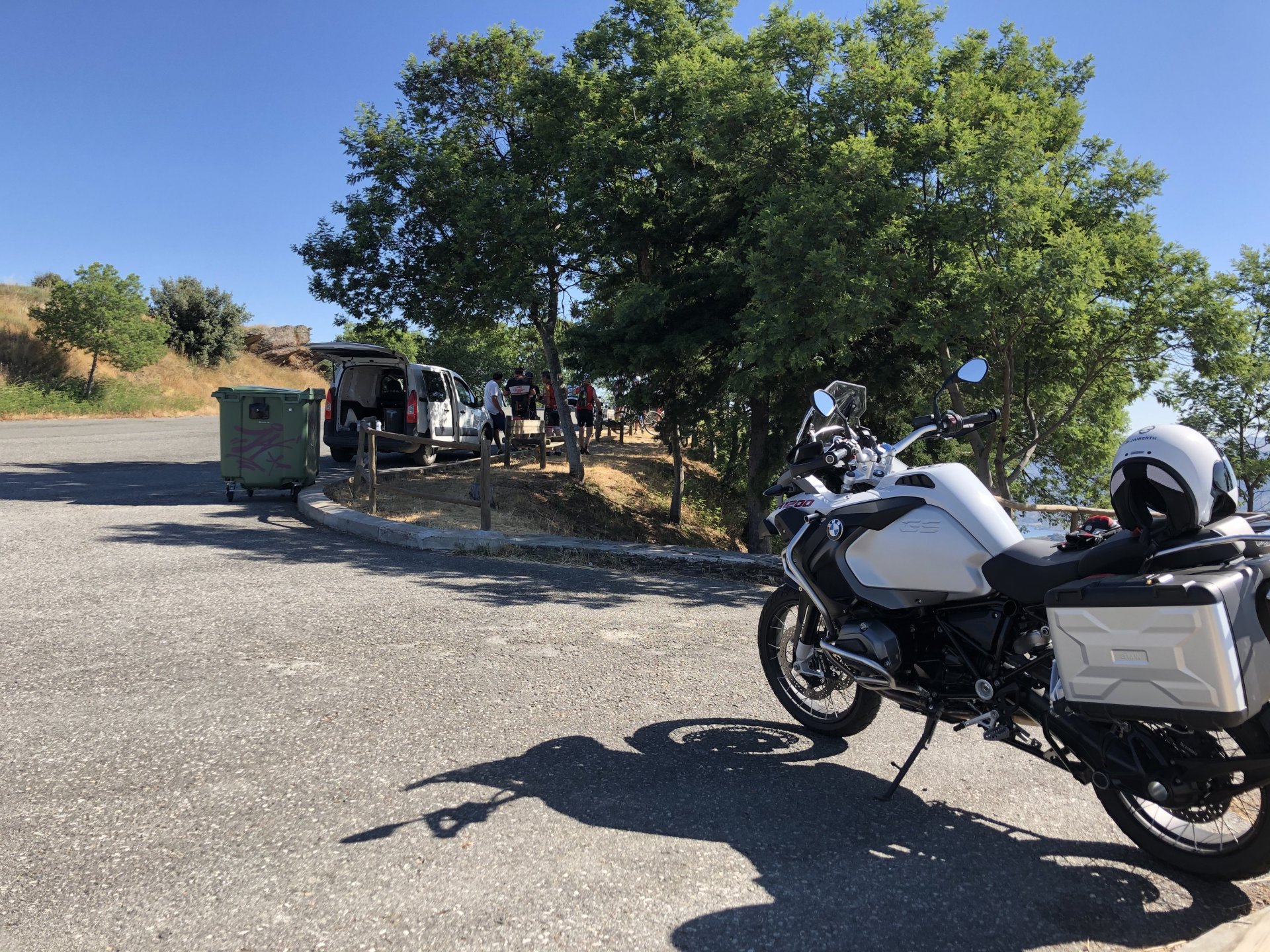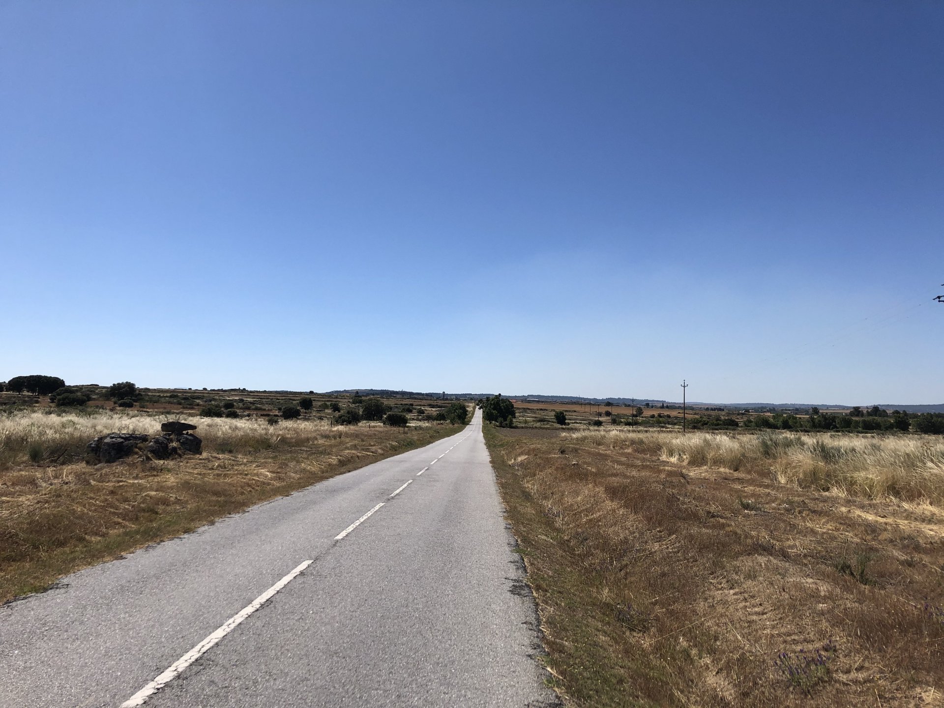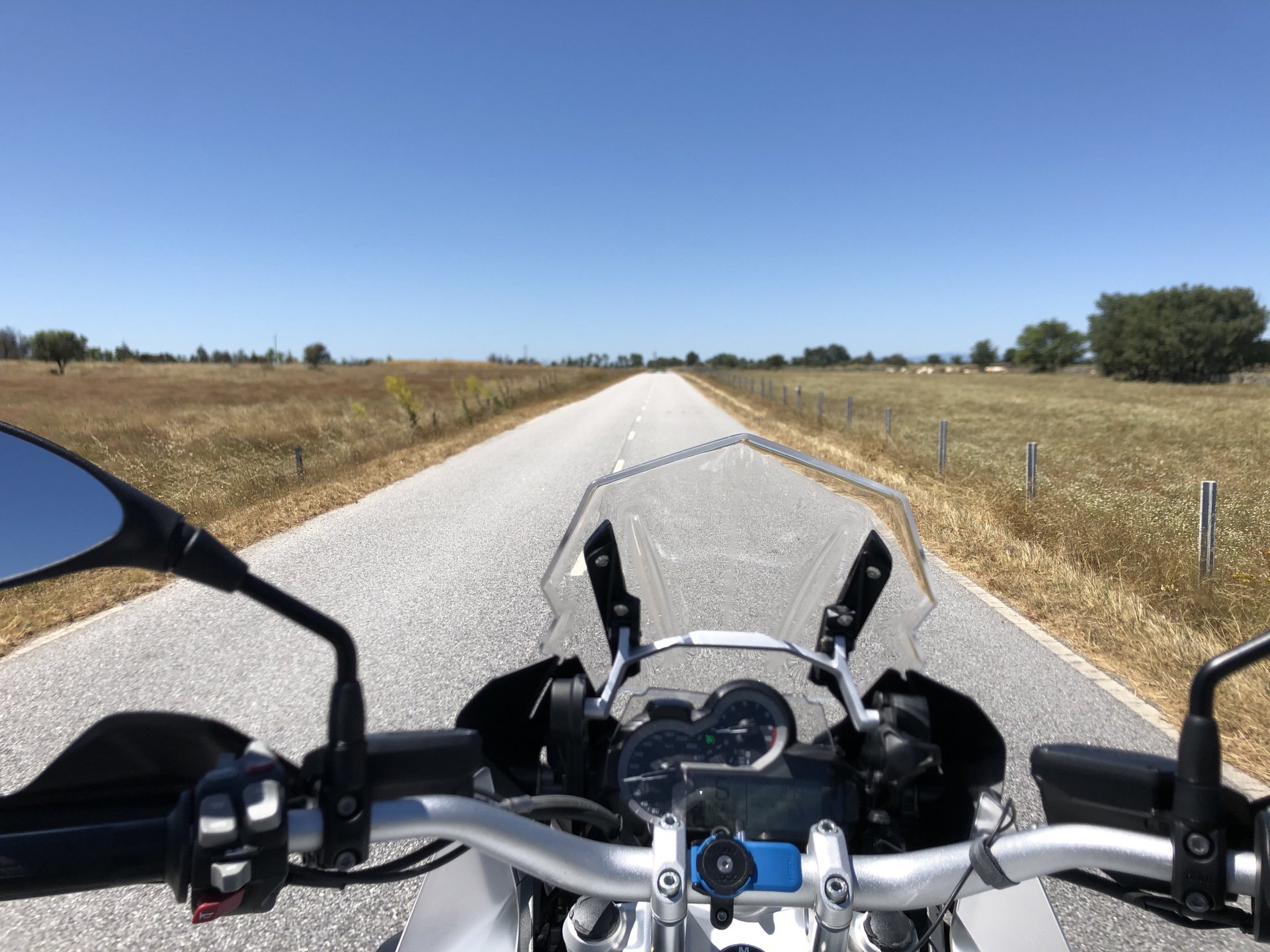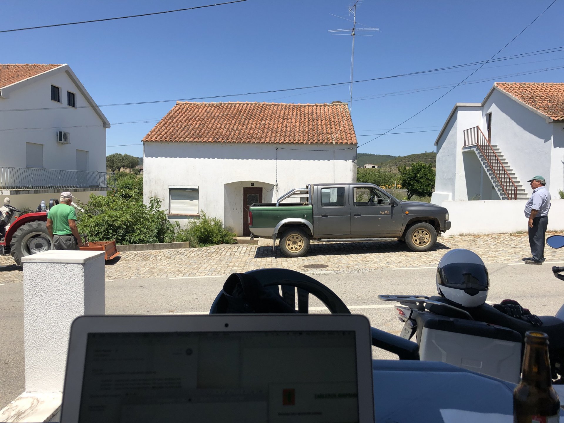 So, yesterday started well, not very warm by the time I left the hotel at around 9am, made my way to find some petrol as the bike was on reserve and in this part of the country you can ride for a while without fuel in rural areas, I mean 40km, not really such a drama. The big GS is quite frugal if you avoid motorways, and by the time I fueled up I had 600km on that tank with 50km range left. Landscape is changing now With a full tank I explore a little, there is no rush in going fast south, but I seem only be able to find dead ends, like this The grass is a little too tall for my liking, it's now getting a little hot and windy so I decide to go back to tarmac roads. A hot catalytic converter and tall dry grass is a great way to start a wildfire, and there has been enough of that over the last years. The road is good, though, I try to stick to small ones: See that on the other side of the river? That's Spain It's steeper than it looks My favourite road so far, as far as fun handling a motorcycle, it's barely wide enough for one van, and rolling and weaving through hills, with patches of dirt thrown in to keep it interesting: It was now getting hot, at around 11:30 it was over 37º, still I couldn't resist this dirt road: It only lasted for a few km, not even 15 I think. By now I am getting hot and hungry, so decide to find a small place for lunch. I stop at the first cafe that has shade outside, sit down and do a few calls and emails while I wait for my ham sandwich. Some water and a cold small beer go down a treat. Old lady in the cafe put some butter on the sandwich, "because I think this is your lunch, and you should have a proper lunch" Street scene, after these two dudes sat together having a drink inside, they proceeded to have a conversation outside while maintaining their social distancing , there's so much rural portugal in this picture ... Old lady over there in the shade with her cane is wearing full black, and it's 37º, she's got the cane ready for when the cat comes to shit on her flowers Back on the road, and a few kms later I stop to check my itinerary and a mini castle. Most common big birds now are storks: Pretty proud of myself taking this picture, and I go and put my thumb in it Half an hour later, the roads are ok but the heat is barely manageable. I stop at a fountain and wash my head to cool down. Last stop before getting to the hotel is Marvão and it's castle. It's very high up and worth it for the views alone. There it is in the distance: Make it to the hotel, and quickly make my way to the pool, to finish the day. I drank almost 1,5 liters of water just sitting there, plus a couple of beers, before starting to feel less thirsty. Sofia joined me for dinner, I had some greats cuttlefish and clams cooked in garlic and olive oil, it was amazing. Too much wine was had.