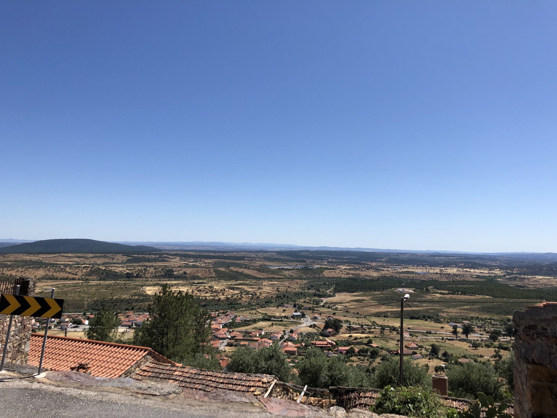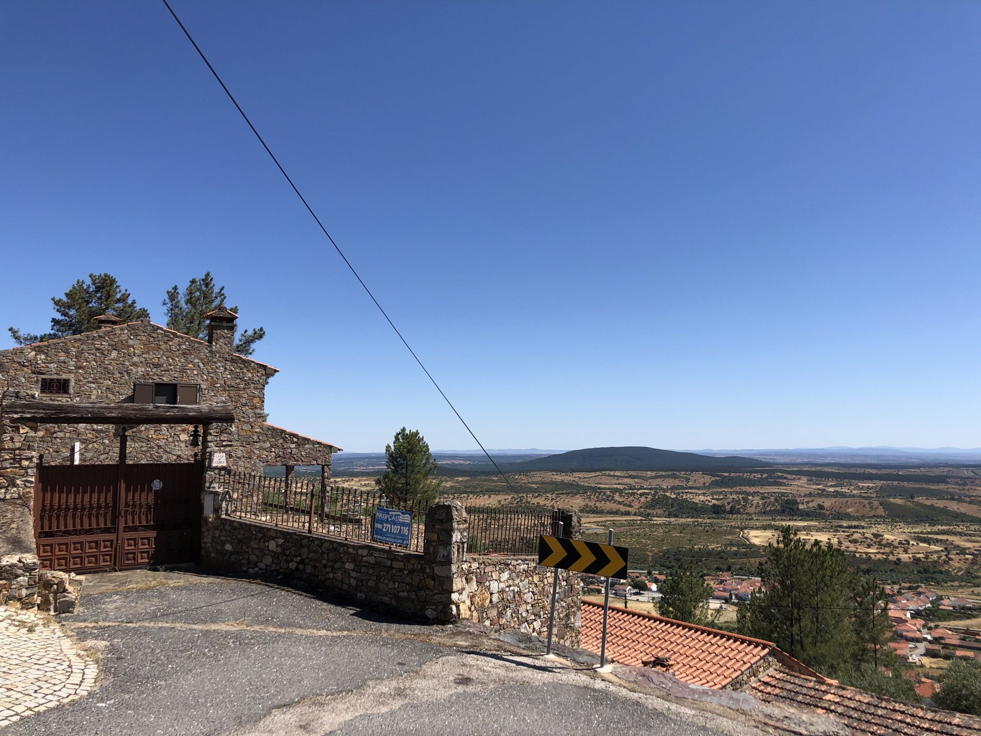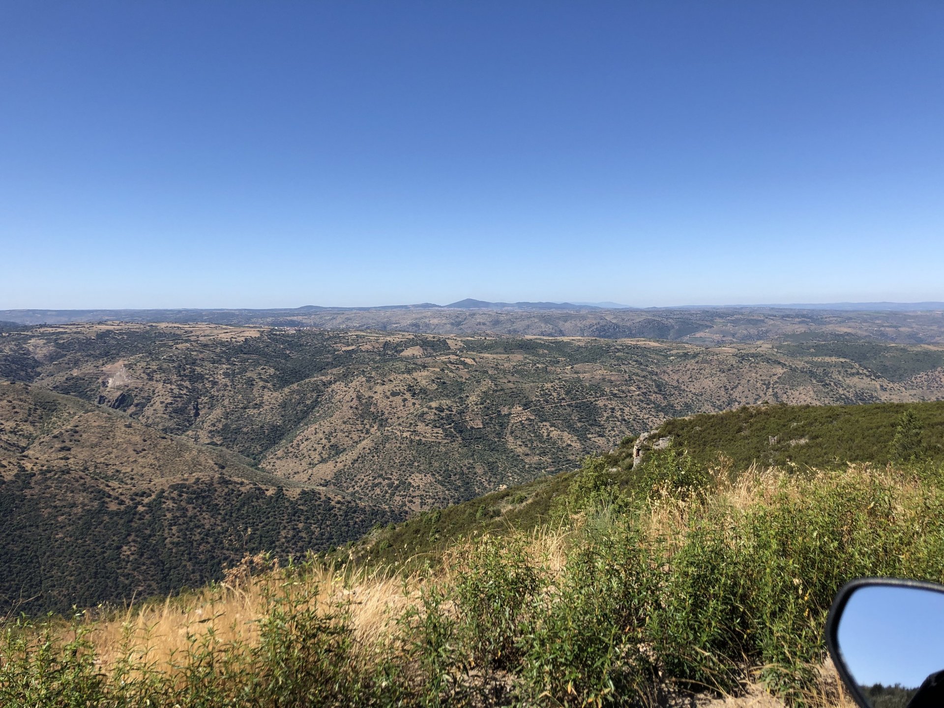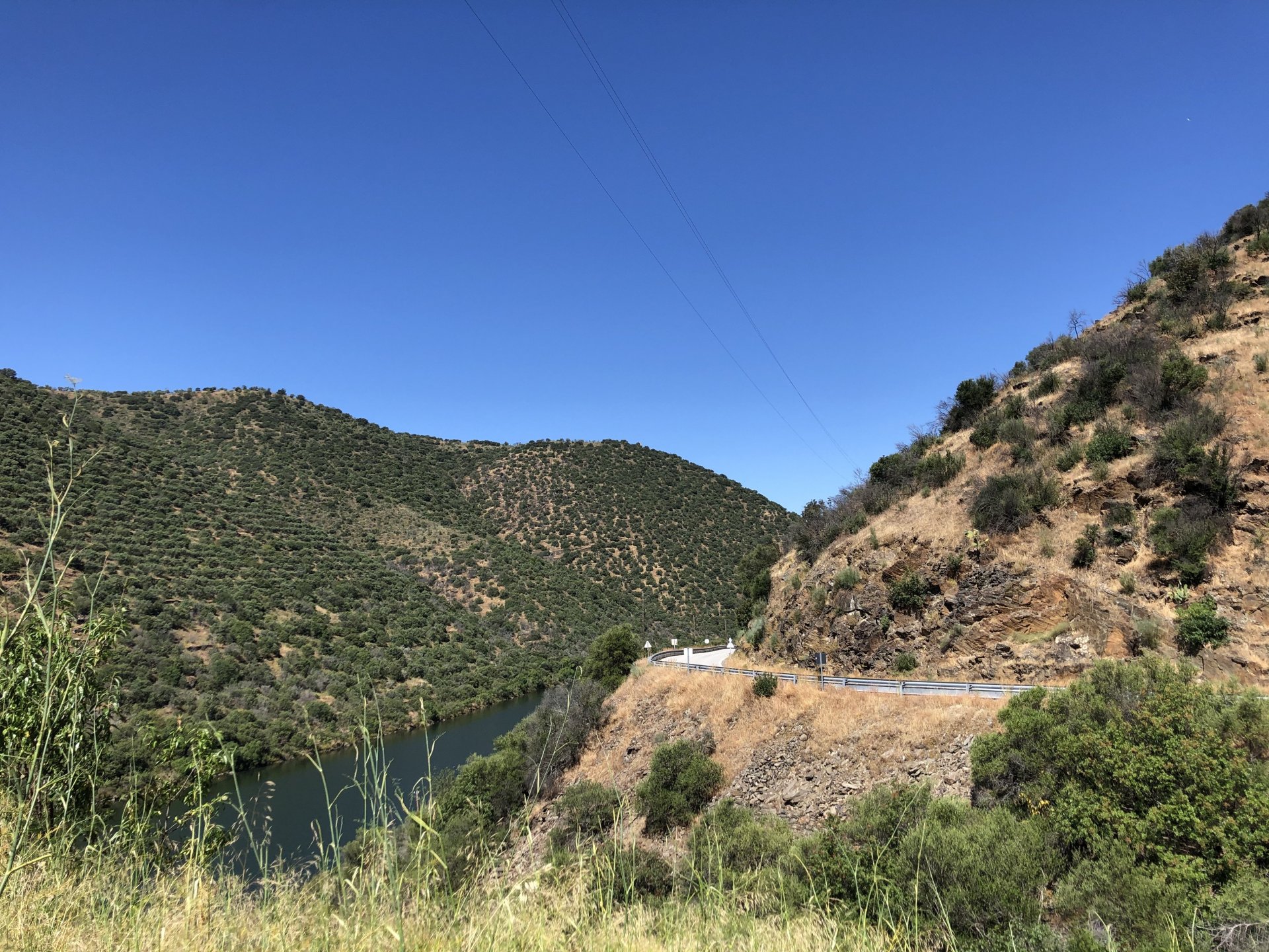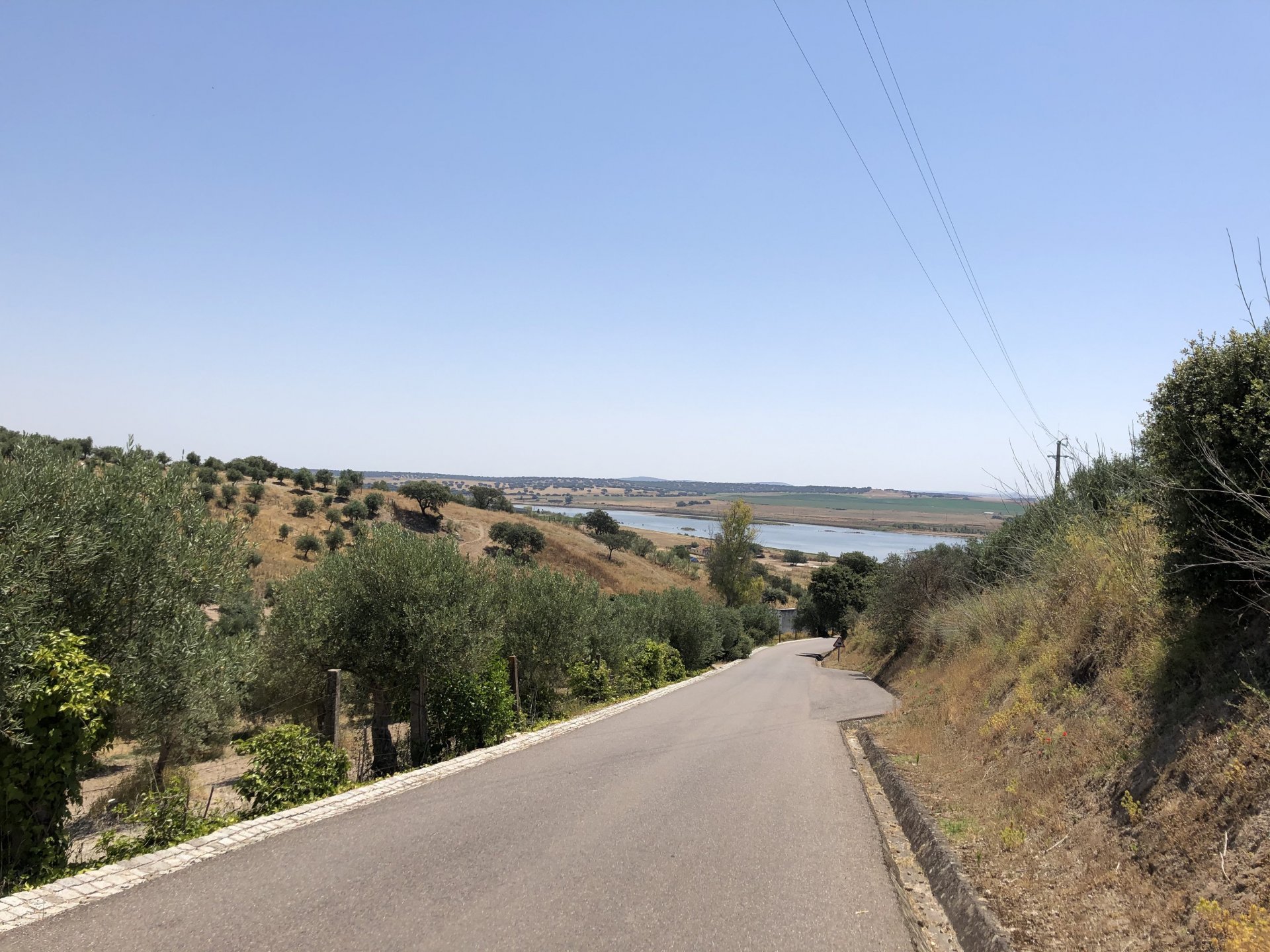 So, yesterday started well, not very warm by the time I left the hotel at around 9am, made my way to find some petrol as the bike was on reserve and in this part of the country you can ride for a while without fuel in rural areas, I mean 40km, not really such a drama. The big GS is quite frugal if you avoid motorways, and by the time I fueled up I had 600km on that tank with 50km range left. Landscape is changing now With a full tank I explore a little, there is no rush in going fast south, but I seem only be able to find dead ends, like this The grass is a little too tall for my liking, it's now getting a little hot and windy so I decide to go back to tarmac roads. A hot catalytic converter and tall dry grass is a great way to start a wildfire, and there has been enough of that over the last years. The road is good, though, I try to stick to small ones: See that on the other side of the river? That's Spain It's steeper than it looks My favourite road so far, as far as fun handling a motorcycle, it's barely wide enough for one van, and rolling and weaving through hills, with patches of dirt thrown in to keep it interesting: It was now getting hot, at around 11:30 it was over 37º, still I couldn't resist this dirt road: It only lasted for a few km, not even 15 I think. By now I am getting hot and hungry, so decide to find a small place for lunch. I stop at the first cafe that has shade outside, sit down and do a few calls and emails while I wait for my ham sandwich. Some water and a cold small beer go down a treat. Old lady in the cafe put some butter on the sandwich, "because I think this is your lunch, and you should have a proper lunch" Street scene, after these two dudes sat together having a drink inside, they proceeded to have a conversation outside while maintaining their social distancing , there's so much rural portugal in this picture ... Old lady over there in the shade with her cane is wearing full black, and it's 37º, she's got the cane ready for when the cat comes to shit on her flowers Back on the road, and a few kms later I stop to check my itinerary and a mini castle. Most common big birds now are storks: Pretty proud of myself taking this picture, and I go and put my thumb in it Half an hour later, the roads are ok but the heat is barely manageable. I stop at a fountain and wash my head to cool down. Last stop before getting to the hotel is Marvão and it's castle. It's very high up and worth it for the views alone. There it is in the distance: Make it to the hotel, and quickly make my way to the pool, to finish the day. I drank almost 1,5 liters of water just sitting there, plus a couple of beers, before starting to feel less thirsty. Sofia joined me for dinner, I had some greats cuttlefish and clams cooked in garlic and olive oil, it was amazing. Too much wine was had.