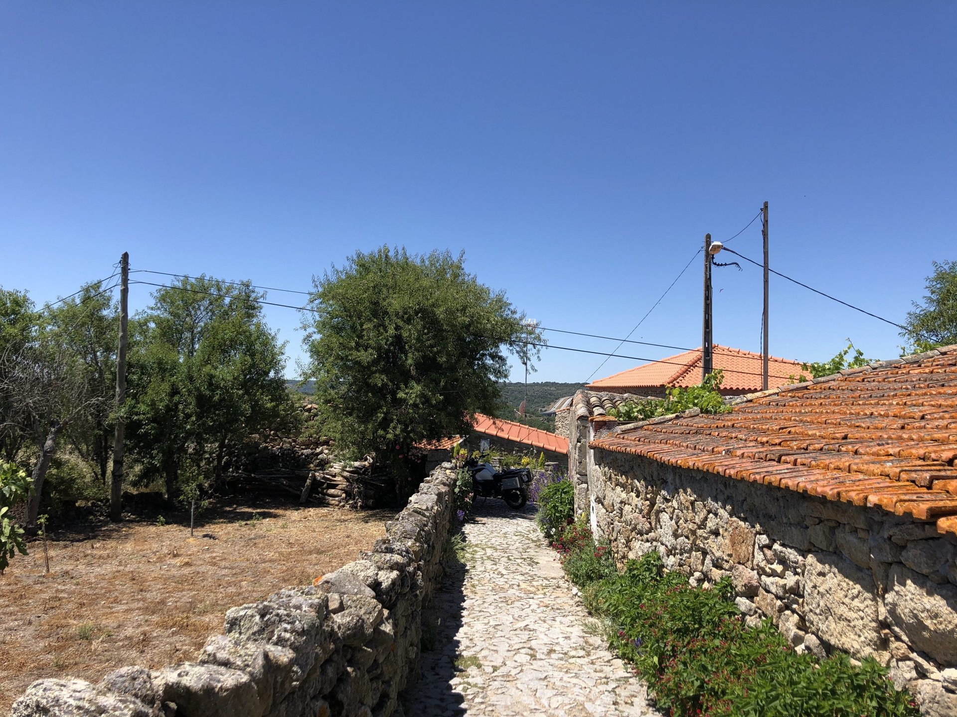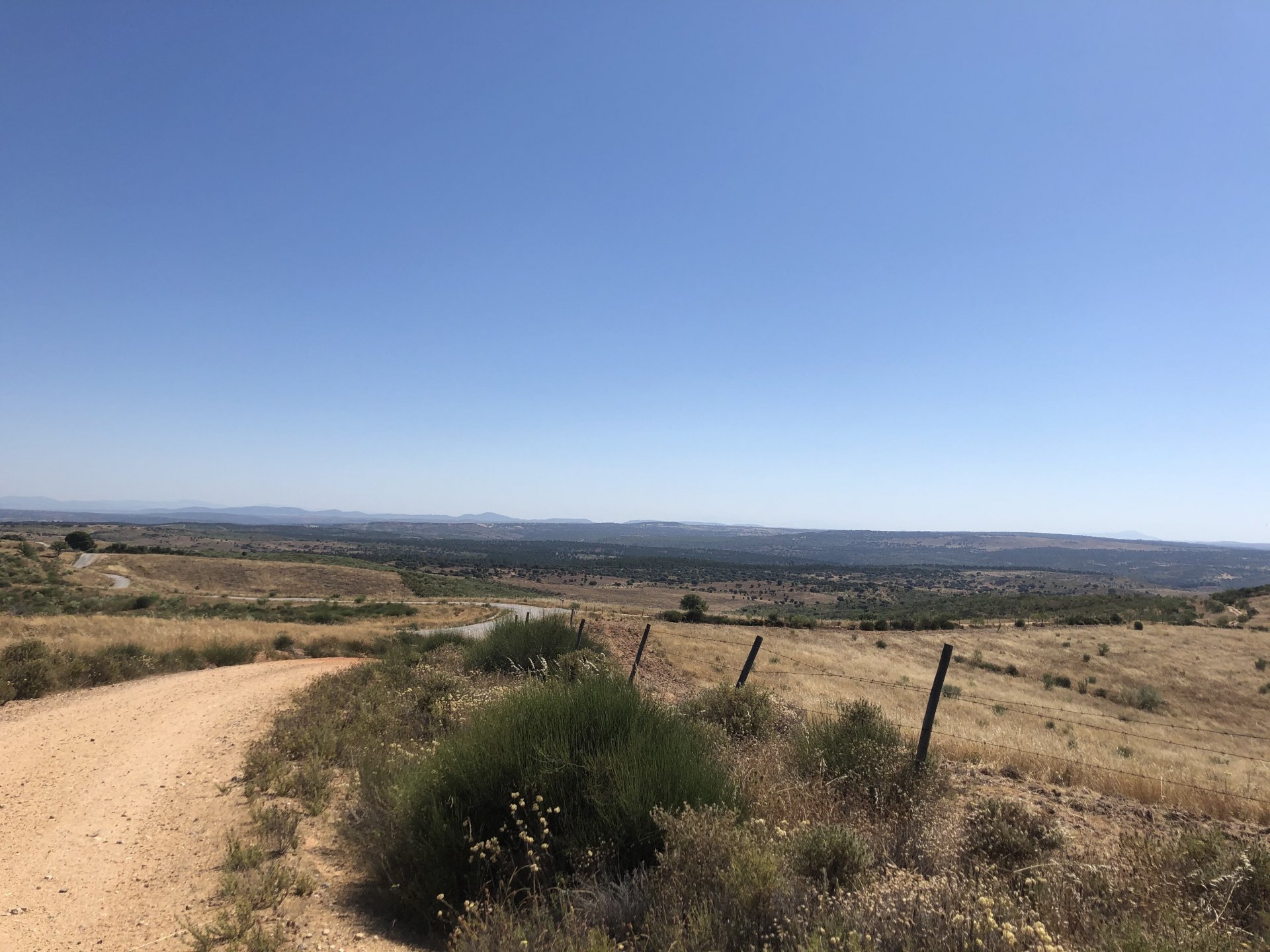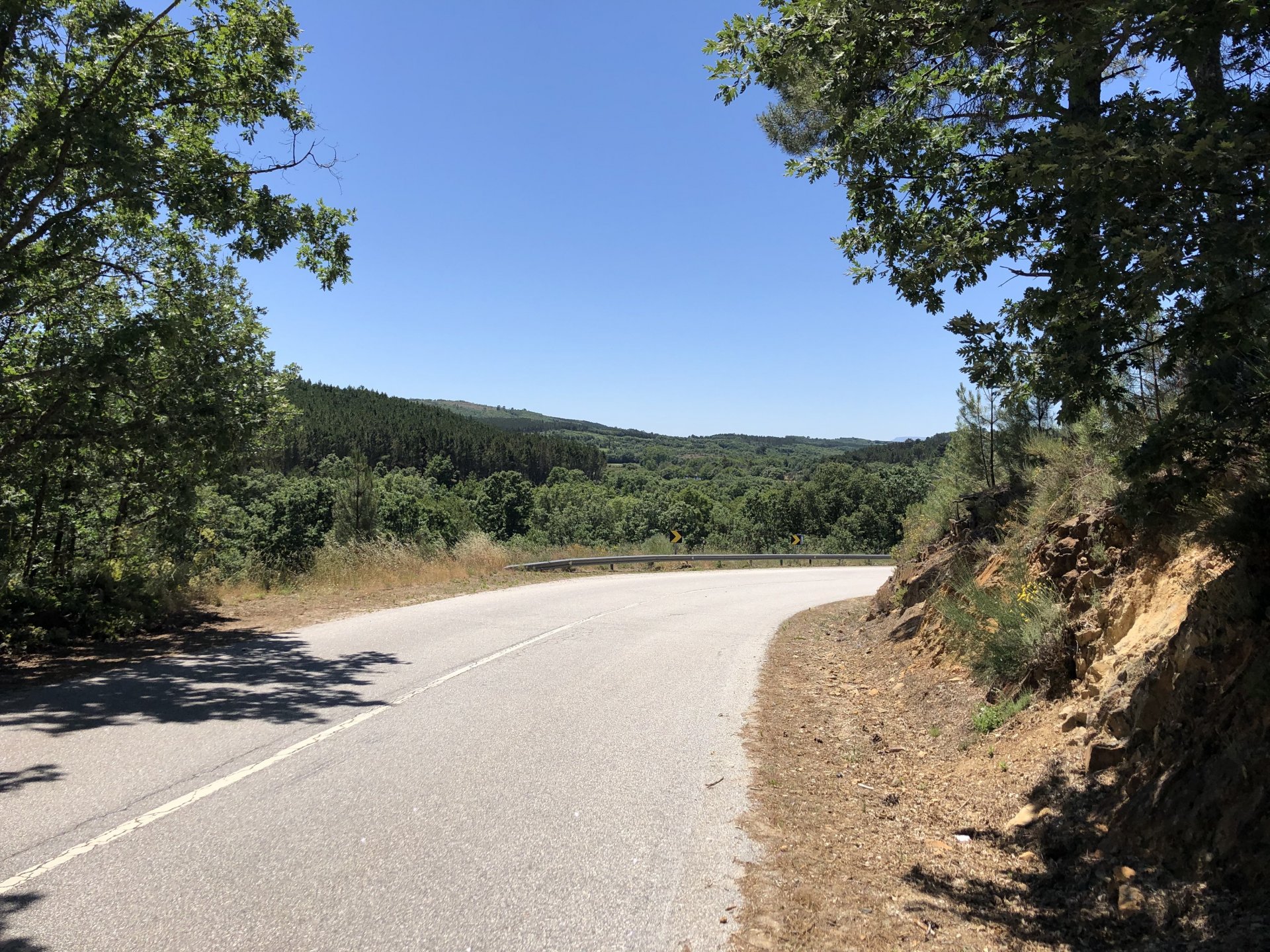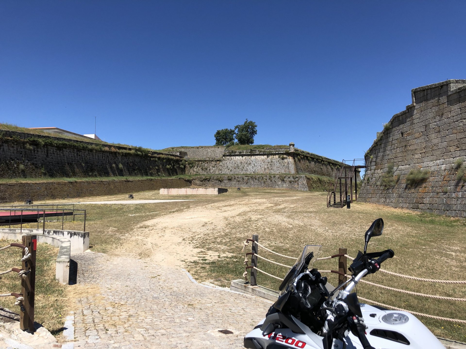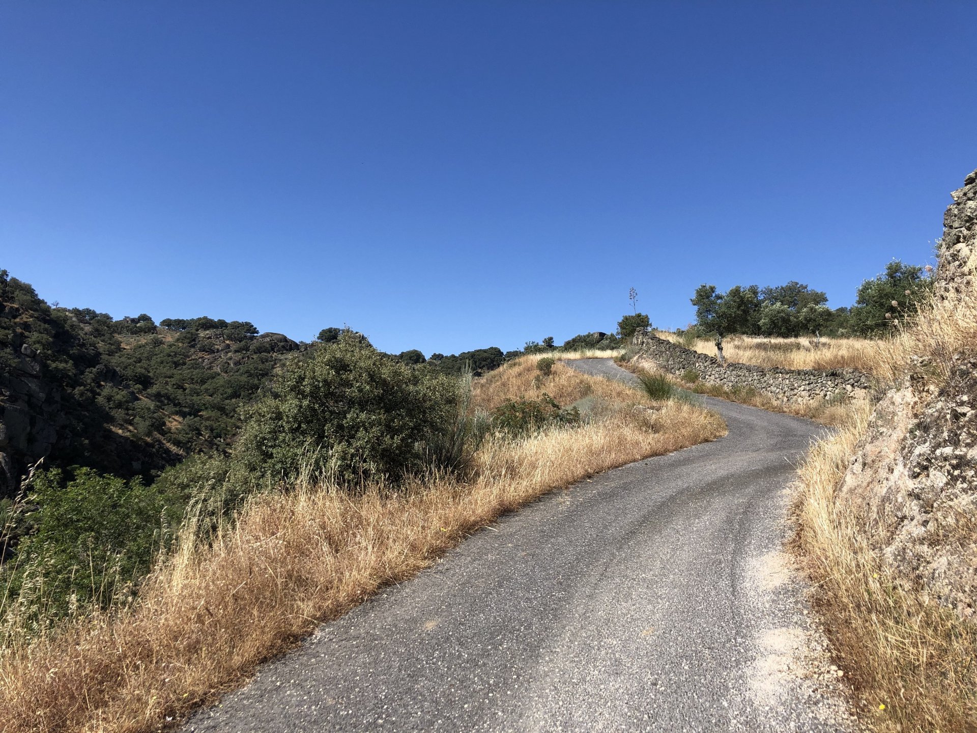 So, yesterday started well, not very warm by the time I left the hotel at around 9am, made my way to find some petrol as the bike was on reserve and in this part of the country you can ride for a while without fuel in rural areas, I mean 40km, not really such a drama. The big GS is quite frugal if you avoid motorways, and by the time I fueled up I had 600km on that tank with 50km range left. Landscape is changing now With a full tank I explore a little, there is no rush in going fast south, but I seem only be able to find dead ends, like this The grass is a little too tall for my liking, it's now getting a little hot and windy so I decide to go back to tarmac roads. A hot catalytic converter and tall dry grass is a great way to start a wildfire, and there has been enough of that over the last years. The road is good, though, I try to stick to small ones: See that on the other side of the river? That's Spain It's steeper than it looks My favourite road so far, as far as fun handling a motorcycle, it's barely wide enough for one van, and rolling and weaving through hills, with patches of dirt thrown in to keep it interesting: It was now getting hot, at around 11:30 it was over 37º, still I couldn't resist this dirt road: It only lasted for a few km, not even 15 I think. By now I am getting hot and hungry, so decide to find a small place for lunch. I stop at the first cafe that has shade outside, sit down and do a few calls and emails while I wait for my ham sandwich. Some water and a cold small beer go down a treat. Old lady in the cafe put some butter on the sandwich, "because I think this is your lunch, and you should have a proper lunch" Street scene, after these two dudes sat together having a drink inside, they proceeded to have a conversation outside while maintaining their social distancing , there's so much rural portugal in this picture ... Old lady over there in the shade with her cane is wearing full black, and it's 37º, she's got the cane ready for when the cat comes to shit on her flowers Back on the road, and a few kms later I stop to check my itinerary and a mini castle. Most common big birds now are storks: Pretty proud of myself taking this picture, and I go and put my thumb in it Half an hour later, the roads are ok but the heat is barely manageable. I stop at a fountain and wash my head to cool down. Last stop before getting to the hotel is Marvão and it's castle. It's very high up and worth it for the views alone. There it is in the distance: Make it to the hotel, and quickly make my way to the pool, to finish the day. I drank almost 1,5 liters of water just sitting there, plus a couple of beers, before starting to feel less thirsty. Sofia joined me for dinner, I had some greats cuttlefish and clams cooked in garlic and olive oil, it was amazing. Too much wine was had.
