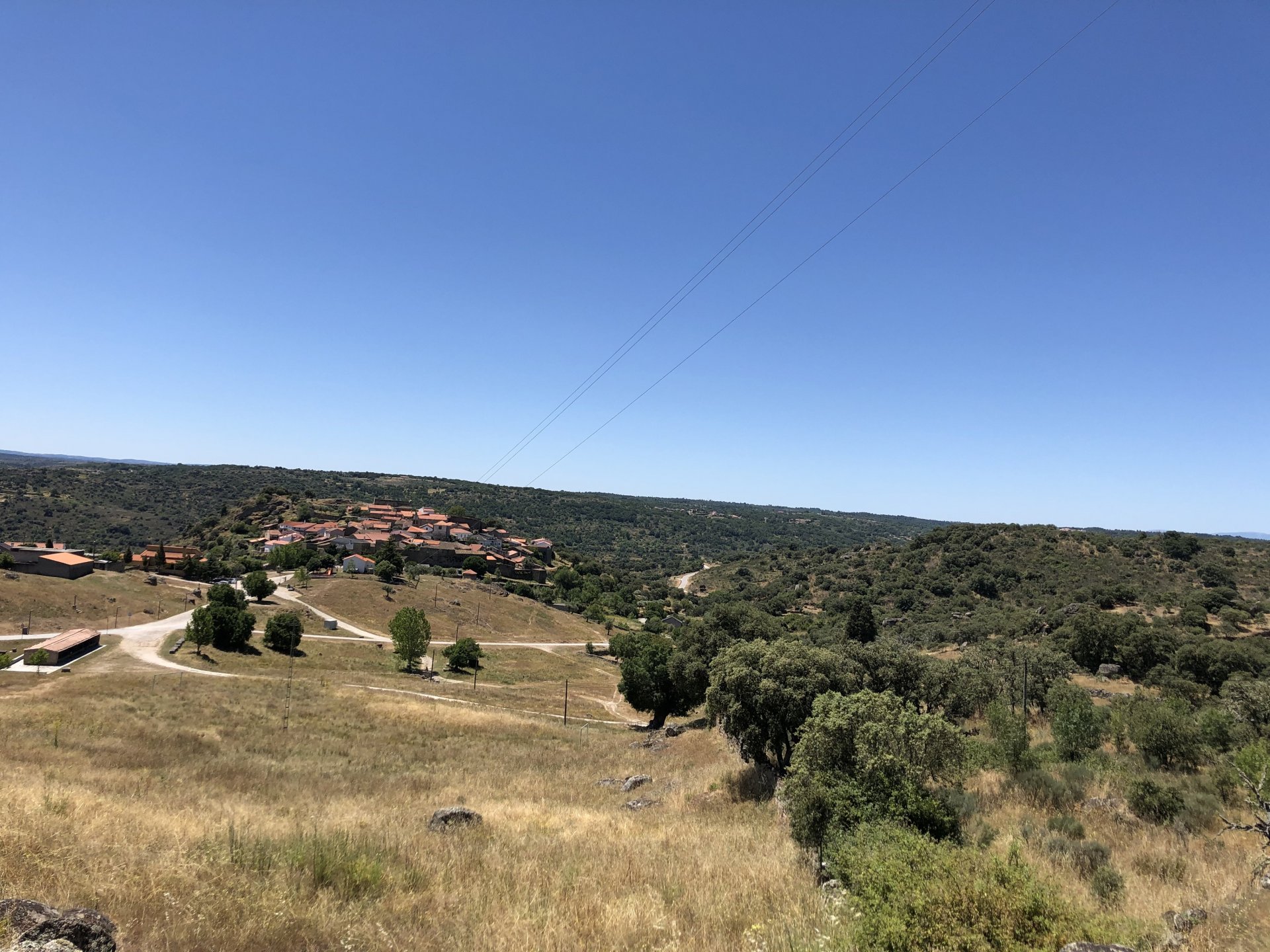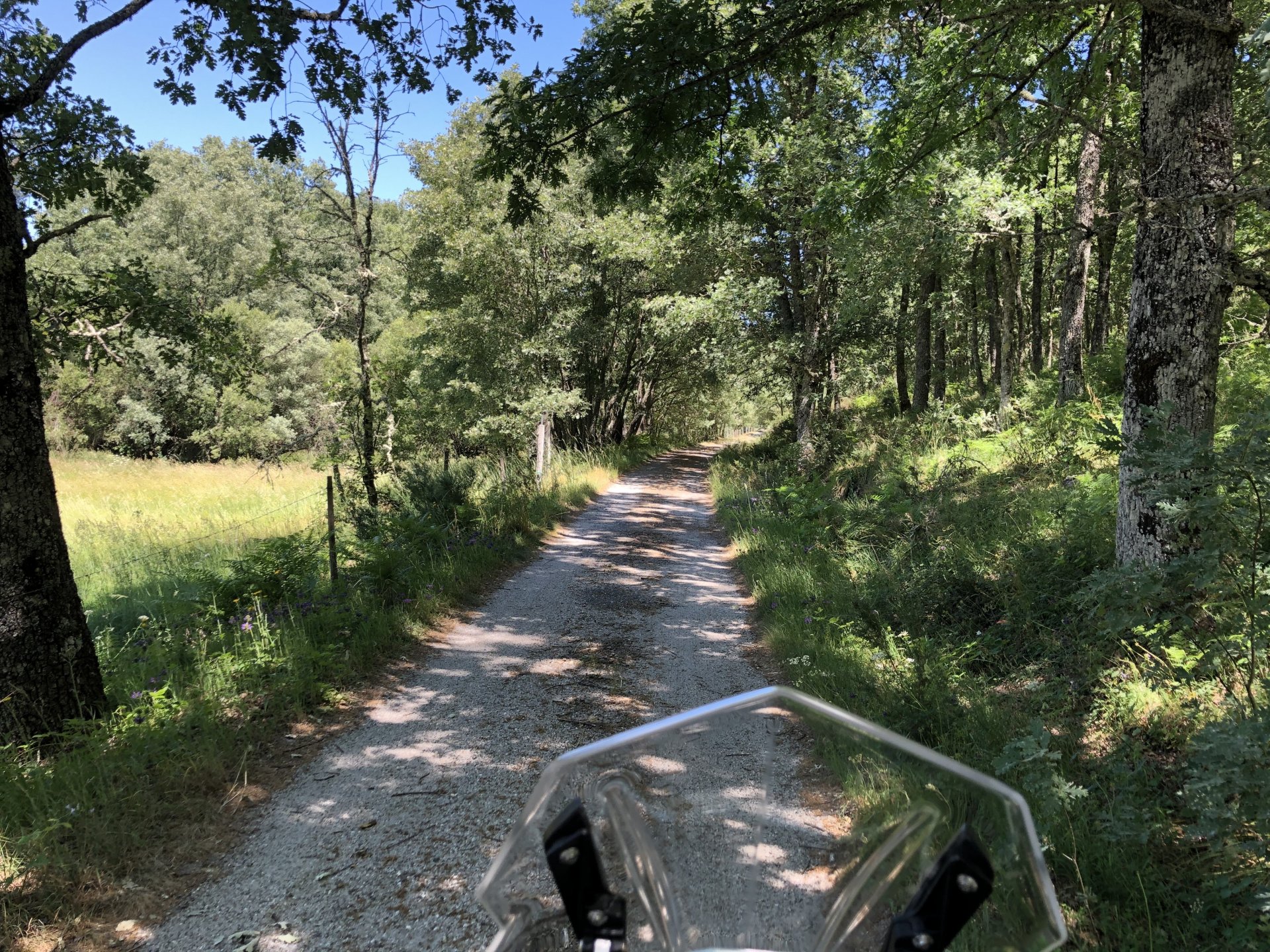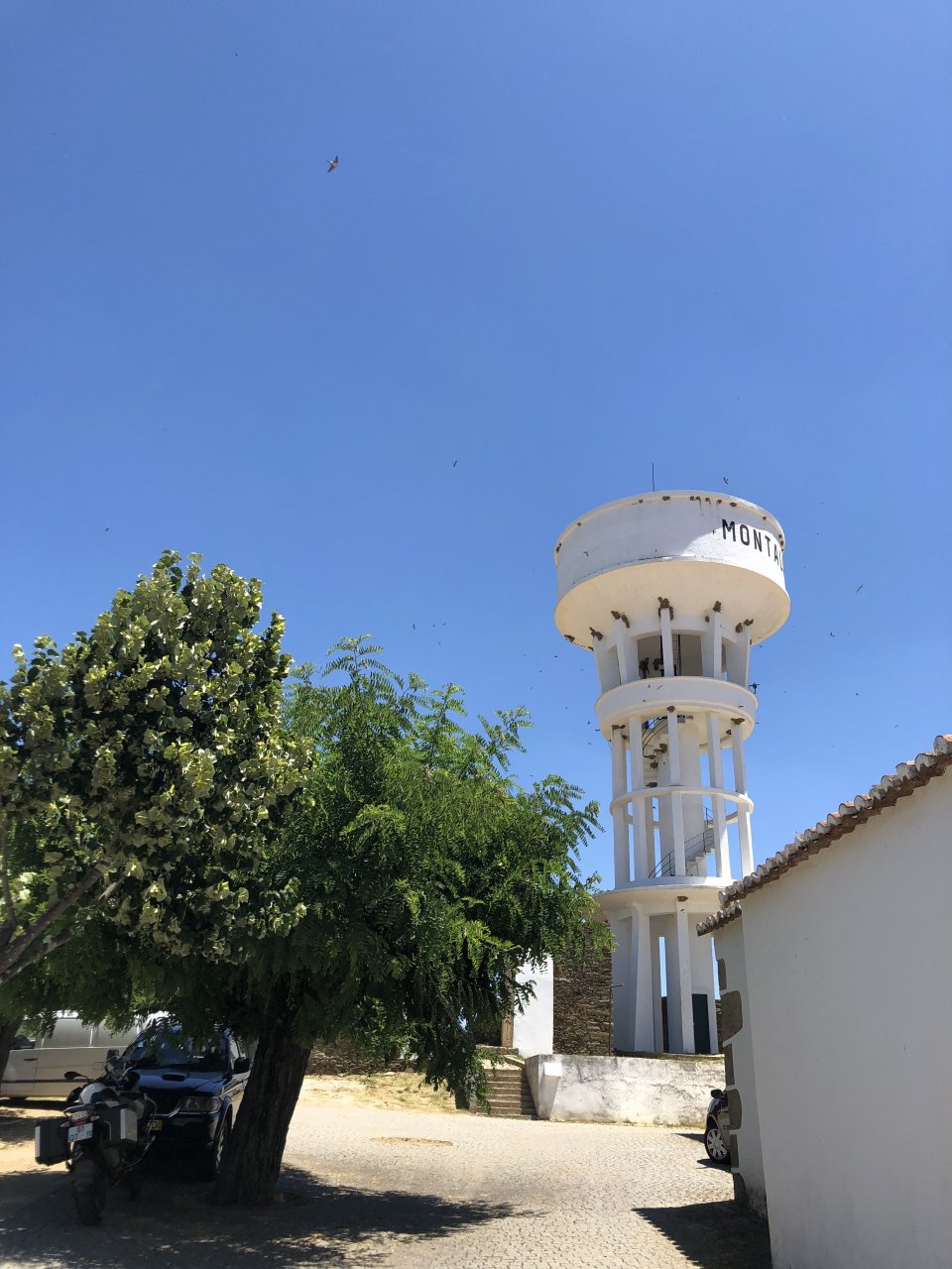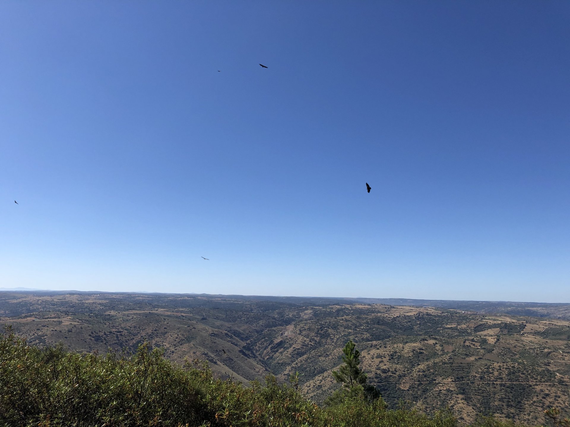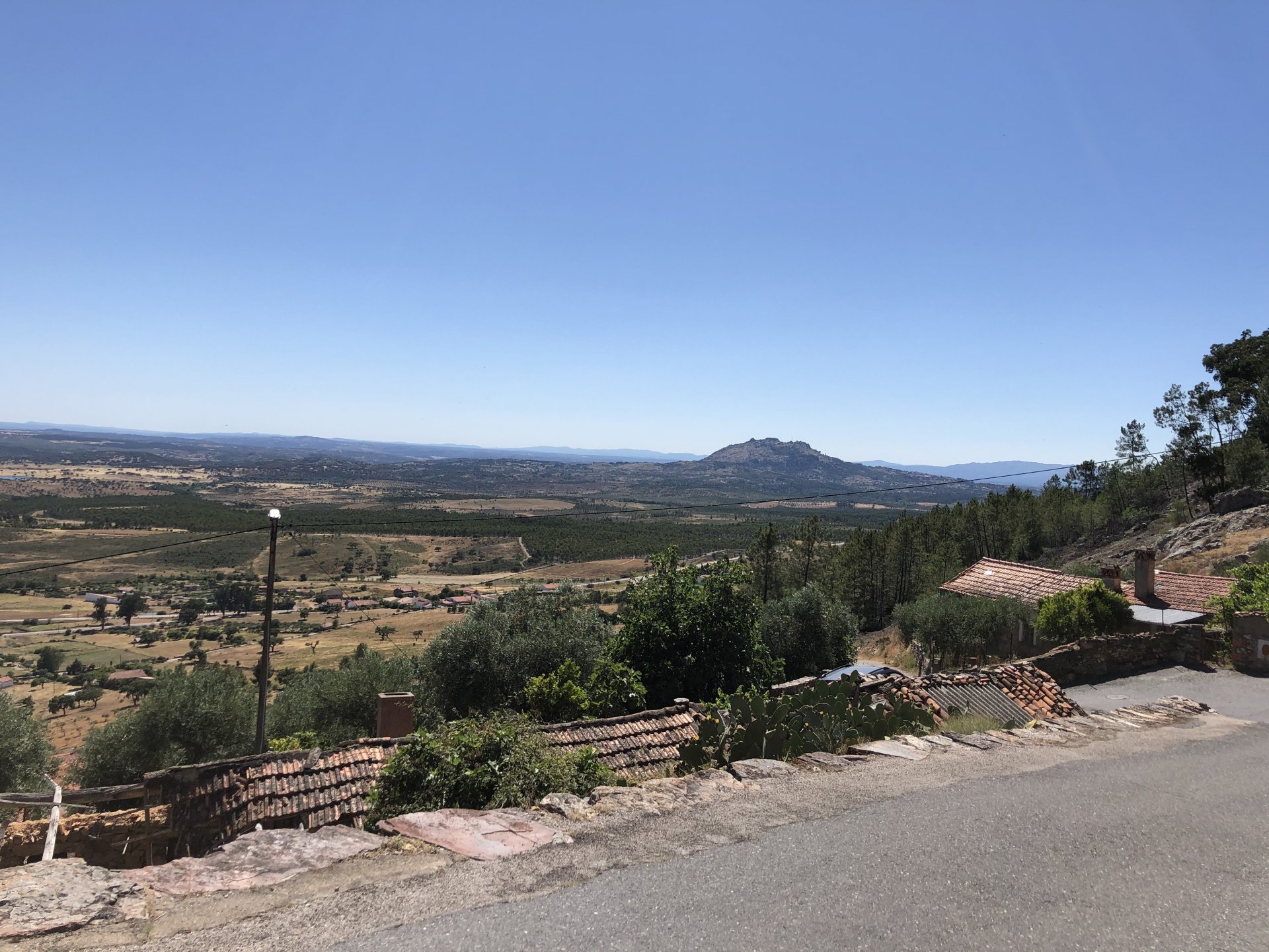 So, yesterday started well, not very warm by the time I left the hotel at around 9am, made my way to find some petrol as the bike was on reserve and in this part of the country you can ride for a while without fuel in rural areas, I mean 40km, not really such a drama. The big GS is quite frugal if you avoid motorways, and by the time I fueled up I had 600km on that tank with 50km range left. Landscape is changing now With a full tank I explore a little, there is no rush in going fast south, but I seem only be able to find dead ends, like this The grass is a little too tall for my liking, it's now getting a little hot and windy so I decide to go back to tarmac roads. A hot catalytic converter and tall dry grass is a great way to start a wildfire, and there has been enough of that over the last years. The road is good, though, I try to stick to small ones: See that on the other side of the river? That's Spain It's steeper than it looks My favourite road so far, as far as fun handling a motorcycle, it's barely wide enough for one van, and rolling and weaving through hills, with patches of dirt thrown in to keep it interesting: It was now getting hot, at around 11:30 it was over 37º, still I couldn't resist this dirt road: It only lasted for a few km, not even 15 I think. By now I am getting hot and hungry, so decide to find a small place for lunch. I stop at the first cafe that has shade outside, sit down and do a few calls and emails while I wait for my ham sandwich. Some water and a cold small beer go down a treat. Old lady in the cafe put some butter on the sandwich, "because I think this is your lunch, and you should have a proper lunch" Street scene, after these two dudes sat together having a drink inside, they proceeded to have a conversation outside while maintaining their social distancing , there's so much rural portugal in this picture ... Old lady over there in the shade with her cane is wearing full black, and it's 37º, she's got the cane ready for when the cat comes to shit on her flowers Back on the road, and a few kms later I stop to check my itinerary and a mini castle. Most common big birds now are storks: Pretty proud of myself taking this picture, and I go and put my thumb in it Half an hour later, the roads are ok but the heat is barely manageable. I stop at a fountain and wash my head to cool down. Last stop before getting to the hotel is Marvão and it's castle. It's very high up and worth it for the views alone. There it is in the distance: Make it to the hotel, and quickly make my way to the pool, to finish the day. I drank almost 1,5 liters of water just sitting there, plus a couple of beers, before starting to feel less thirsty. Sofia joined me for dinner, I had some greats cuttlefish and clams cooked in garlic and olive oil, it was amazing. Too much wine was had.