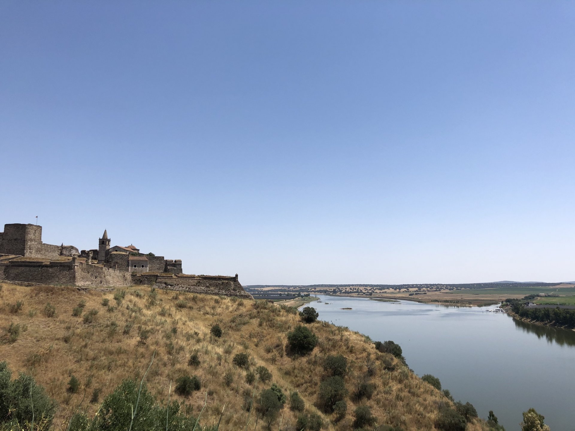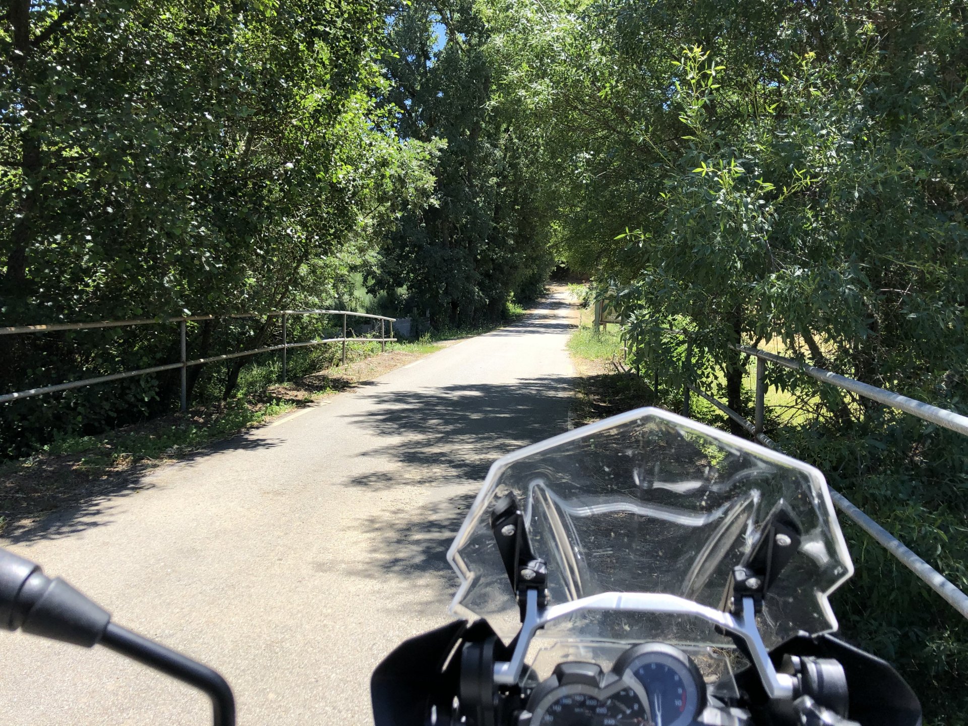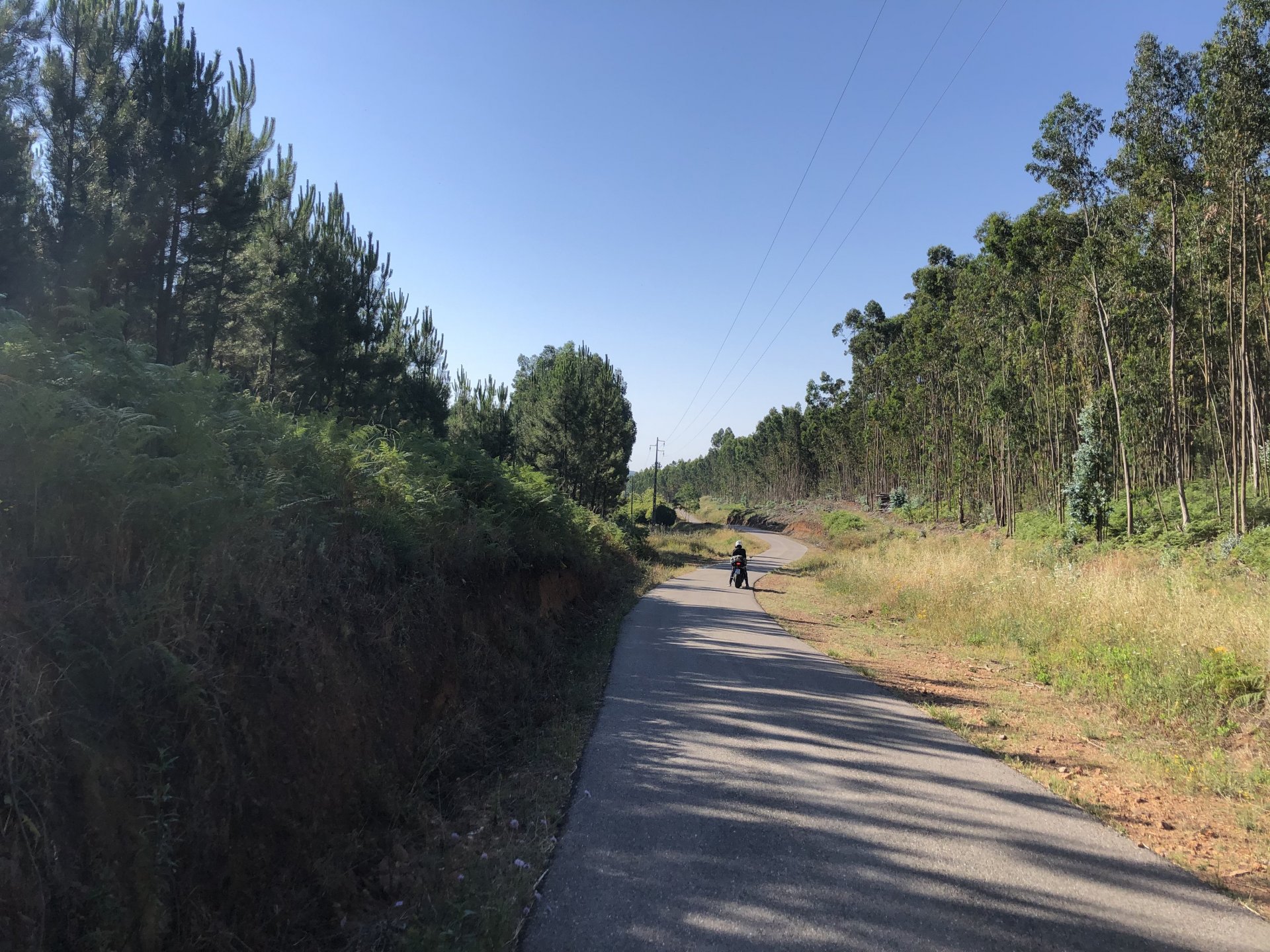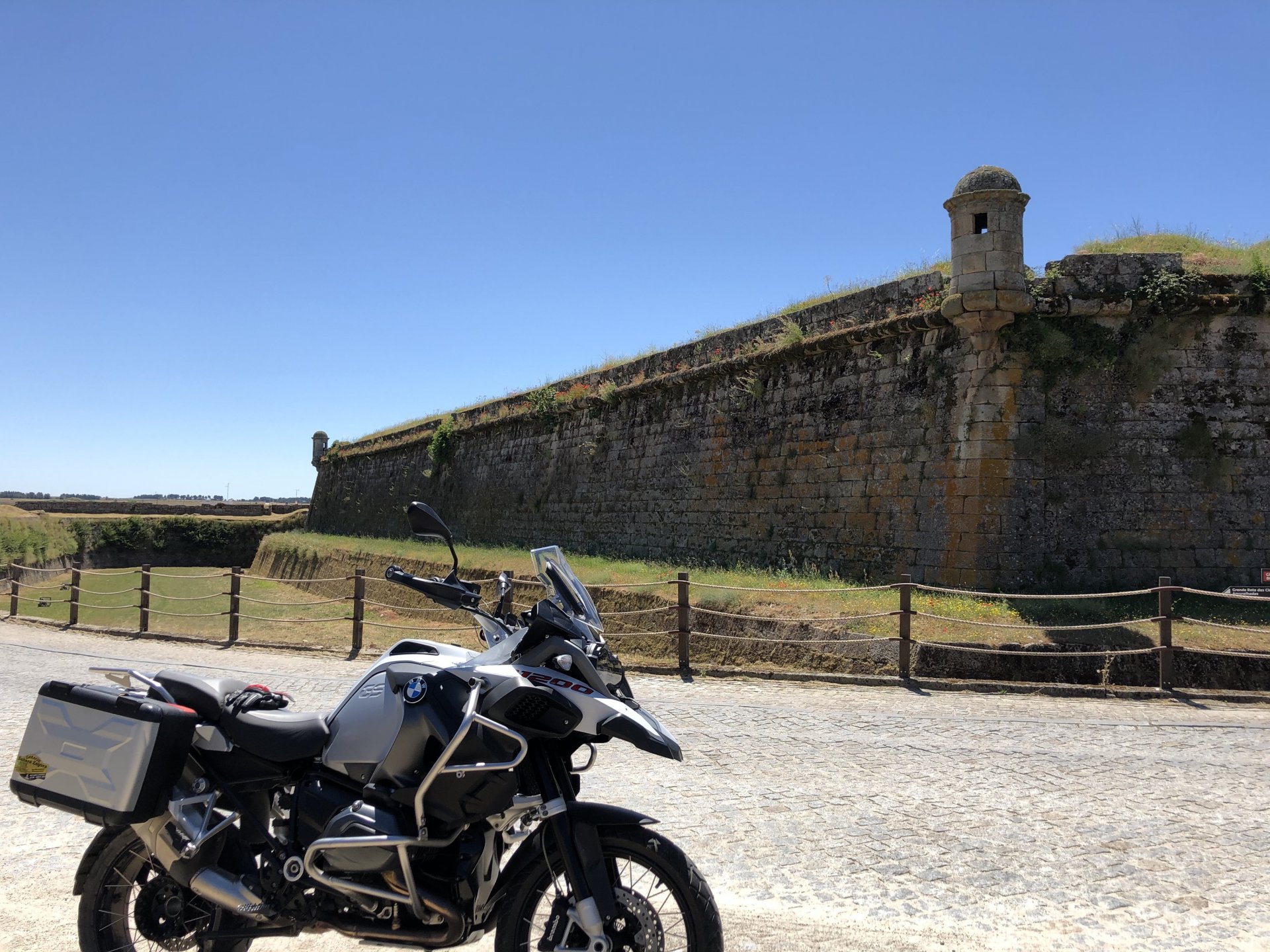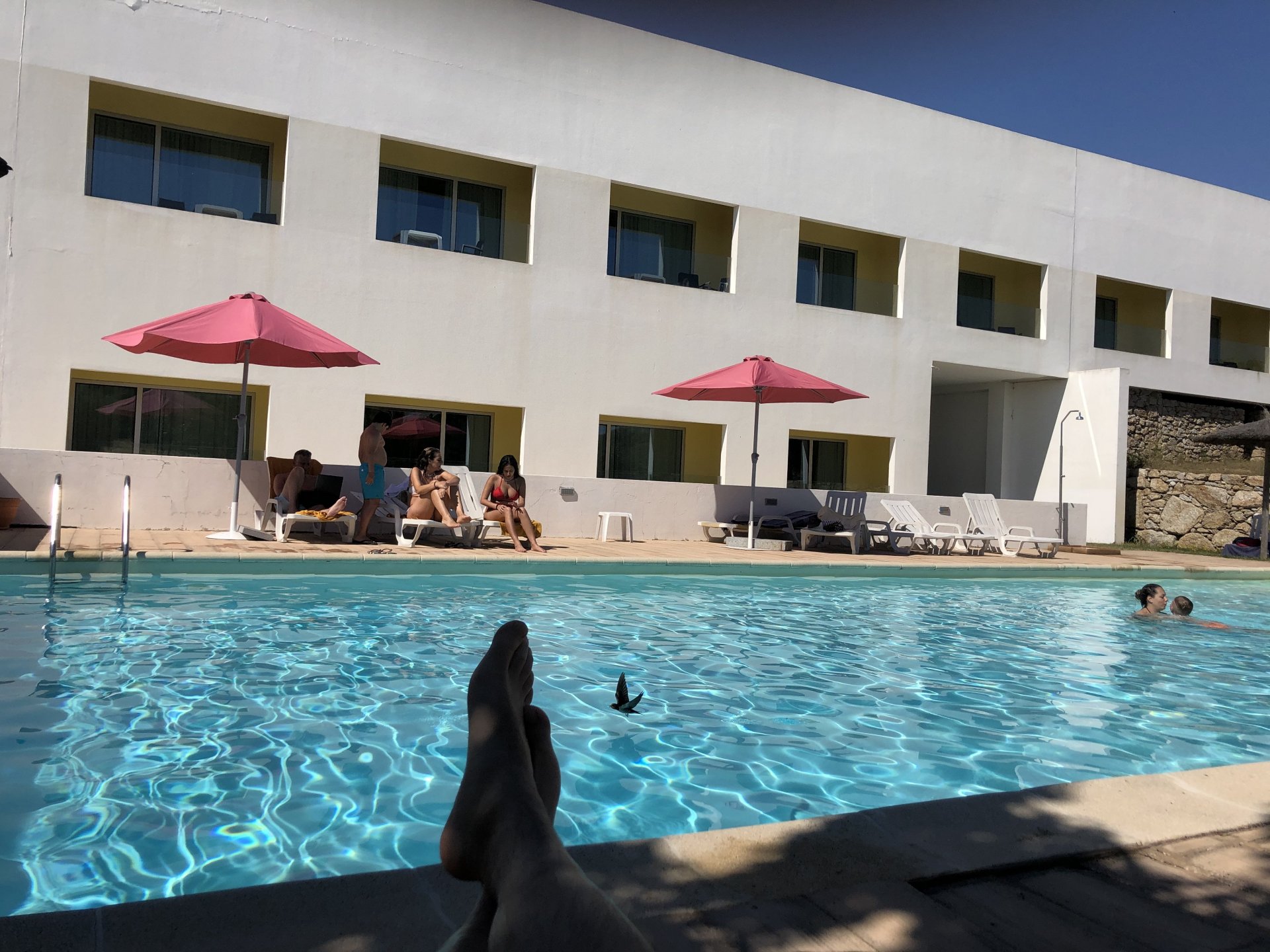 So, yesterday started well, not very warm by the time I left the hotel at around 9am, made my way to find some petrol as the bike was on reserve and in this part of the country you can ride for a while without fuel in rural areas, I mean 40km, not really such a drama. The big GS is quite frugal if you avoid motorways, and by the time I fueled up I had 600km on that tank with 50km range left. Landscape is changing now With a full tank I explore a little, there is no rush in going fast south, but I seem only be able to find dead ends, like this The grass is a little too tall for my liking, it's now getting a little hot and windy so I decide to go back to tarmac roads. A hot catalytic converter and tall dry grass is a great way to start a wildfire, and there has been enough of that over the last years. The road is good, though, I try to stick to small ones: See that on the other side of the river? That's Spain It's steeper than it looks My favourite road so far, as far as fun handling a motorcycle, it's barely wide enough for one van, and rolling and weaving through hills, with patches of dirt thrown in to keep it interesting: It was now getting hot, at around 11:30 it was over 37º, still I couldn't resist this dirt road: It only lasted for a few km, not even 15 I think. By now I am getting hot and hungry, so decide to find a small place for lunch. I stop at the first cafe that has shade outside, sit down and do a few calls and emails while I wait for my ham sandwich. Some water and a cold small beer go down a treat. Old lady in the cafe put some butter on the sandwich, "because I think this is your lunch, and you should have a proper lunch" Street scene, after these two dudes sat together having a drink inside, they proceeded to have a conversation outside while maintaining their social distancing , there's so much rural portugal in this picture ... Old lady over there in the shade with her cane is wearing full black, and it's 37º, she's got the cane ready for when the cat comes to shit on her flowers Back on the road, and a few kms later I stop to check my itinerary and a mini castle. Most common big birds now are storks: Pretty proud of myself taking this picture, and I go and put my thumb in it Half an hour later, the roads are ok but the heat is barely manageable. I stop at a fountain and wash my head to cool down. Last stop before getting to the hotel is Marvão and it's castle. It's very high up and worth it for the views alone. There it is in the distance: Make it to the hotel, and quickly make my way to the pool, to finish the day. I drank almost 1,5 liters of water just sitting there, plus a couple of beers, before starting to feel less thirsty. Sofia joined me for dinner, I had some greats cuttlefish and clams cooked in garlic and olive oil, it was amazing. Too much wine was had.